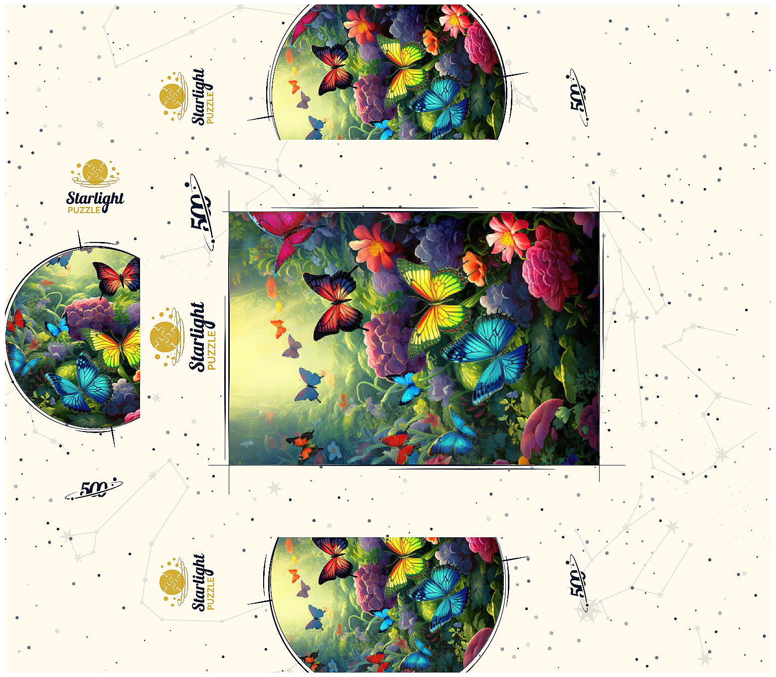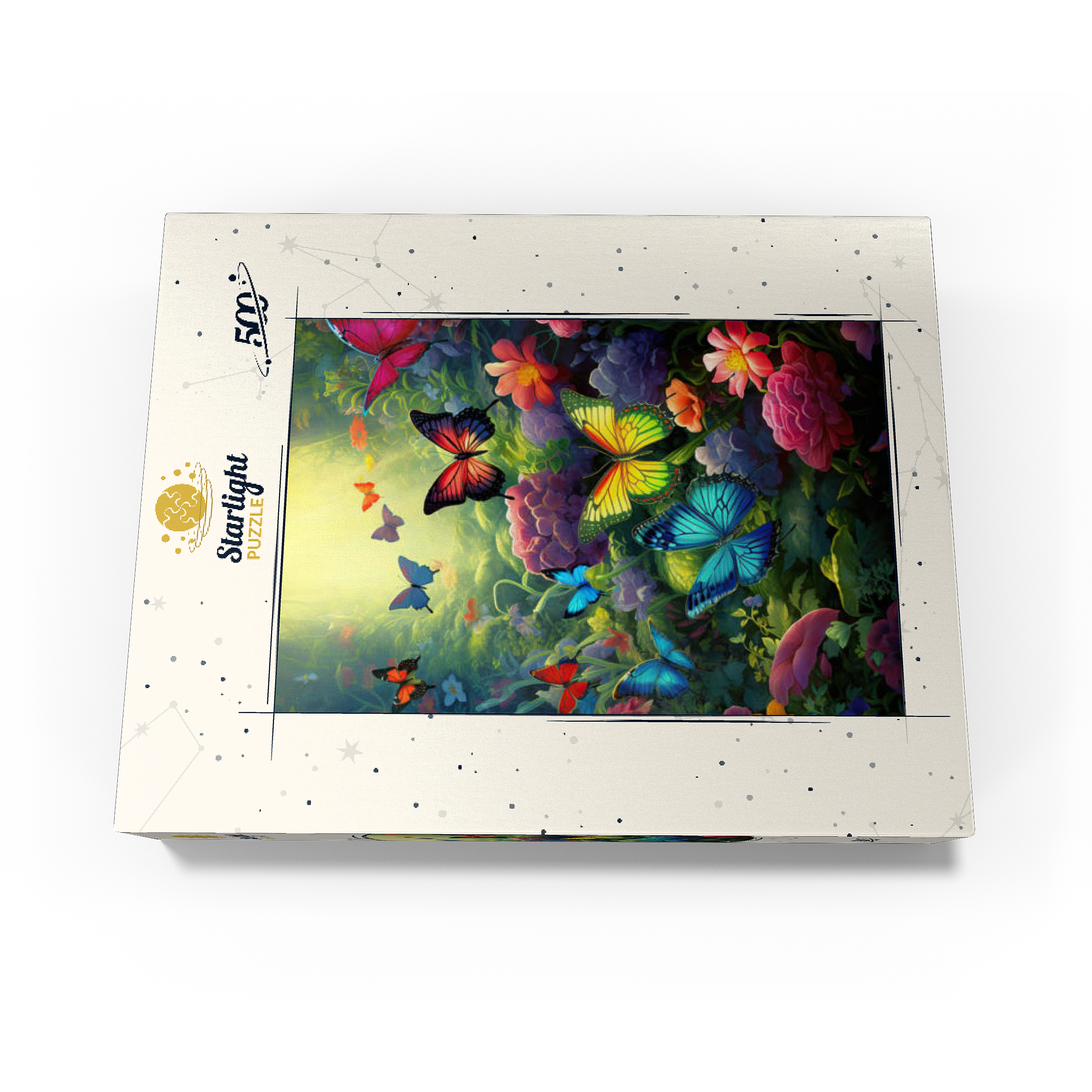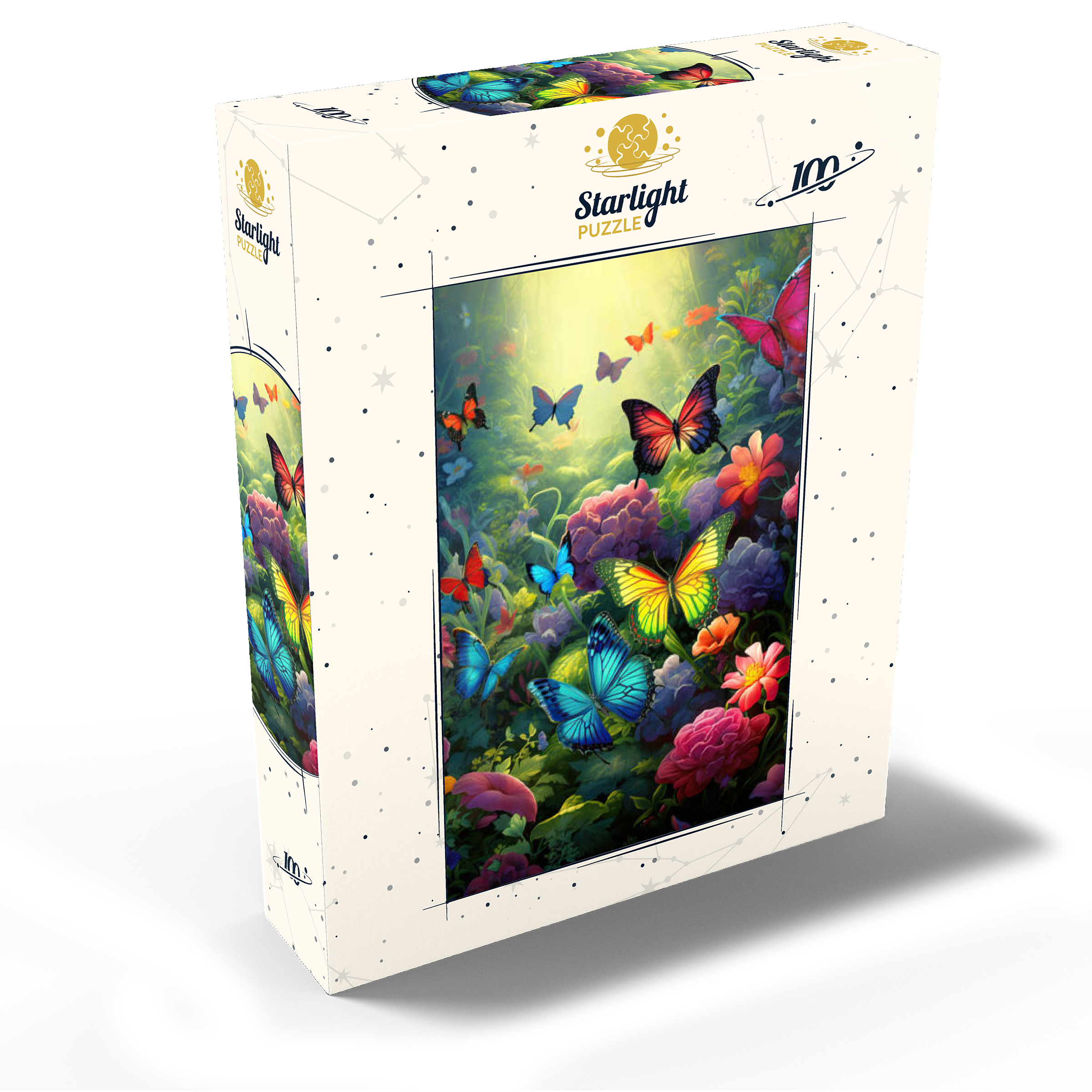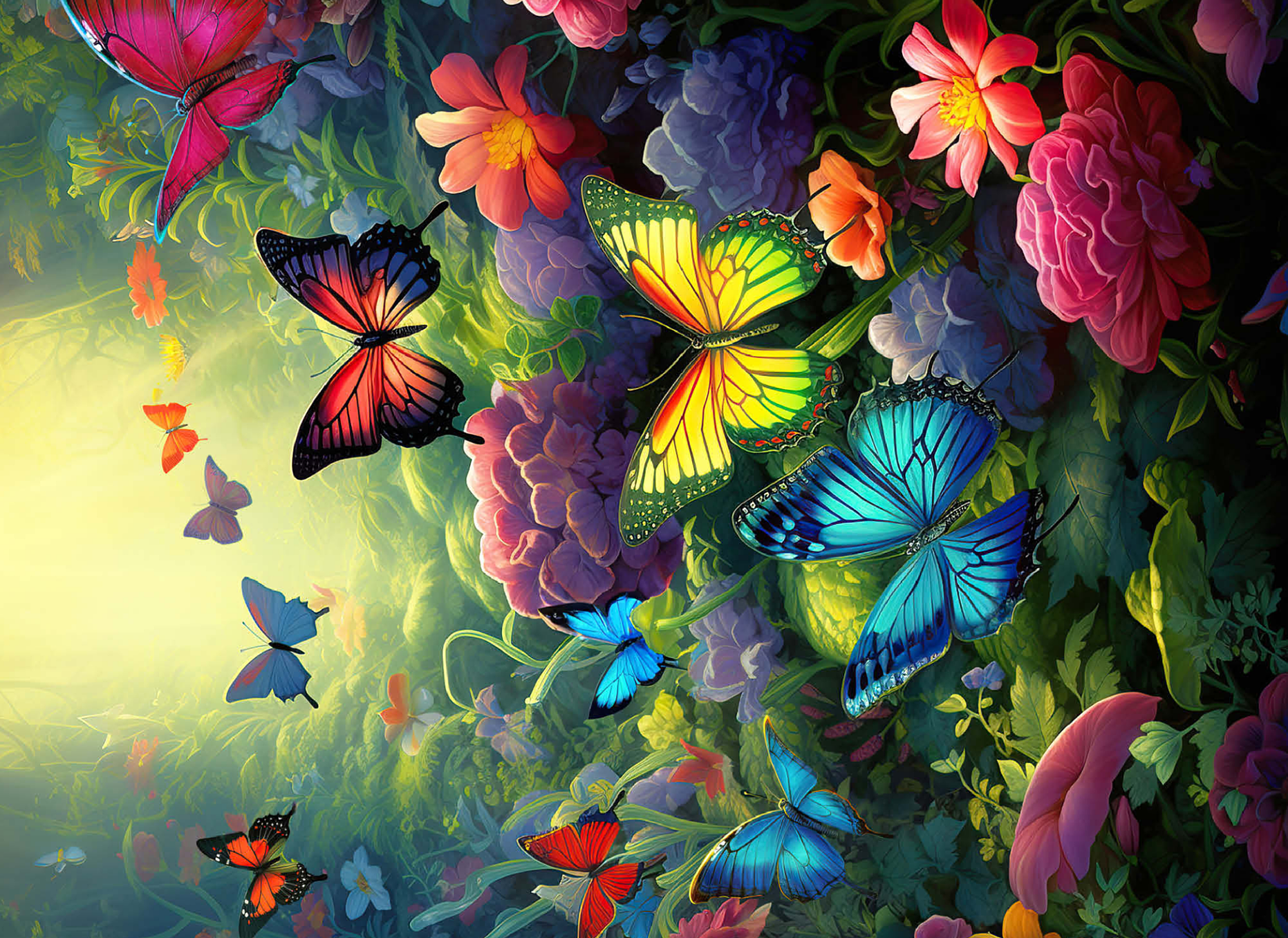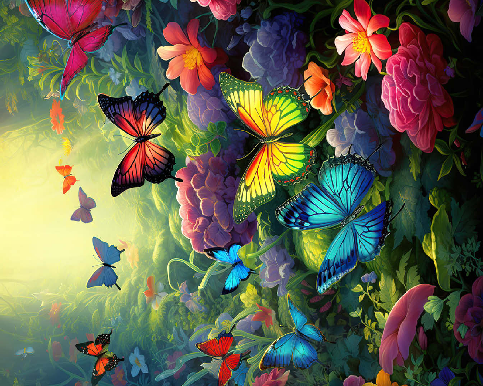 A vibrant scene of butterflies dancing gracefully among a lush garden filled with blooming flowers in every color of the rainbow. the sunlight streams gently through the dense foliage, illuminating the intricate details of the butterfly wings, from iridescent blues to fiery reds and radiant yellows. the harmonious mix of blossoms and fluttering wings creates a magical ambiance, evoking feelings of tranquility and wonder. each butterfly appears to float effortlessly above the garden, completing this enchanting portrayal of nature's beauty.