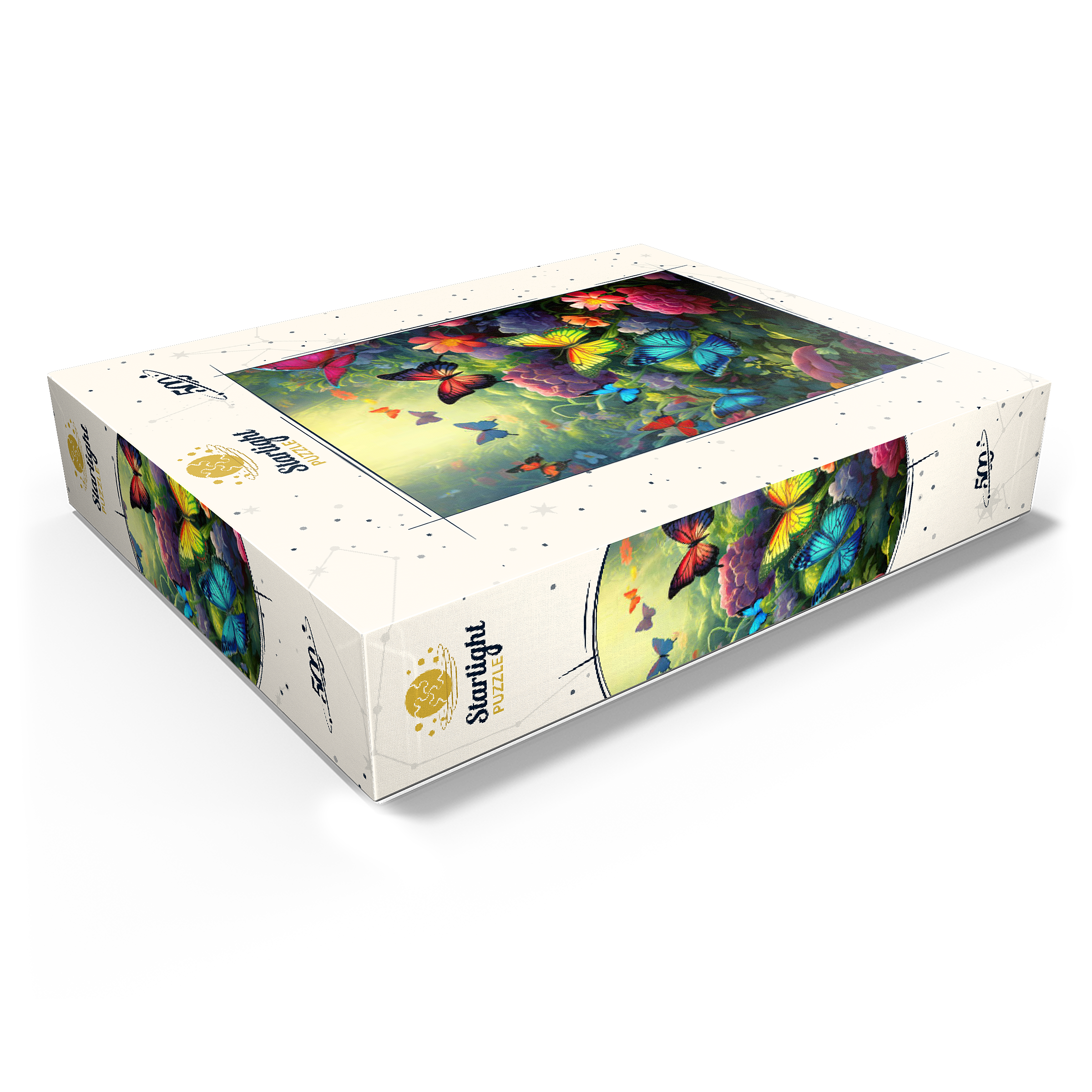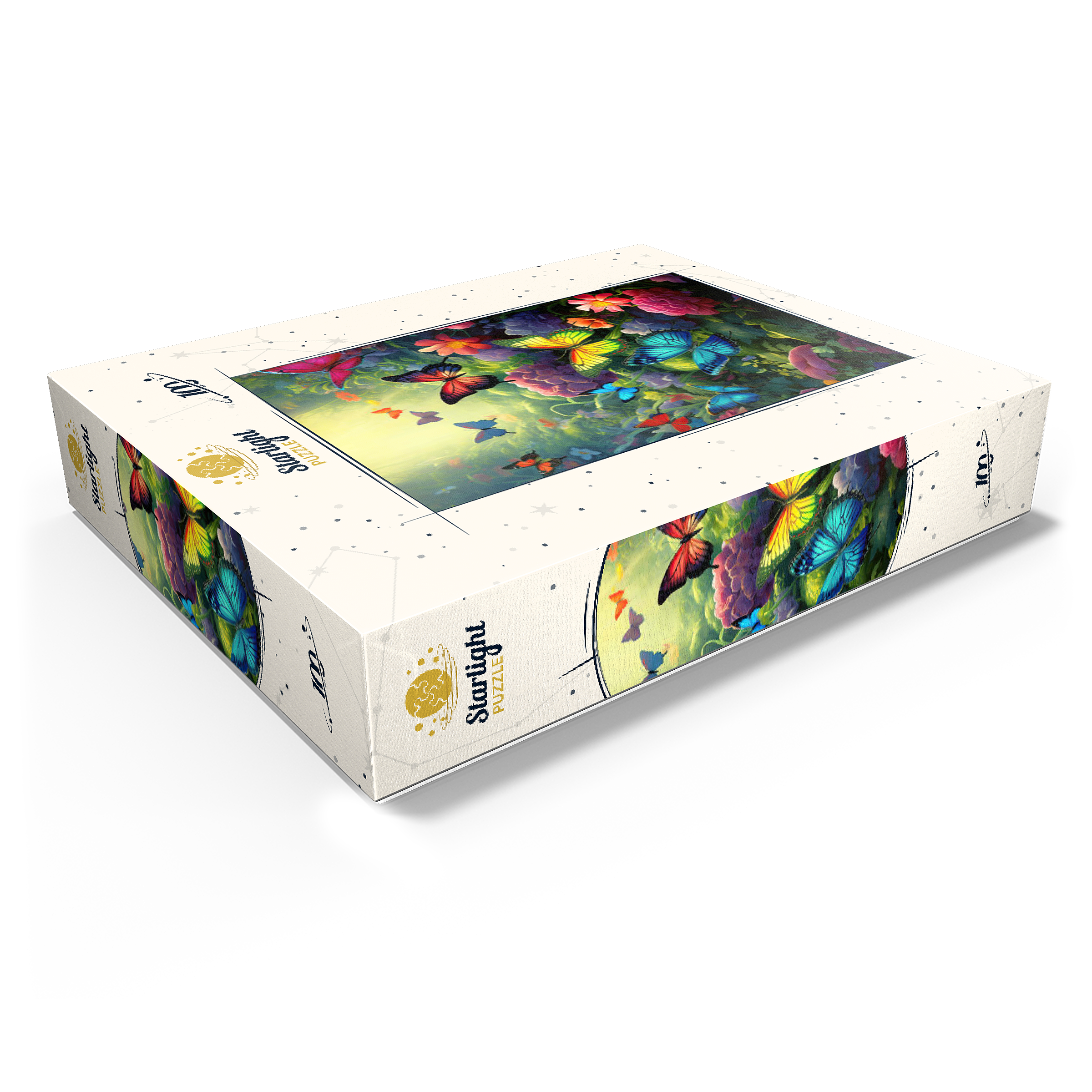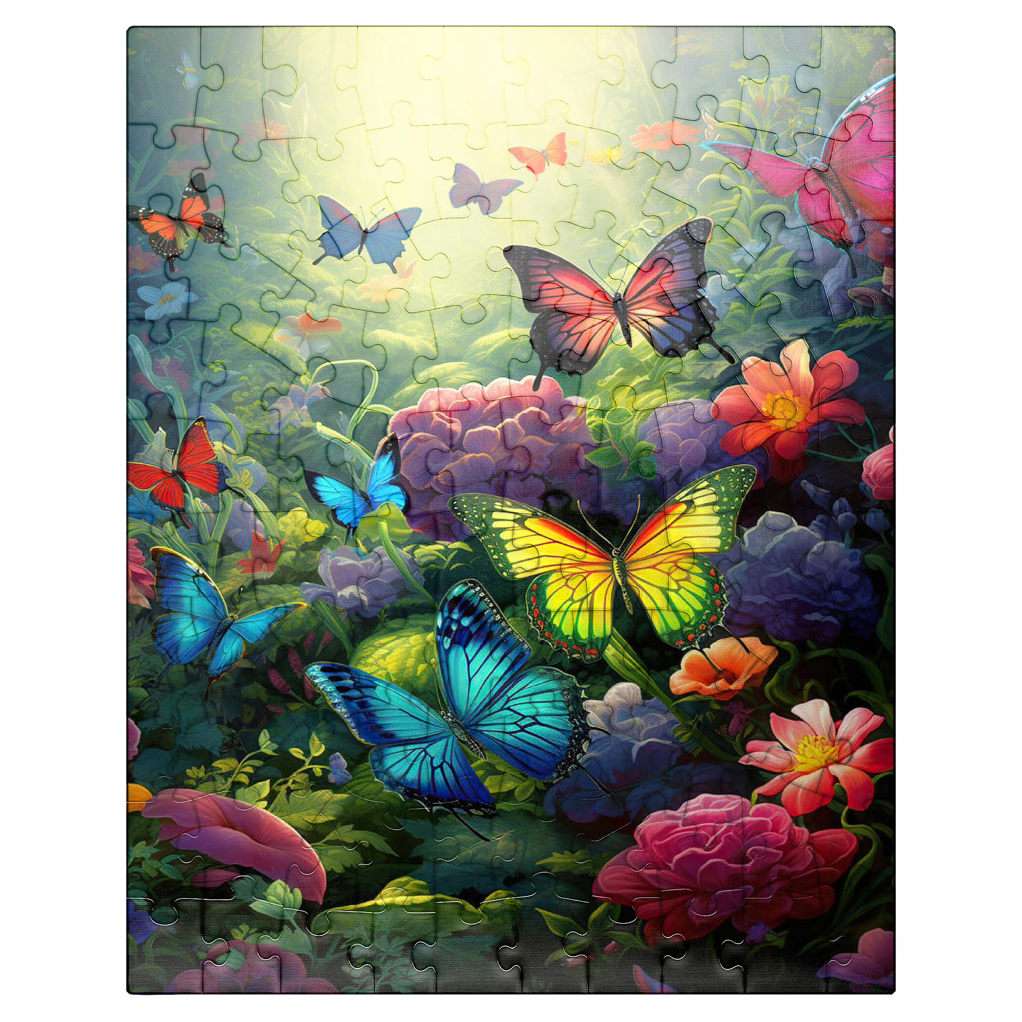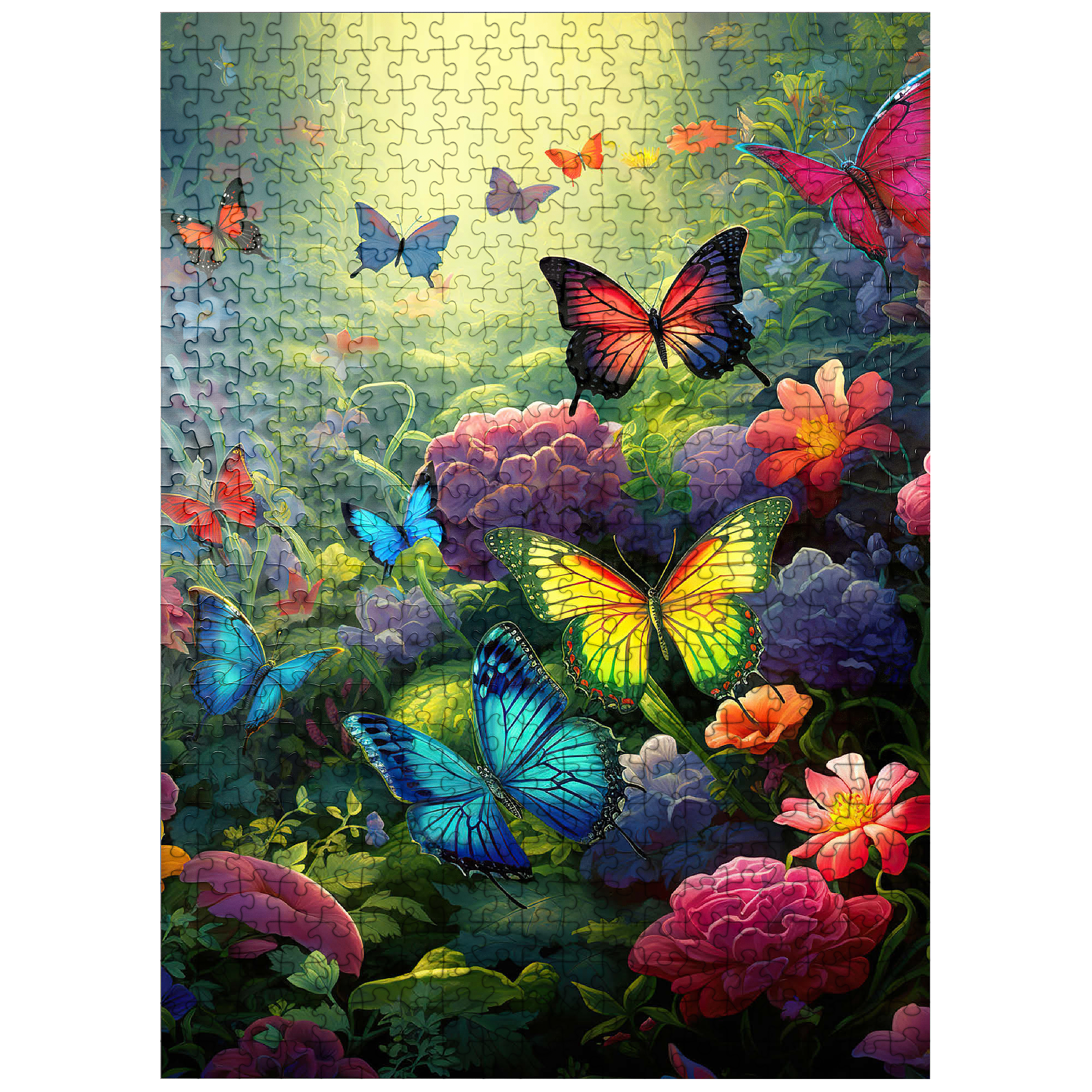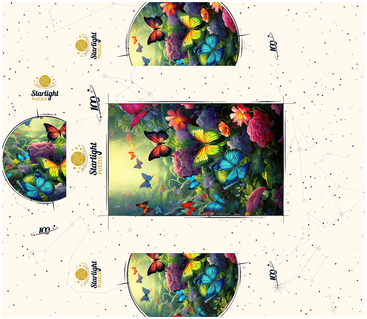 A vibrant scene of butterflies dancing gracefully among a lush garden filled with blooming flowers in every color of the rainbow. the sunlight streams gently through the dense foliage, illuminating the intricate details of the butterfly wings, from iridescent blues to fiery reds and radiant yellows. the harmonious mix of blossoms and fluttering wings creates a magical ambiance, evoking feelings of tranquility and wonder. each butterfly appears to float effortlessly above the garden, completing this enchanting portrayal of nature's beauty.