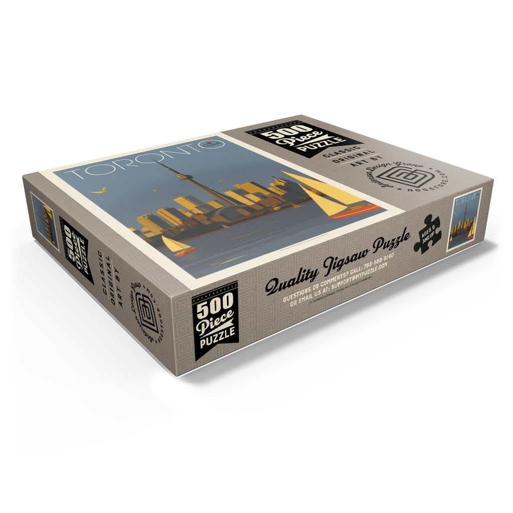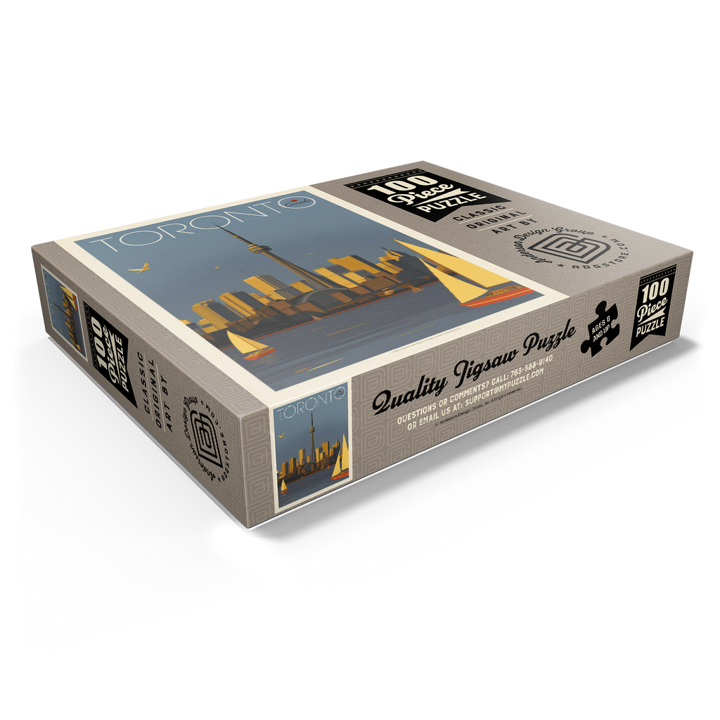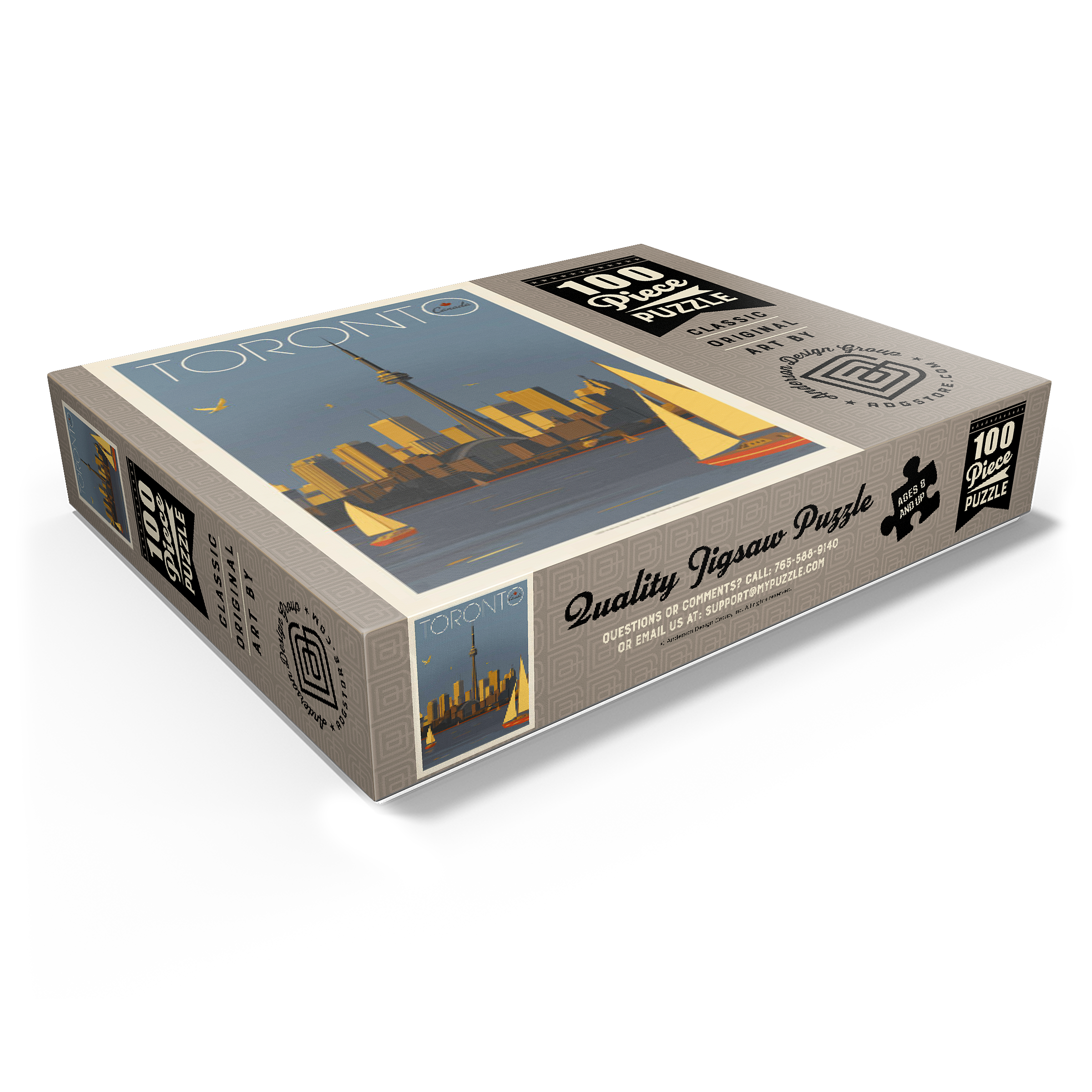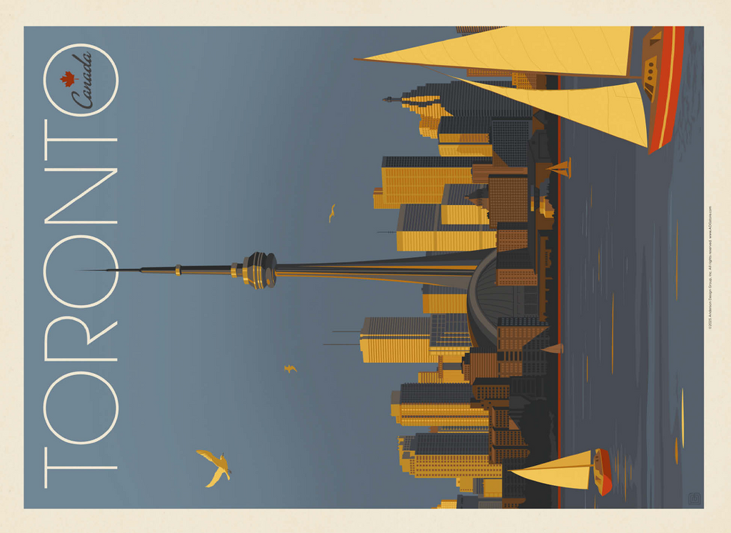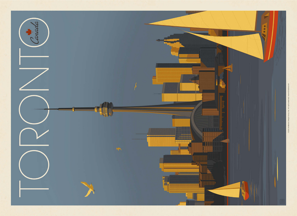 This elegant retro-style travel poster captures the Toronto skyline in warm golden tones as the sun sets over Lake Ontario. Dominating the scene is the CN Tower, one of Canada’s most iconic landmarks and a defining feature of the city’s skyline. Around it rise Toronto’s modern high-rise buildings, glowing in evening light and creating a striking contrast against the deep blue sky. The calm waters of Lake Ontario reflect the city lights while sailboats drift peacefully across the harbor, adding a sense of tranquility and movement to the composition. A few seagulls soar in the sky, emphasizing Toronto’s unique blend of vibrant city life and natural waterfront beauty. The dome-shaped Rogers Centre can also be seen near the base of the CN Tower, reinforcing the city’s reputation as a hub for sports and entertainment. The artwork’s clean lines and vintage aesthetic make it timeless, celebrating both Toronto’s cosmopolitan energy and its scenic lakeside setting.