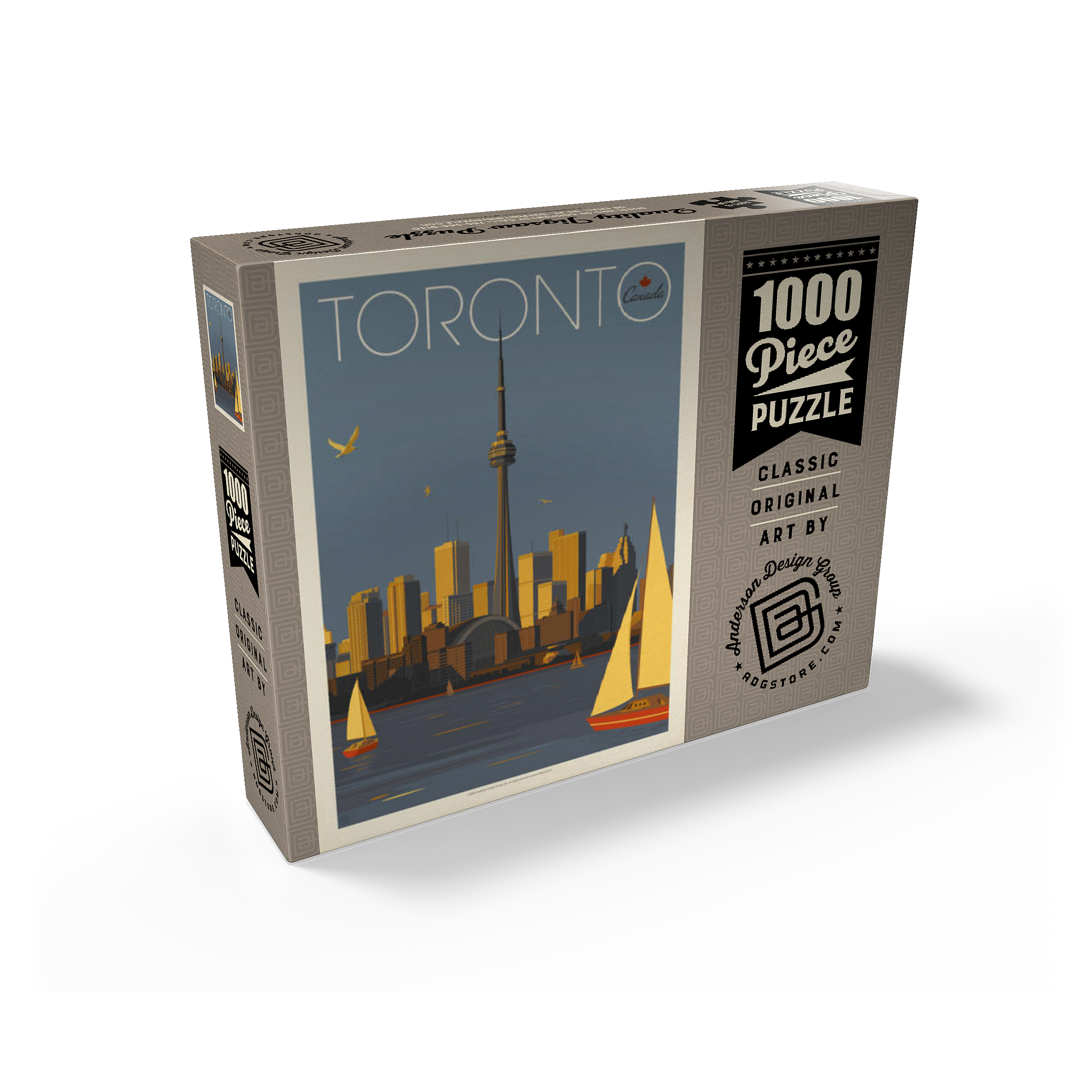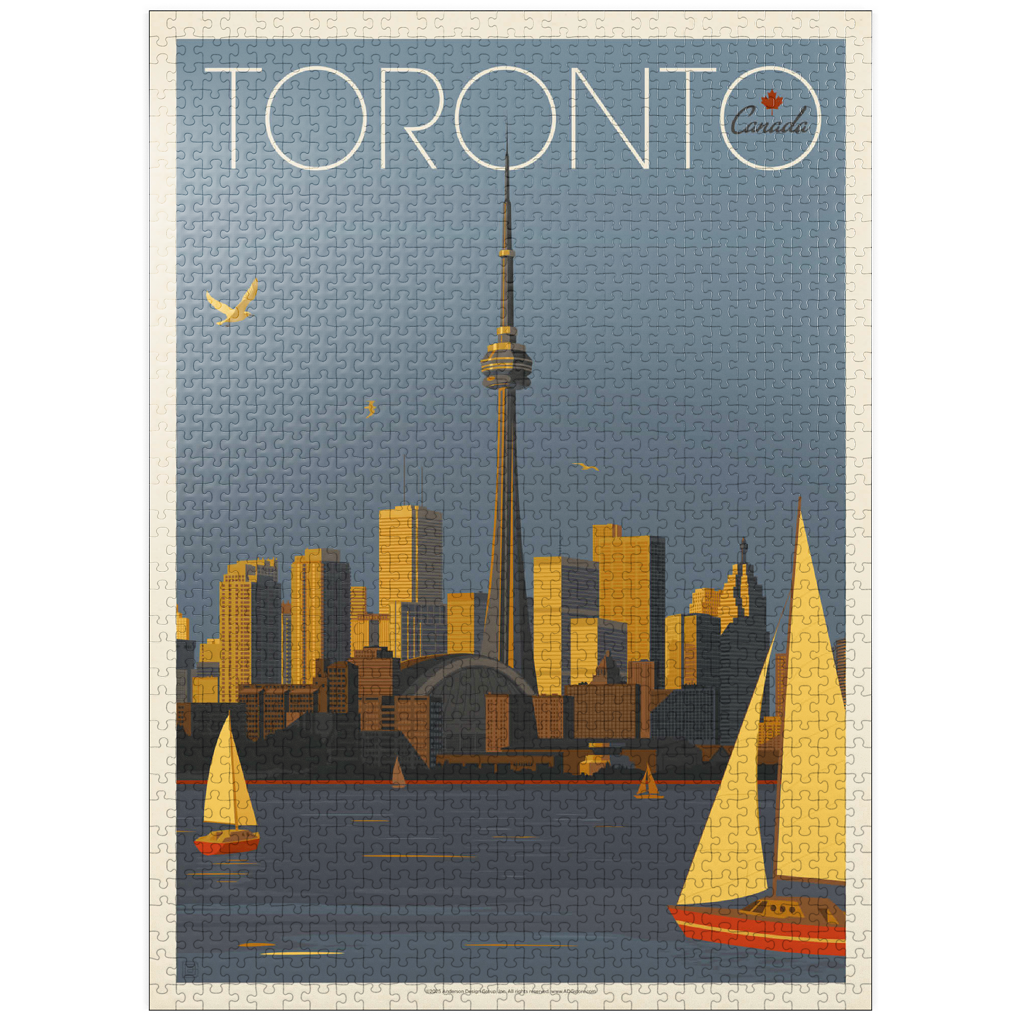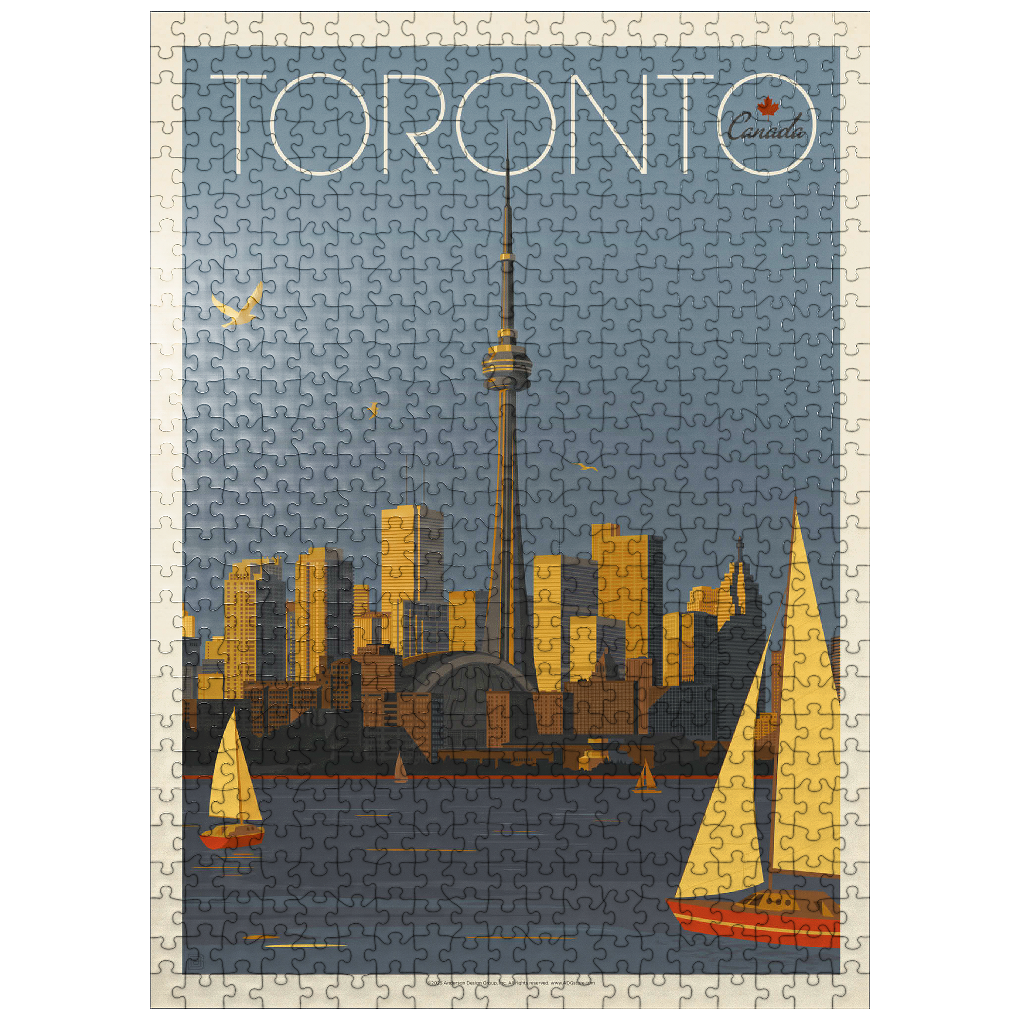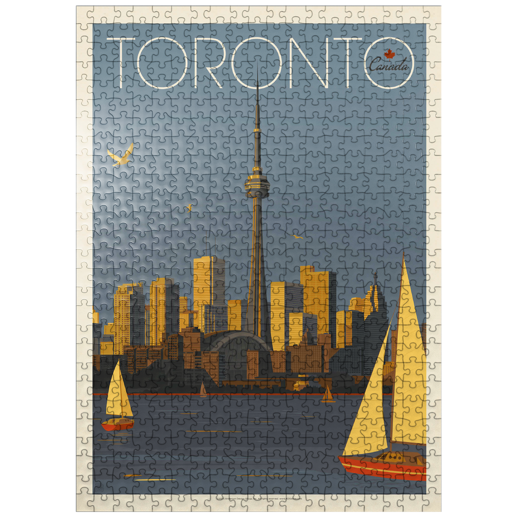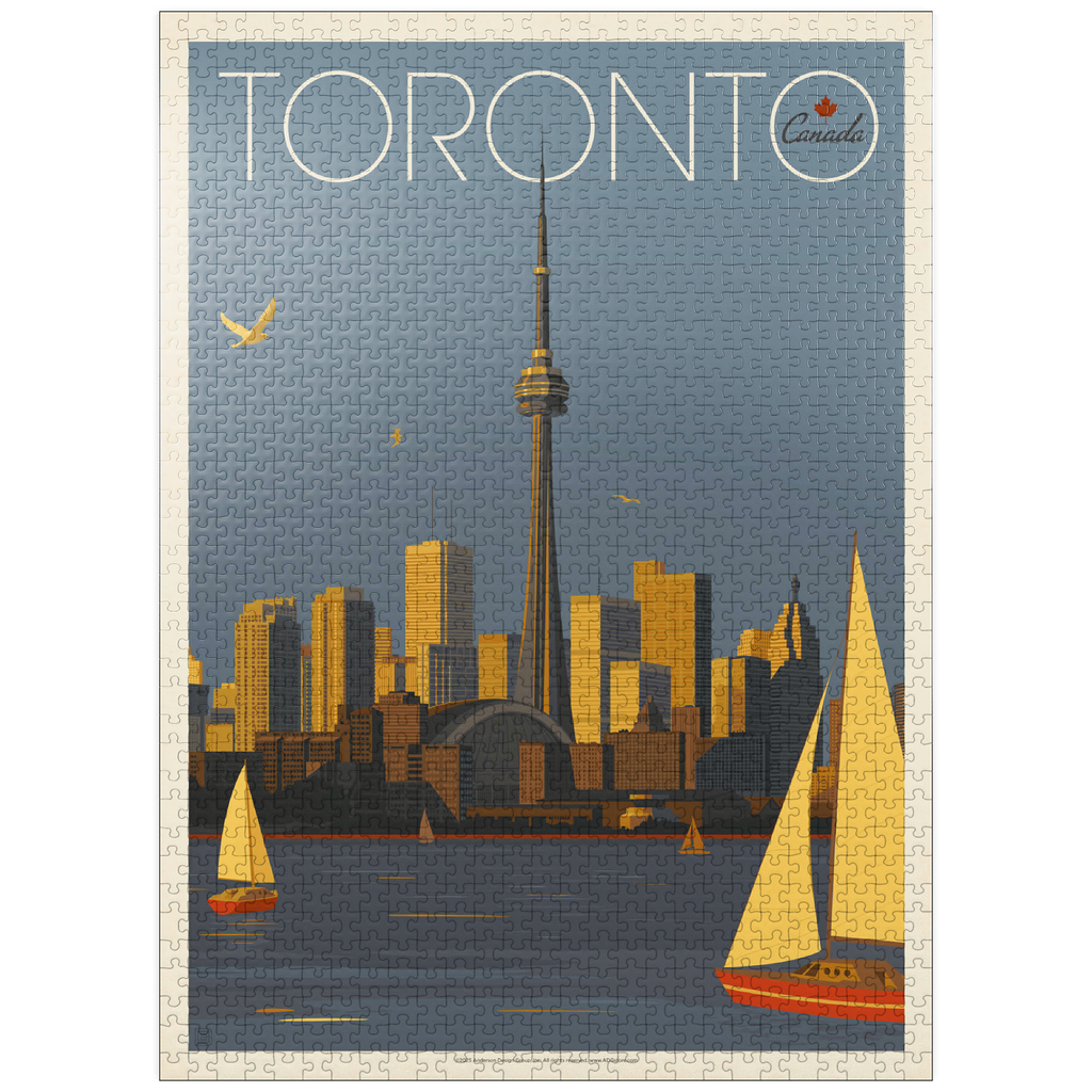 This elegant retro-style travel poster captures the Toronto skyline in warm golden tones as the sun sets over Lake Ontario. Dominating the scene is the CN Tower, one of Canada’s most iconic landmarks and a defining feature of the city’s skyline. Around it rise Toronto’s modern high-rise buildings, glowing in evening light and creating a striking contrast against the deep blue sky. The calm waters of Lake Ontario reflect the city lights while sailboats drift peacefully across the harbor, adding a sense of tranquility and movement to the composition. A few seagulls soar in the sky, emphasizing Toronto’s unique blend of vibrant city life and natural waterfront beauty. The dome-shaped Rogers Centre can also be seen near the base of the CN Tower, reinforcing the city’s reputation as a hub for sports and entertainment. The artwork’s clean lines and vintage aesthetic make it timeless, celebrating both Toronto’s cosmopolitan energy and its scenic lakeside setting.