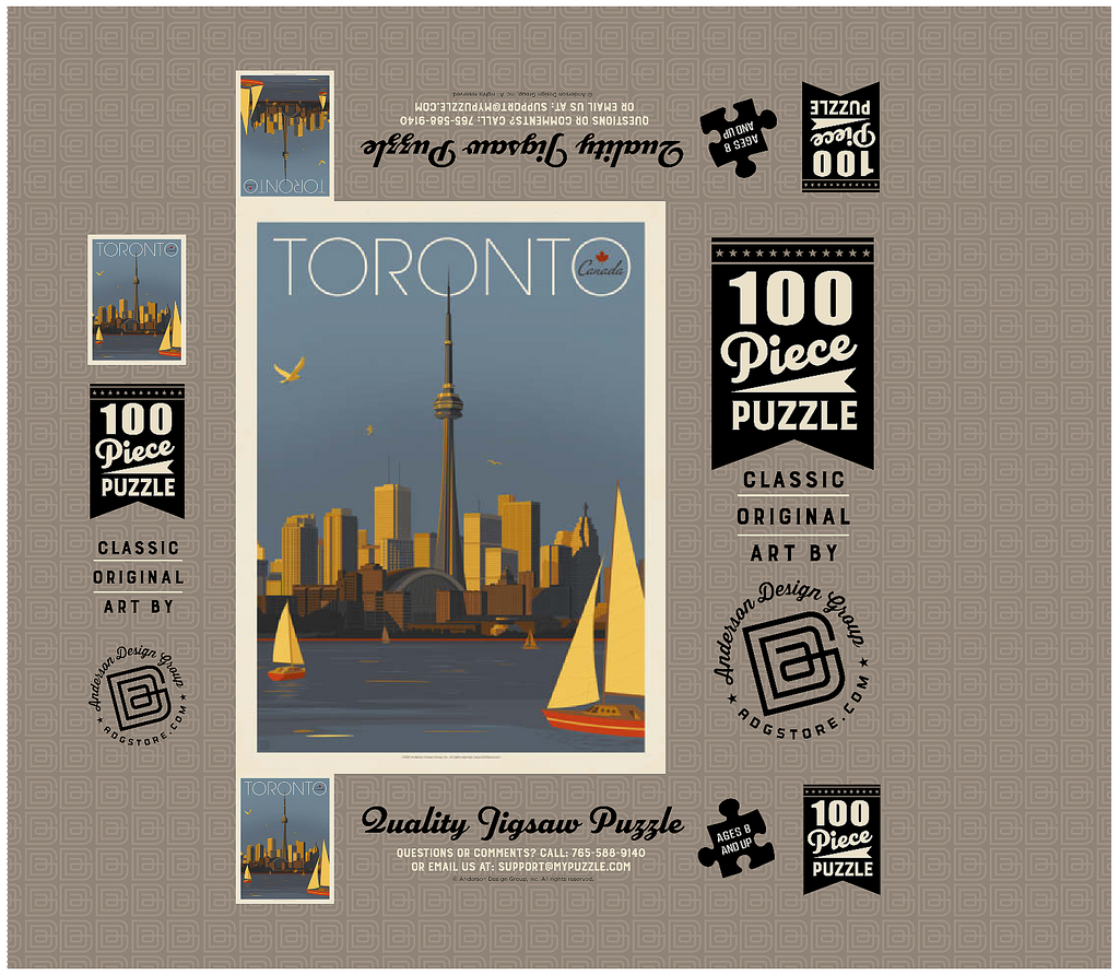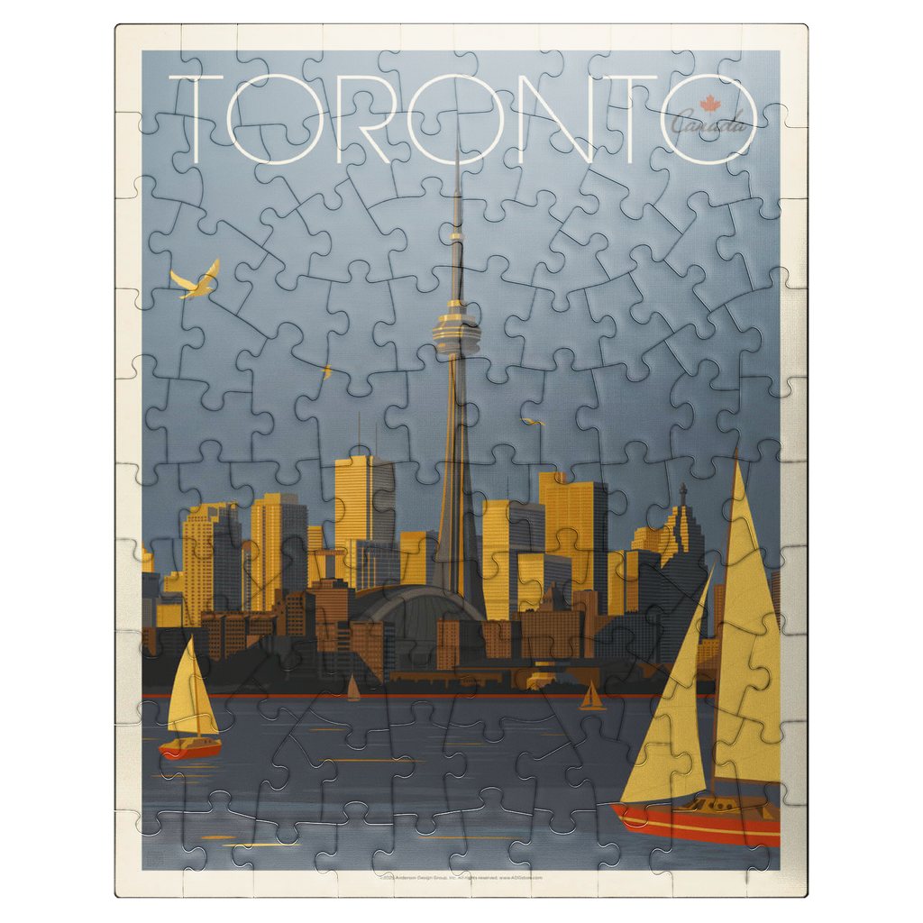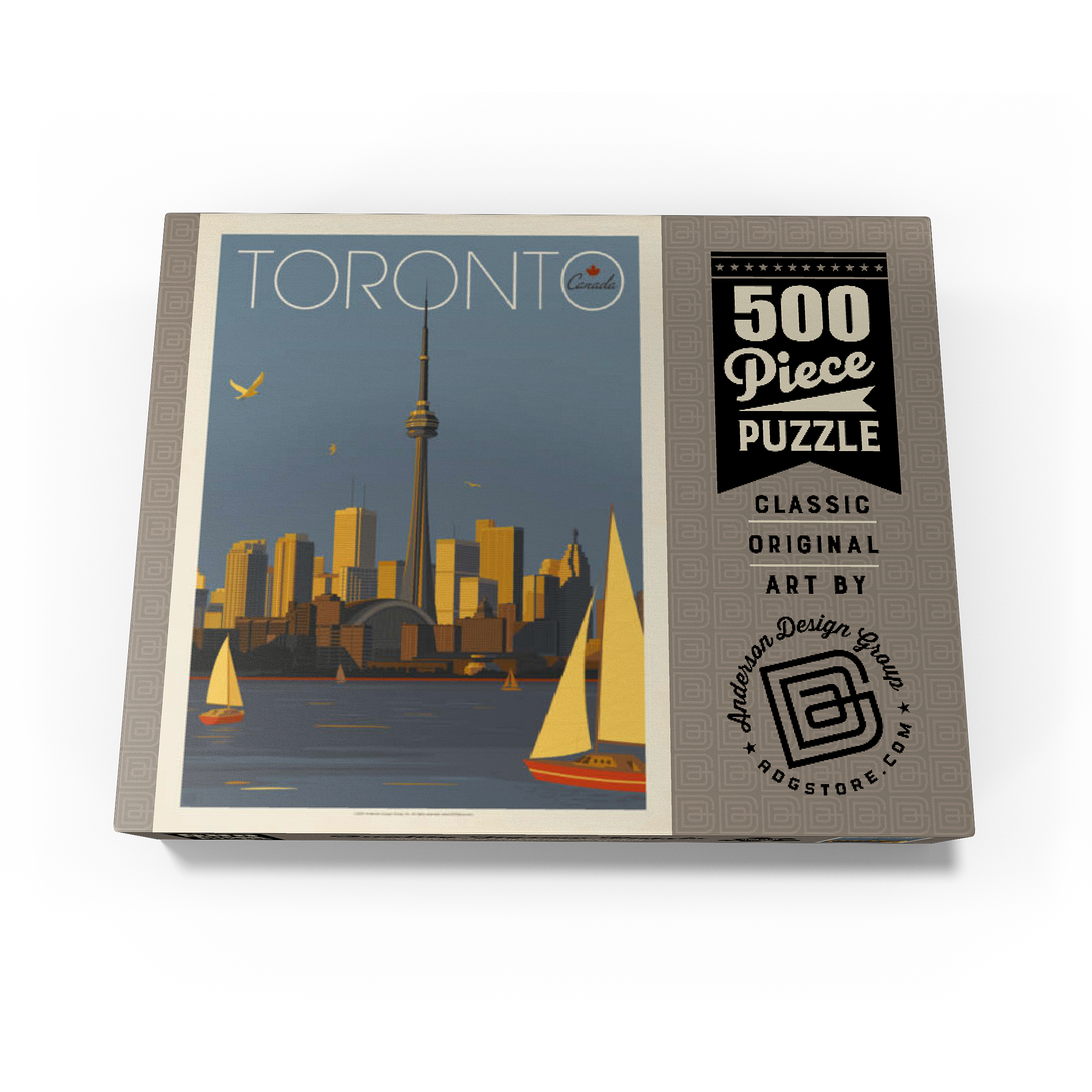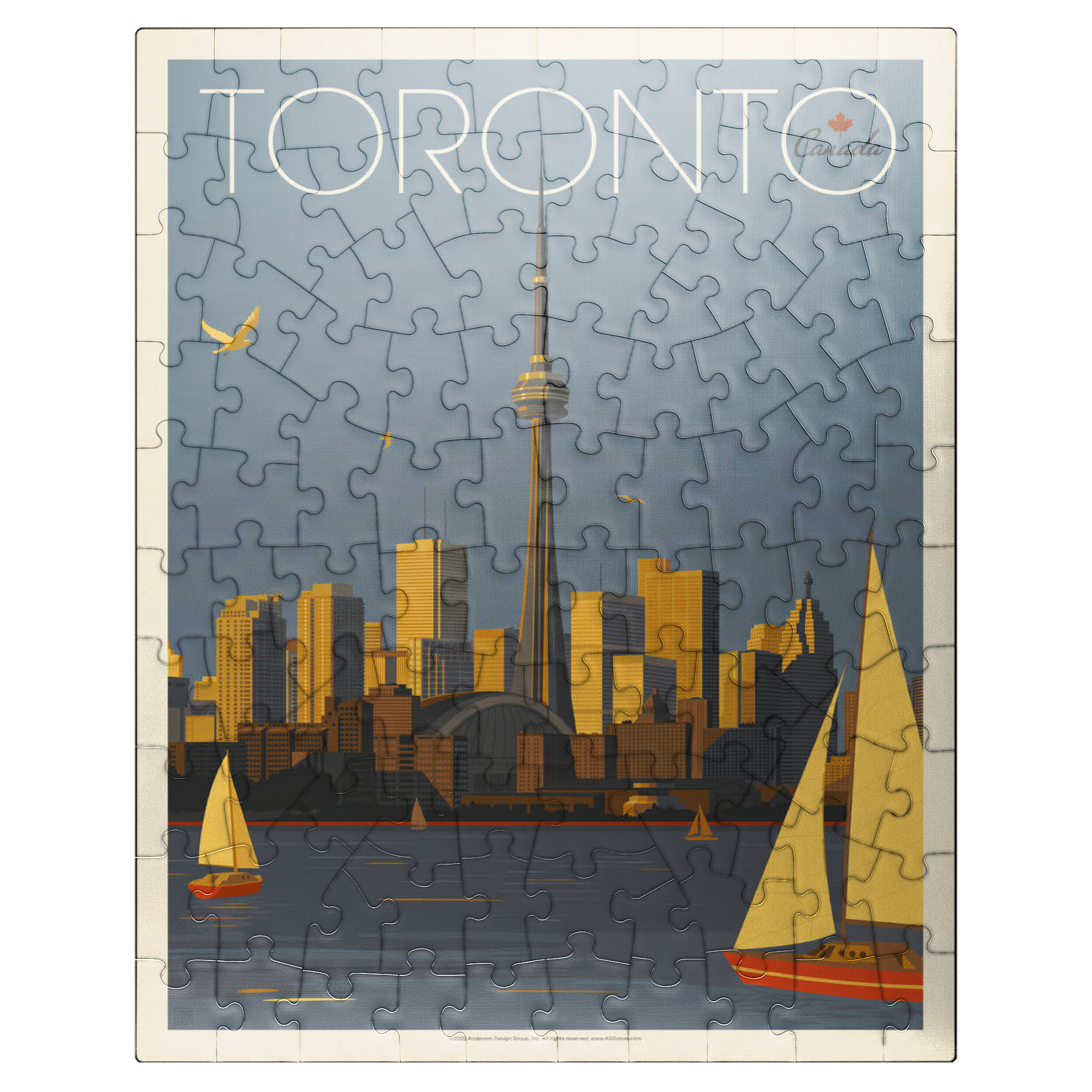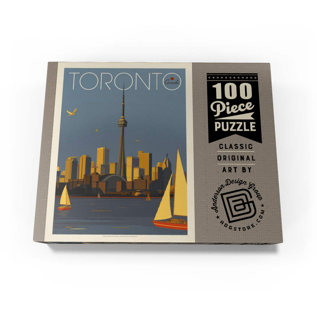This elegant retro-style travel poster captures the Toronto skyline in warm golden tones as the sun sets over Lake Ontario. Dominating the scene is the CN Tower, one of Canada’s most iconic landmarks and a defining feature of the city’s skyline. Around it rise Toronto’s modern high-rise buildings, glowing in evening light and creating a striking contrast against the deep blue sky. The calm waters of Lake Ontario reflect the city lights while sailboats drift peacefully across the harbor, adding a sense of tranquility and movement to the composition. A few seagulls soar in the sky, emphasizing Toronto’s unique blend of vibrant city life and natural waterfront beauty. The dome-shaped Rogers Centre can also be seen near the base of the CN Tower, reinforcing the city’s reputation as a hub for sports and entertainment. The artwork’s clean lines and vintage aesthetic make it timeless, celebrating both Toronto’s cosmopolitan energy and its scenic lakeside setting.