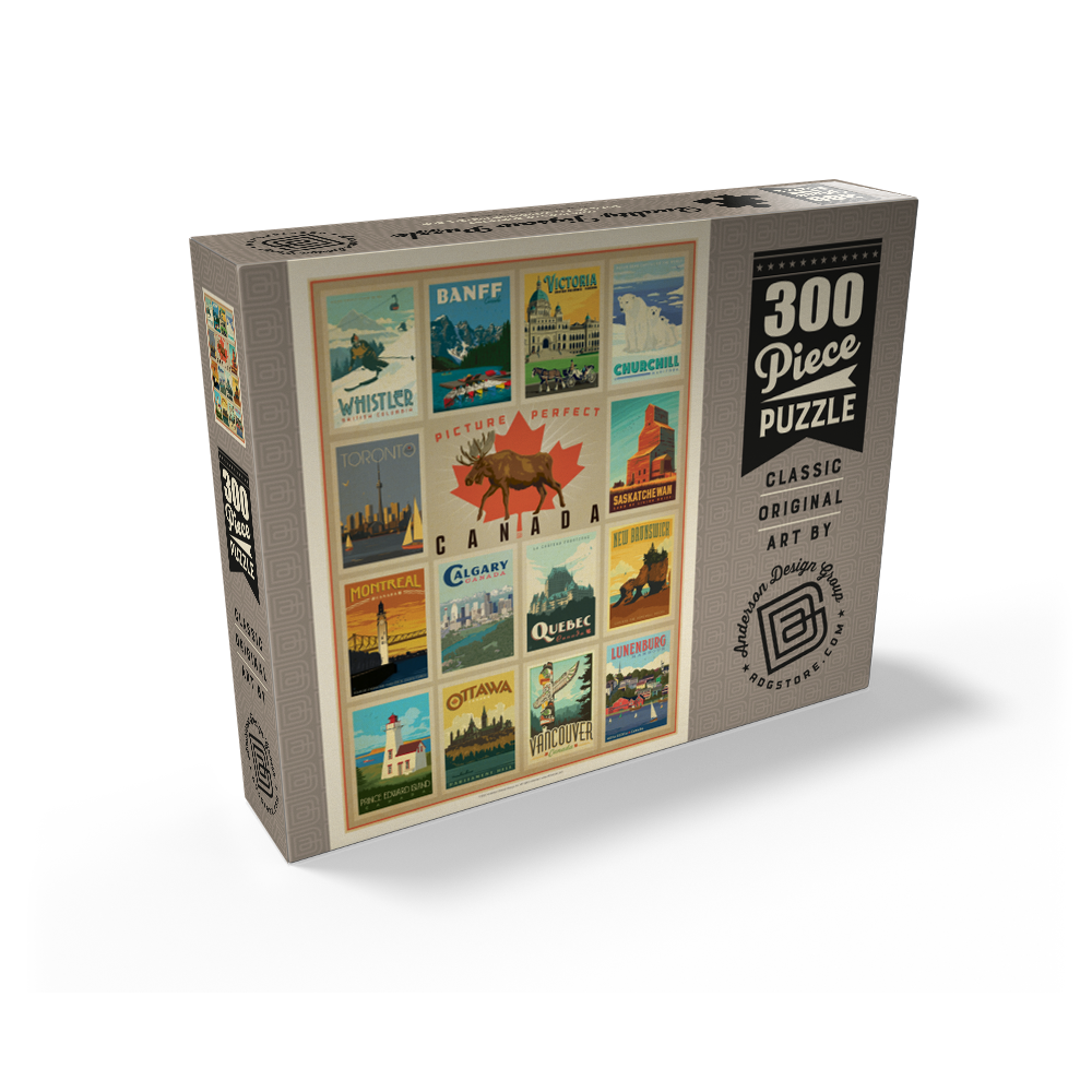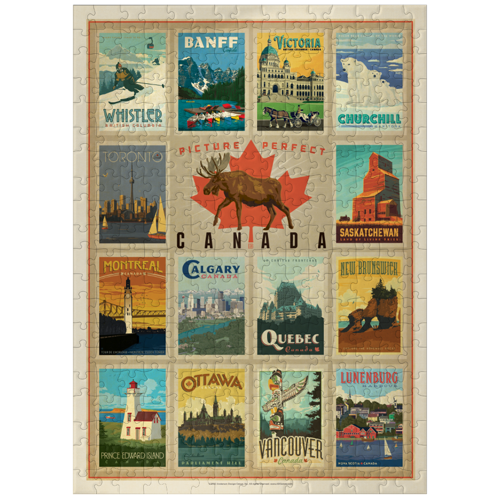 Ah, Canada. A country that welcomes about 20 million visitors per year, this nation is truly a tourist's dream. From the mountains of Banff National Park to the streets of Toronto, the fantastic rock formations of New Brunswick to the historic buildings of Victoria, one could spend every summer for a decade in Canada and still not see all the attractions! Inspired by the wanderlust many feel for this northern paradise, Anderson Design Group crafted a vintage travel poster, a multi-image print of several individual works of art modeled after Canadian attractions.