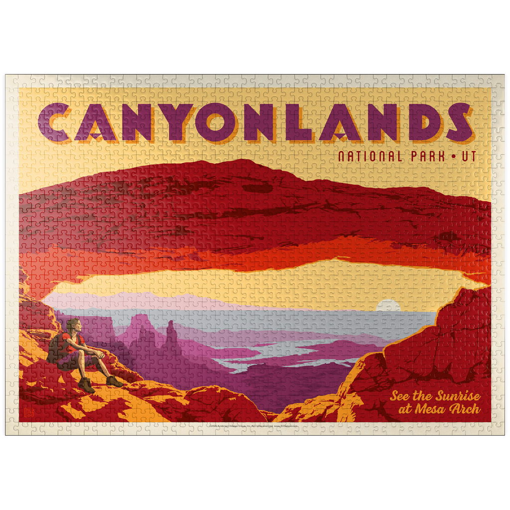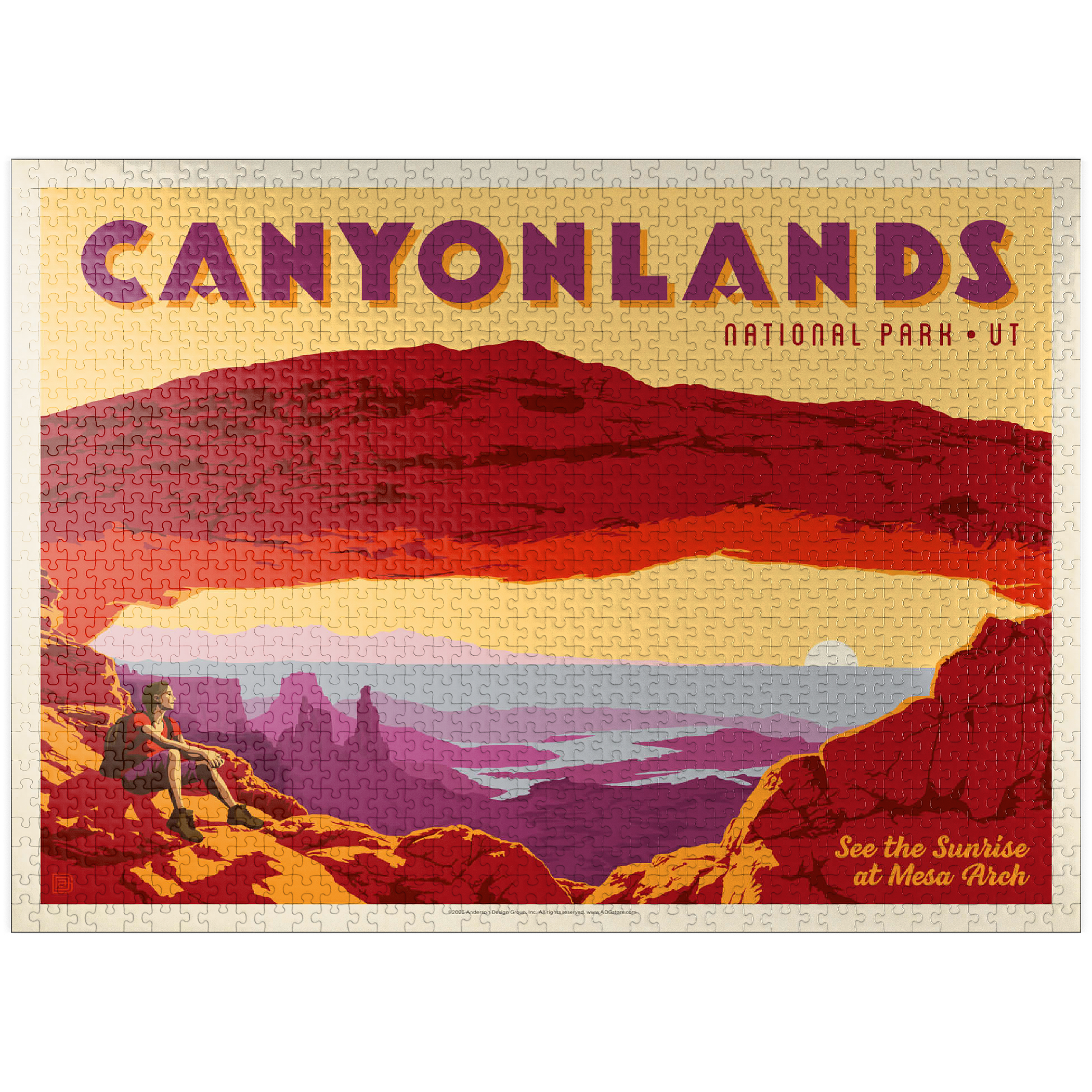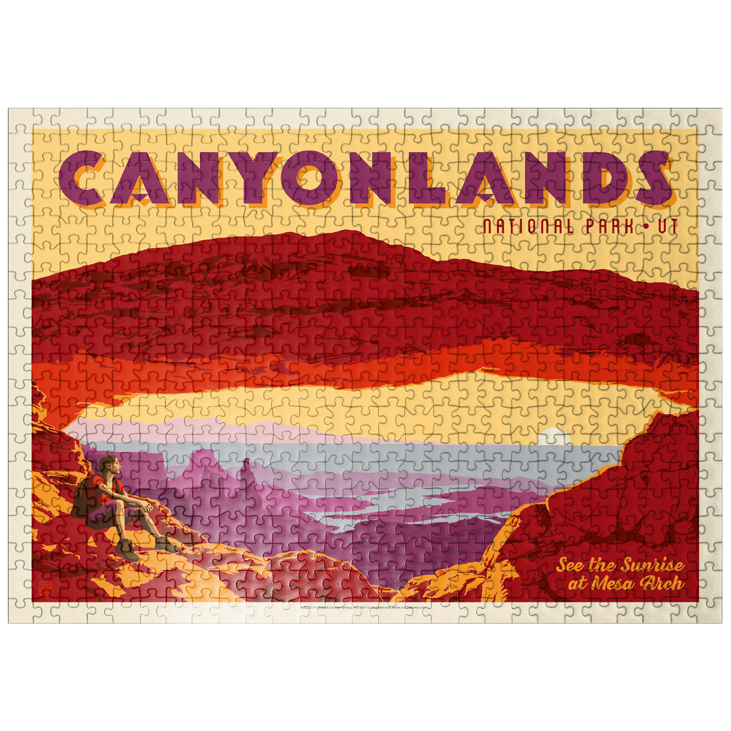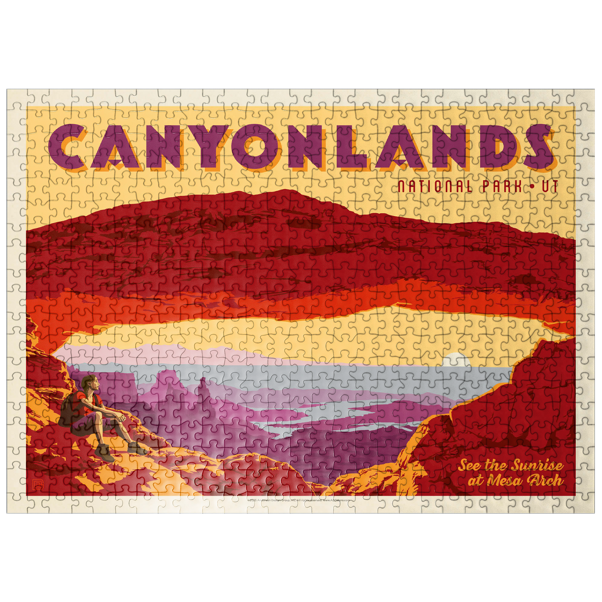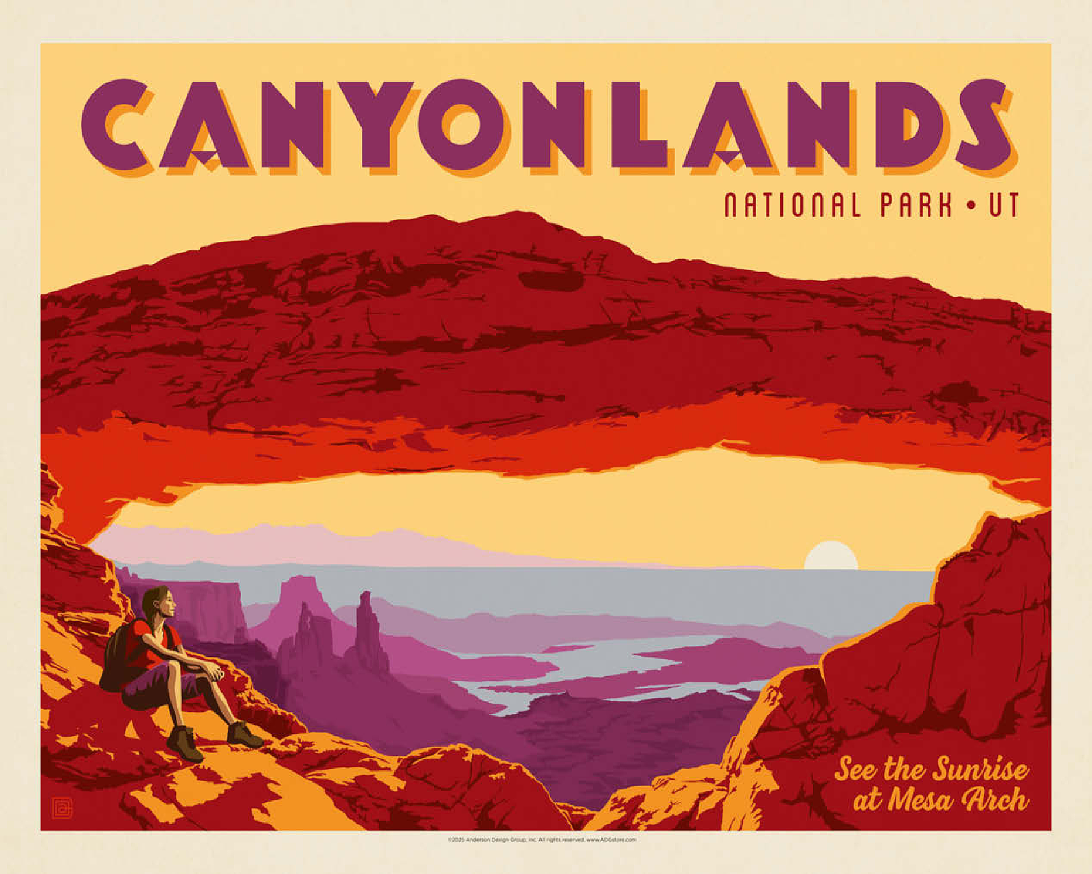Canyonlands National Park in southeastern Utah is a vast wilderness of towering mesas, dramatic canyons, and rugged rock formations, and one of its most famous viewpoints is Mesa Arch. This artwork captures the breathtaking moment of sunrise as the first golden light of day illuminates the underside of the arch in fiery red and orange tones, framing the expansive desert landscape beyond. From this vantage point, visitors can gaze over the canyons carved by the Colorado River and admire the distant spires and mesas that define the park’s unique topography. Canyonlands is divided into four districts—Island in the Sky, The Needles, The Maze, and the rivers—and Mesa Arch, located in the Island in the Sky district, is one of its most photographed features. The scene highlights the solitude and sense of wonder that travelers experience when watching the sunrise at this iconic location, with a hiker sitting at the edge of the cliff in awe of the panoramic view.