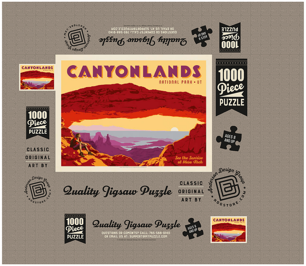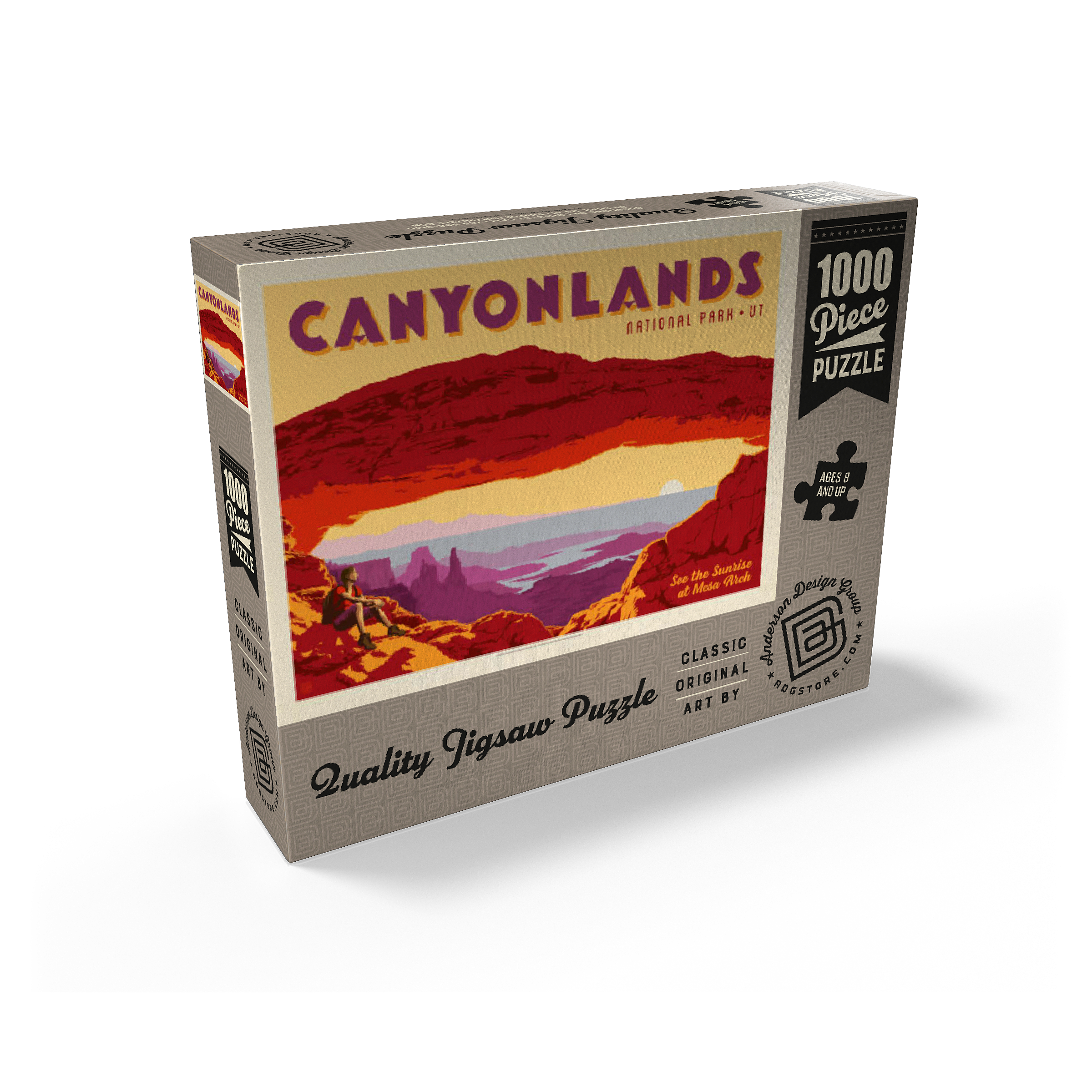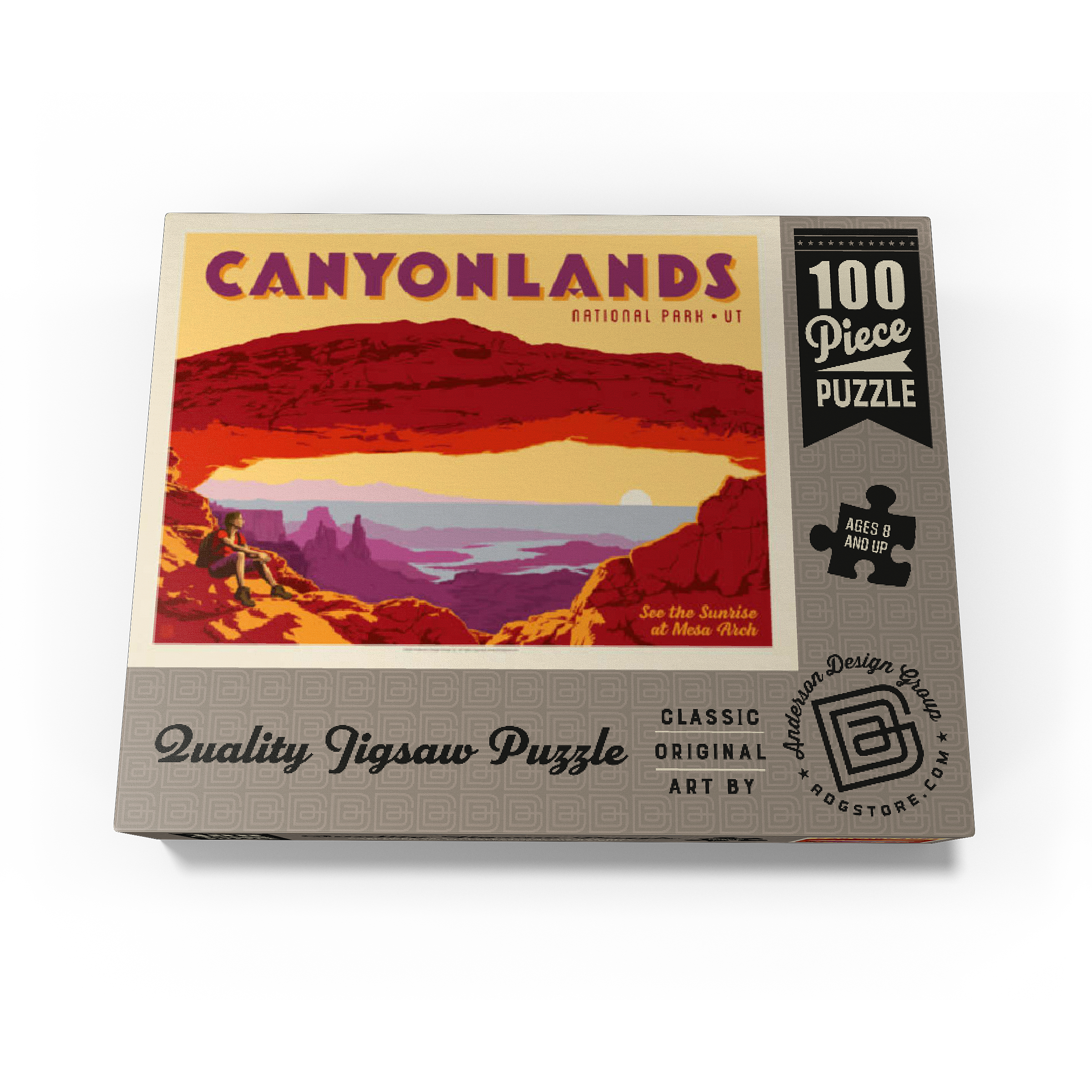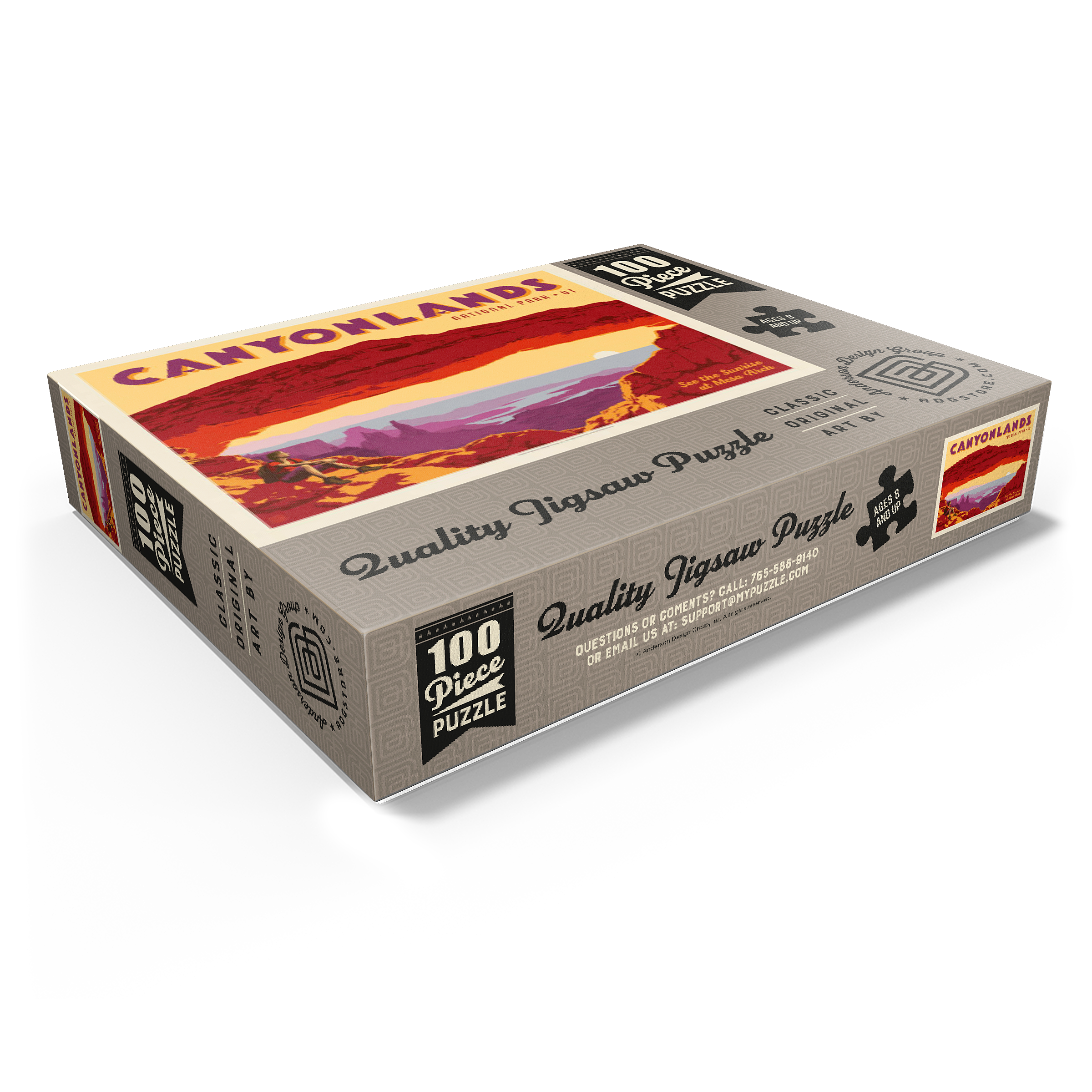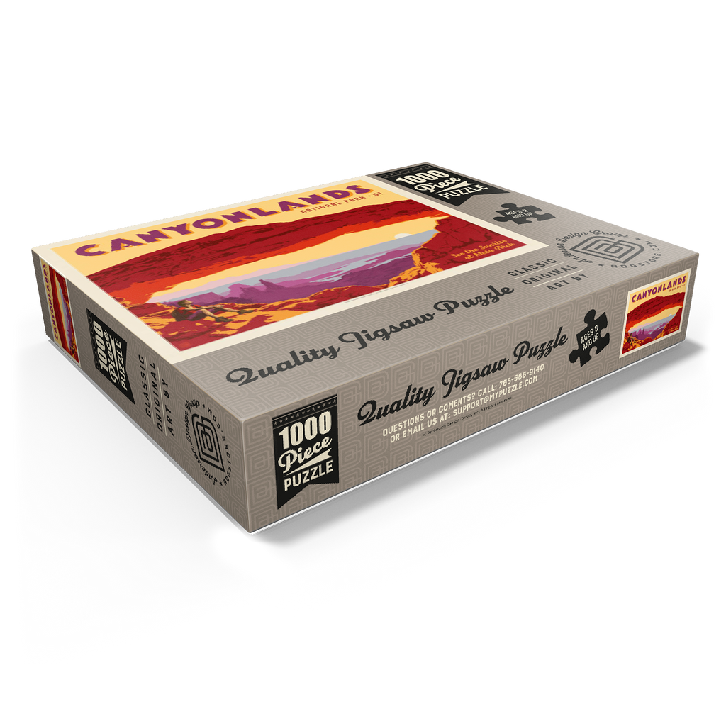 Canyonlands National Park in southeastern Utah is a vast wilderness of towering mesas, dramatic canyons, and rugged rock formations, and one of its most famous viewpoints is Mesa Arch. This artwork captures the breathtaking moment of sunrise as the first golden light of day illuminates the underside of the arch in fiery red and orange tones, framing the expansive desert landscape beyond. From this vantage point, visitors can gaze over the canyons carved by the Colorado River and admire the distant spires and mesas that define the park’s unique topography. Canyonlands is divided into four districts—Island in the Sky, The Needles, The Maze, and the rivers—and Mesa Arch, located in the Island in the Sky district, is one of its most photographed features. The scene highlights the solitude and sense of wonder that travelers experience when watching the sunrise at this iconic location, with a hiker sitting at the edge of the cliff in awe of the panoramic view.