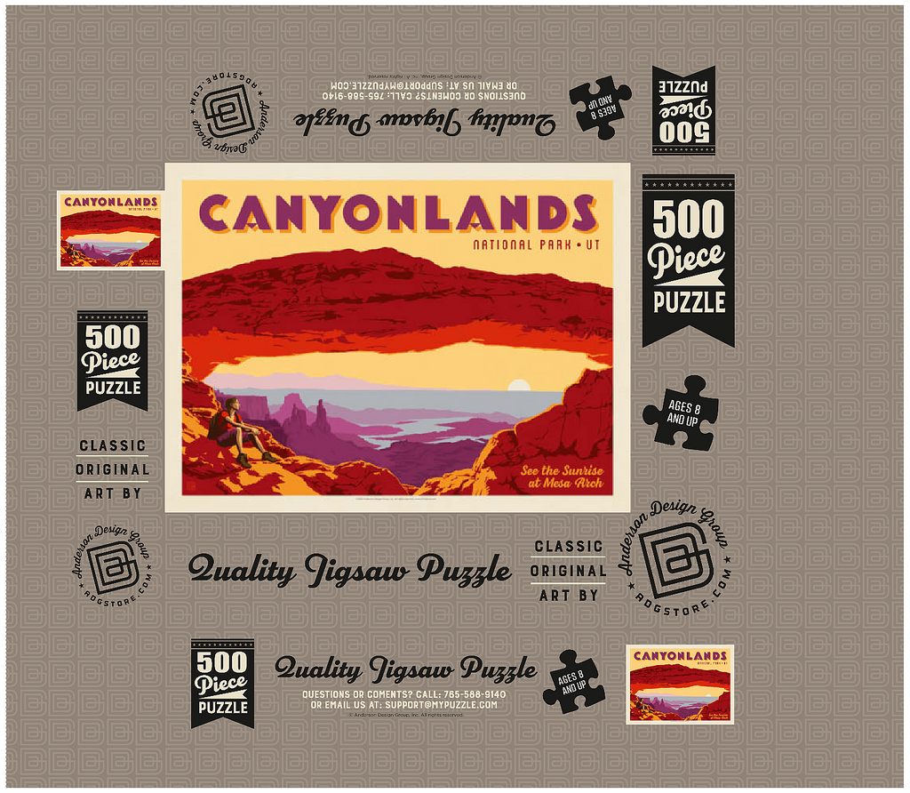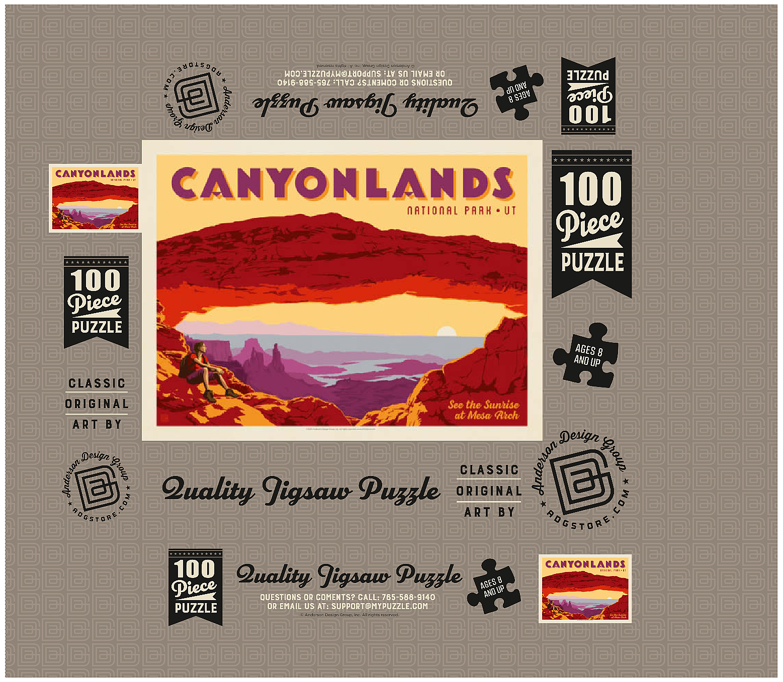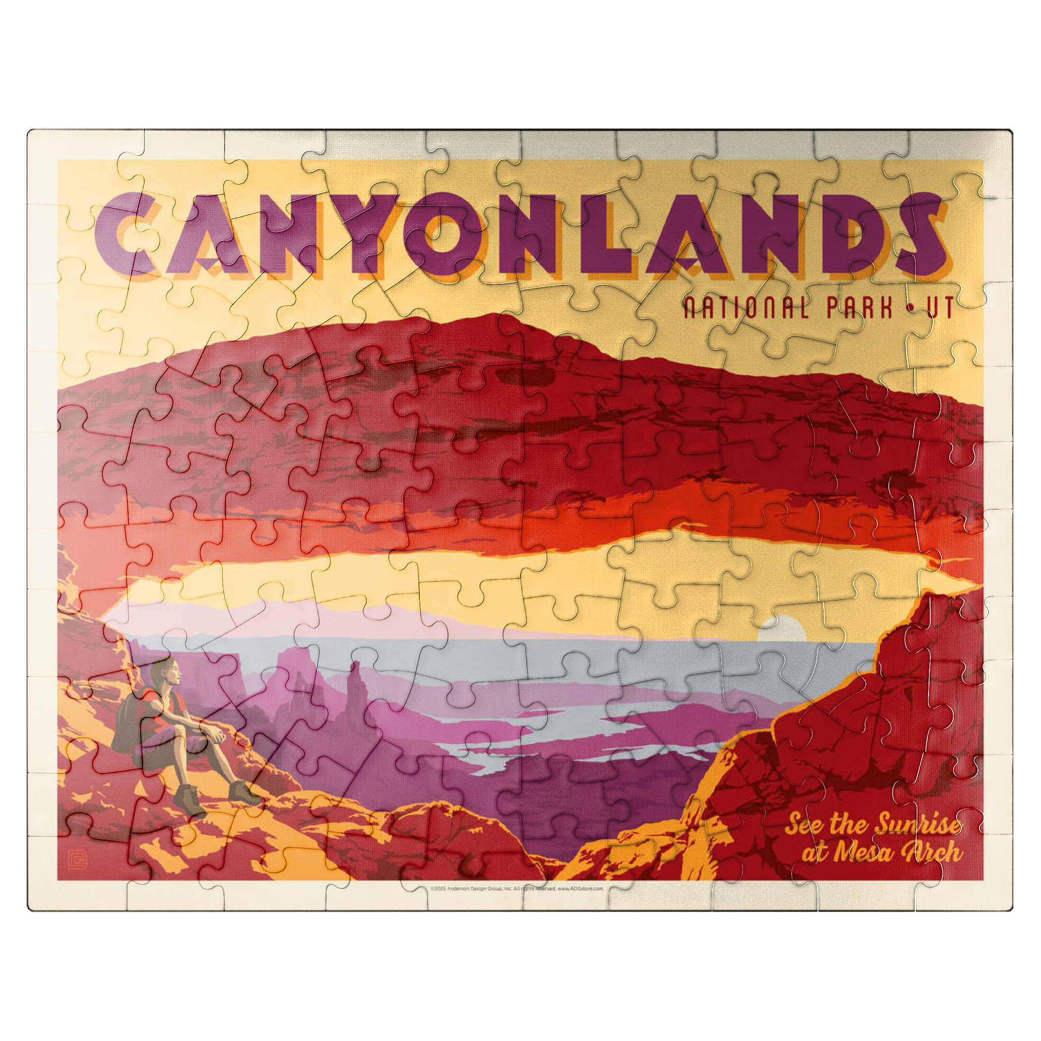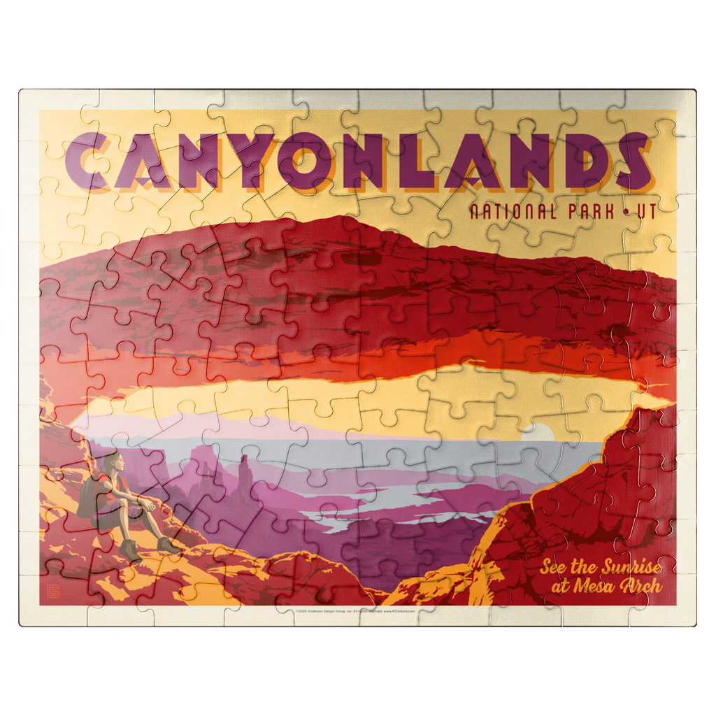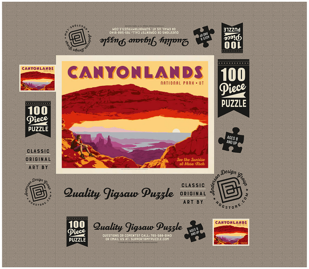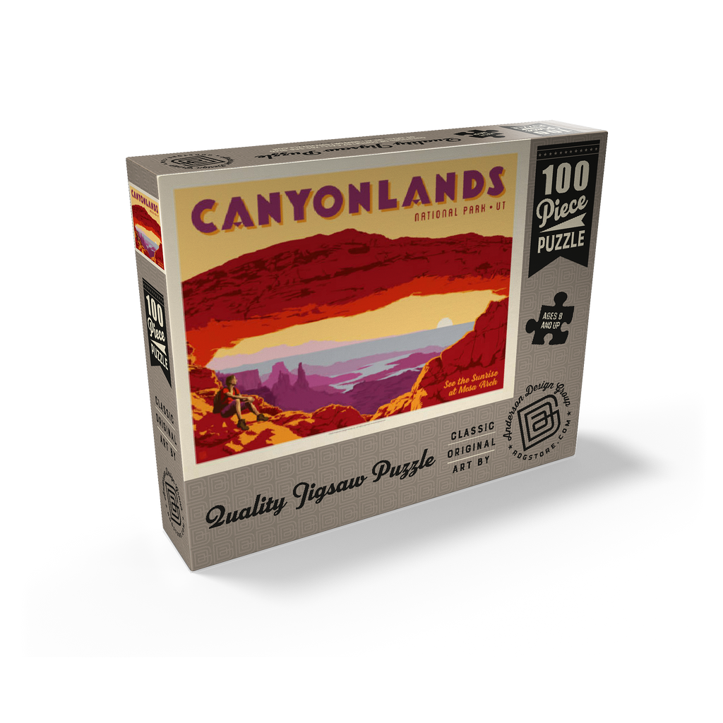 Canyonlands National Park in southeastern Utah is a vast wilderness of towering mesas, dramatic canyons, and rugged rock formations, and one of its most famous viewpoints is Mesa Arch. This artwork captures the breathtaking moment of sunrise as the first golden light of day illuminates the underside of the arch in fiery red and orange tones, framing the expansive desert landscape beyond. From this vantage point, visitors can gaze over the canyons carved by the Colorado River and admire the distant spires and mesas that define the park’s unique topography. Canyonlands is divided into four districts—Island in the Sky, The Needles, The Maze, and the rivers—and Mesa Arch, located in the Island in the Sky district, is one of its most photographed features. The scene highlights the solitude and sense of wonder that travelers experience when watching the sunrise at this iconic location, with a hiker sitting at the edge of the cliff in awe of the panoramic view.
