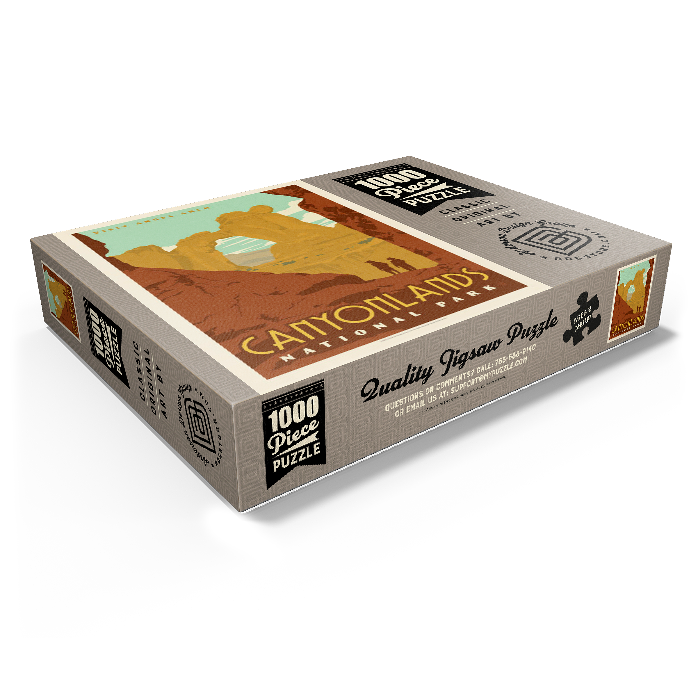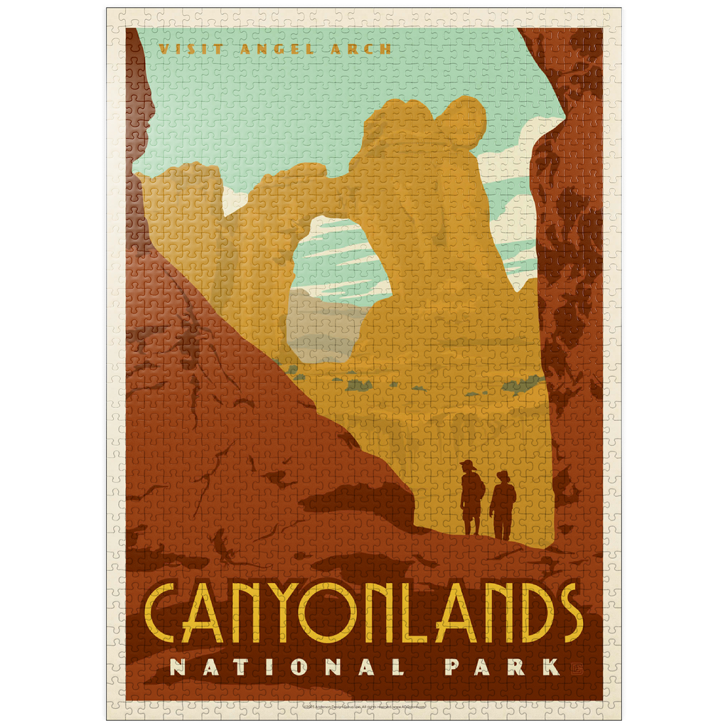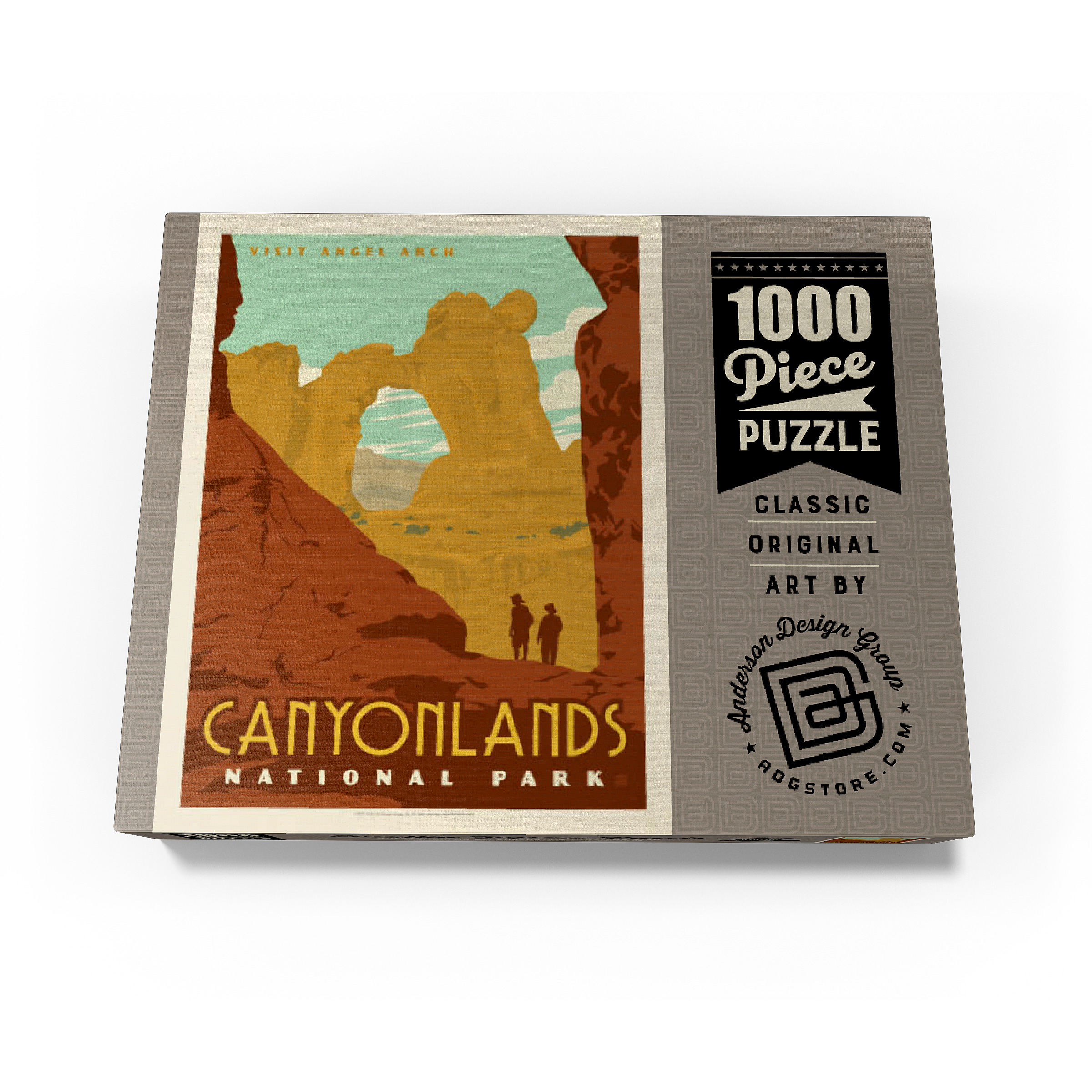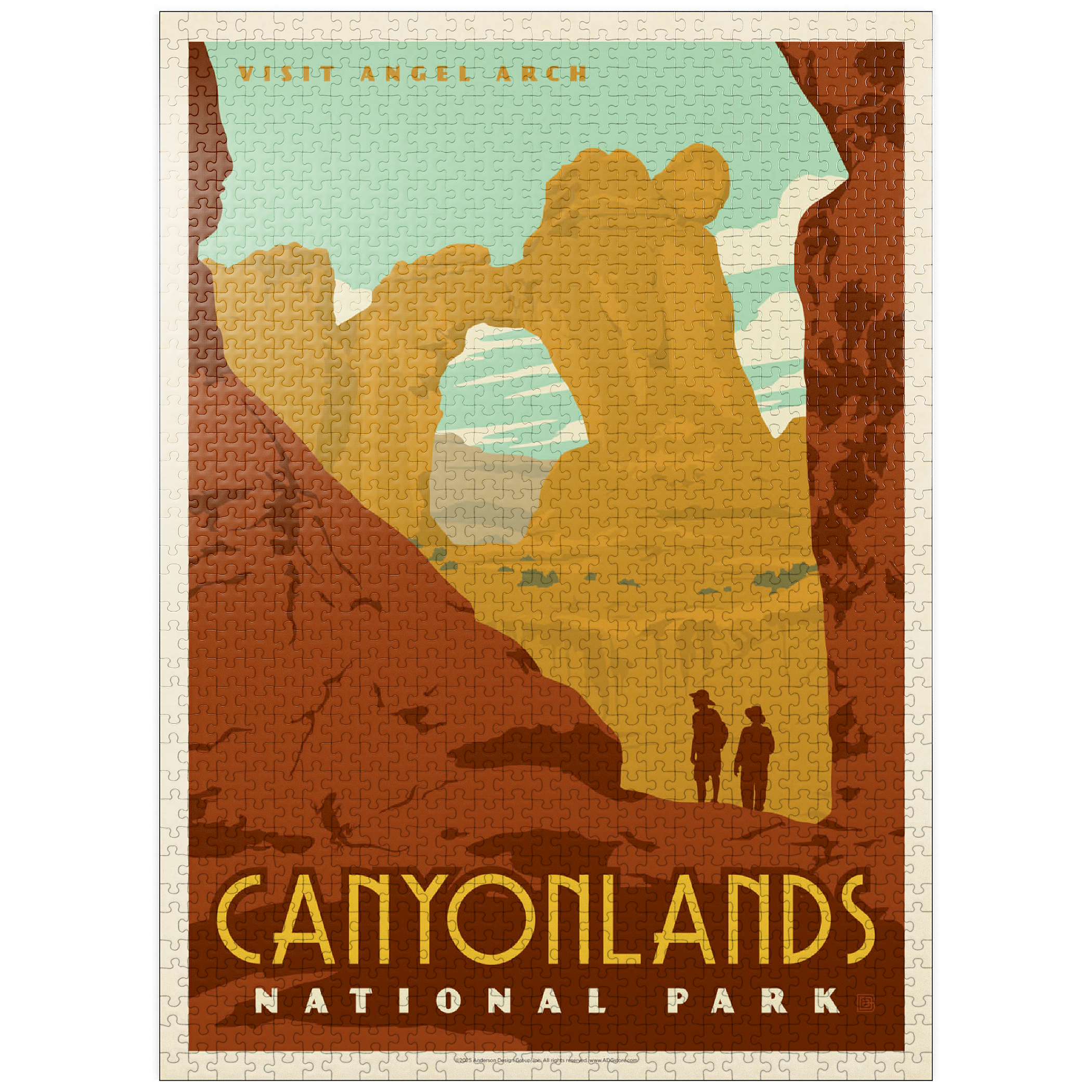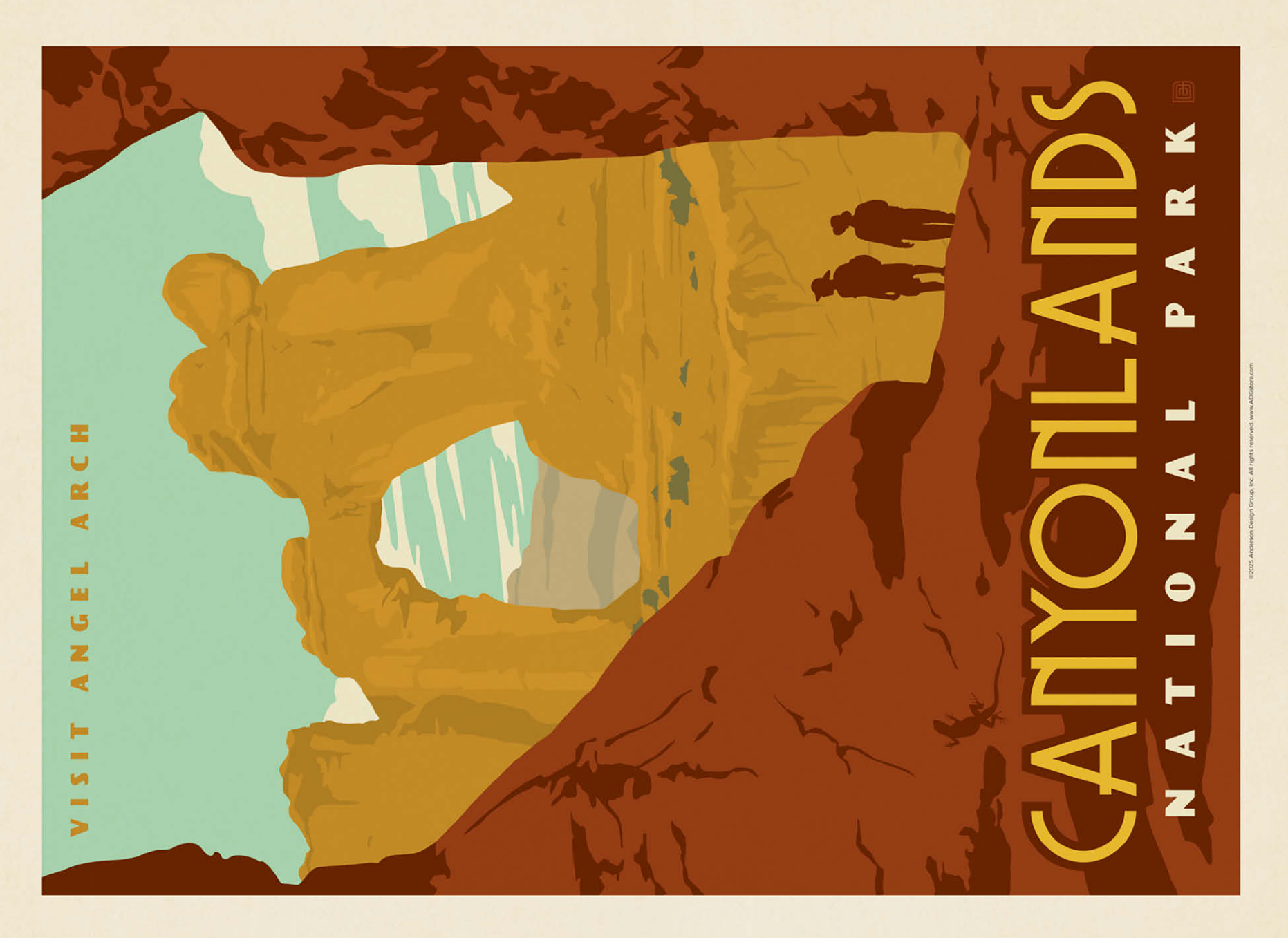 Angel Arch, located in the remote Needles District of Canyonlands National Park, Utah, stands as one of the largest natural arches in the park and a hidden gem for experienced hikers. This stylized depiction shows two visitors gazing at the massive sandstone formation framed by red rock cliffs and a bright desert sky. The arch rises impressively above the rugged canyon floor, showcasing the dramatic erosion and geological beauty typical of the American Southwest. Known for its solitude, towering rock spires, and expansive desert views, Canyonlands offers unforgettable scenery for adventurers seeking unique rock formations and untouched wilderness.