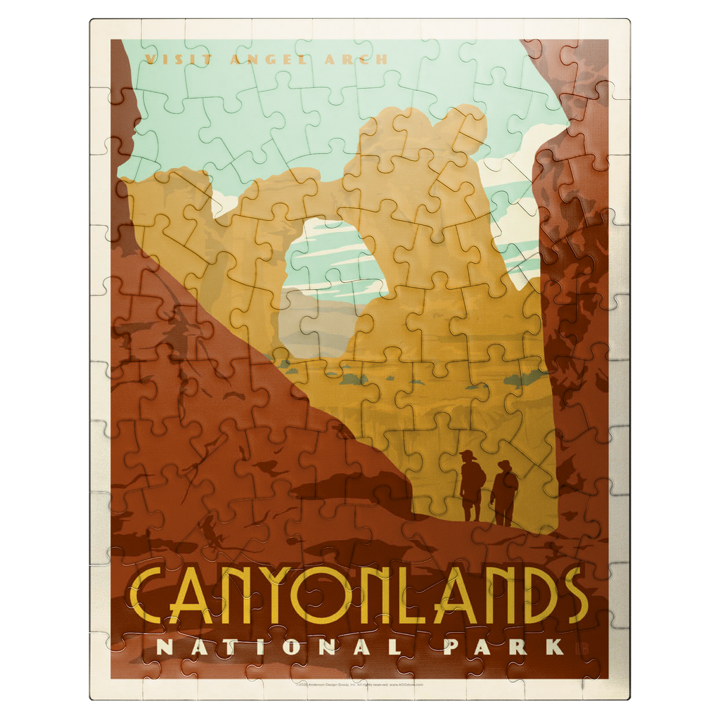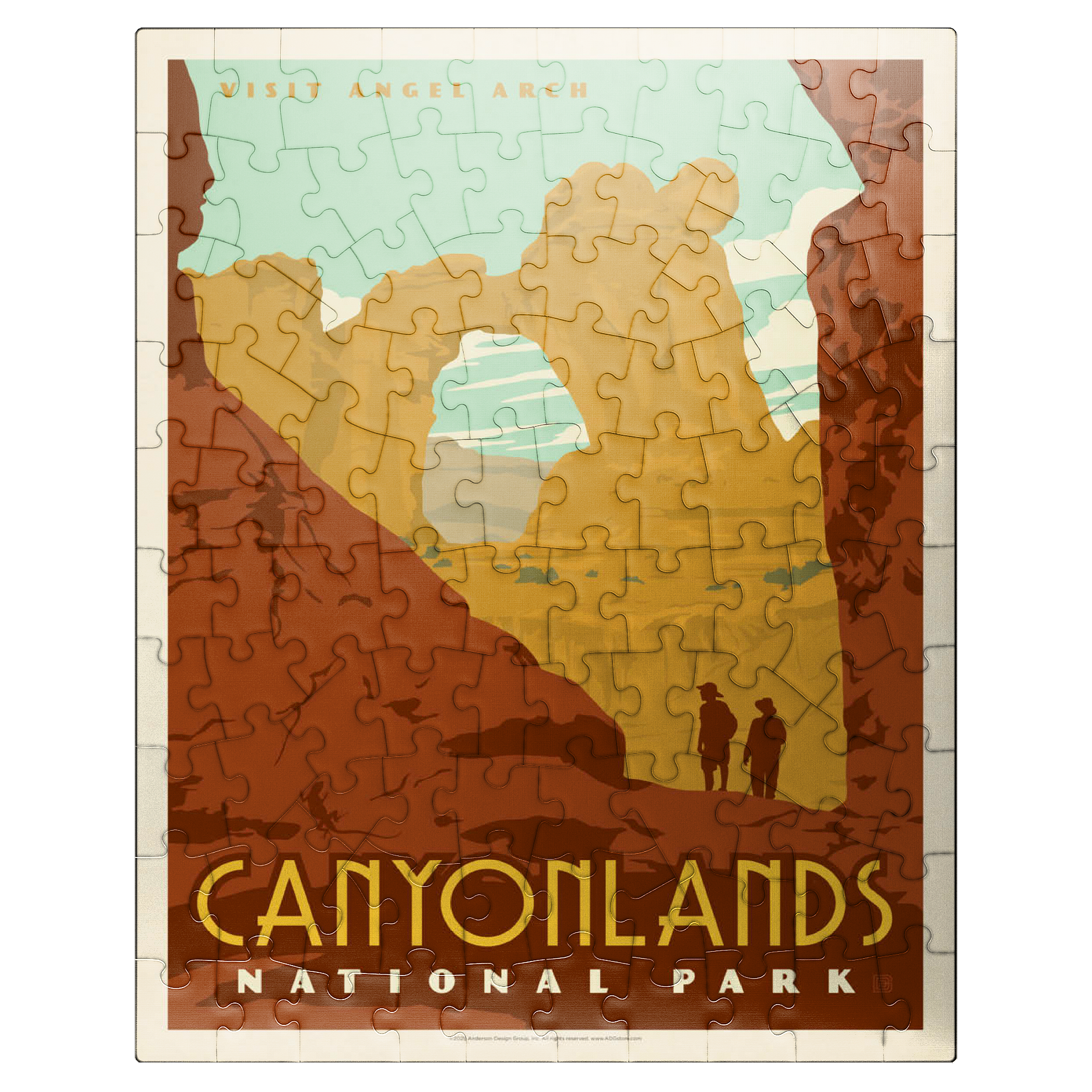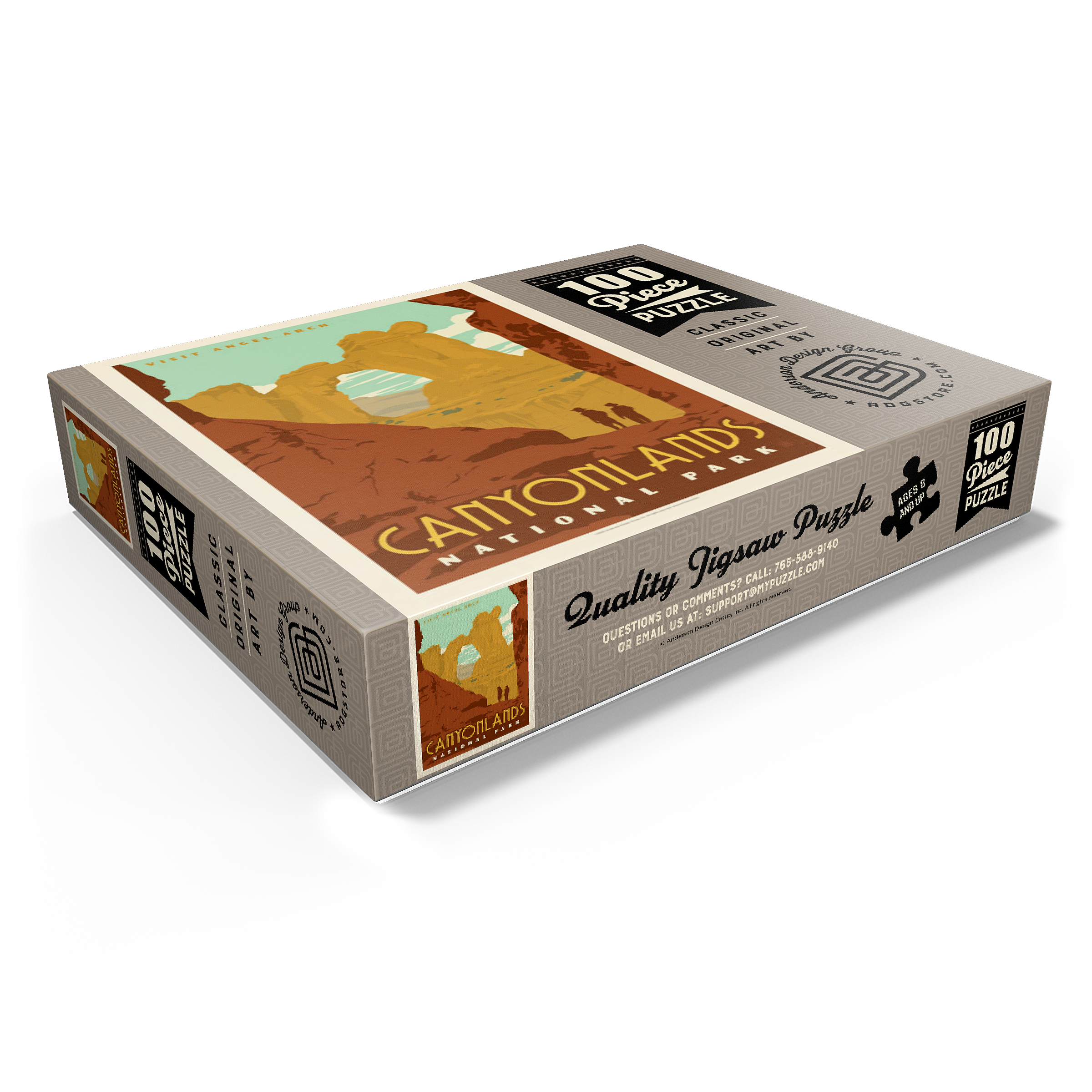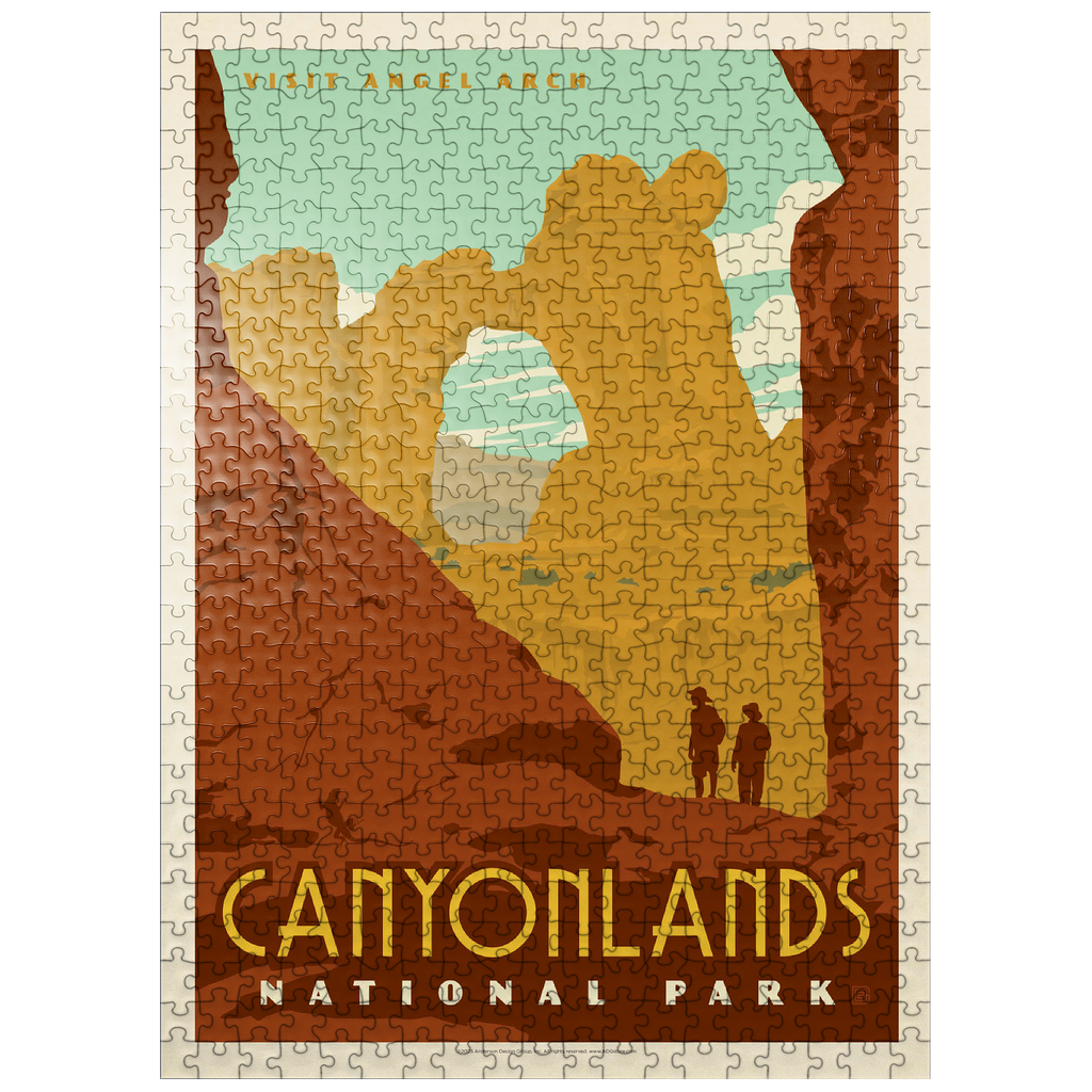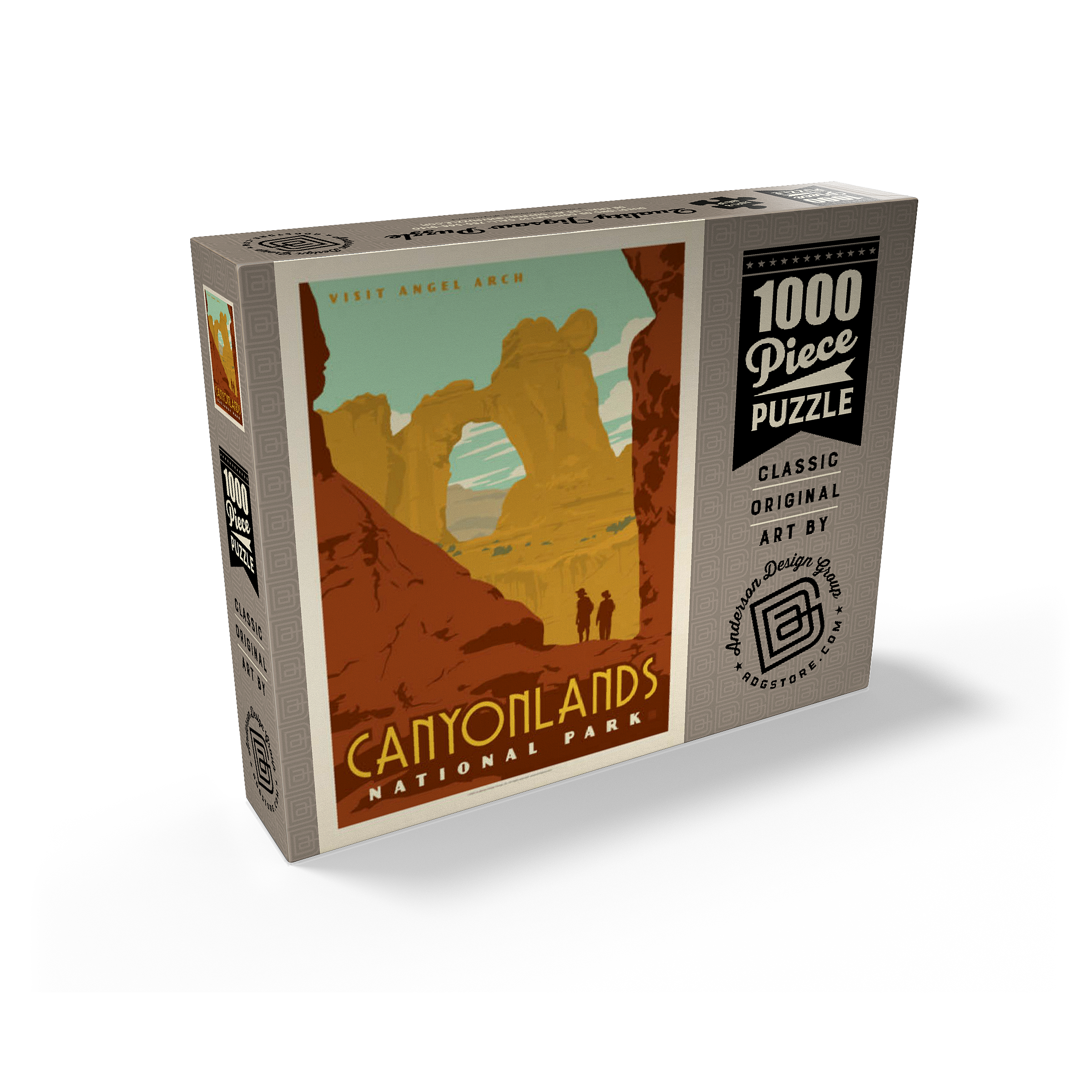 Angel Arch, located in the remote Needles District of Canyonlands National Park, Utah, stands as one of the largest natural arches in the park and a hidden gem for experienced hikers. This stylized depiction shows two visitors gazing at the massive sandstone formation framed by red rock cliffs and a bright desert sky. The arch rises impressively above the rugged canyon floor, showcasing the dramatic erosion and geological beauty typical of the American Southwest. Known for its solitude, towering rock spires, and expansive desert views, Canyonlands offers unforgettable scenery for adventurers seeking unique rock formations and untouched wilderness.