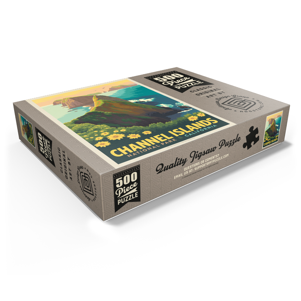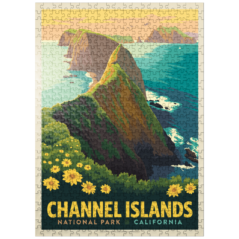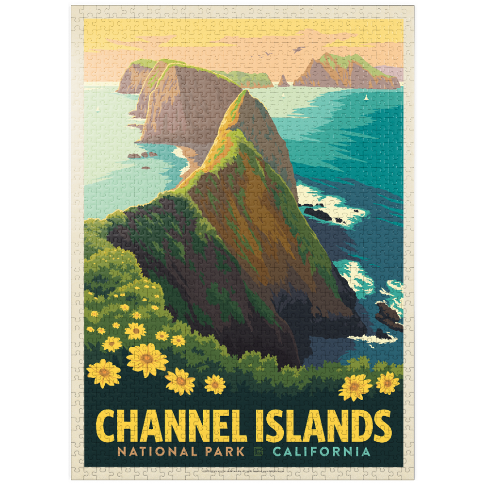 Channel Islands National Park in California is featured in a bold retro travel poster style view from a high coastal bluff, looking across rugged sea cliffs and offshore sea stacks toward the Channel Islands, a protected archipelago off Southern California known for rich marine life. Turquoise Pacific water and emerald headlands create strong contrast, while white surf outlines rocky coves below. Golden wildflowers and dense coastal scrub frame the foreground, and seabirds glide above the horizon with small sailboats crossing the Santa Barbara Channel. This scenic overlook captures iconic ocean vistas, island hiking energy, and the wild coastal character of this national park.