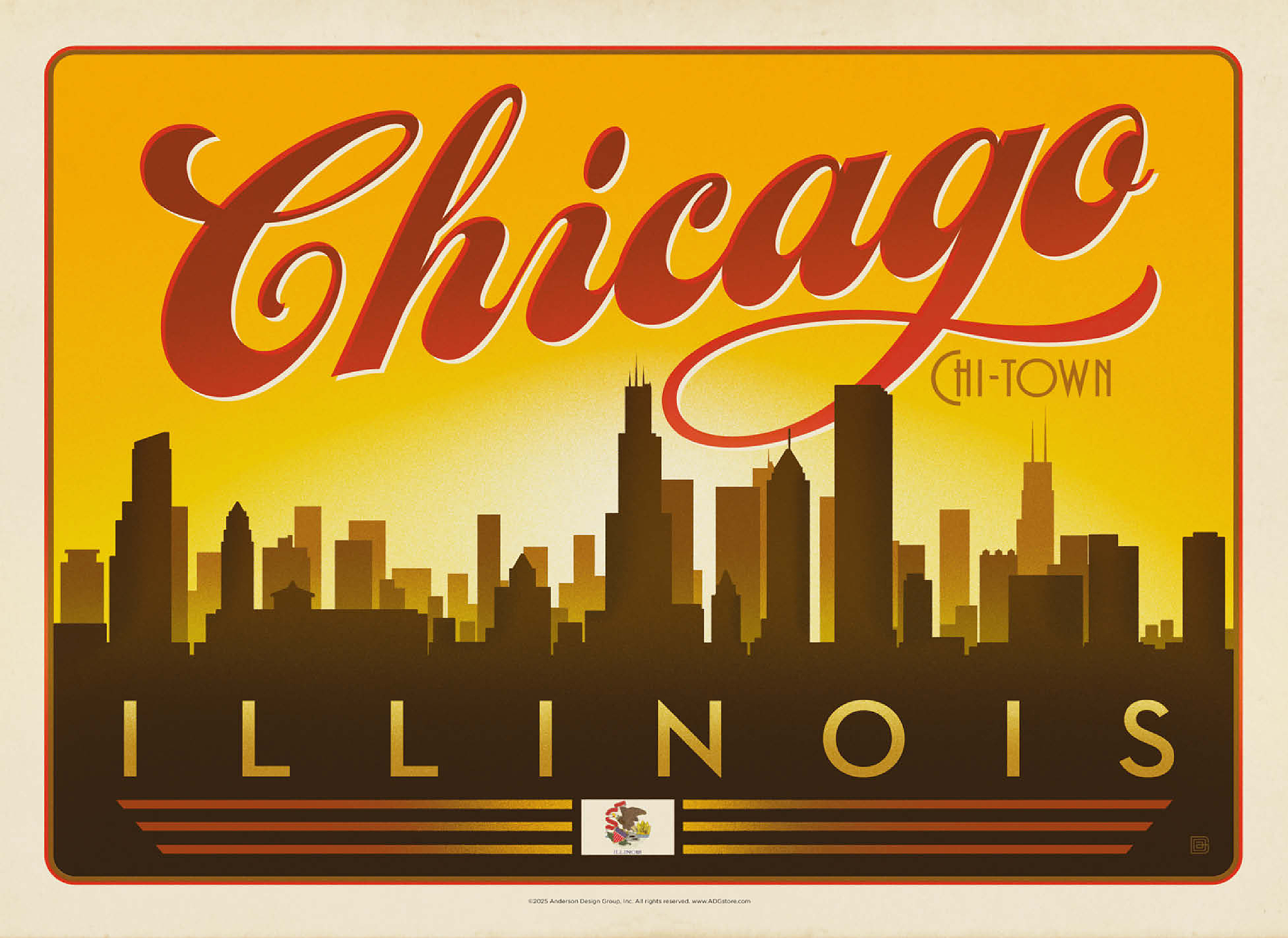 Chicago, Illinois, known as the Windy City, is one of America’s most iconic metropolitan destinations, celebrated for its bold architecture, cultural heritage, and stunning skyline. This artwork captures the Chicago cityscape at sunset, with the silhouette of its famous skyscrapers rising against a golden sky. Notable landmarks such as the Willis Tower and John Hancock Building stand tall, symbolizing the city’s reputation as a hub of architectural innovation. Chicago sits on the shores of Lake Michigan and is famous for its world-class museums, deep-dish pizza, jazz and blues history, and vibrant neighborhoods that blend culture, art, and commerce. The nickname “Chi-Town,” displayed in the design, reflects the city’s enduring character and its role as a cultural and economic powerhouse in the Midwest. As the third-largest city in the United States, Chicago offers endless attractions, from Millennium Park and Navy Pier to the Magnificent Mile and the Art Institute of Chicago.