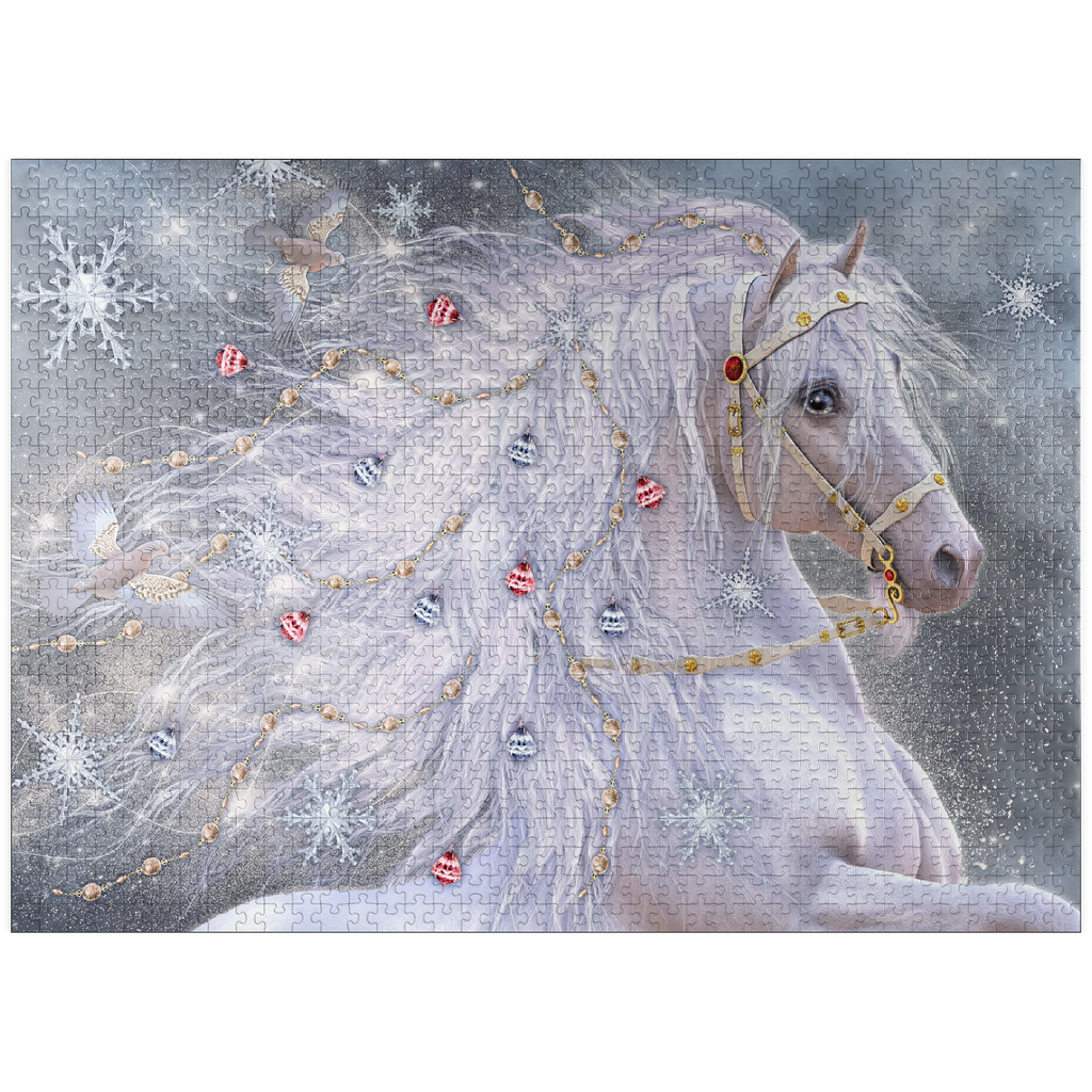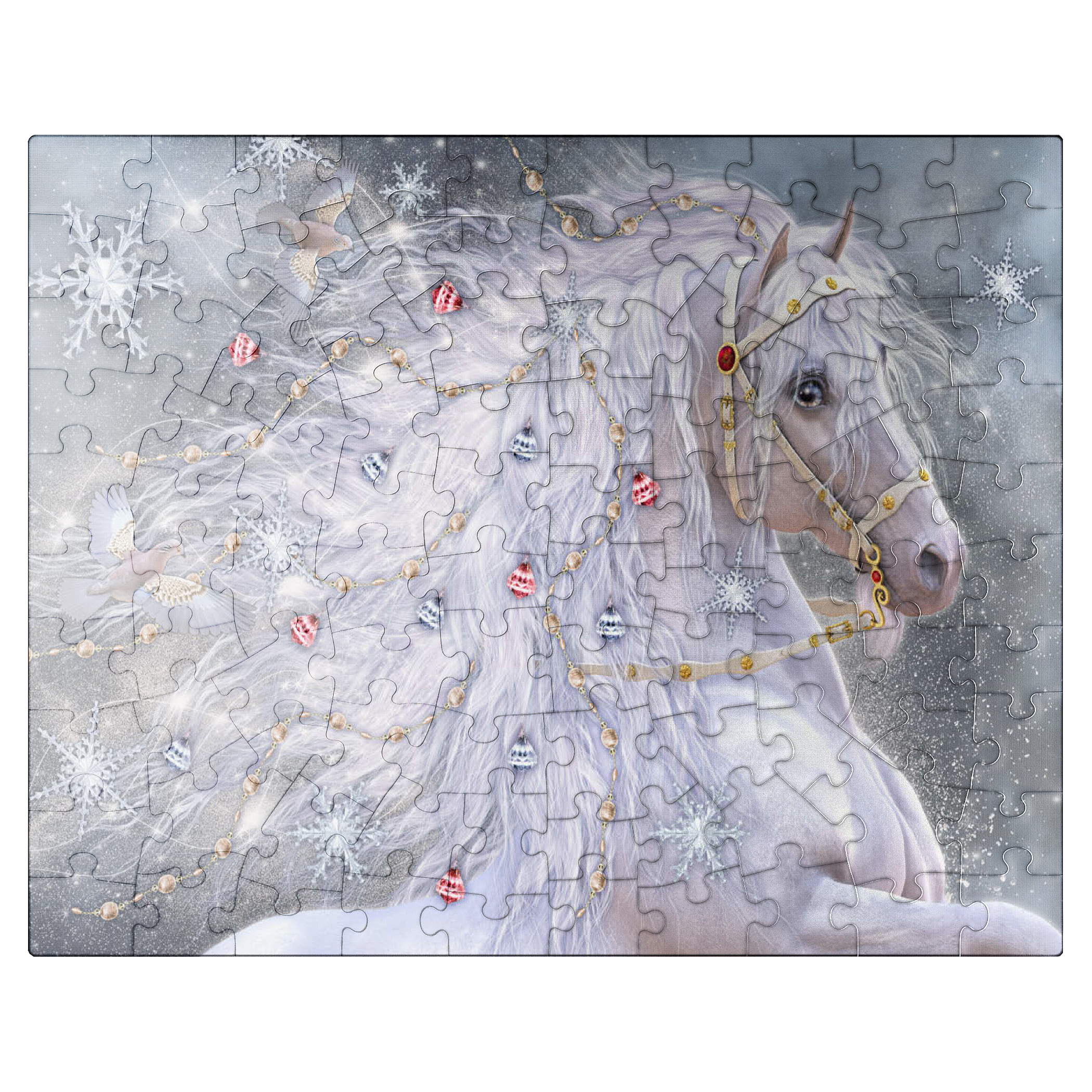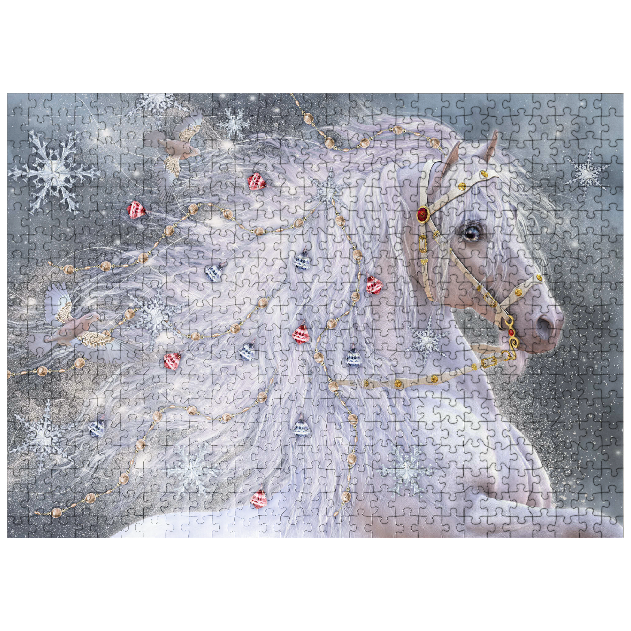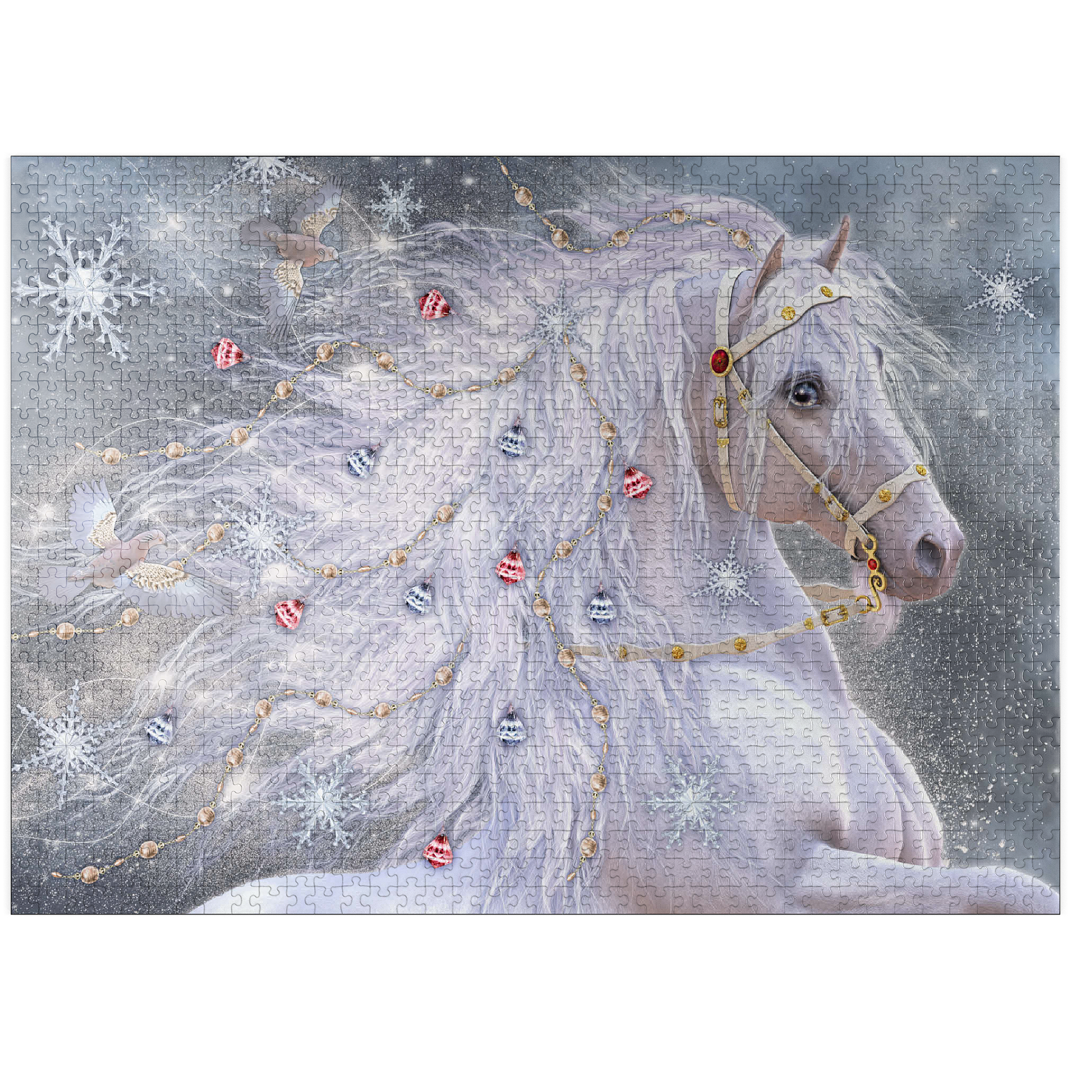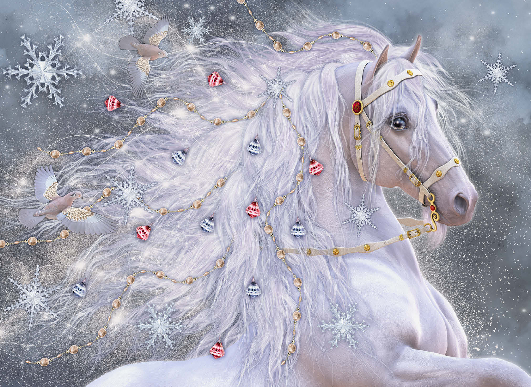An enchanting blue-eyed white horse, embodying the magic of Christmas, sports a shimmering, ethereal mane adorned with delicate gold chains, red and silver jingle bells, and sparkling snowflakes. Two graceful doves fly alongside its flowing hair, which swirls with light. The background is a soft, snowy landscape filled with large, intricate snowflakes and a subtle glow. This festive fantasy artwork by Laurie Prindle captures the wonder of winter, holidays, mythical creatures, and enchanted snowscapes.
