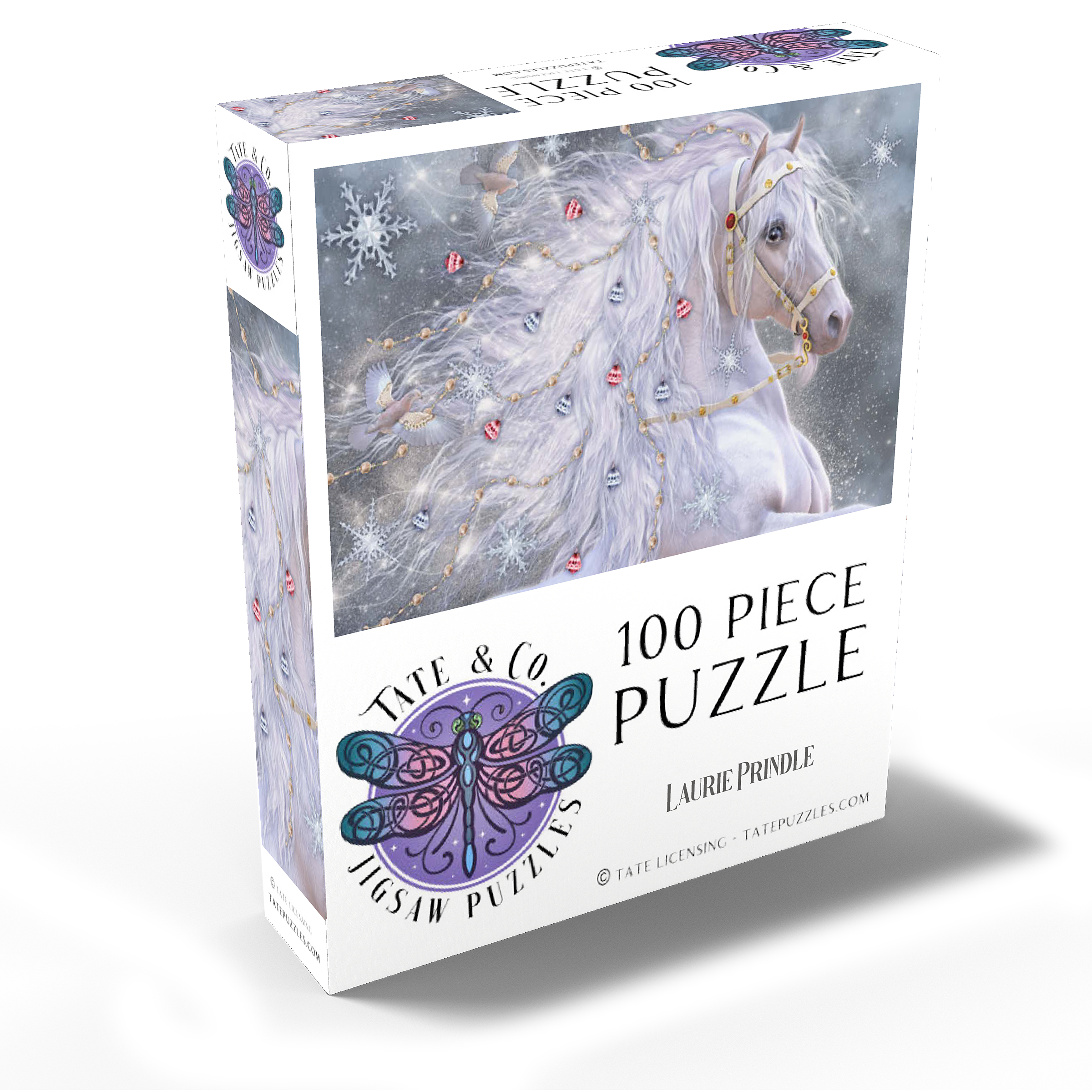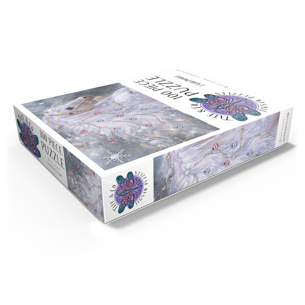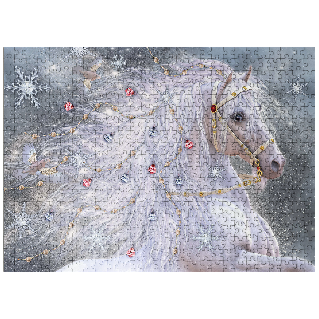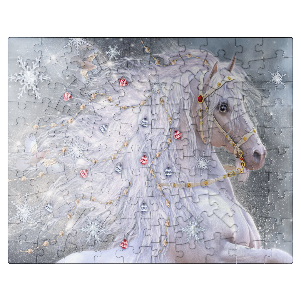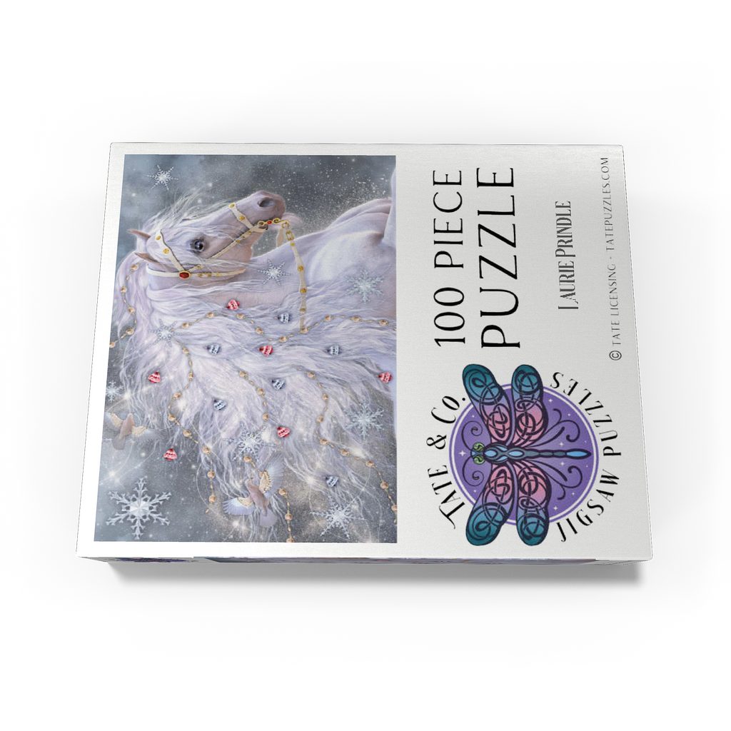 An enchanting blue-eyed white horse, embodying the magic of Christmas, sports a shimmering, ethereal mane adorned with delicate gold chains, red and silver jingle bells, and sparkling snowflakes. Two graceful doves fly alongside its flowing hair, which swirls with light. The background is a soft, snowy landscape filled with large, intricate snowflakes and a subtle glow. This festive fantasy artwork by Laurie Prindle captures the wonder of winter, holidays, mythical creatures, and enchanted snowscapes.