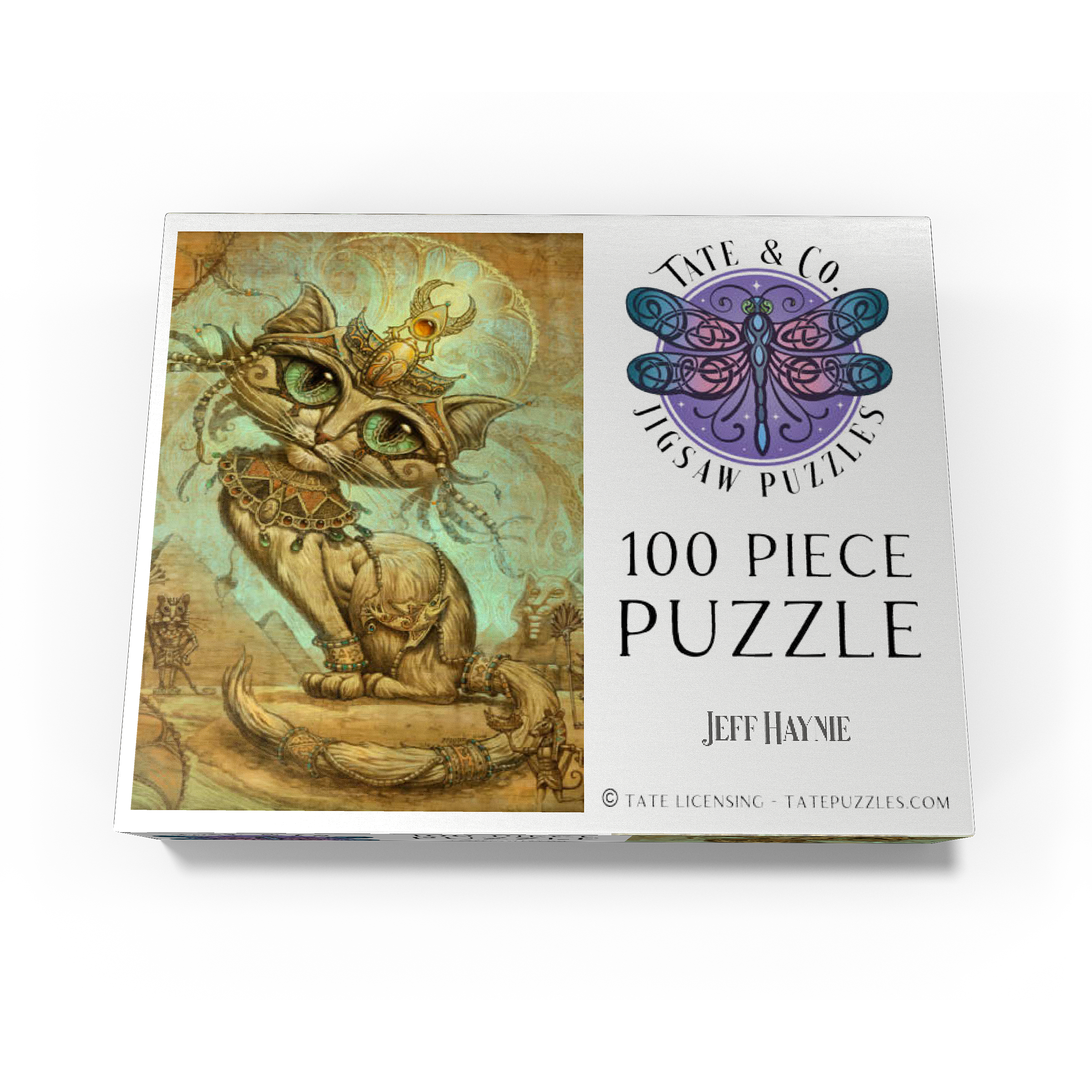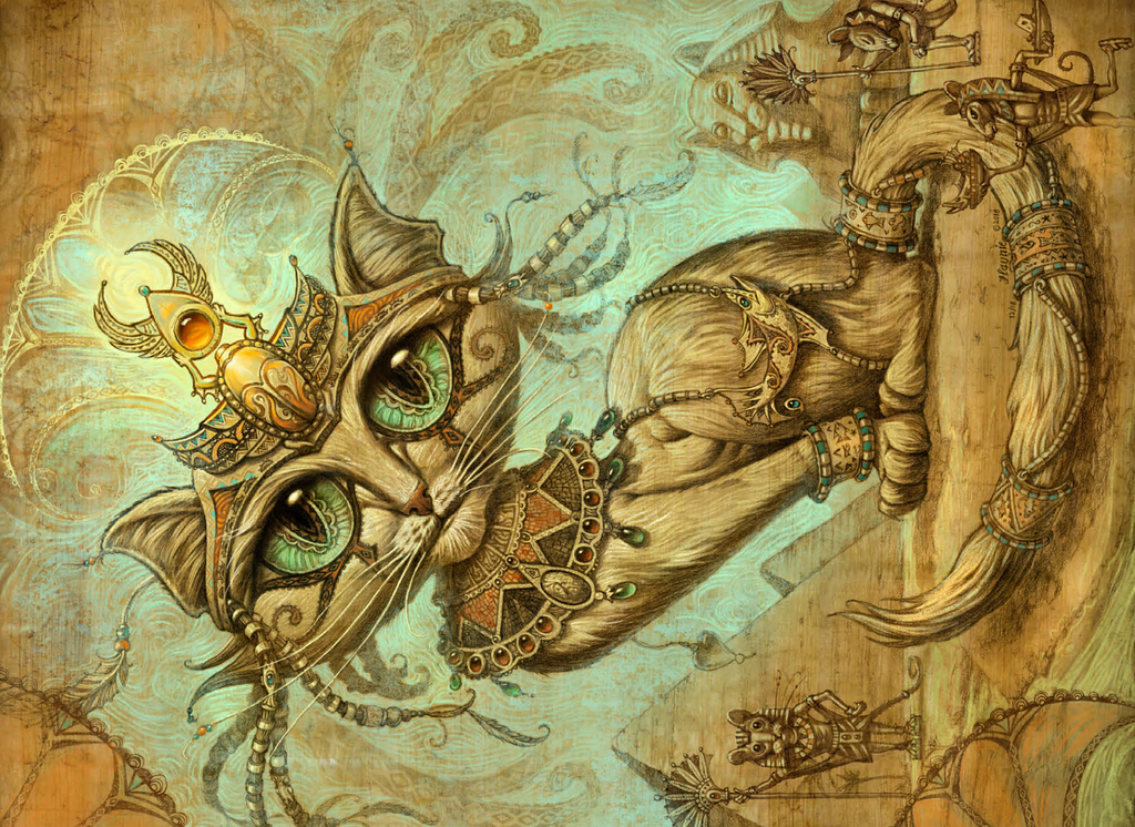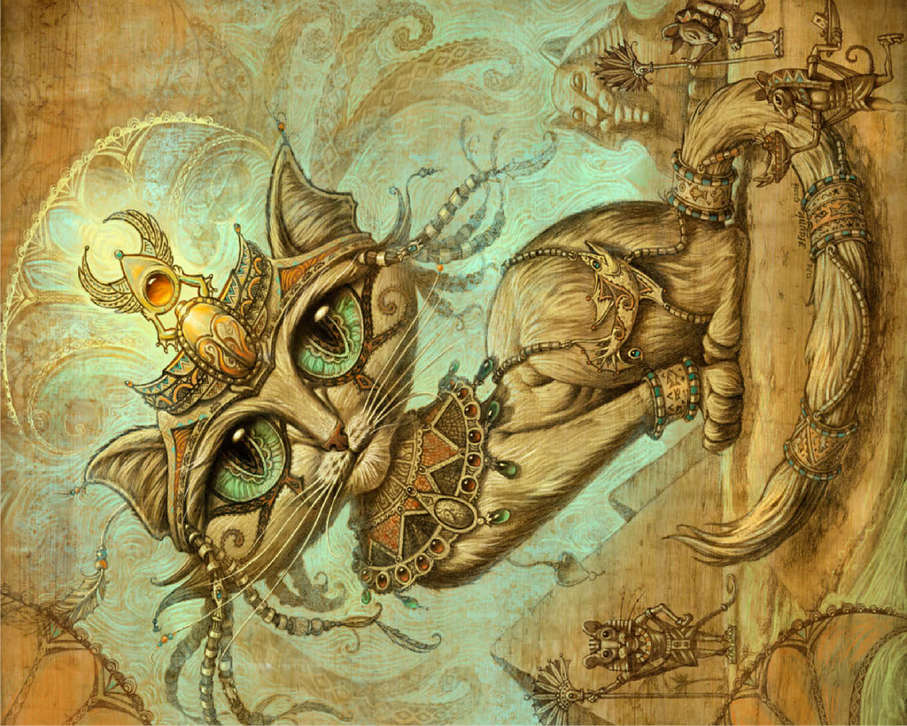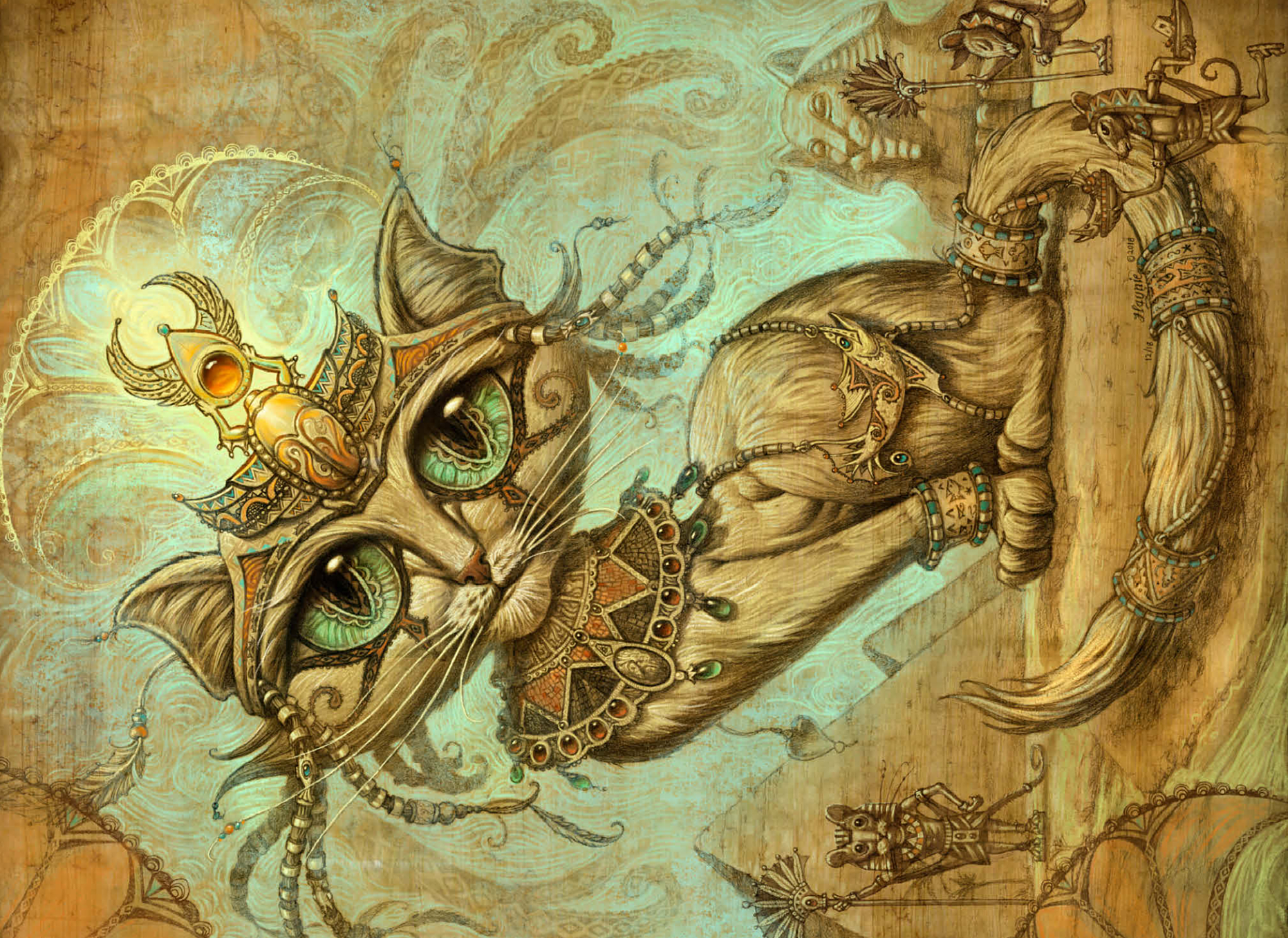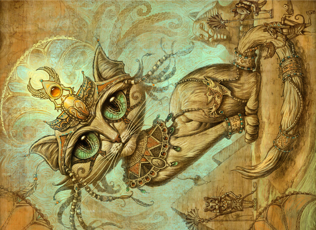Jeff Haynie's artwork depicts an Egyptian-themed cat adorned in royal attire, surrounded by a whimsical, ancient setting. The image features a central cat character wearing an elaborate Egyptian headdress and jewelry