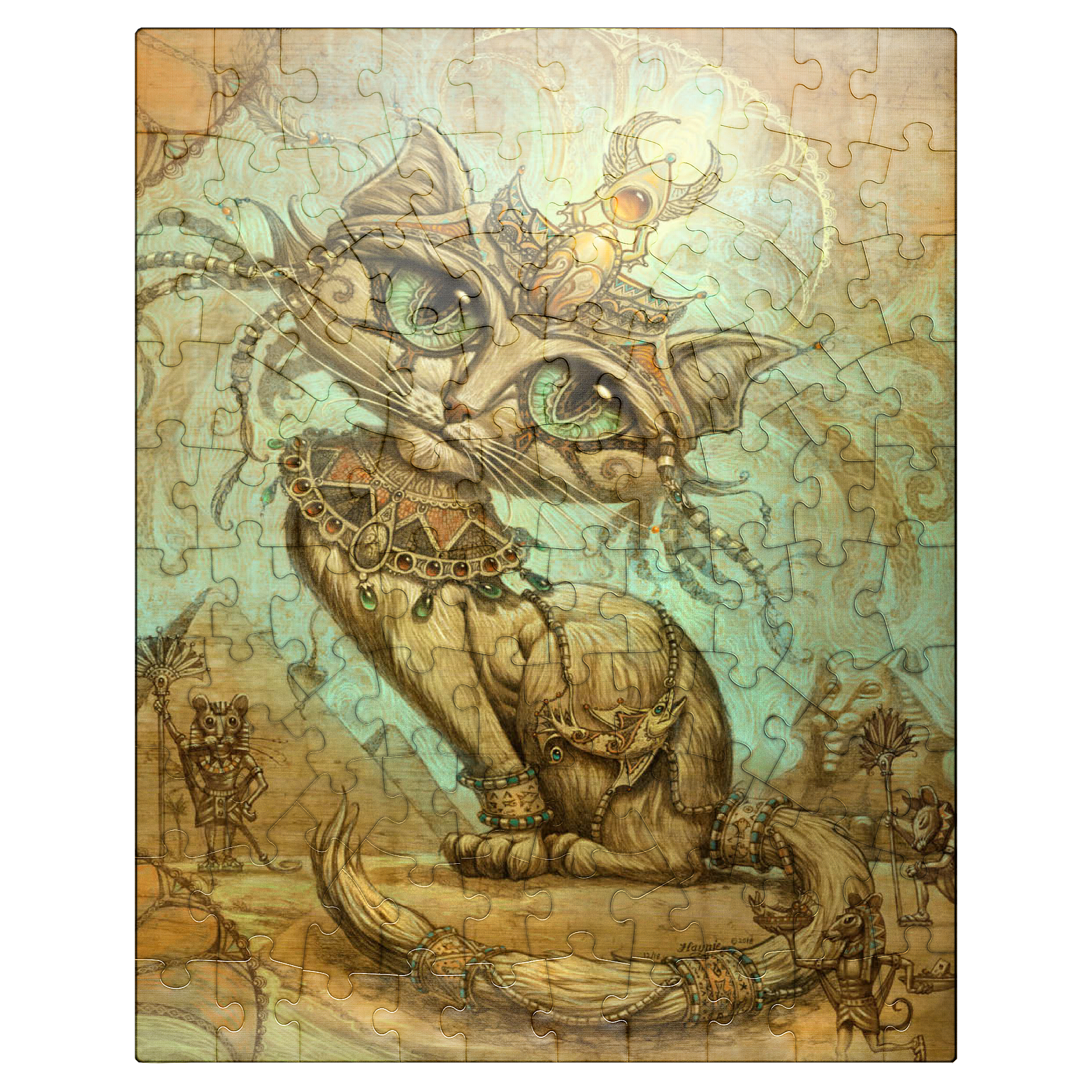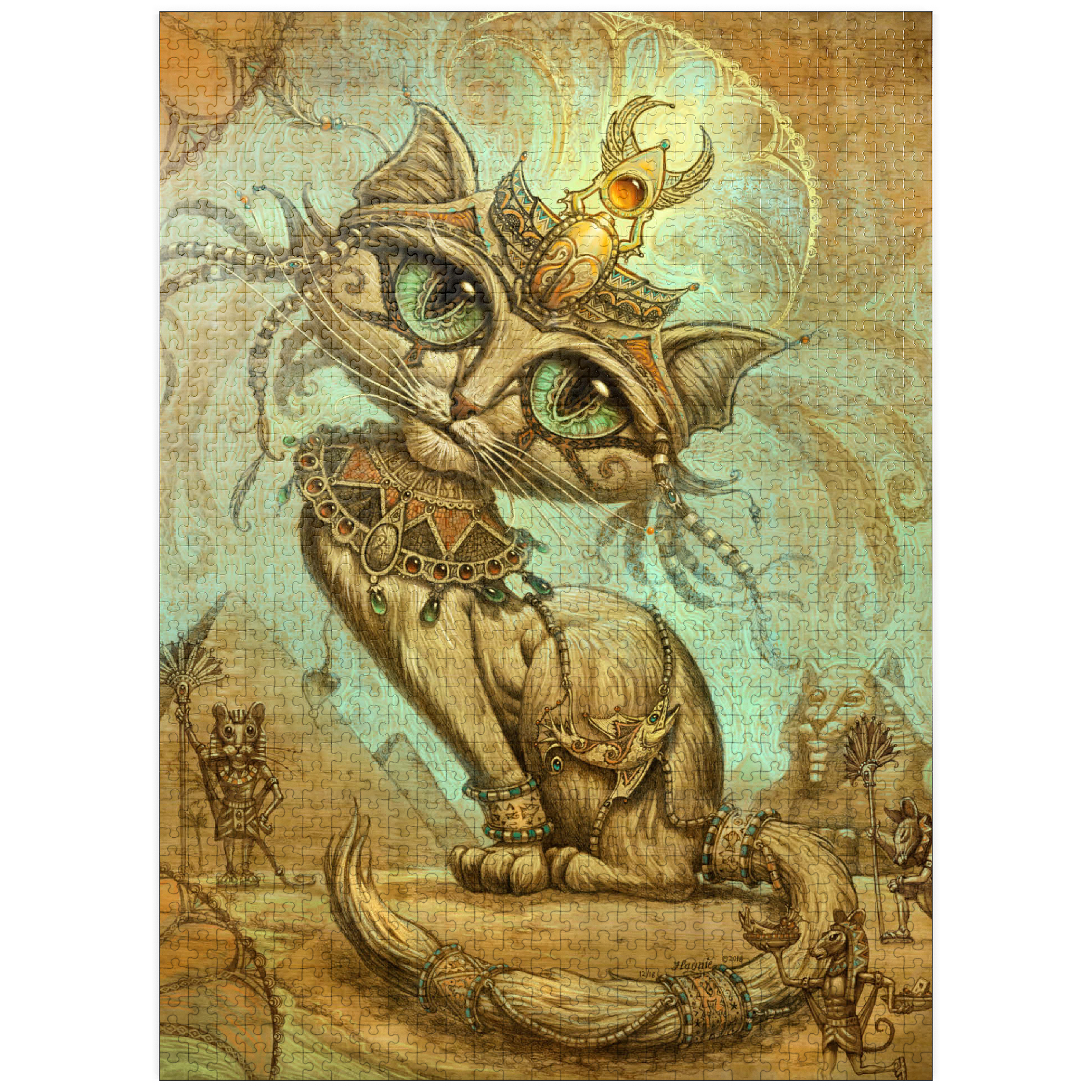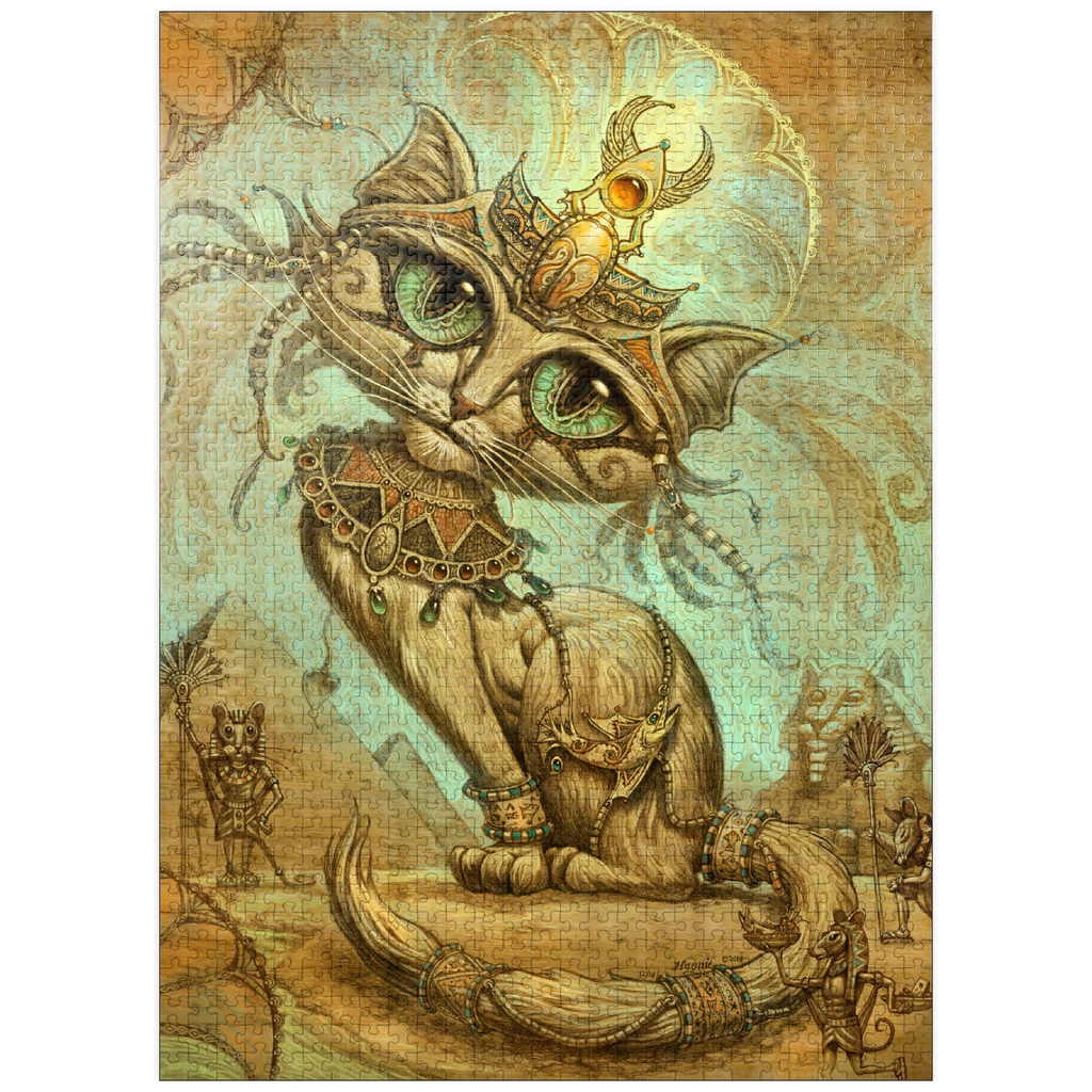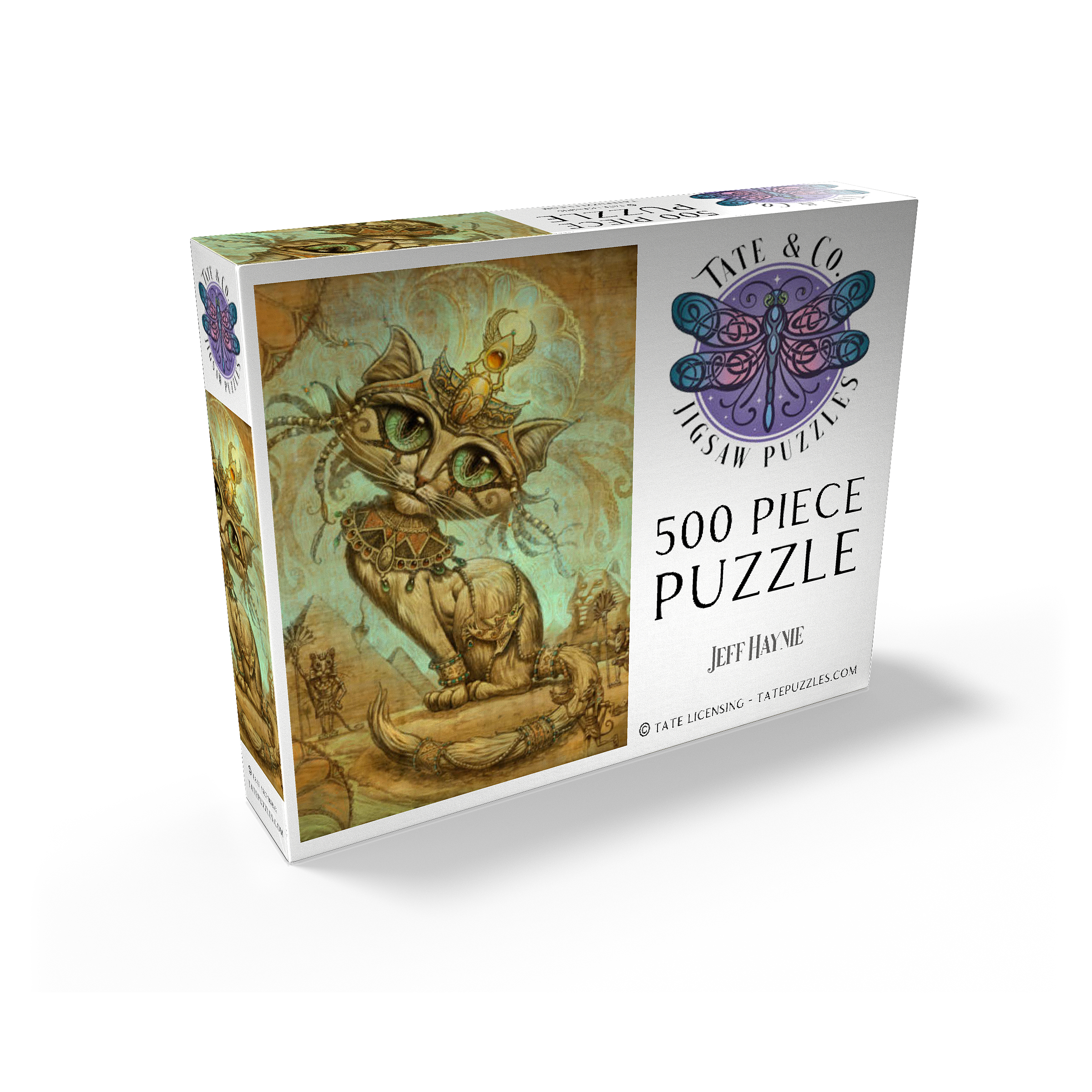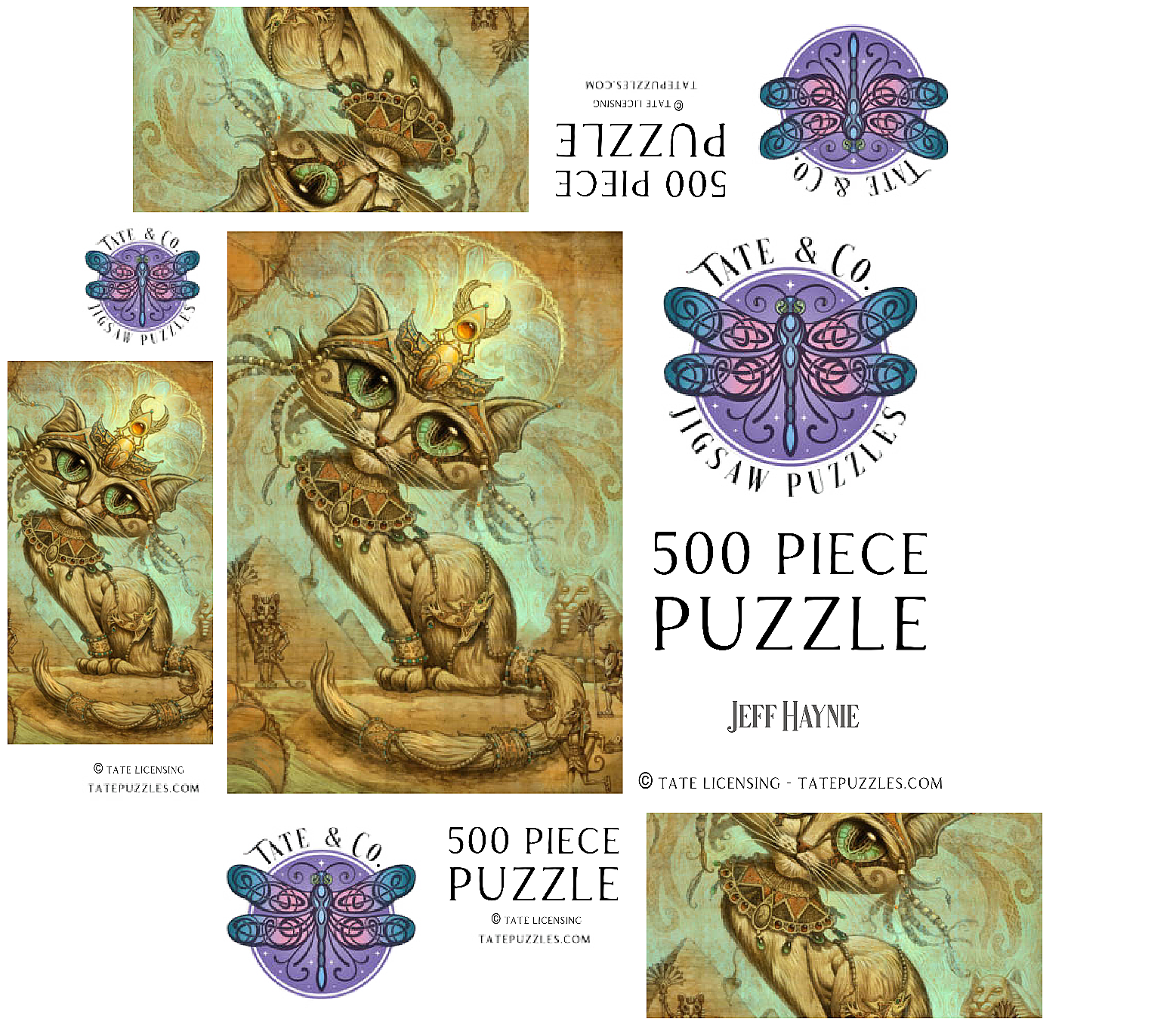 Jeff Haynie's artwork depicts an Egyptian-themed cat adorned in royal attire, surrounded by a whimsical, ancient setting. The image features a central cat character wearing an elaborate Egyptian headdress and jewelry