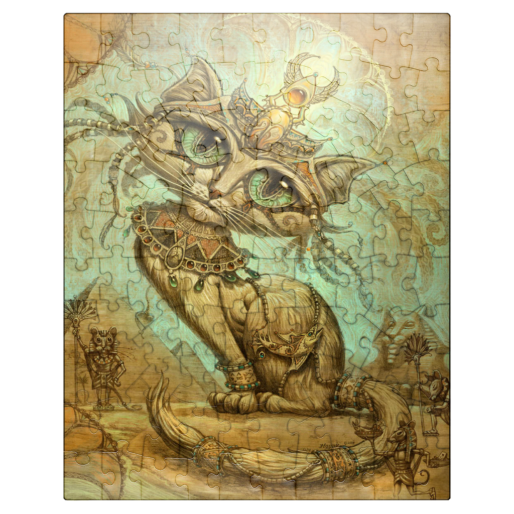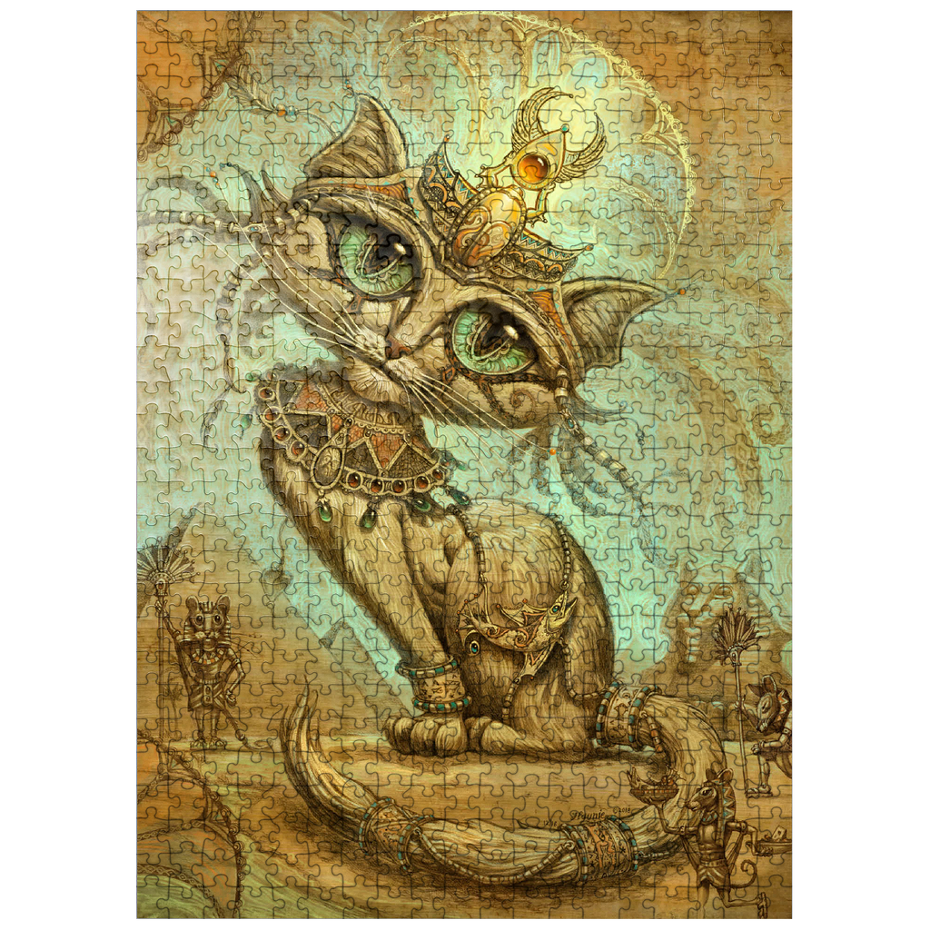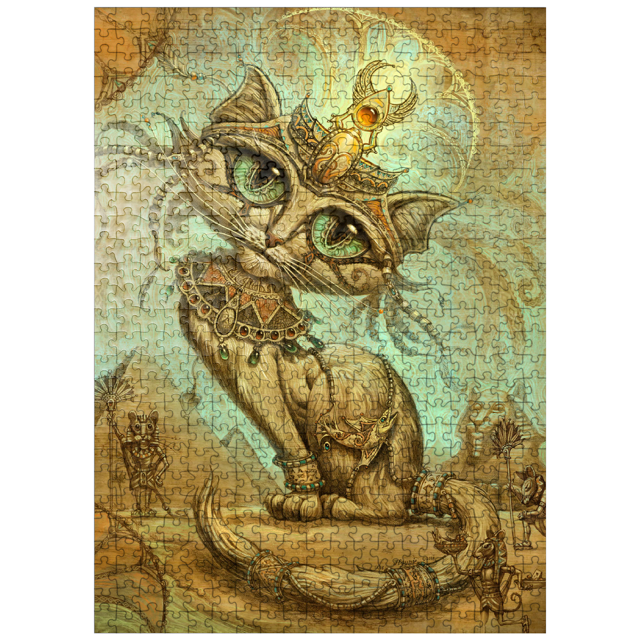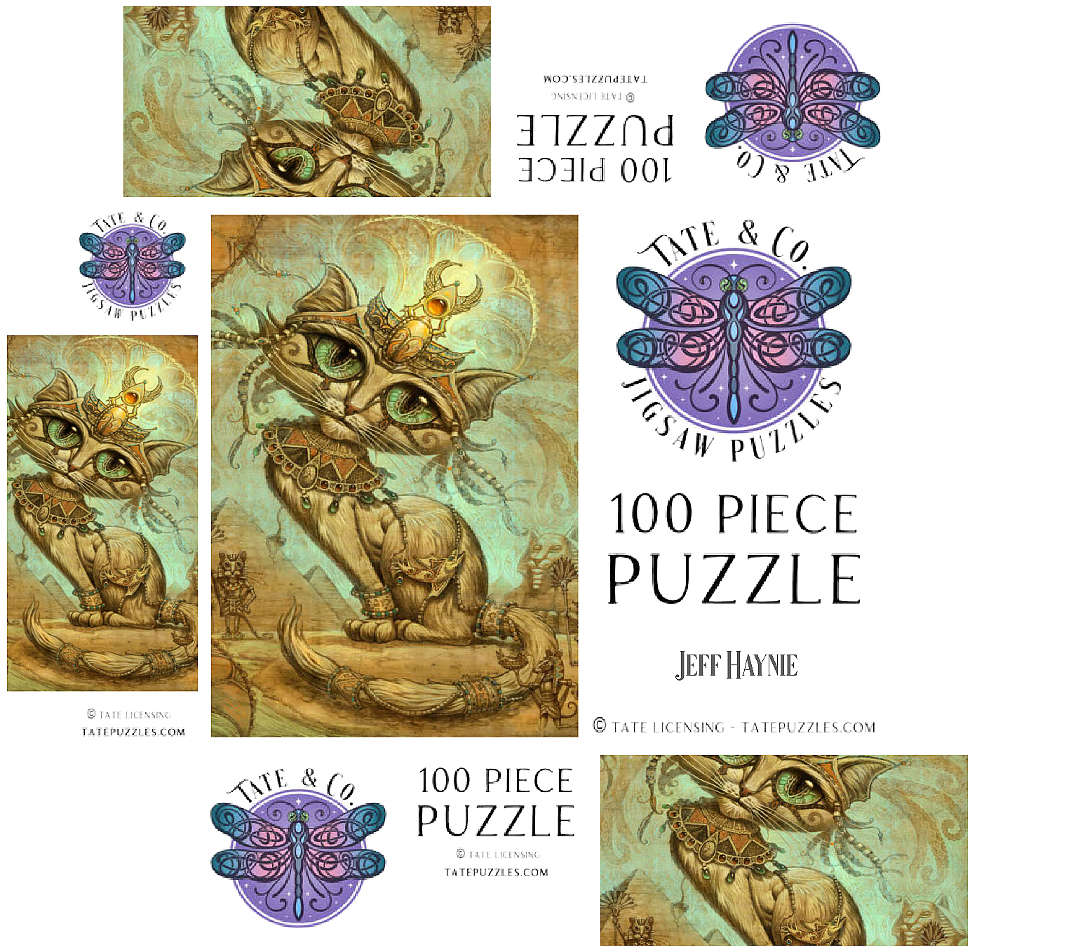 Jeff Haynie's artwork depicts an Egyptian-themed cat adorned in royal attire, surrounded by a whimsical, ancient setting. The image features a central cat character wearing an elaborate Egyptian headdress and jewelry