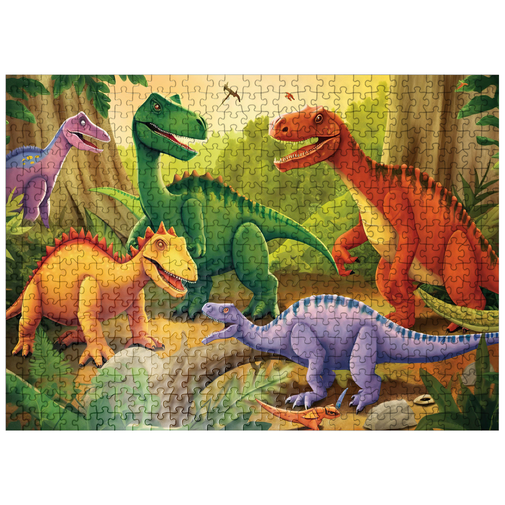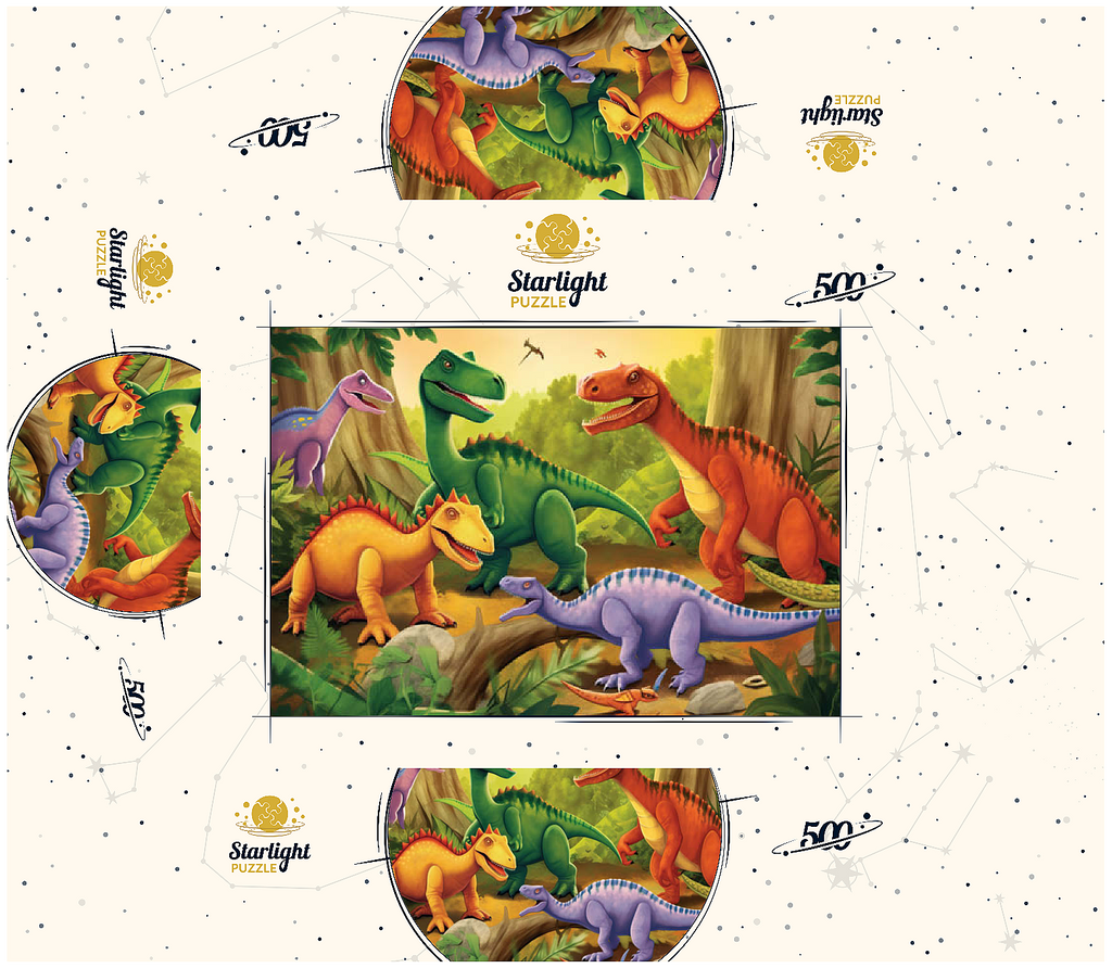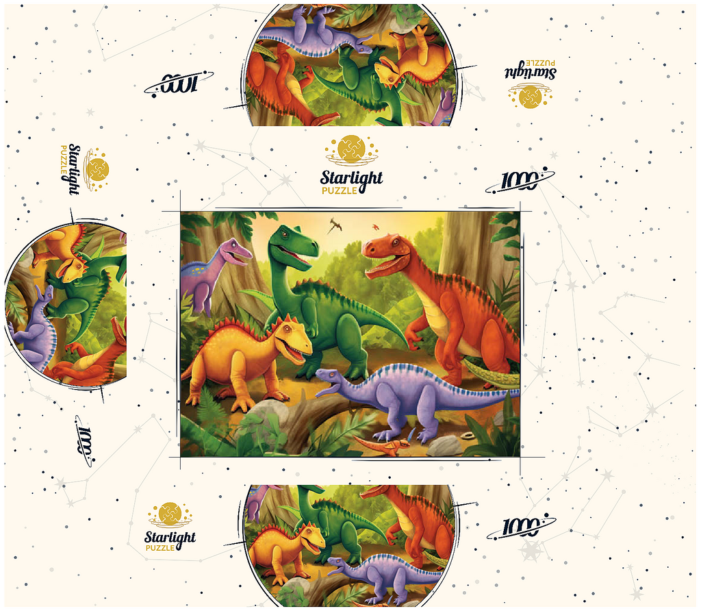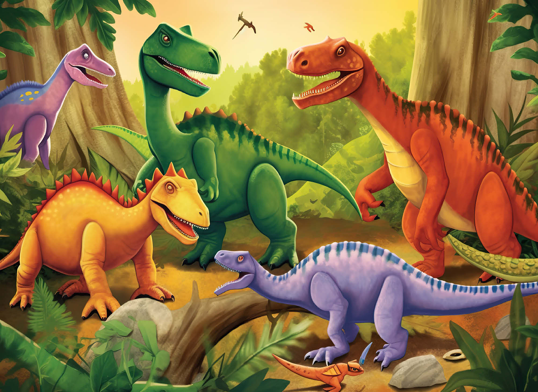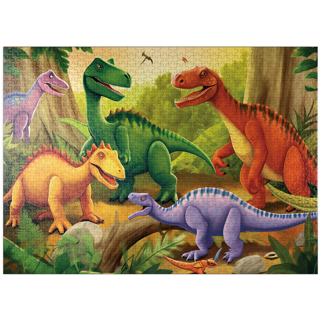 This delightful and vibrant illustration brings the prehistoric world to life with a group of colorful dinosaurs in a lush, primeval jungle. Featuring a mix of species in bright shades of green, orange, yellow, and purple, each dinosaur is playfully depicted with friendly expressions and dynamic poses. The detailed background includes towering trees, ferns, and a warm golden sky, enhancing the sense of a thriving ancient world. Perfect for children, dinosaur enthusiasts, and fans of imaginative artwork, this engaging scene captures the wonder and excitement of the dinosaur era in a fun and artistic way.