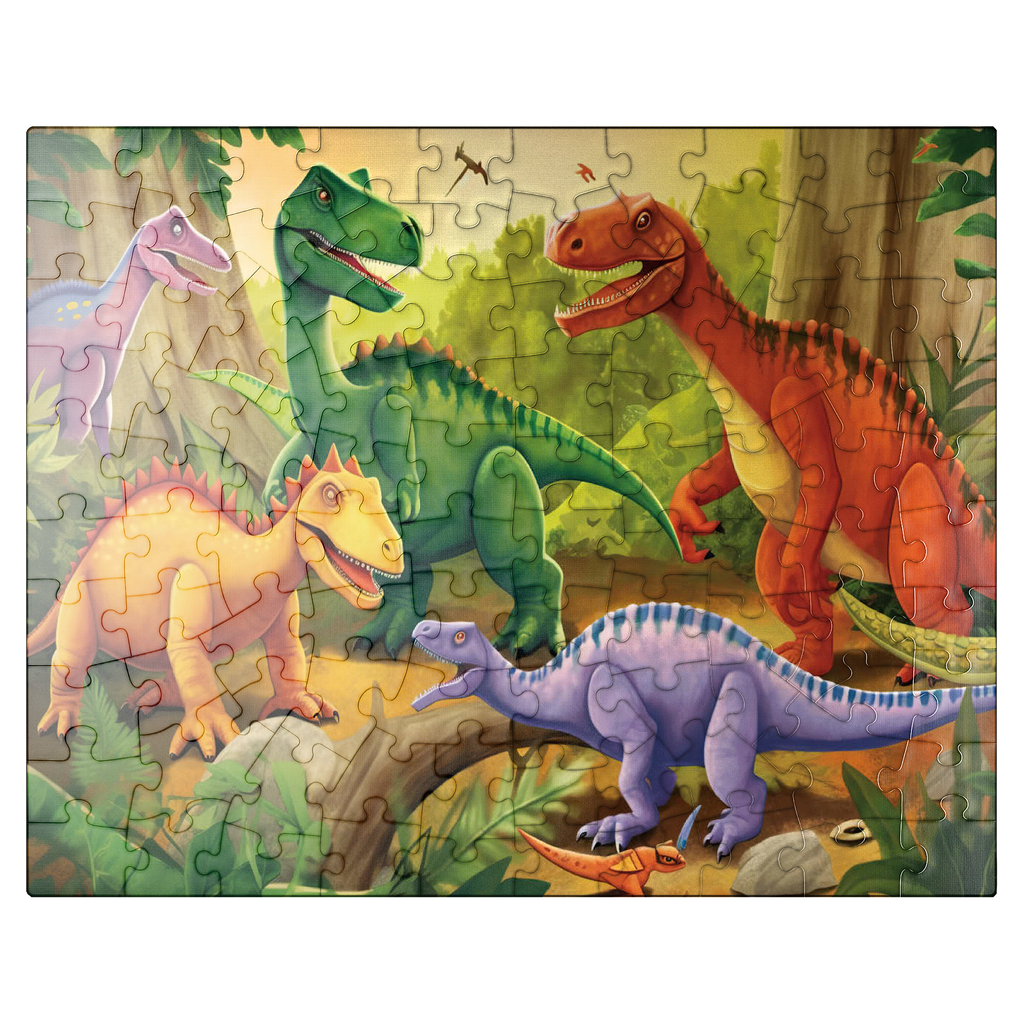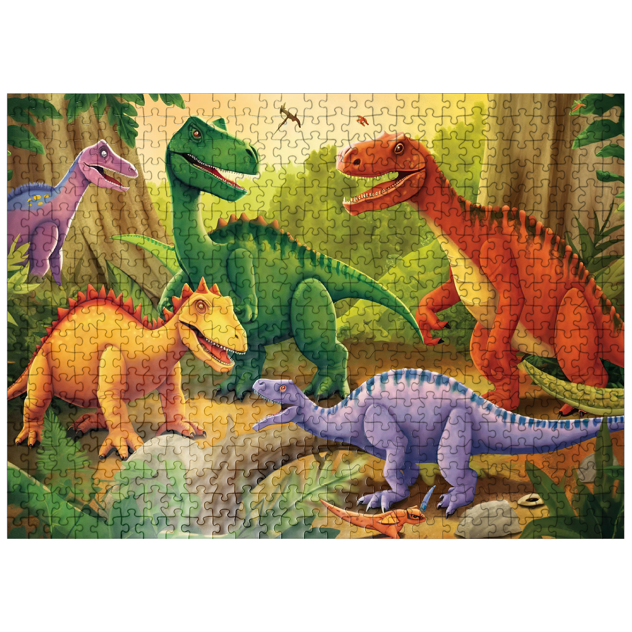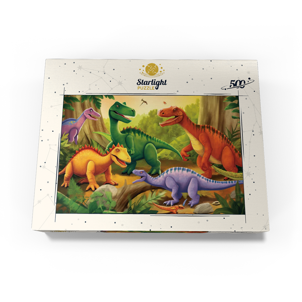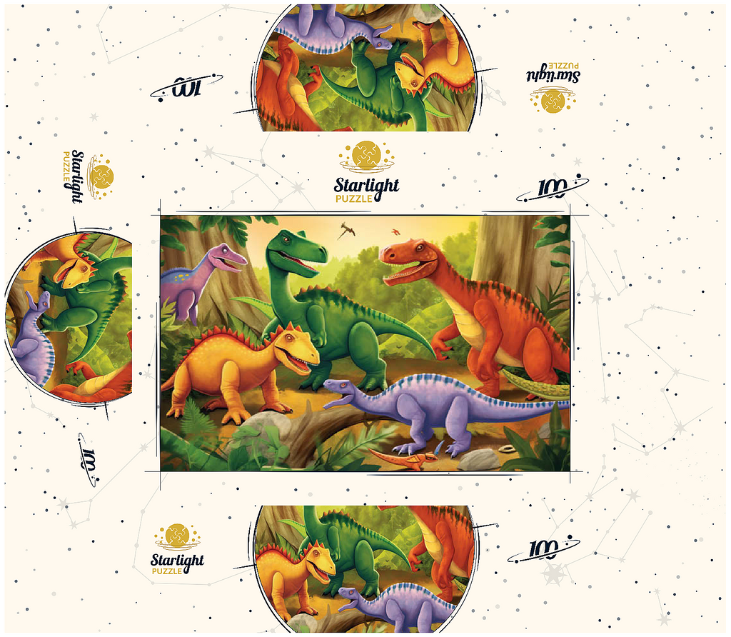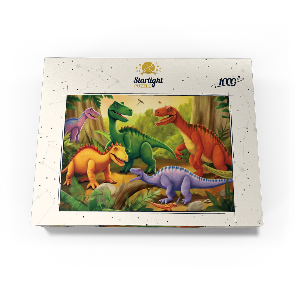 This delightful and vibrant illustration brings the prehistoric world to life with a group of colorful dinosaurs in a lush, primeval jungle. Featuring a mix of species in bright shades of green, orange, yellow, and purple, each dinosaur is playfully depicted with friendly expressions and dynamic poses. The detailed background includes towering trees, ferns, and a warm golden sky, enhancing the sense of a thriving ancient world. Perfect for children, dinosaur enthusiasts, and fans of imaginative artwork, this engaging scene captures the wonder and excitement of the dinosaur era in a fun and artistic way.