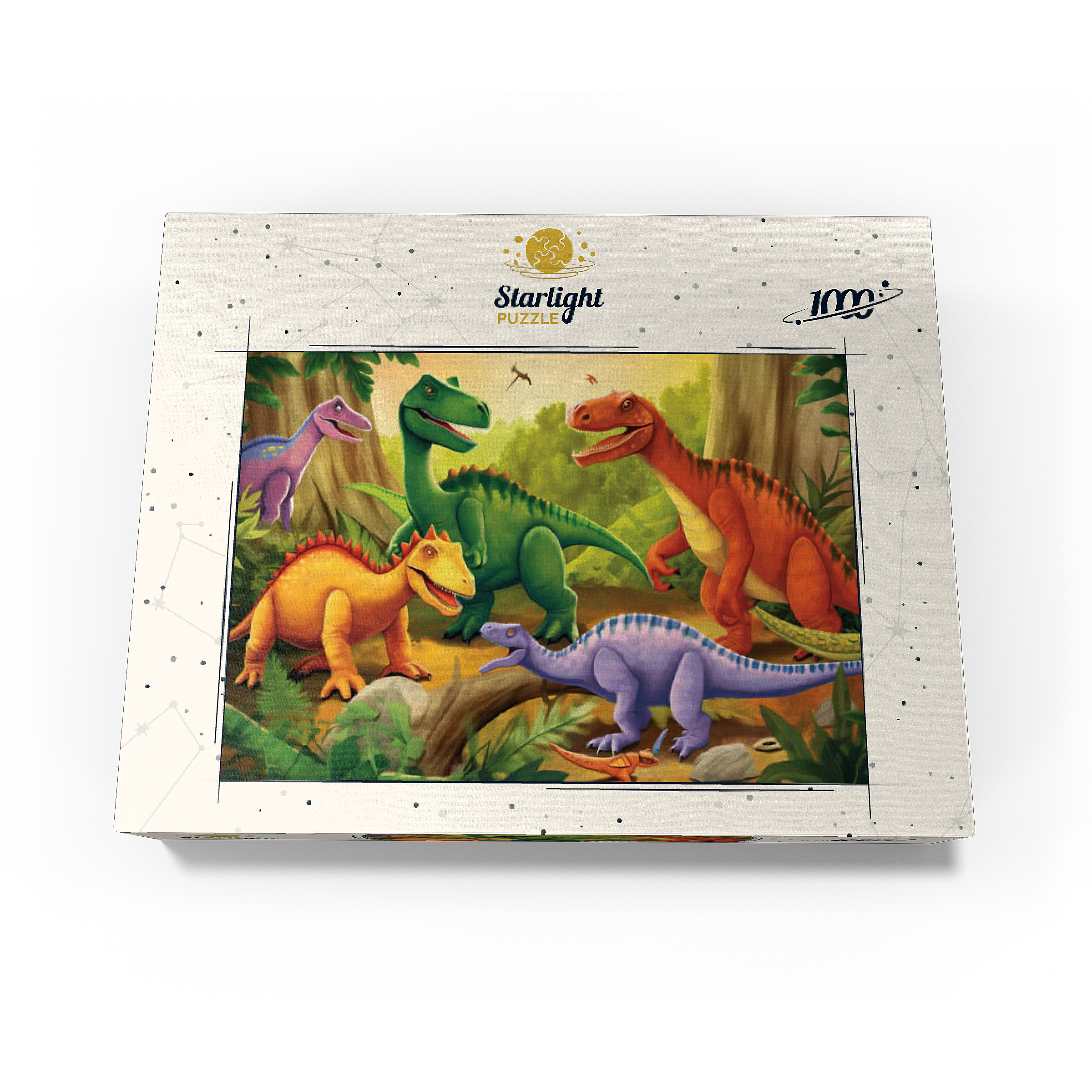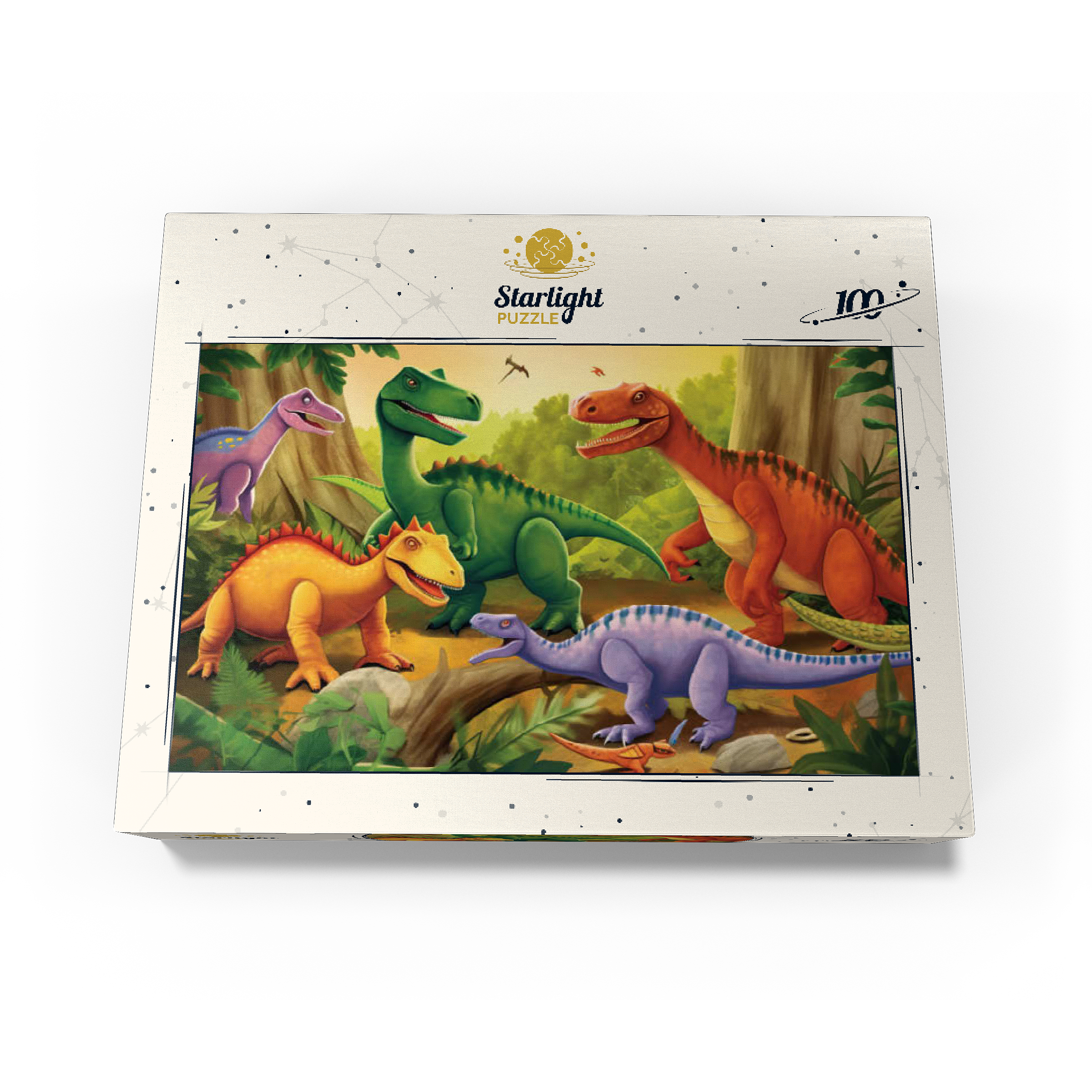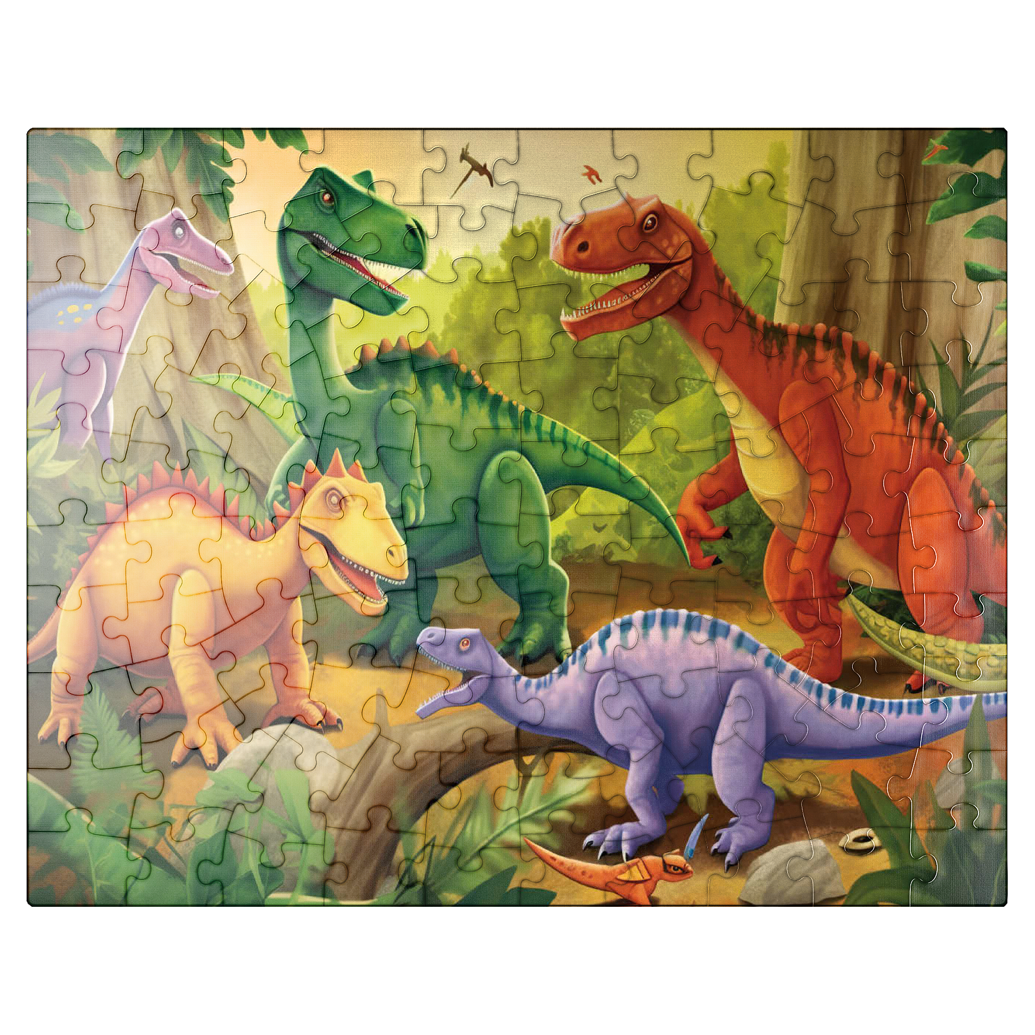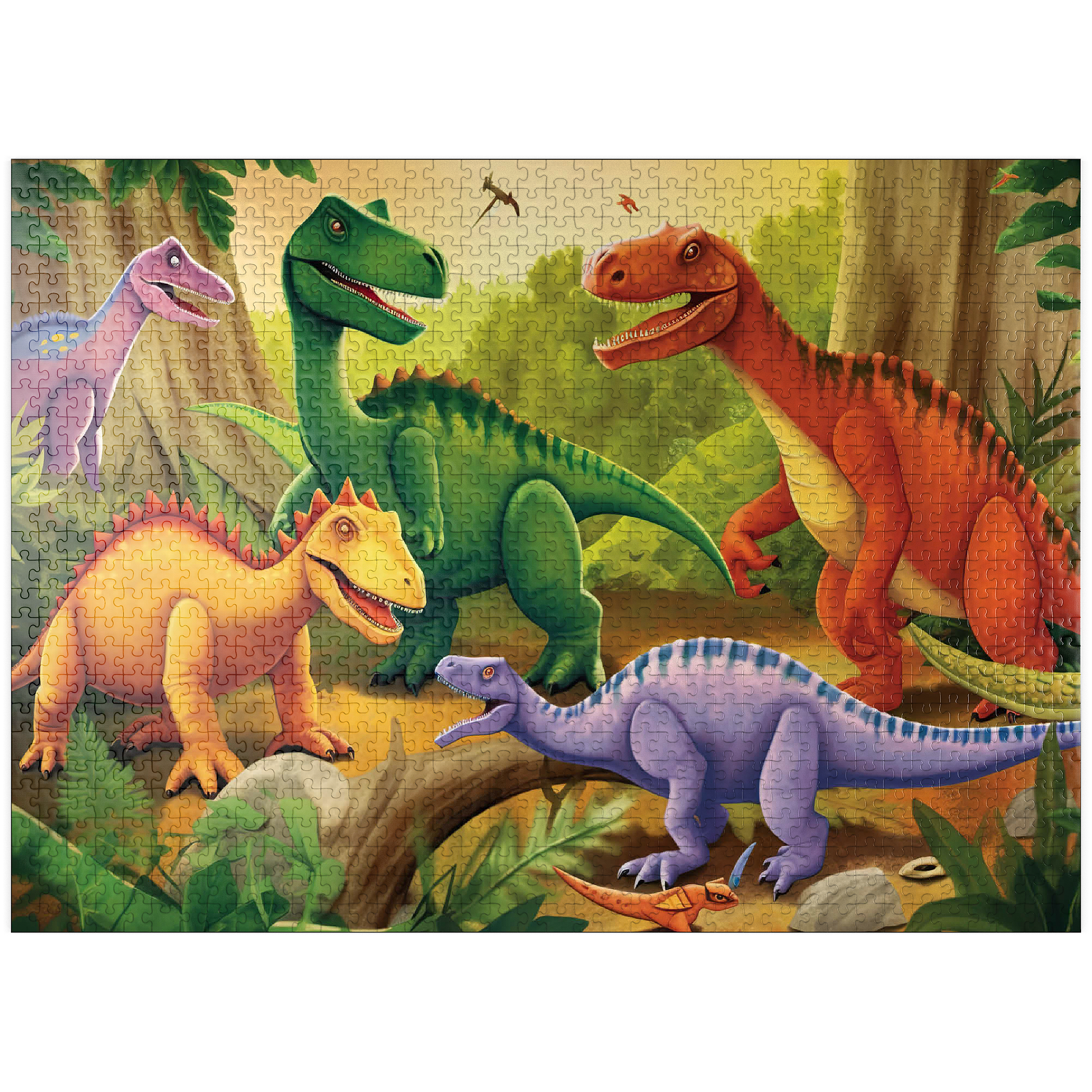 This delightful and vibrant illustration brings the prehistoric world to life with a group of colorful dinosaurs in a lush, primeval jungle. Featuring a mix of species in bright shades of green, orange, yellow, and purple, each dinosaur is playfully depicted with friendly expressions and dynamic poses. The detailed background includes towering trees, ferns, and a warm golden sky, enhancing the sense of a thriving ancient world. Perfect for children, dinosaur enthusiasts, and fans of imaginative artwork, this engaging scene captures the wonder and excitement of the dinosaur era in a fun and artistic way.