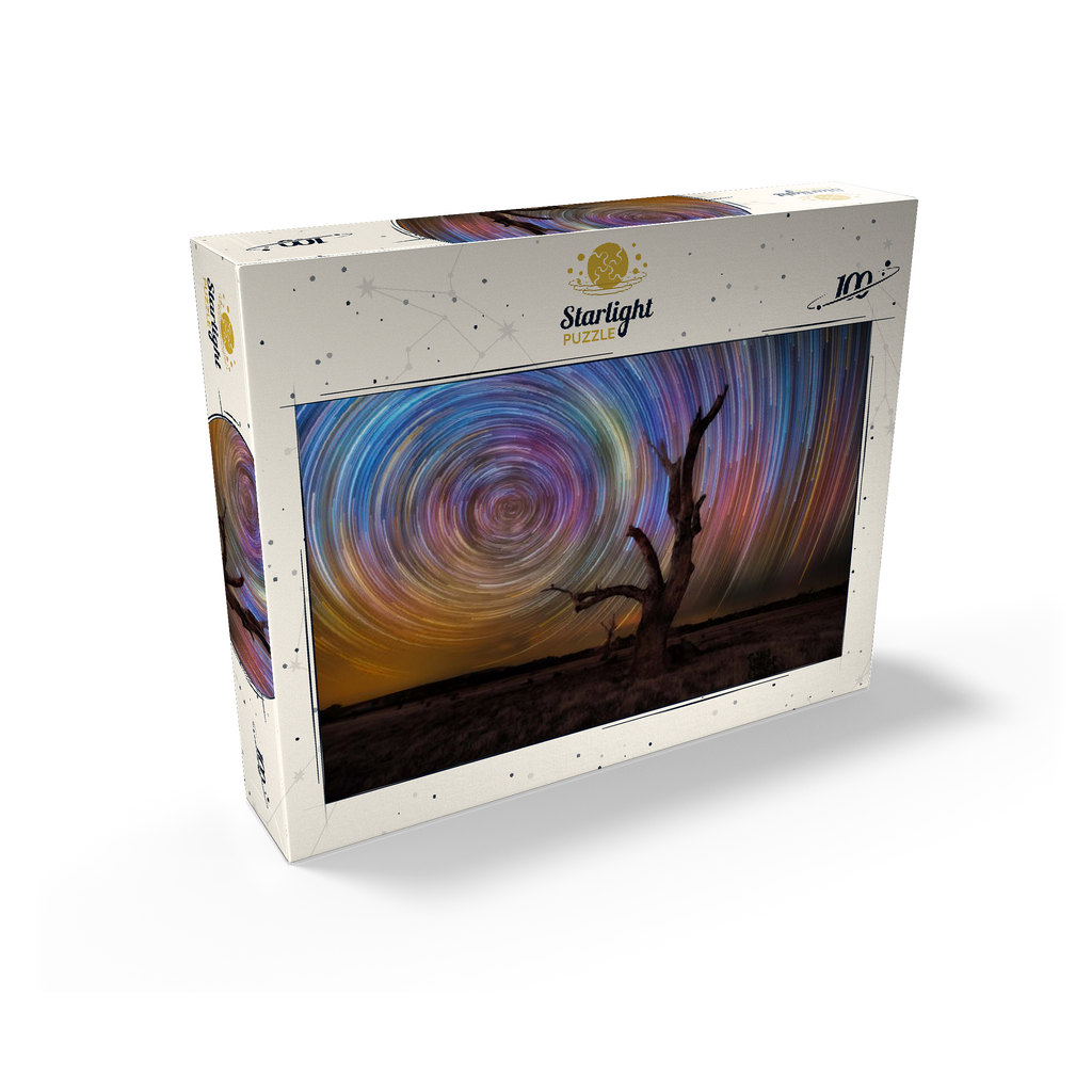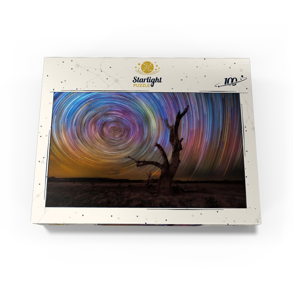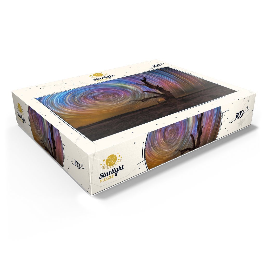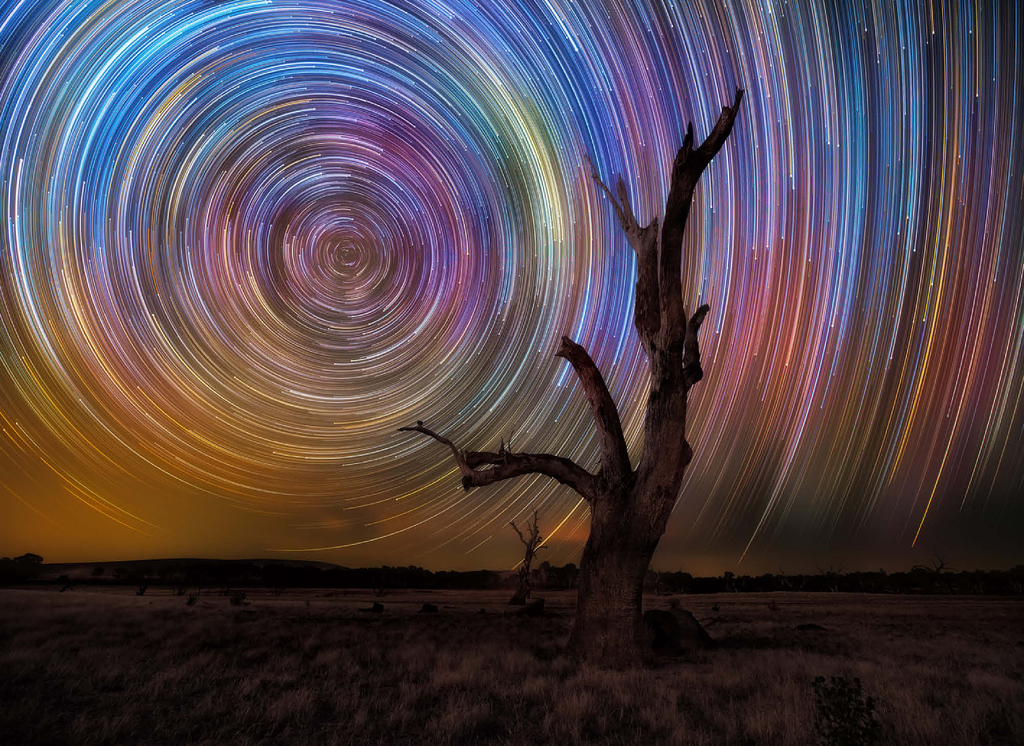 A stunning long-exposure night sky scene featuring vivid circular star trails spinning above a stark, leafless tree. this captivating view captures the hypnotic movement of the stars in brilliant hues of blue, violet, yellow, and magenta, creating a dynamic vortex in the sky. the silhouette of the gnarled tree in the foreground adds contrast and mystery, set against the expansive dark field below. this type of astrophotography, achieved through time-lapse techniques, reveals the earth's rotation in a spectacular, artistic form. ideal for astronomy lovers, stargazers, and fans of cosmic photography, this visual evokes wonder and the vastness of the universe.