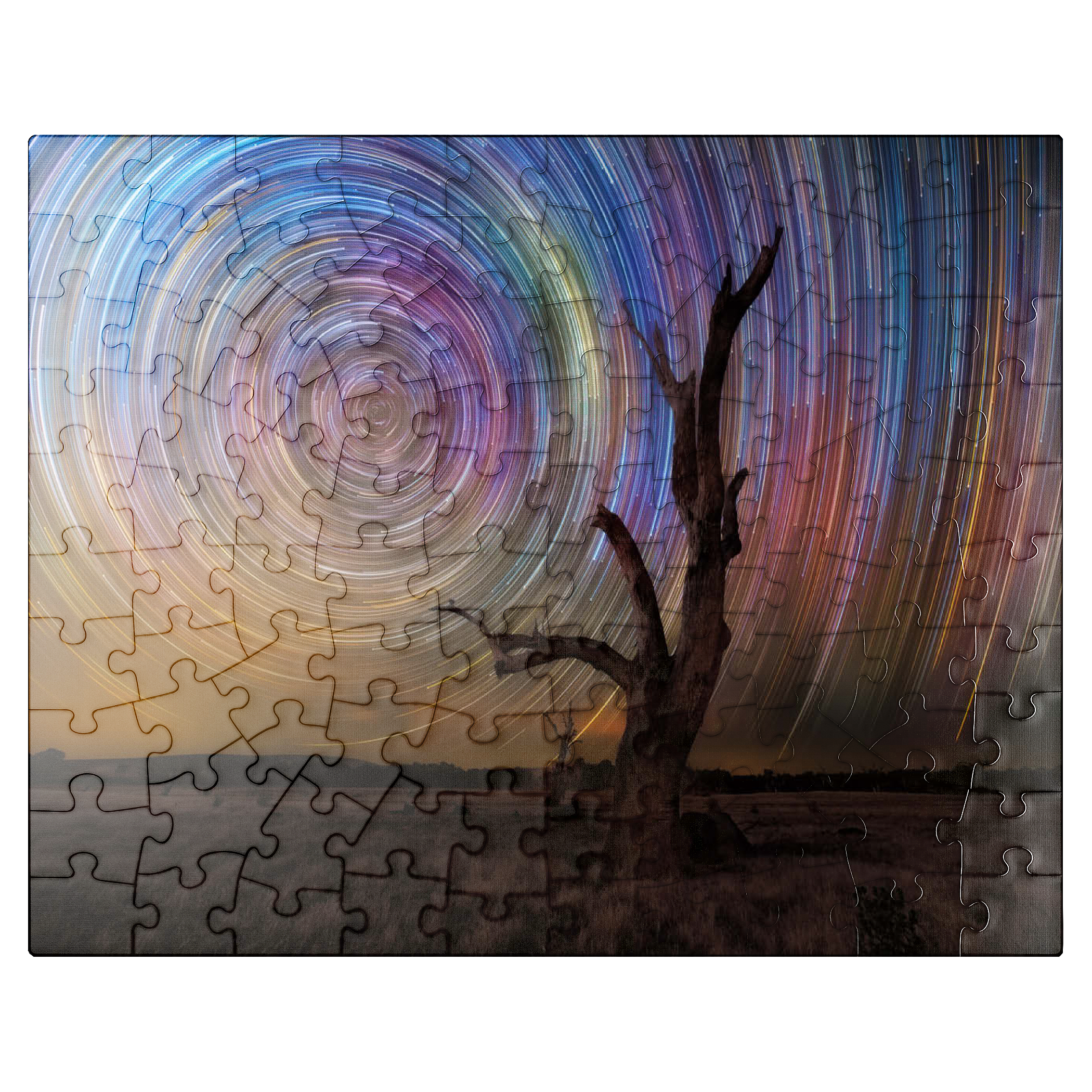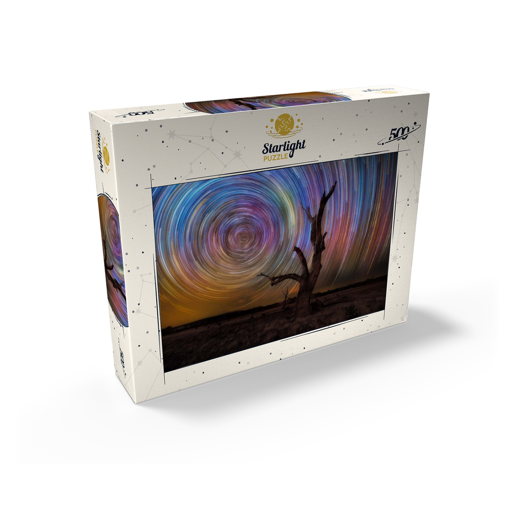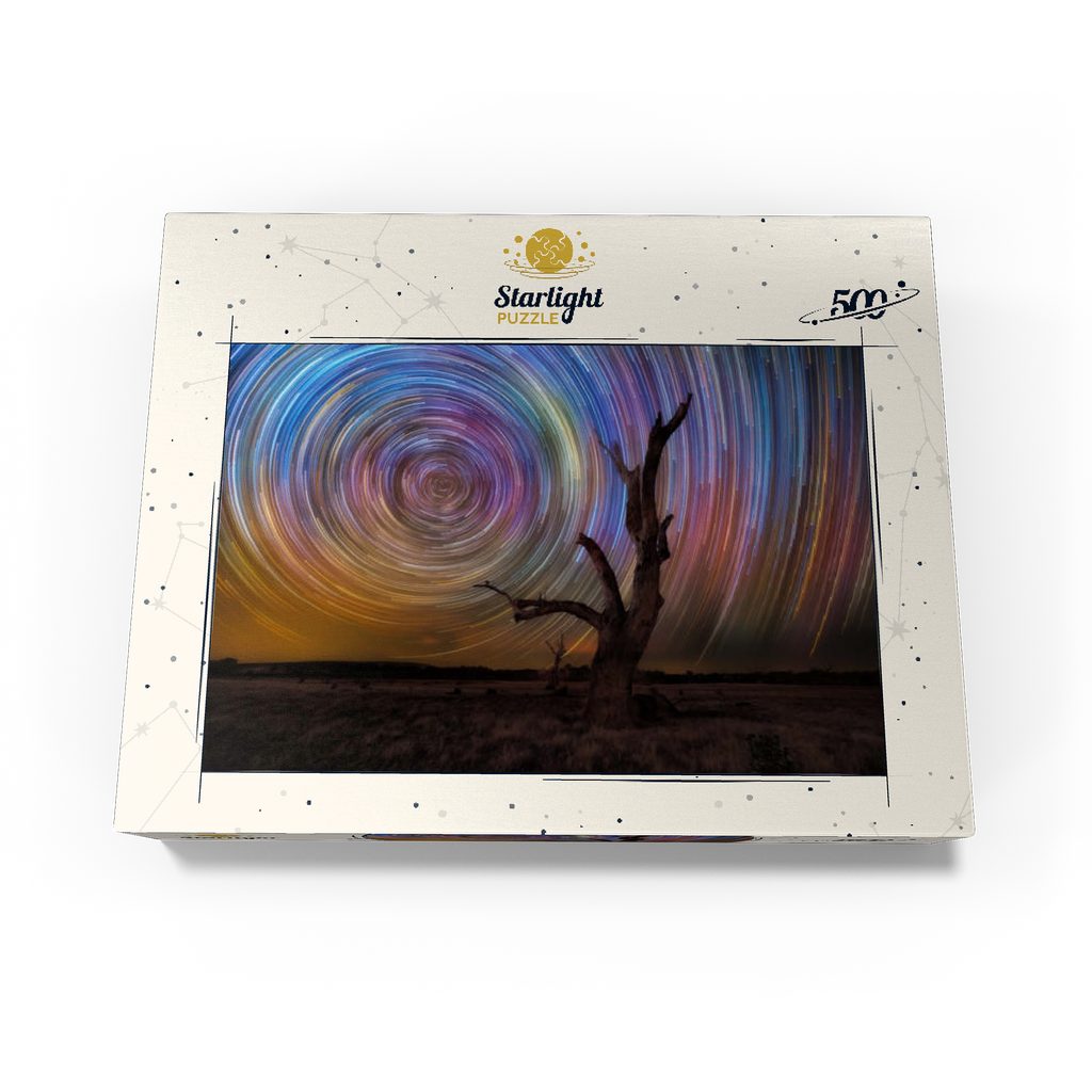 A stunning long-exposure night sky scene featuring vivid circular star trails spinning above a stark, leafless tree. this captivating view captures the hypnotic movement of the stars in brilliant hues of blue, violet, yellow, and magenta, creating a dynamic vortex in the sky. the silhouette of the gnarled tree in the foreground adds contrast and mystery, set against the expansive dark field below. this type of astrophotography, achieved through time-lapse techniques, reveals the earth's rotation in a spectacular, artistic form. ideal for astronomy lovers, stargazers, and fans of cosmic photography, this visual evokes wonder and the vastness of the universe.
