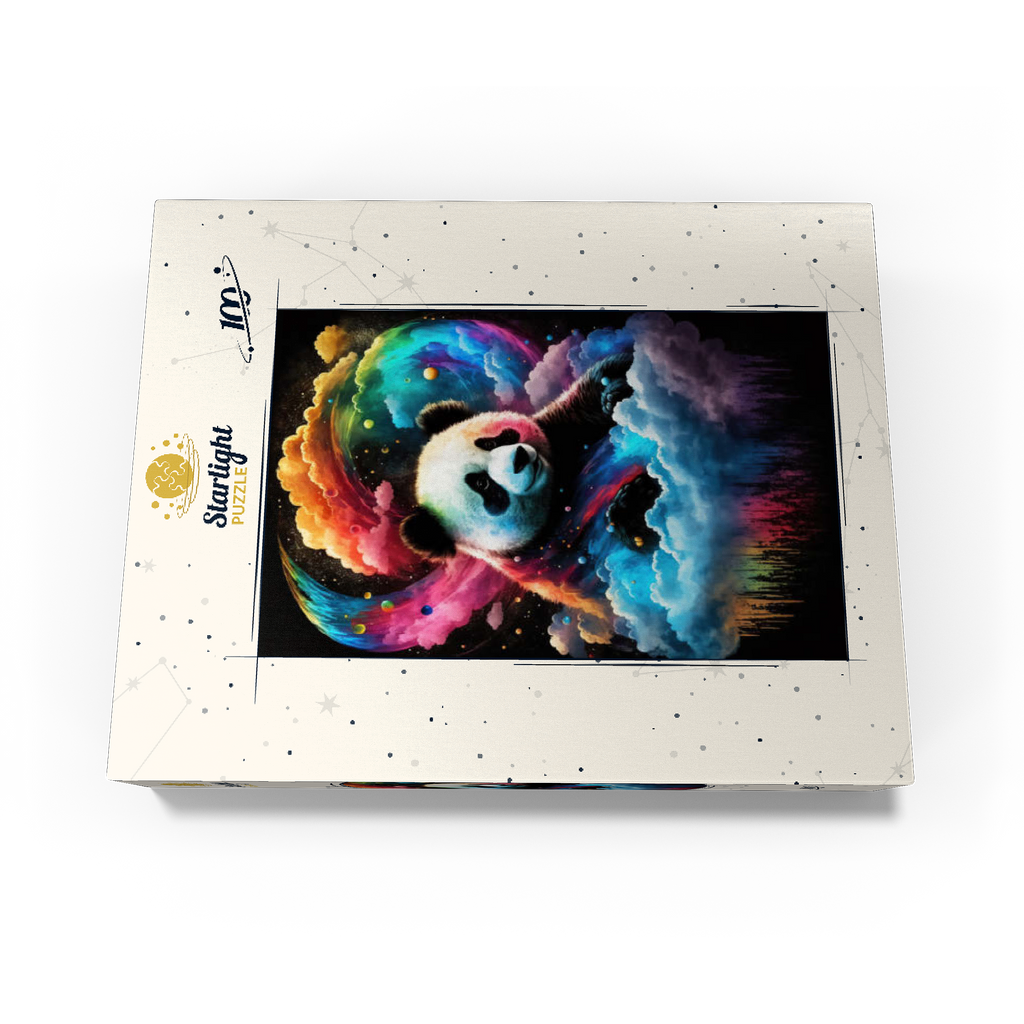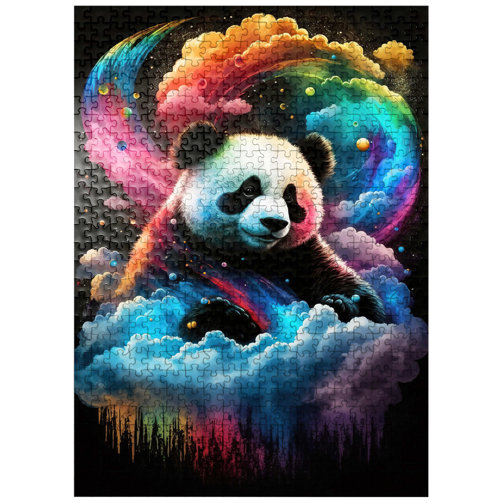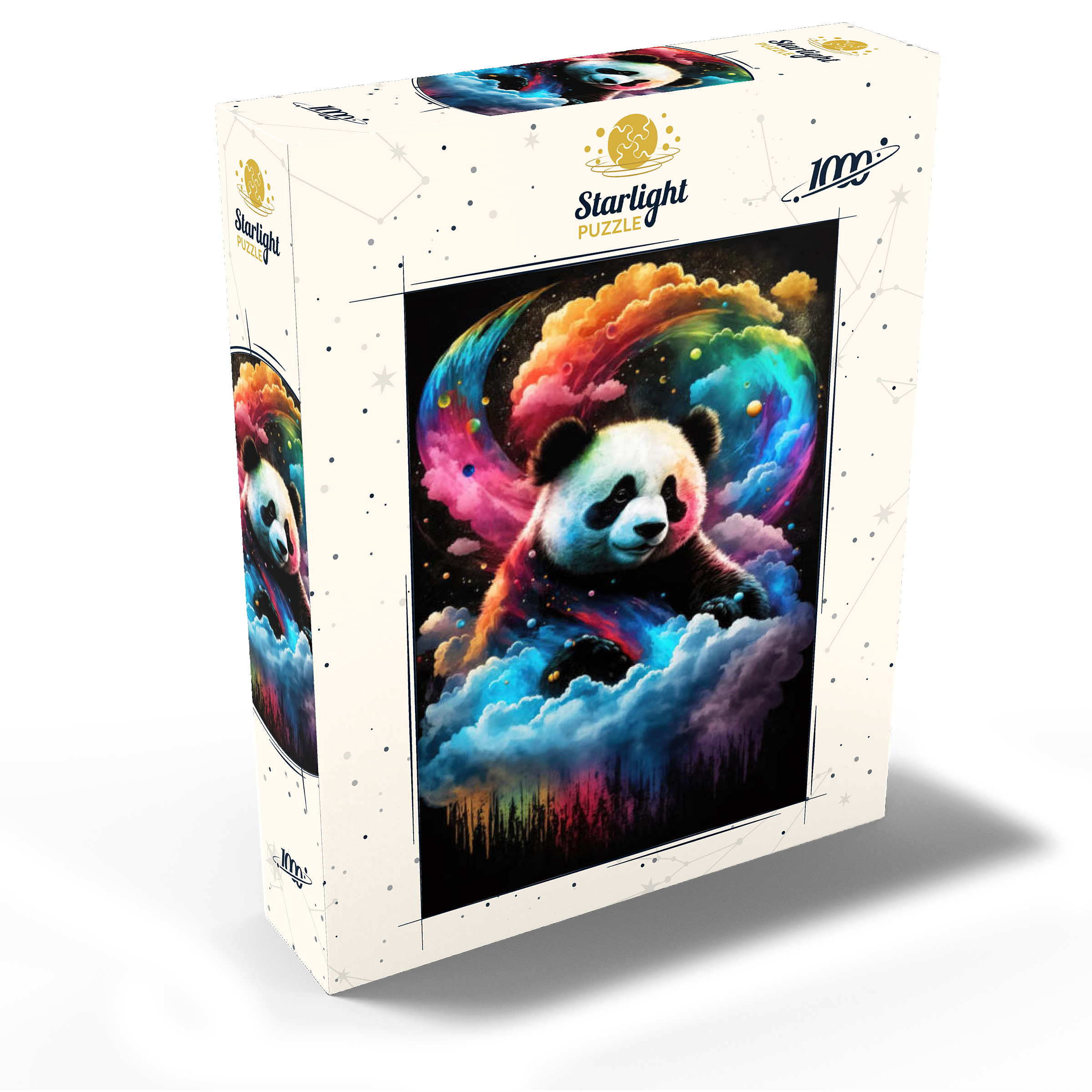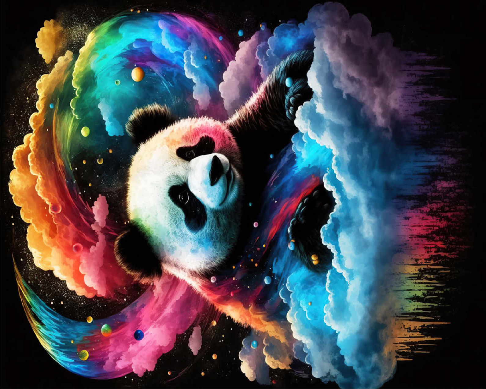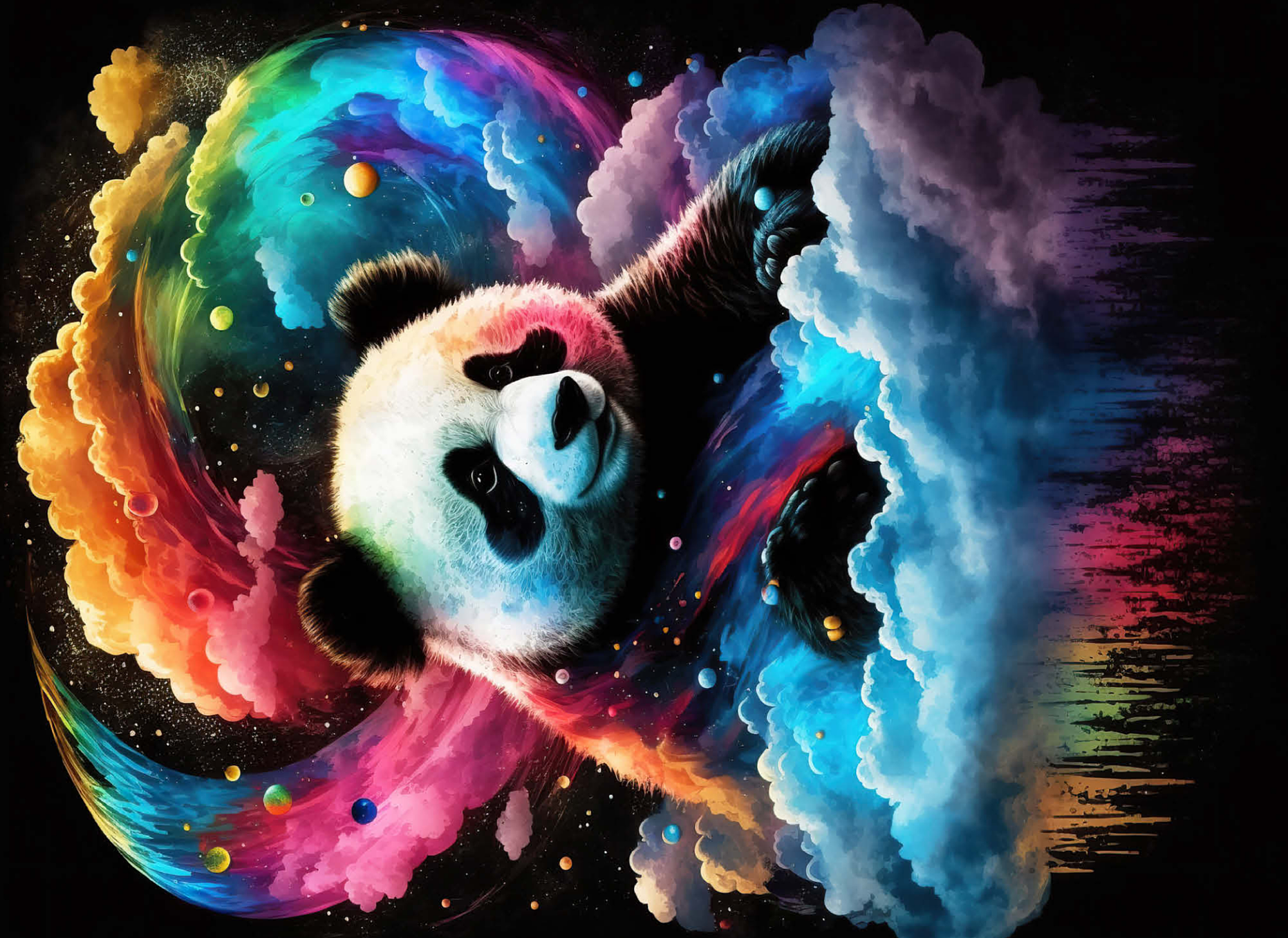 This mesmerizing artwork features a majestic panda surrounded by swirling cosmic clouds and vibrant nebula-like colors. the dreamy composition blends fantasy and surrealism, with the panda appearing to float through a celestial realm of radiant blues, fiery oranges, and deep purples. ethereal light and floating planets enhance the magical, otherworldly atmosphere, creating a visually stunning masterpiece. this piece is perfect for lovers of cosmic art, whimsical wildlife illustrations, and those drawn to the mystical beauty of nature blended with fantasy.