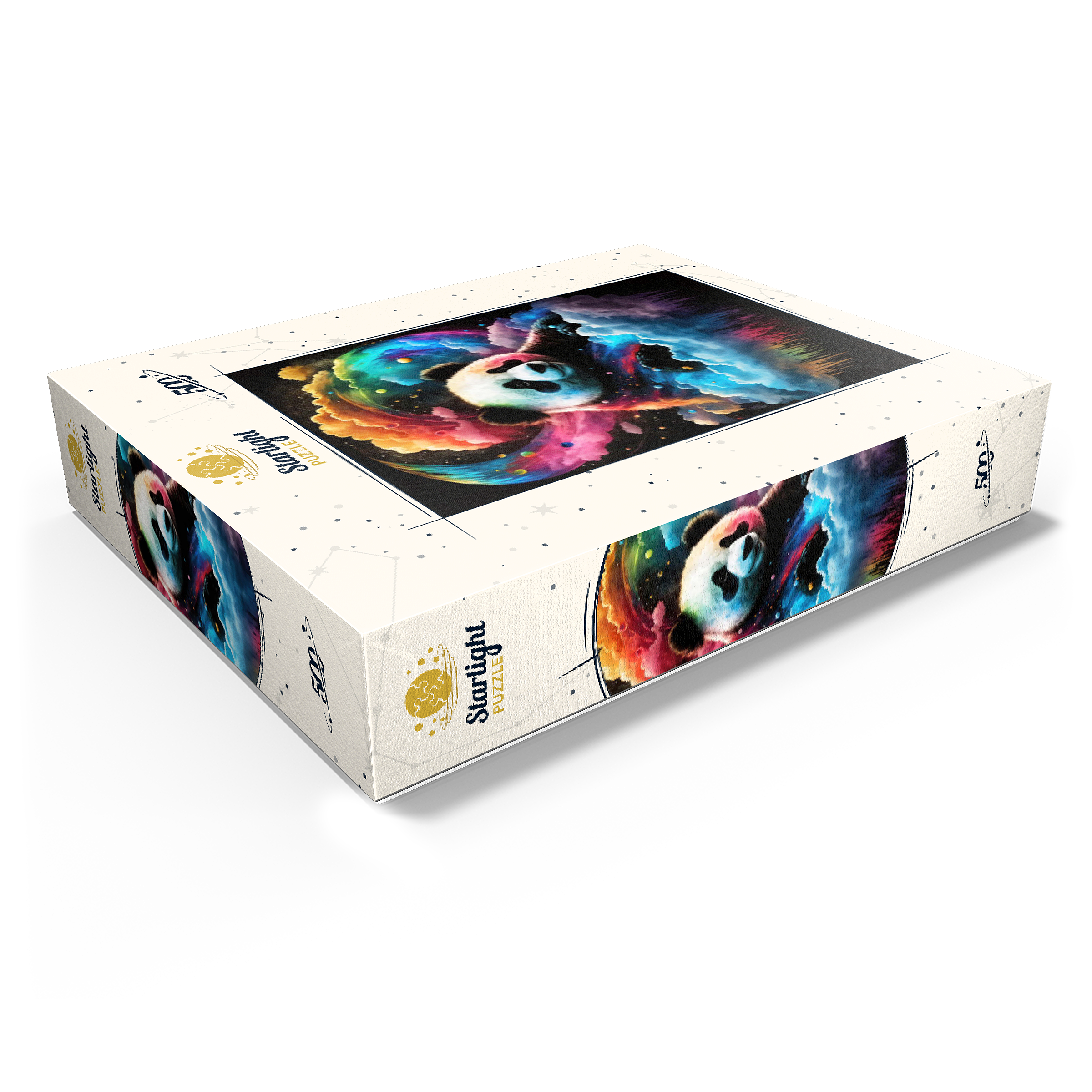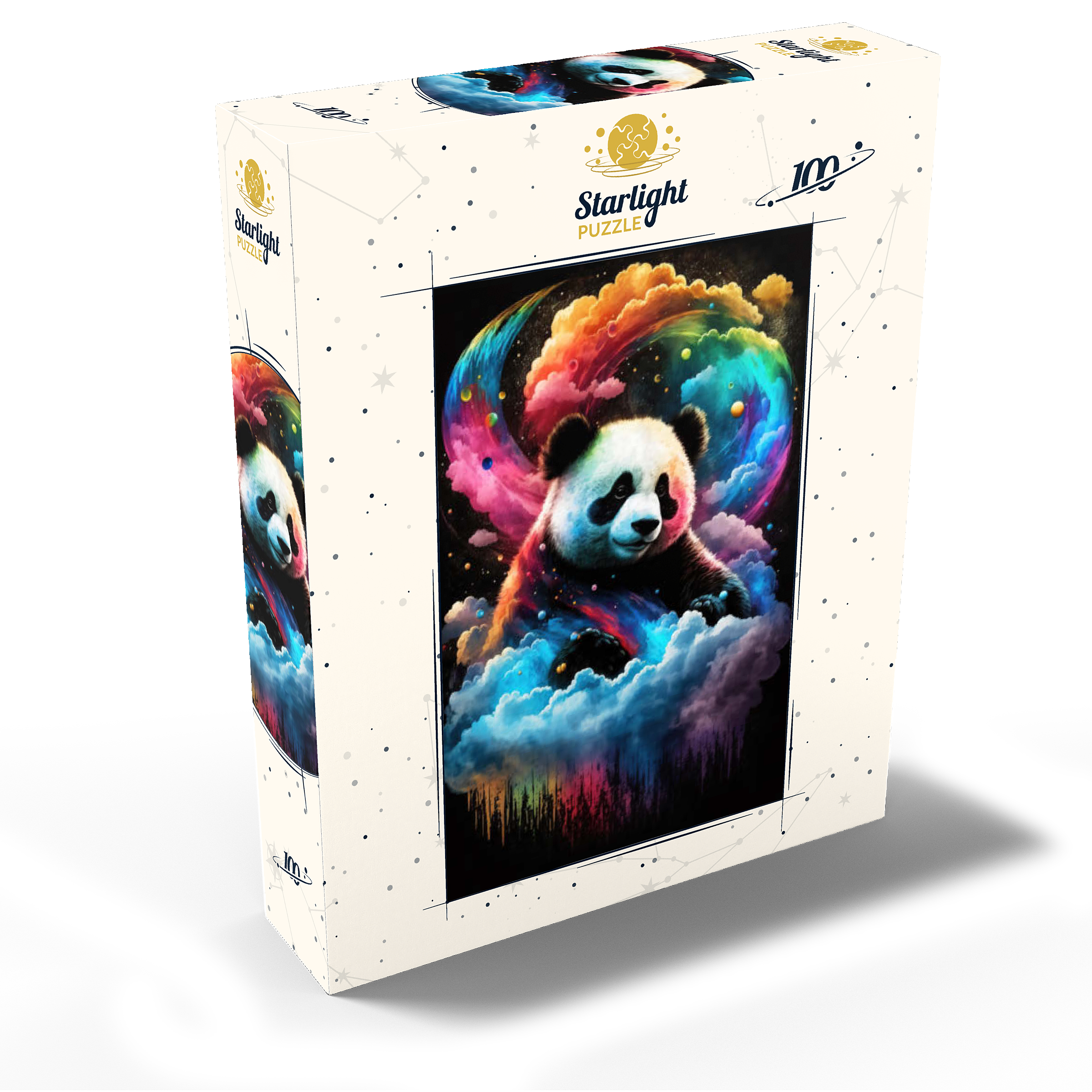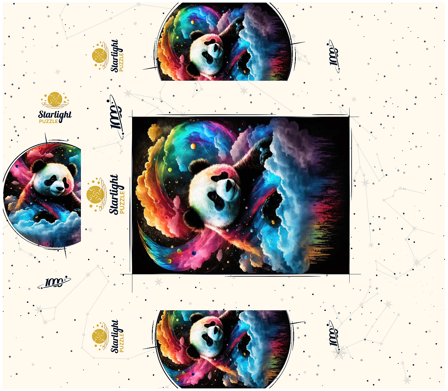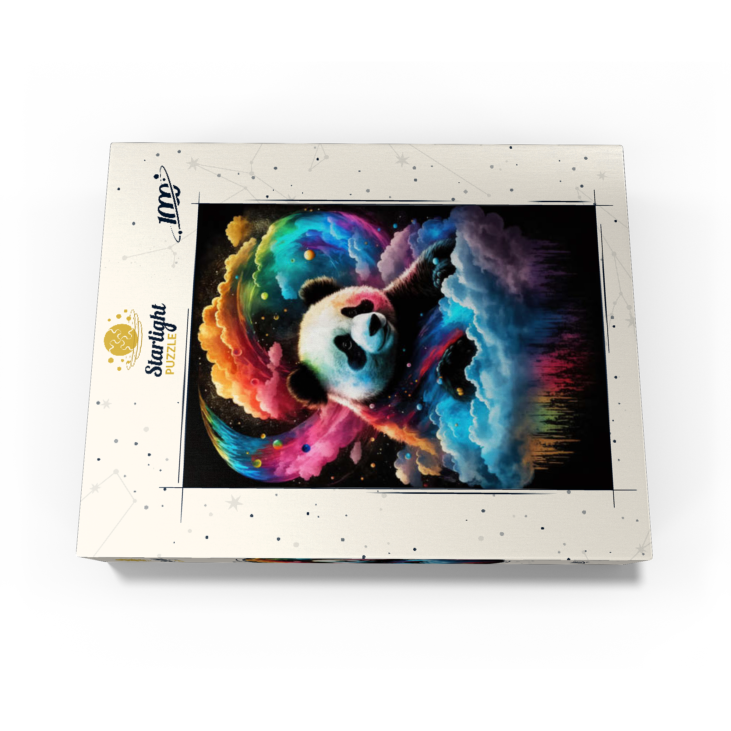 This mesmerizing artwork features a majestic panda surrounded by swirling cosmic clouds and vibrant nebula-like colors. the dreamy composition blends fantasy and surrealism, with the panda appearing to float through a celestial realm of radiant blues, fiery oranges, and deep purples. ethereal light and floating planets enhance the magical, otherworldly atmosphere, creating a visually stunning masterpiece. this piece is perfect for lovers of cosmic art, whimsical wildlife illustrations, and those drawn to the mystical beauty of nature blended with fantasy.