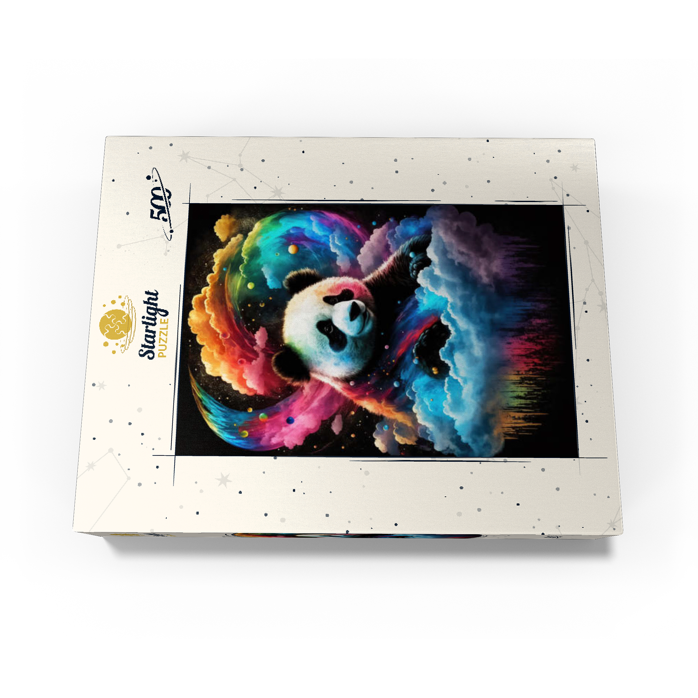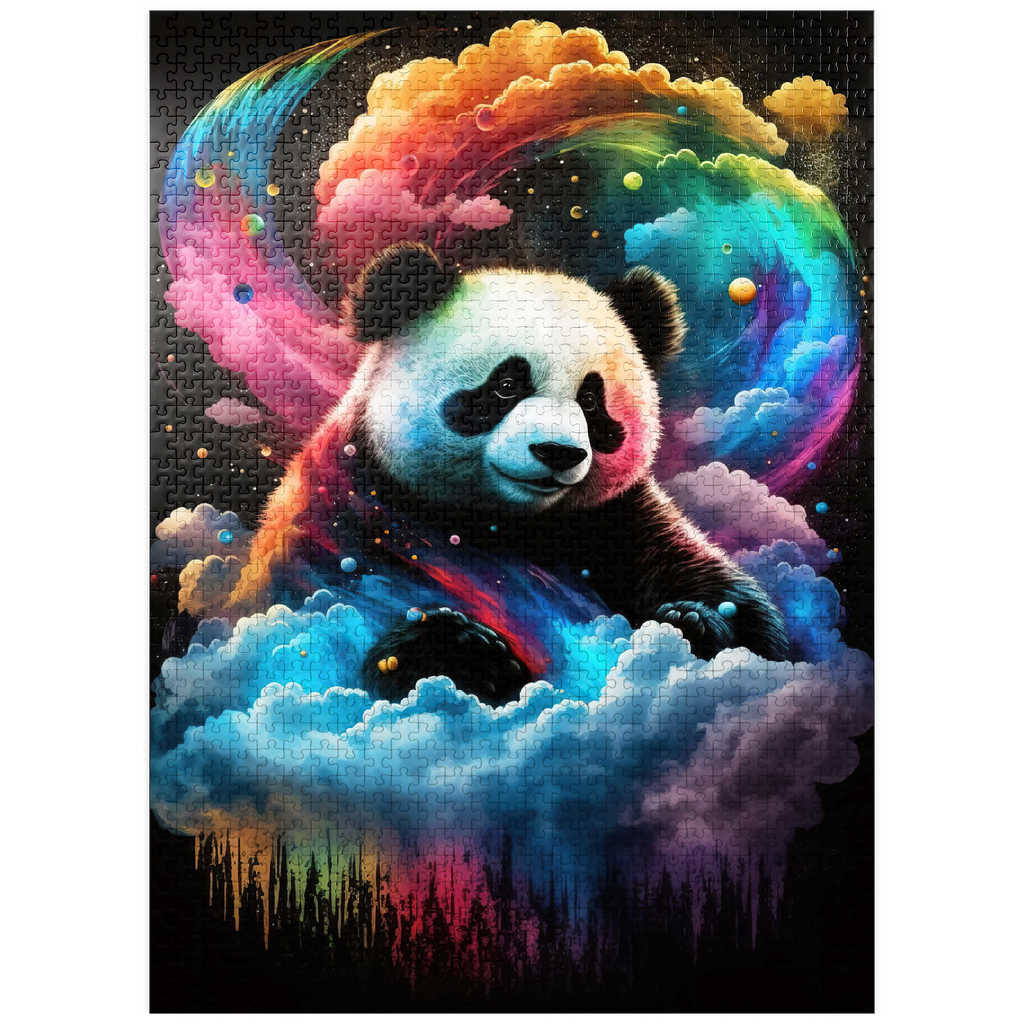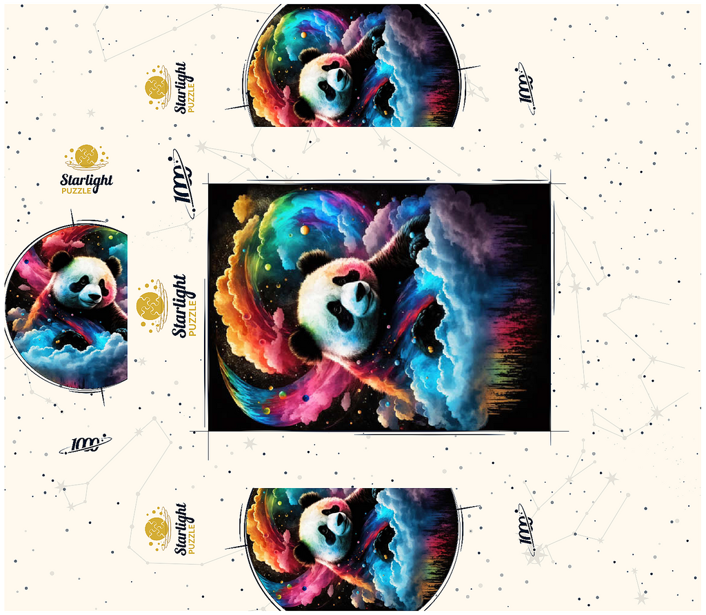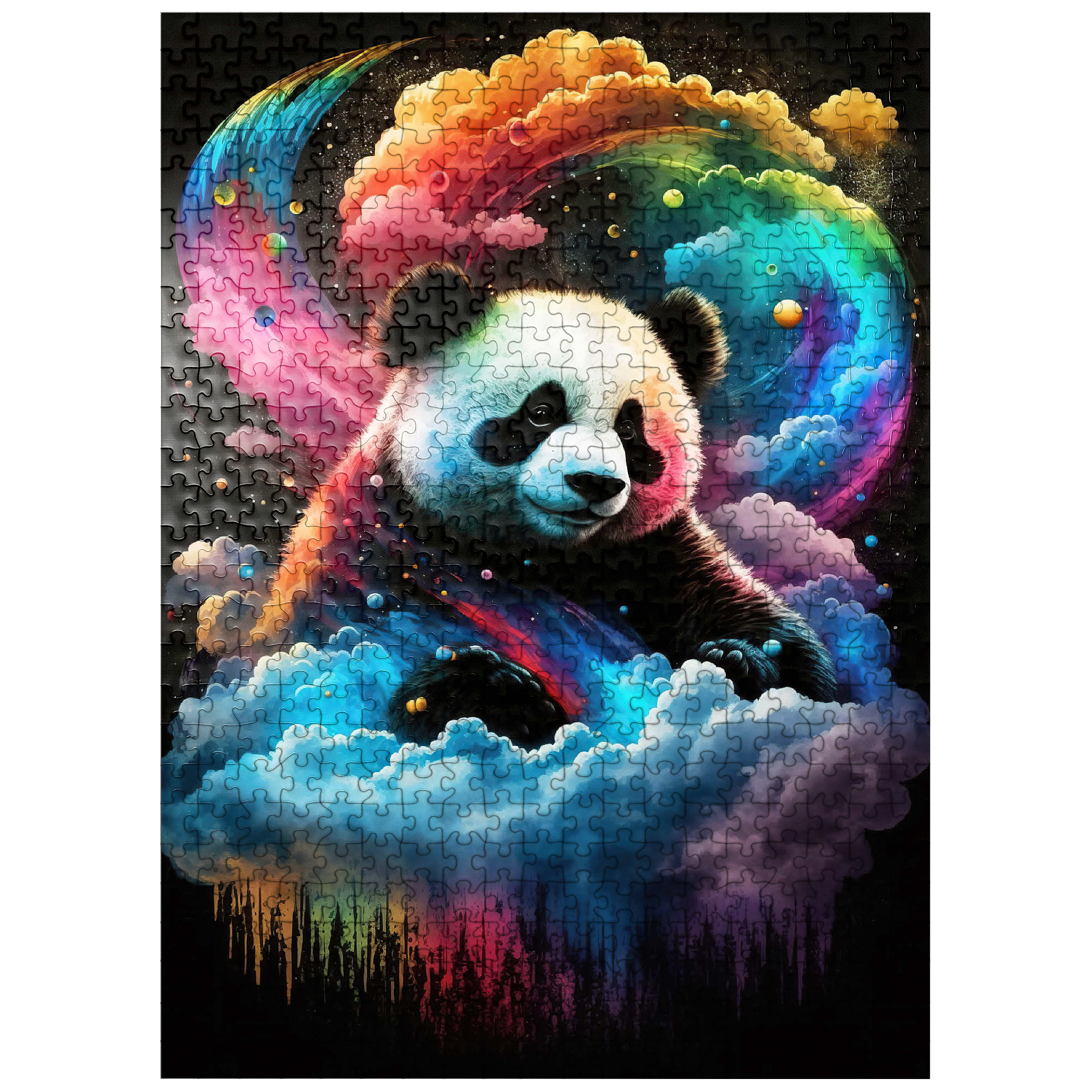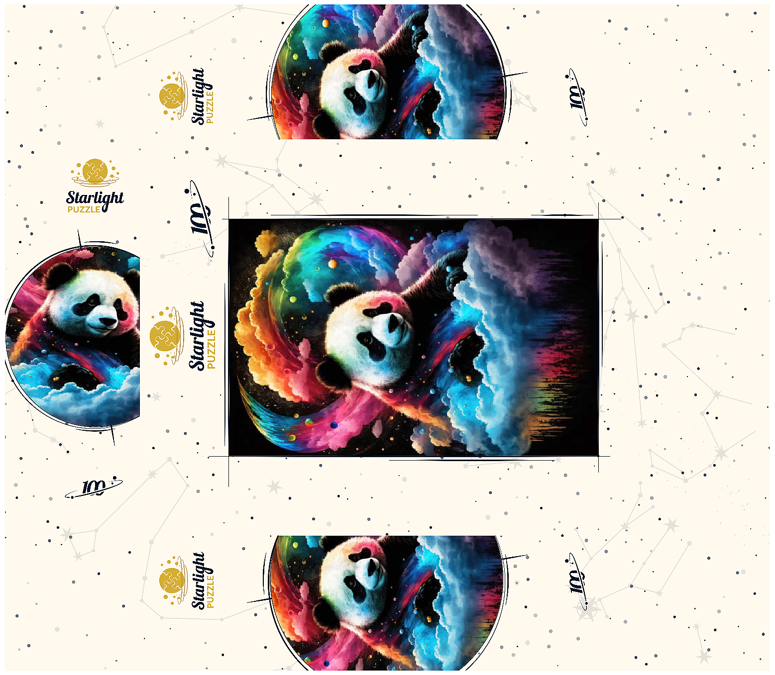 This mesmerizing artwork features a majestic panda surrounded by swirling cosmic clouds and vibrant nebula-like colors. the dreamy composition blends fantasy and surrealism, with the panda appearing to float through a celestial realm of radiant blues, fiery oranges, and deep purples. ethereal light and floating planets enhance the magical, otherworldly atmosphere, creating a visually stunning masterpiece. this piece is perfect for lovers of cosmic art, whimsical wildlife illustrations, and those drawn to the mystical beauty of nature blended with fantasy.
