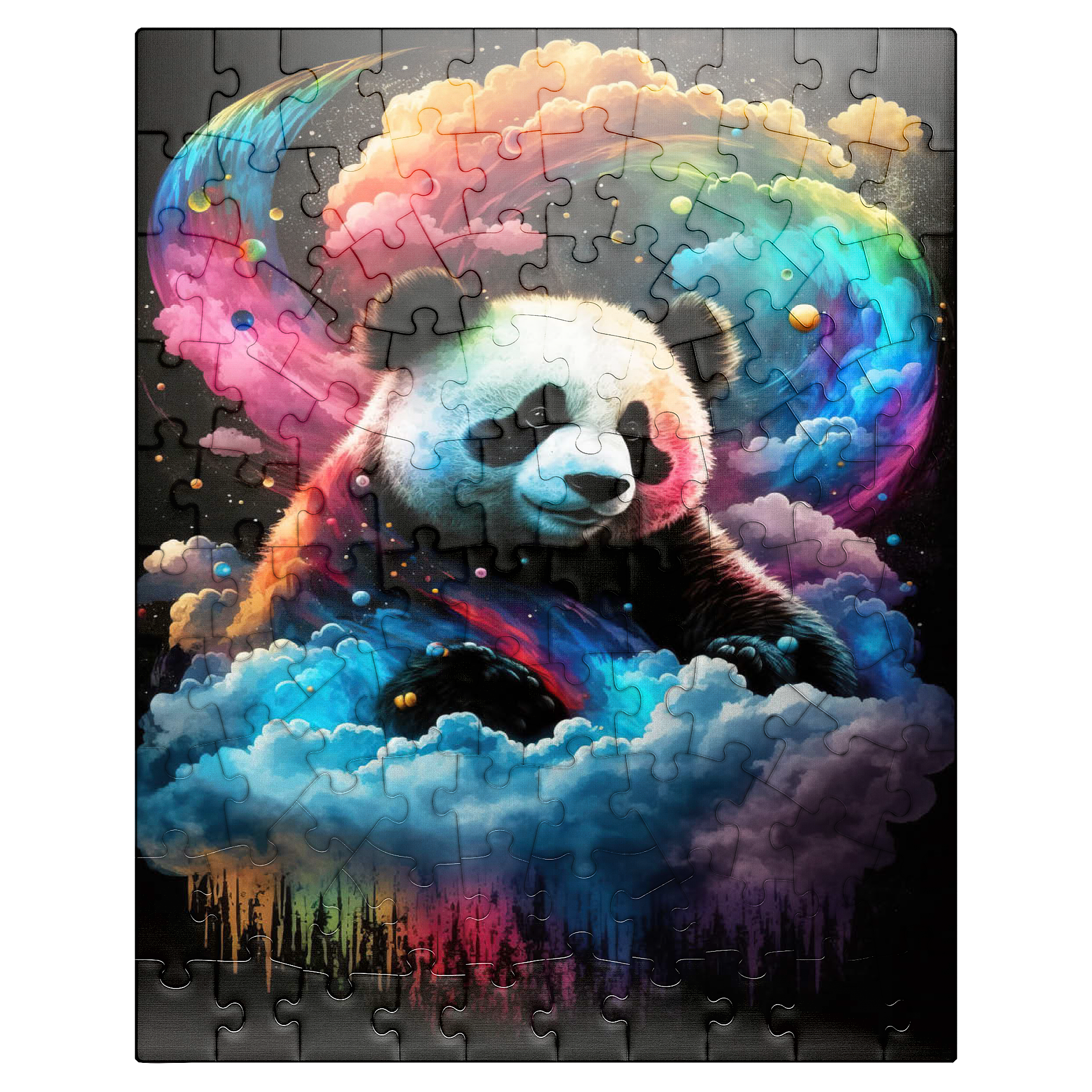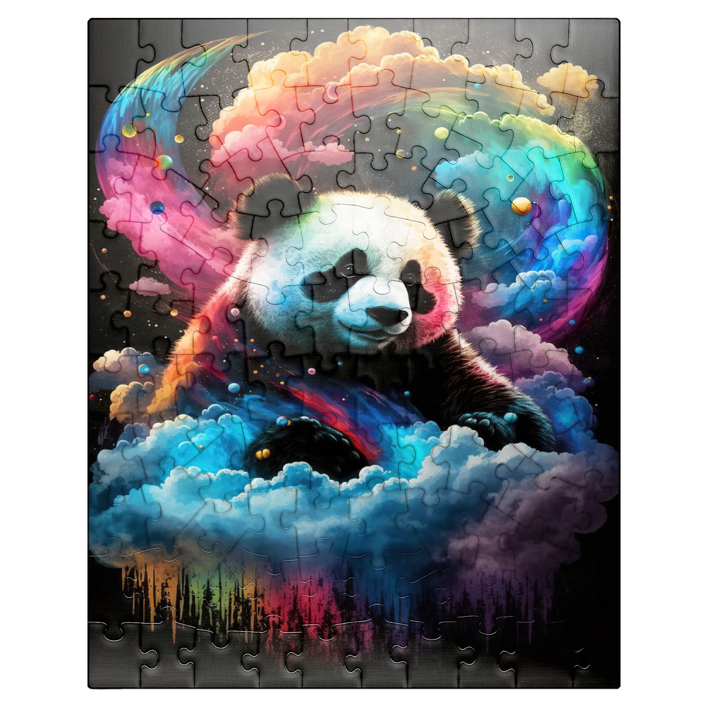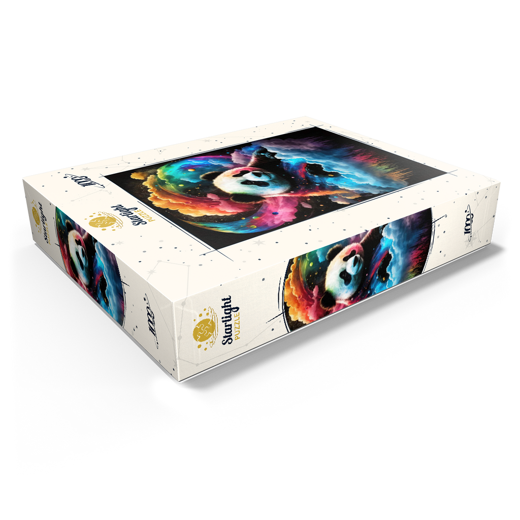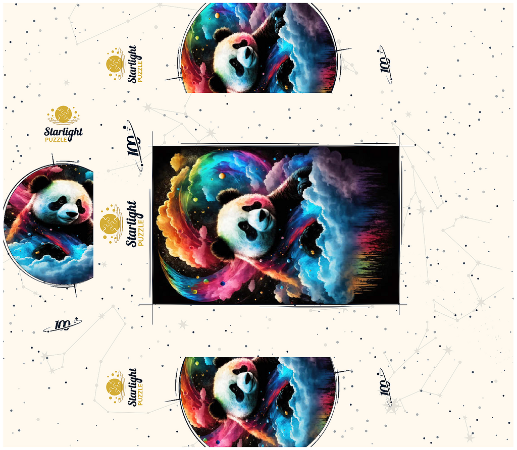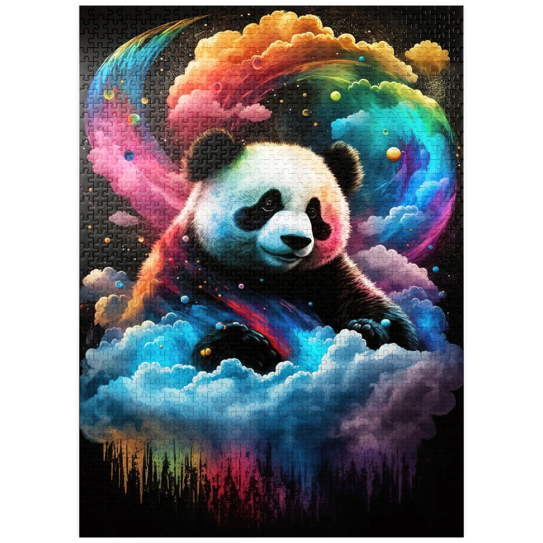 This mesmerizing artwork features a majestic panda surrounded by swirling cosmic clouds and vibrant nebula-like colors. the dreamy composition blends fantasy and surrealism, with the panda appearing to float through a celestial realm of radiant blues, fiery oranges, and deep purples. ethereal light and floating planets enhance the magical, otherworldly atmosphere, creating a visually stunning masterpiece. this piece is perfect for lovers of cosmic art, whimsical wildlife illustrations, and those drawn to the mystical beauty of nature blended with fantasy.