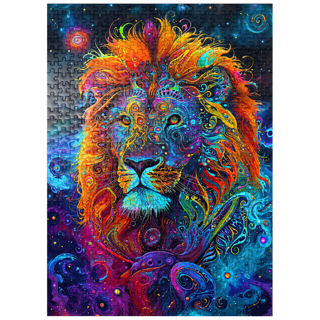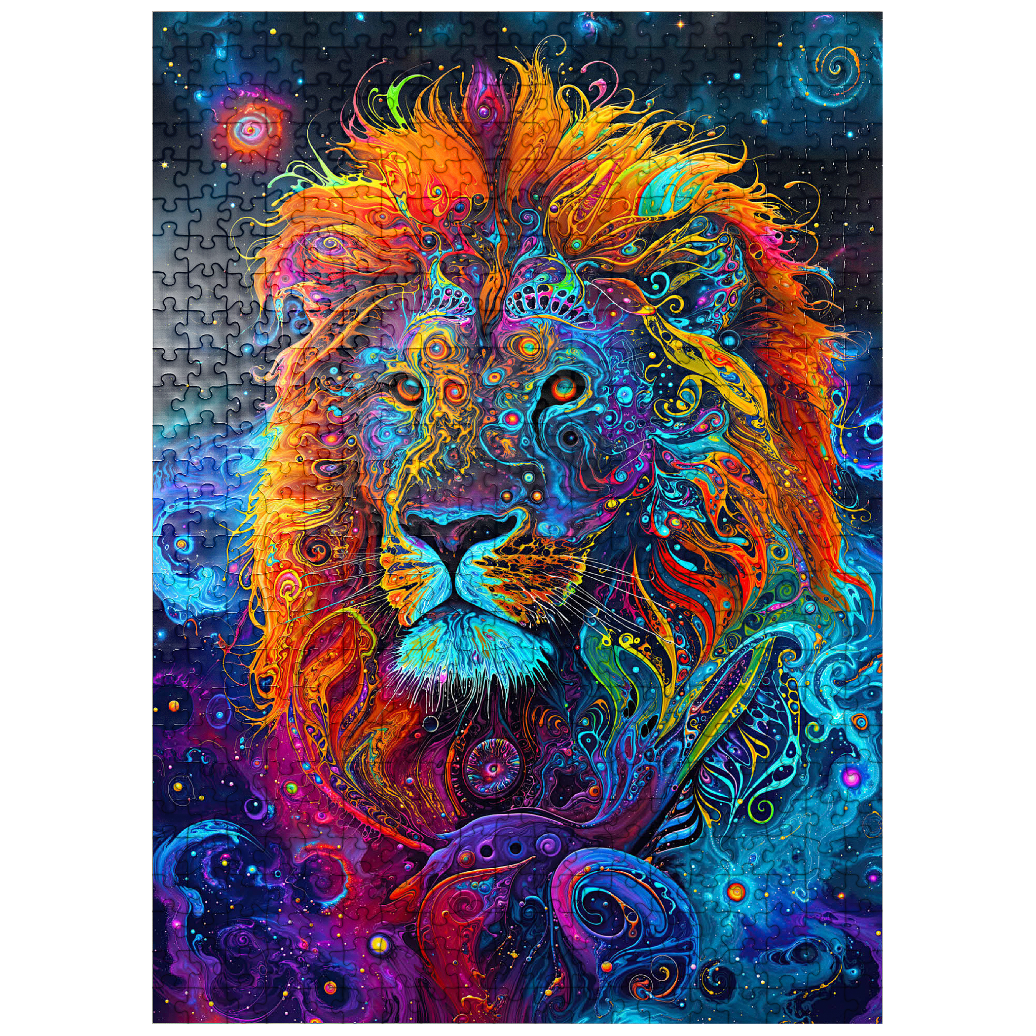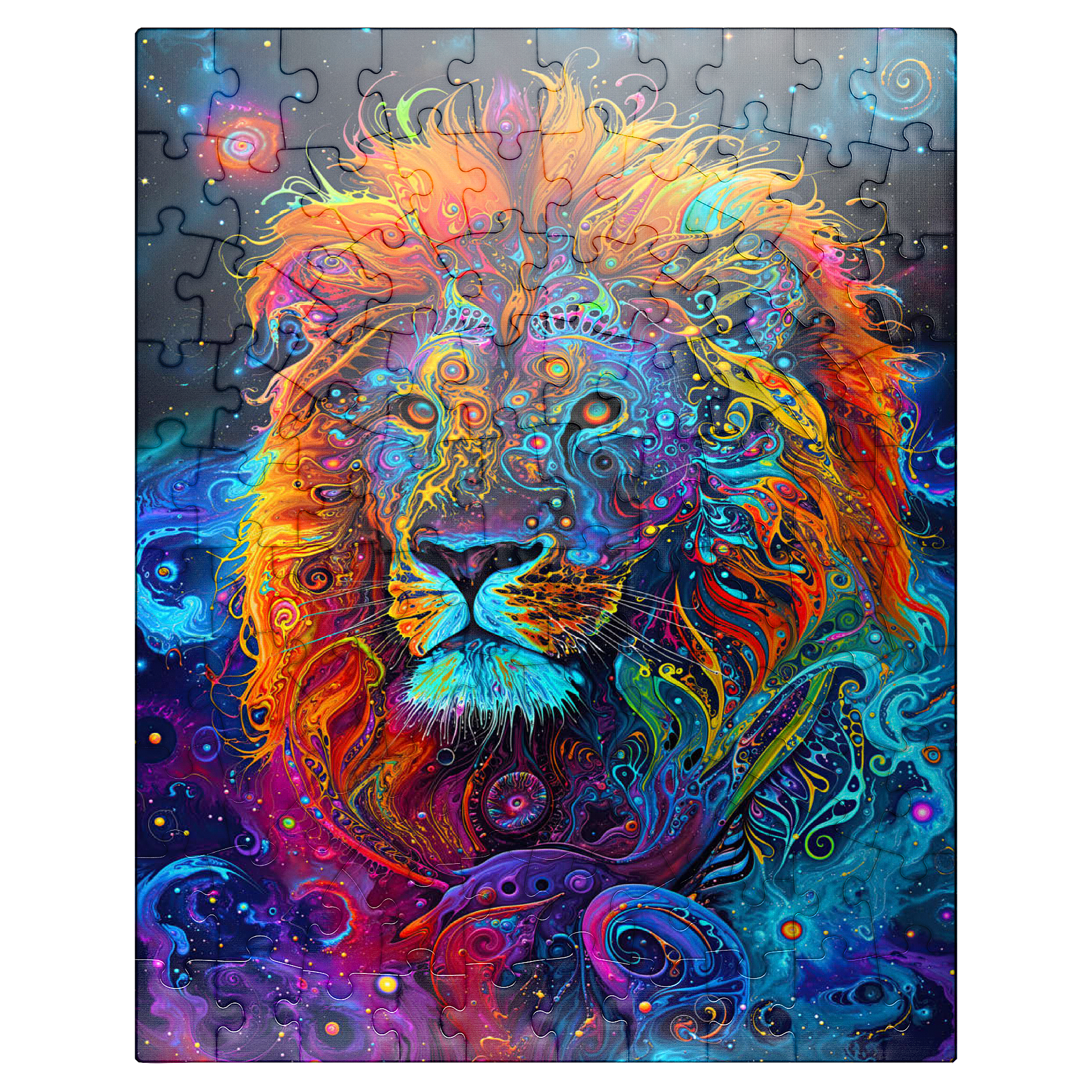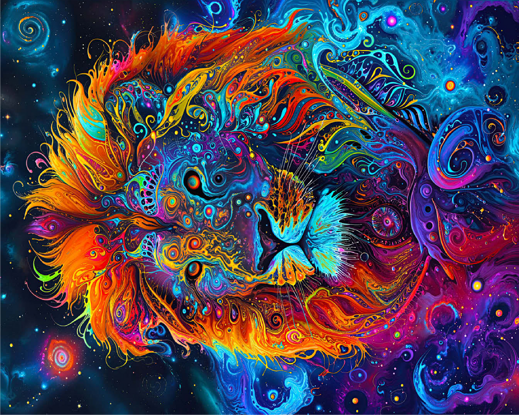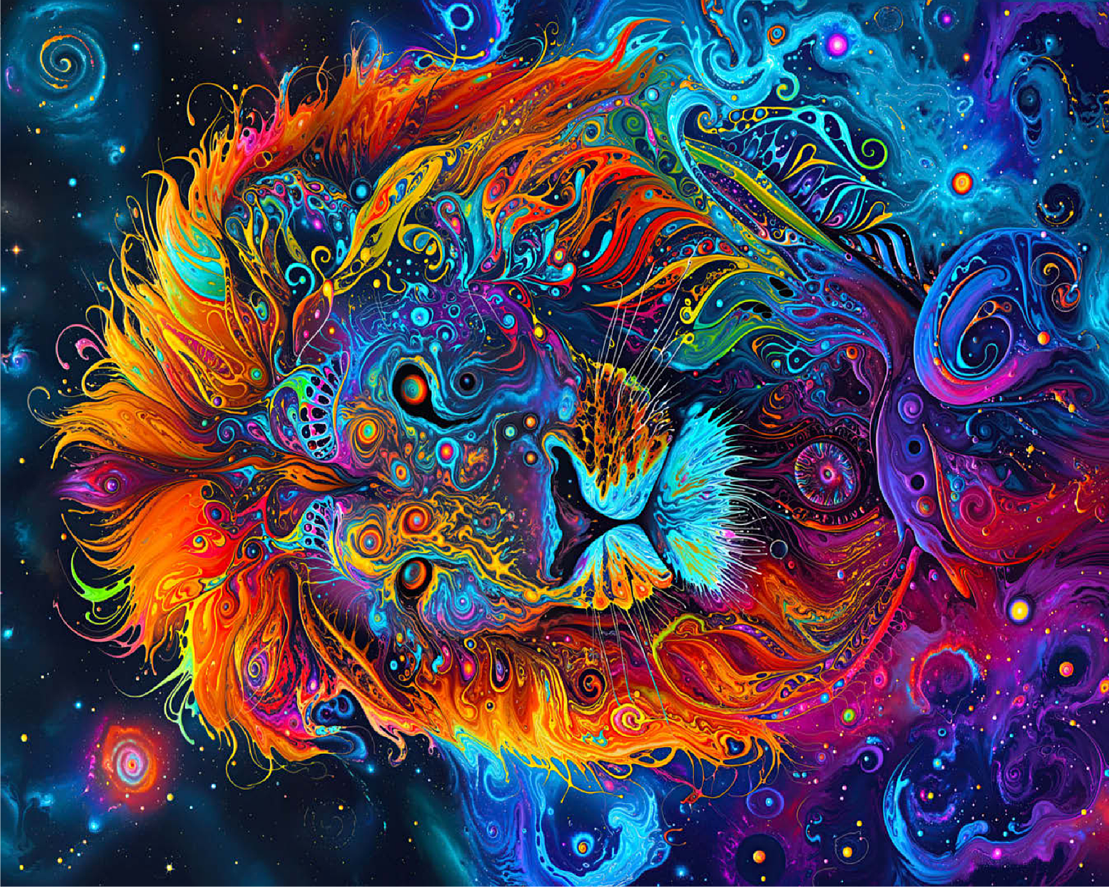 This breathtaking artwork features a majestic lion rendered in an explosion of cosmic colors and swirling psychedelic patterns. The lion’s fiery mane is a kaleidoscope of vibrant hues, blending seamlessly into a mesmerizing galaxy filled with stars, spirals, and celestial energy. Its intense eyes seem to glow with wisdom and strength, embodying the lion’s regal and powerful essence. The intricate details and dynamic composition create a captivating fusion of natural majesty and cosmic wonder, making this piece a celebration of the universe’s beauty and mystique.