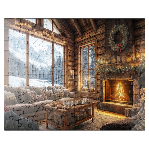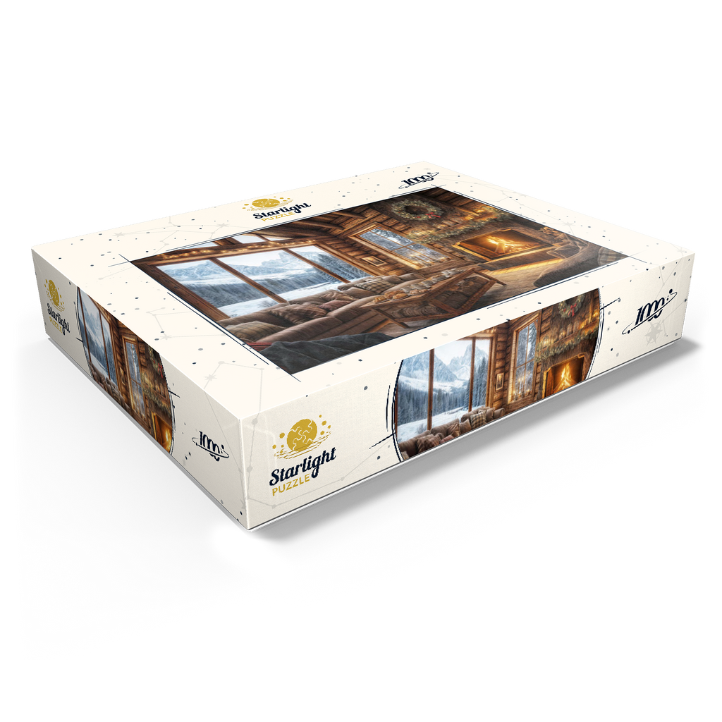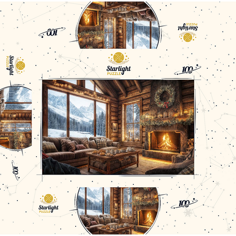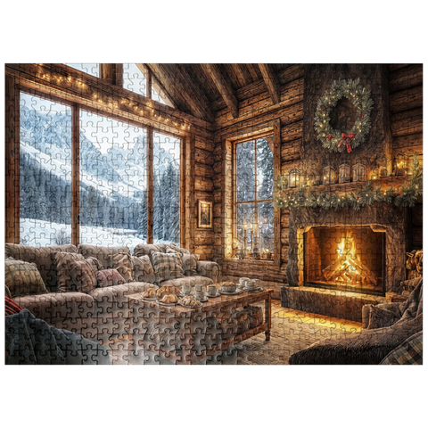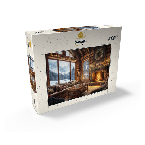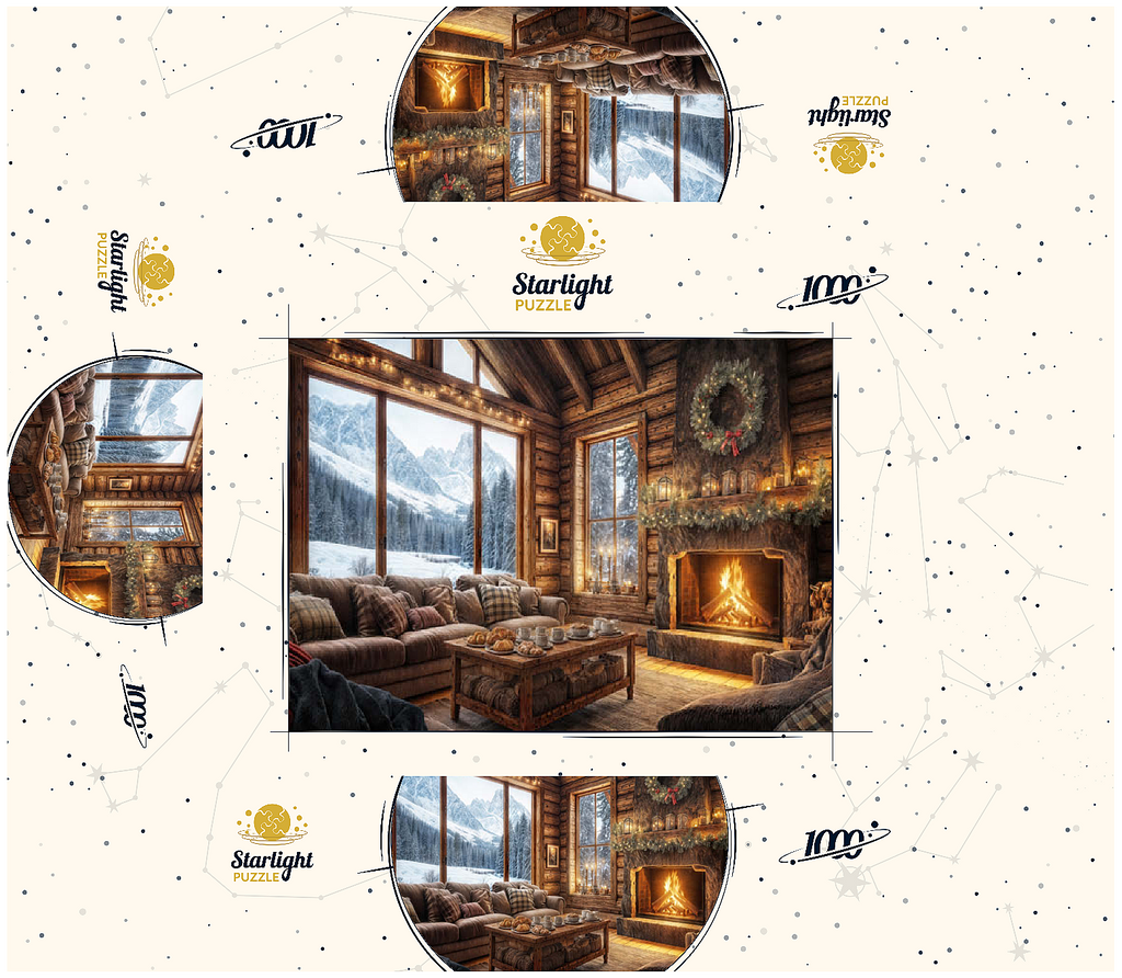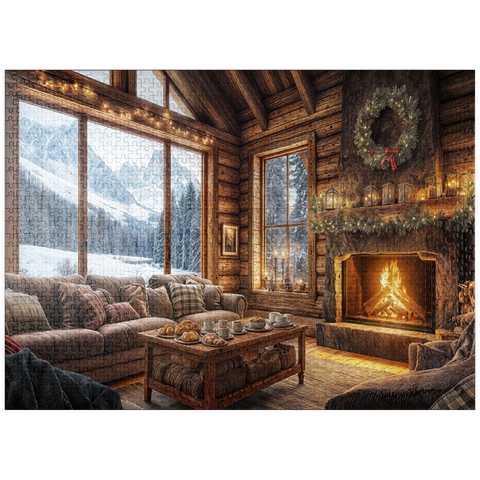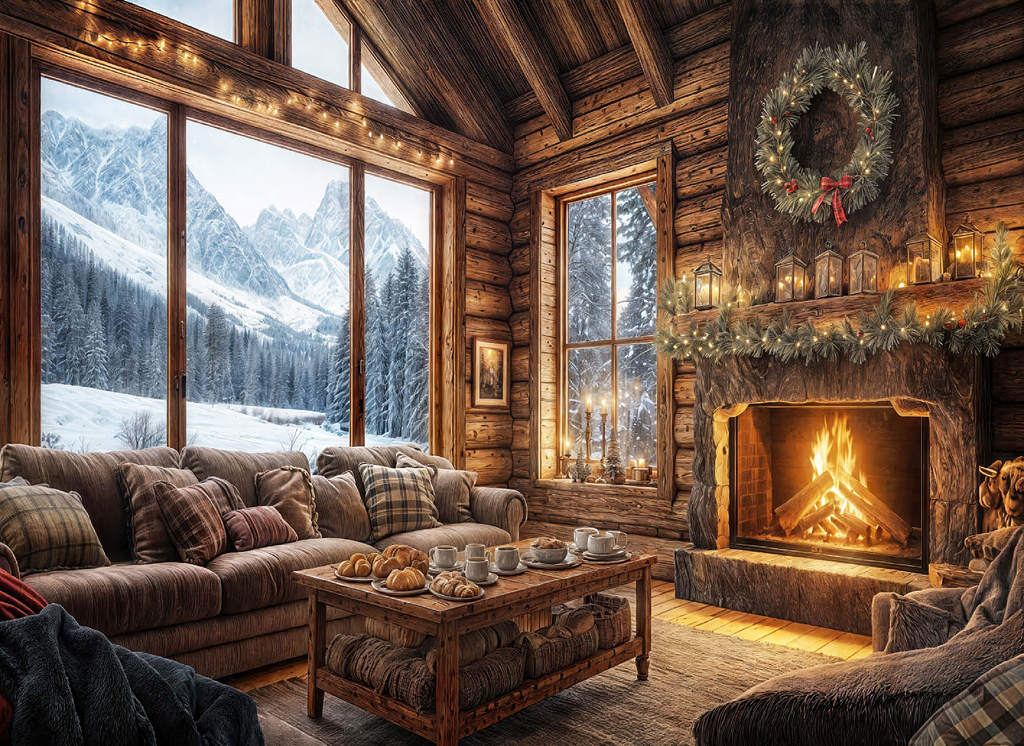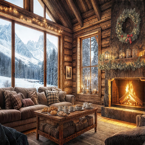 This inviting scene showcases the interior of a rustic log cabin, featuring plush seating, warm wooden walls, and a roaring fireplace adorned with festive garlands and a glowing wreath. Large windows frame a breathtaking winter landscape of snow-covered mountains and evergreen forests, allowing natural light to enhance the cozy ambiance. A wooden coffee table, set with an assortment of treats and hot drinks, completes the perfect retreat for relaxation and holiday warmth.