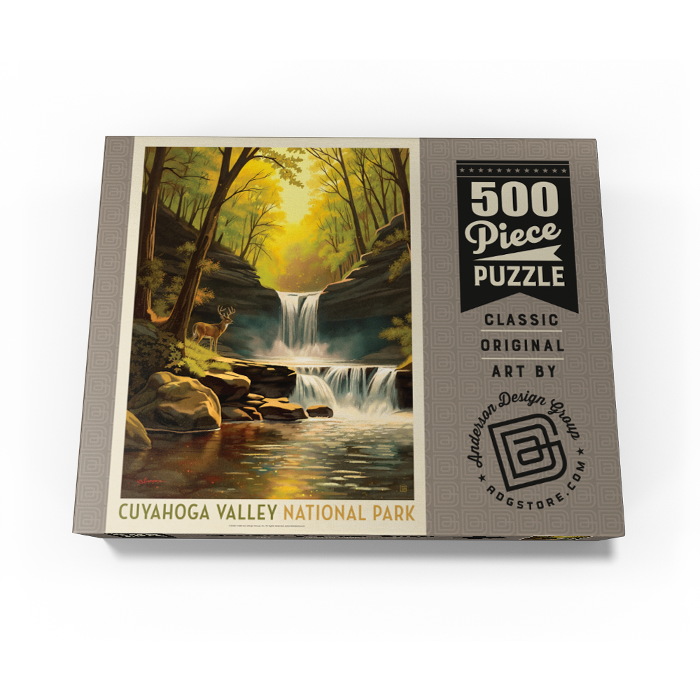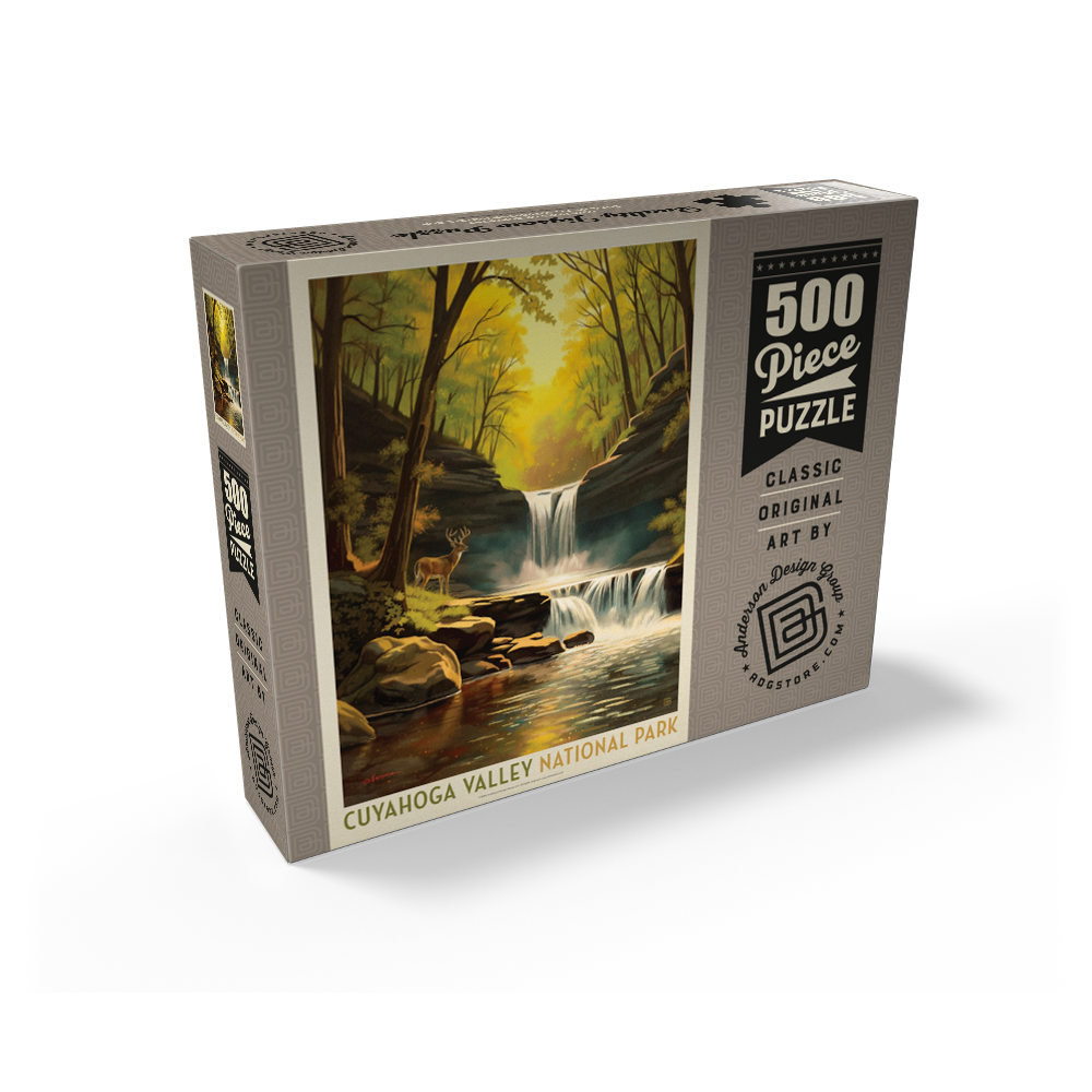 Cuyahoga Valley National Park in Ohio is featured in a peaceful forest gorge with a tiered waterfall flowing into a clear, reflective creek, framed by rugged sandstone cliffs and mossy boulders. Warm golden light filters through dense tree canopies, suggesting a spring or summer morning or late-afternoon glow typical of the scenic Cuyahoga River valley between Cleveland and Akron. A white-tailed deer on the riverbank adds an iconic Midwest wildlife detail that outdoor travelers often associate with this national park. The scene uses clean shapes and a soft vintage travel-poster look that emphasizes hiking, waterfalls, river views, and nature photography appeal for search.