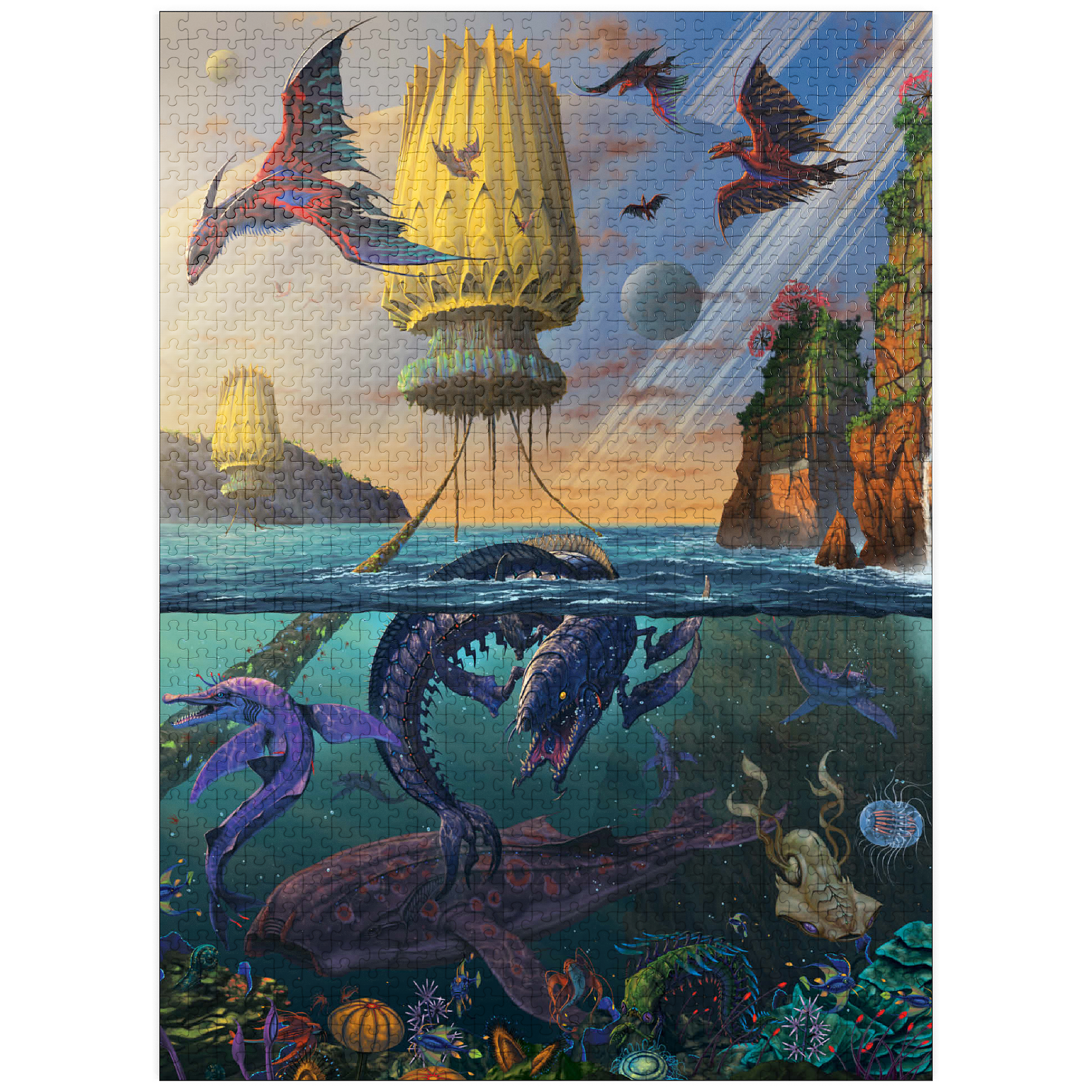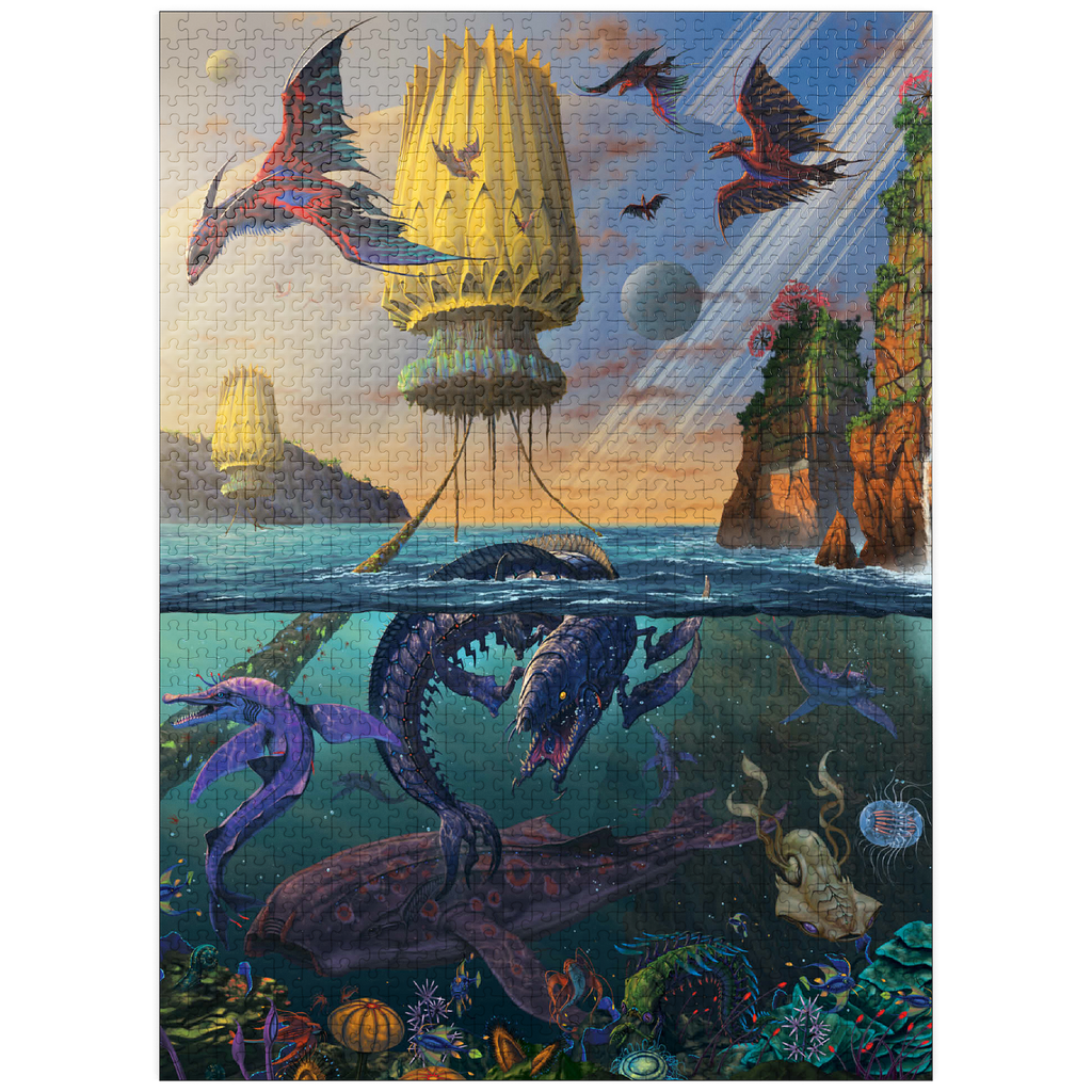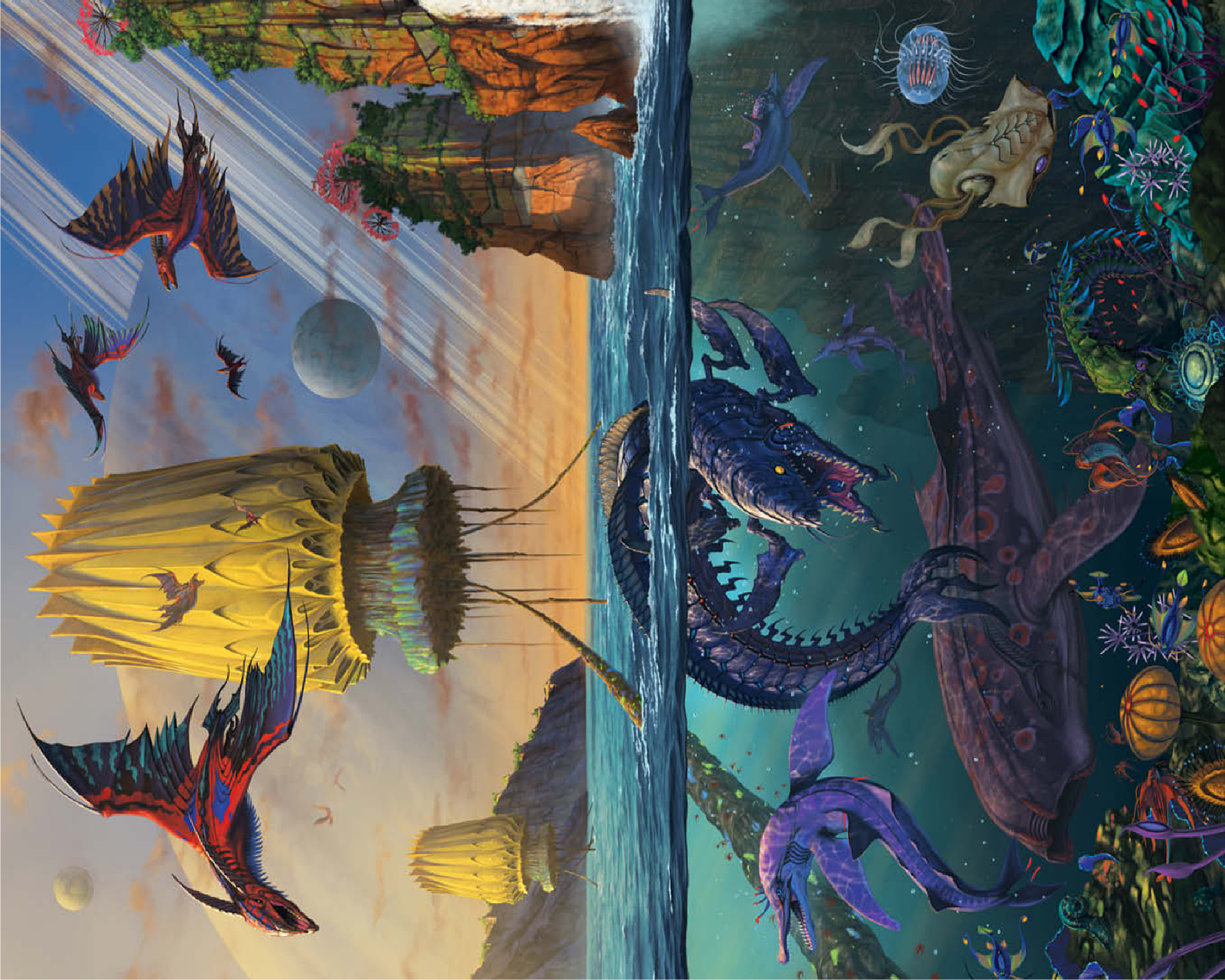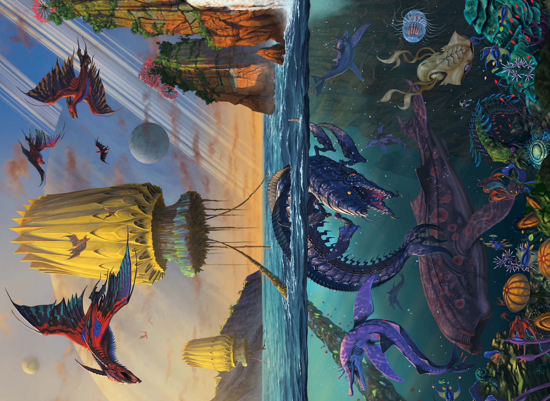 This Artwork depicts the primitive and lush alien life on the moon Cyris, only 40 lightyears from Earth, split into an upper and lower section by a body of water. The upper section shows a serene, partly cloudy sky, a large planet, and several flying creatures resembling dragons. Two large, yellow, balloon-like lifeforms float prominently in the sky. The lower section, underwater, displays a vibrant ecosystem with diverse aquatic life. Several large, alien sea creatures are the focal points, while smaller, alien fish and invertebrates populate the coral reefs and seabed. A large, menacing, dark-colored creature with segmented armor is particularly noticeable. The overall effect is one of otherworldly beauty and mystery.
