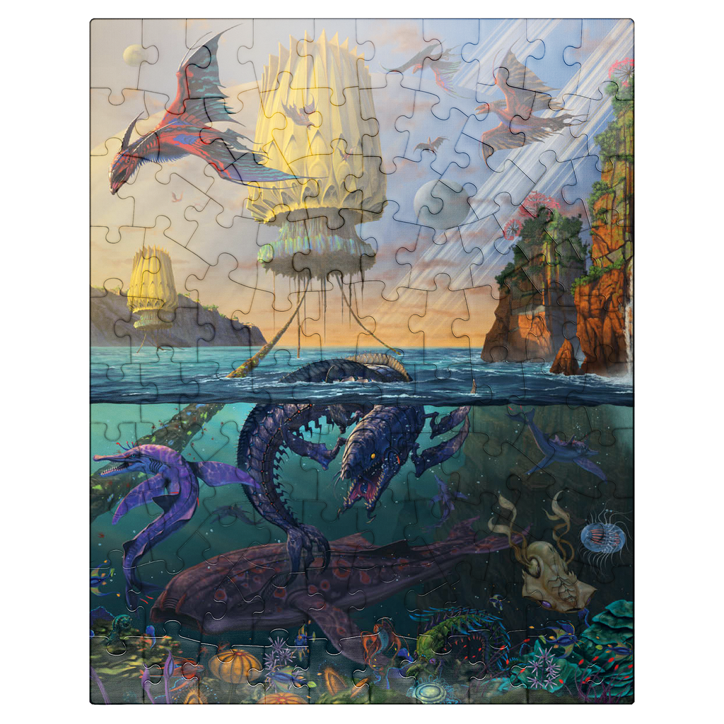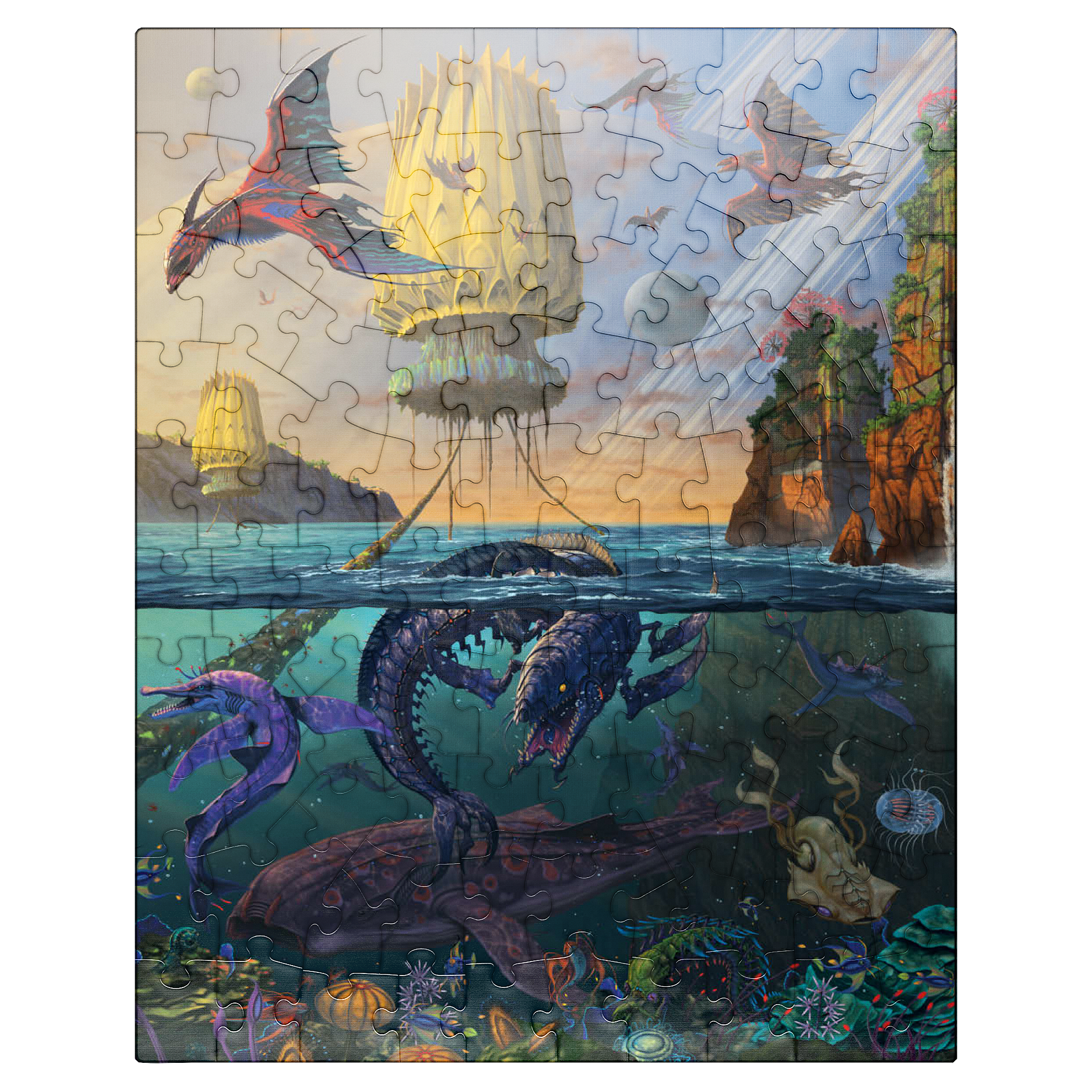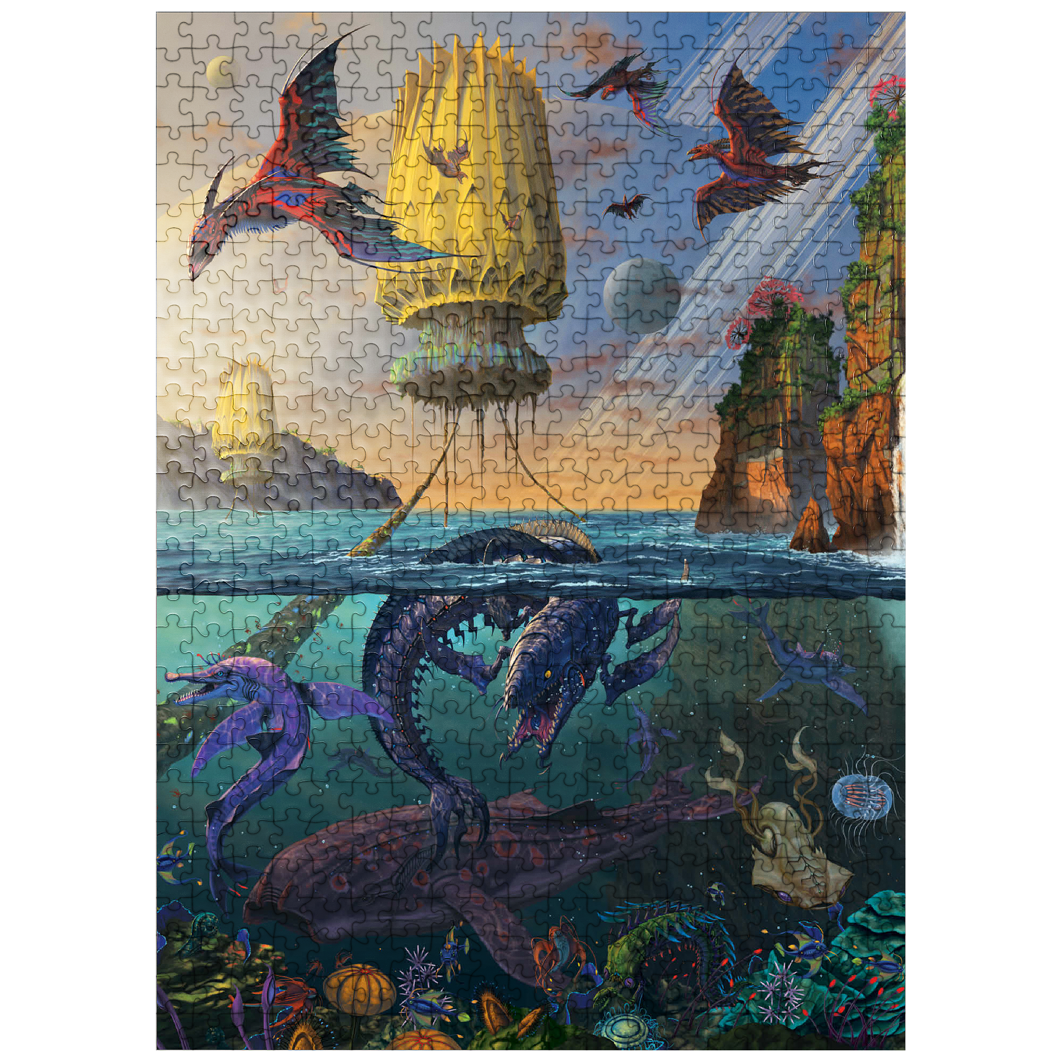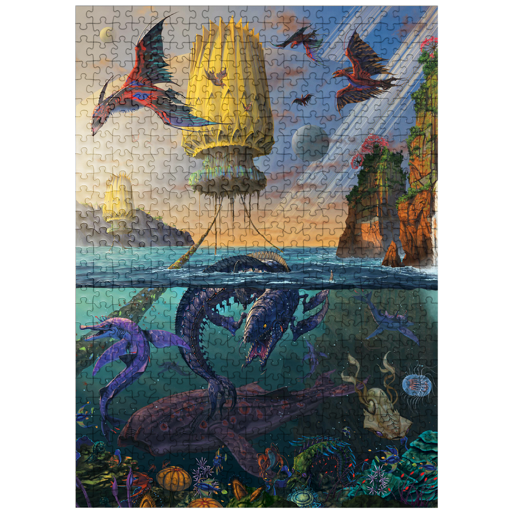 This Artwork depicts the primitive and lush alien life on the moon Cyris, only 40 lightyears from Earth, split into an upper and lower section by a body of water. The upper section shows a serene, partly cloudy sky, a large planet, and several flying creatures resembling dragons. Two large, yellow, balloon-like lifeforms float prominently in the sky. The lower section, underwater, displays a vibrant ecosystem with diverse aquatic life. Several large, alien sea creatures are the focal points, while smaller, alien fish and invertebrates populate the coral reefs and seabed. A large, menacing, dark-colored creature with segmented armor is particularly noticeable. The overall effect is one of otherworldly beauty and mystery.