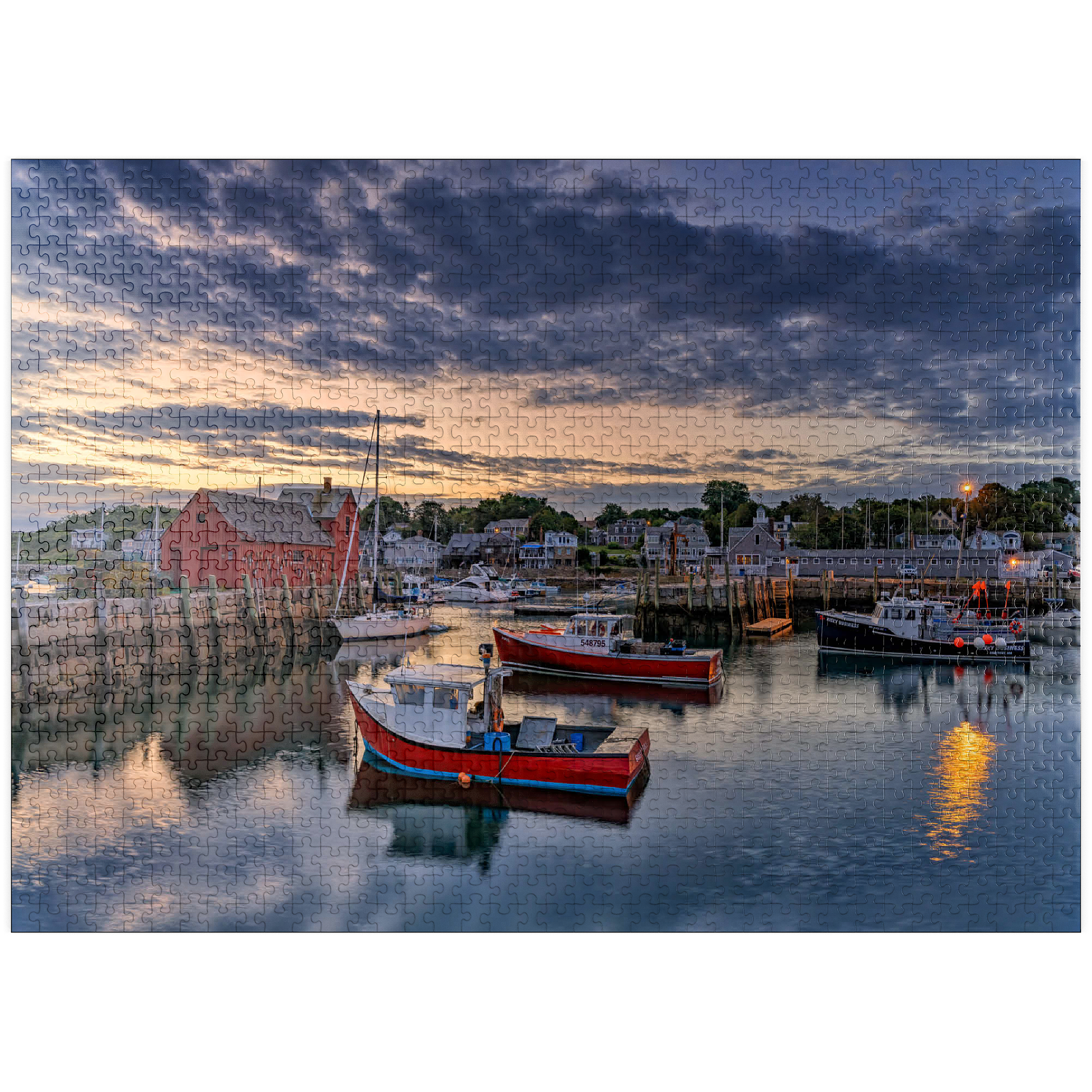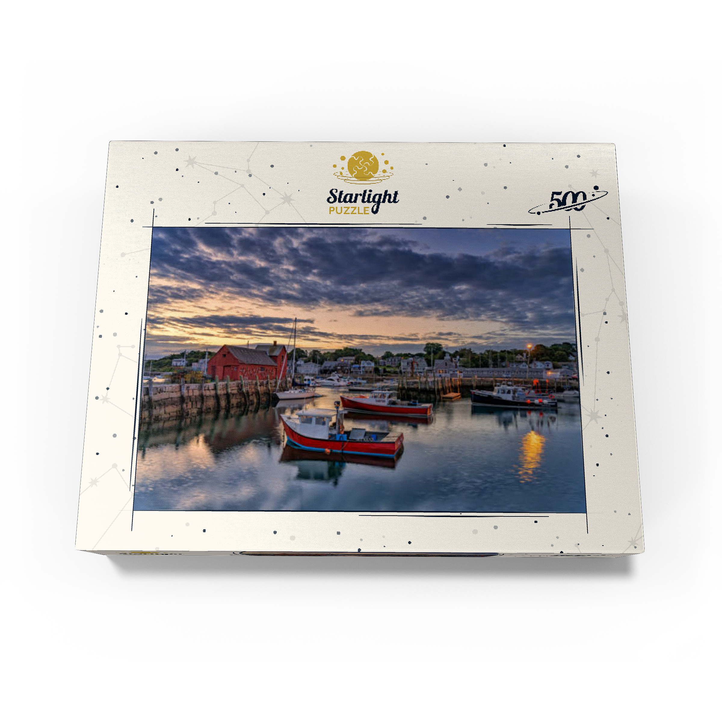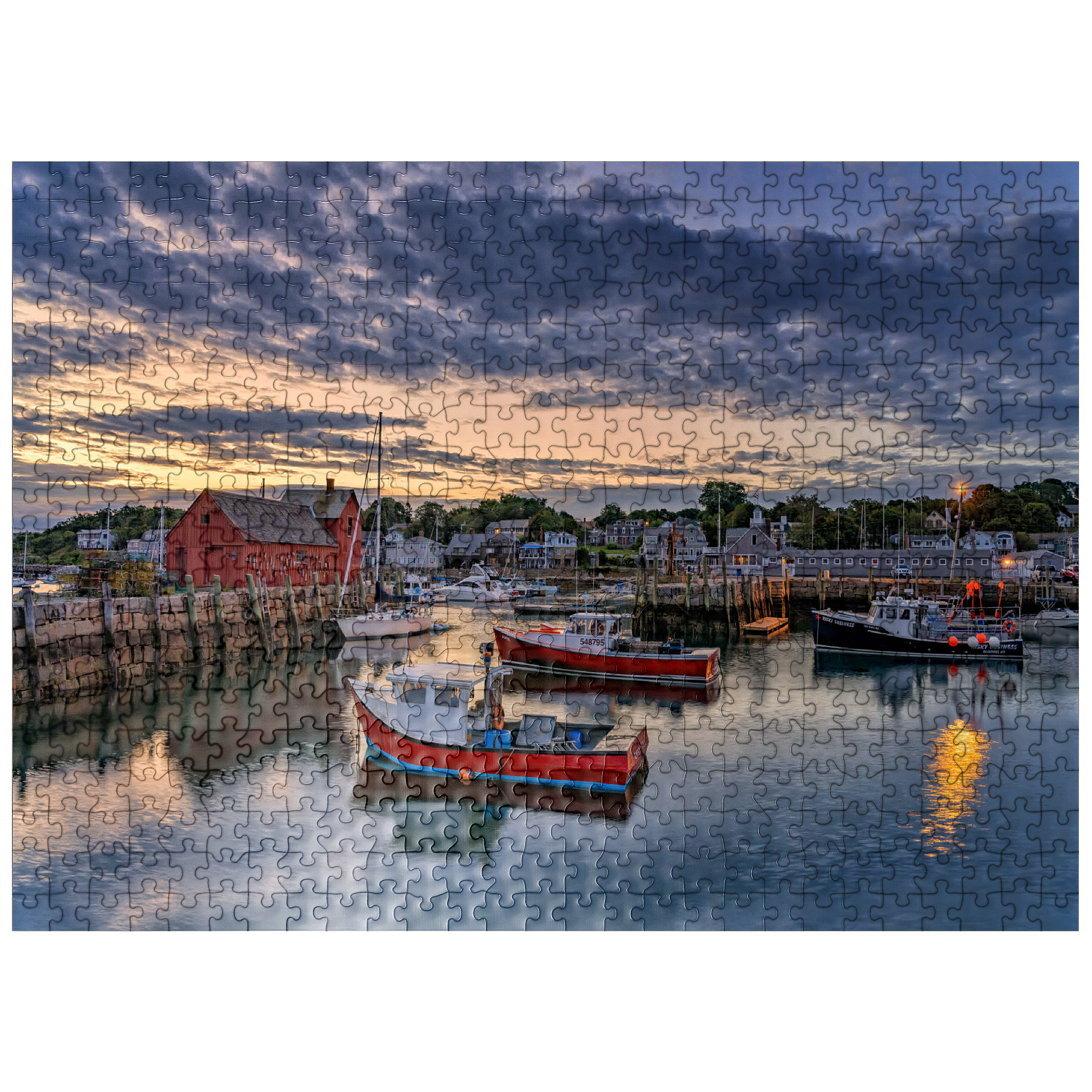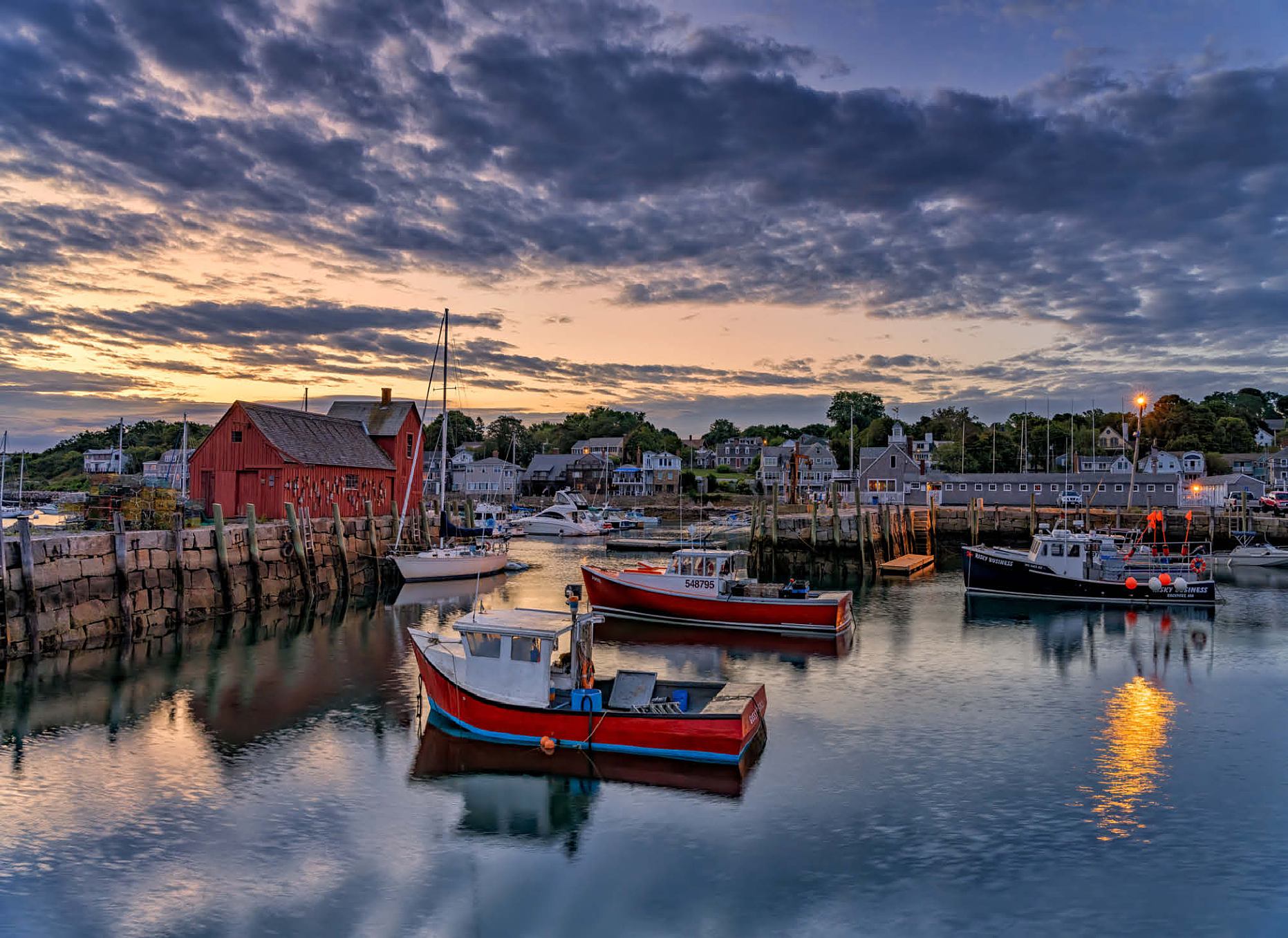 This serene image captures the charm of Rockport Harbor at sunset. The iconic red Motif No. 1 fishing shack stands proudly against a backdrop of calm waters and pastel skies. Fishing boats gently float in the harbor, their reflections mirrored on the still surface. Quaint coastal homes and historic buildings line the harbor, completing this picturesque New England seaside scene. The tranquil atmosphere and soft lighting create a perfect moment of coastal beauty.