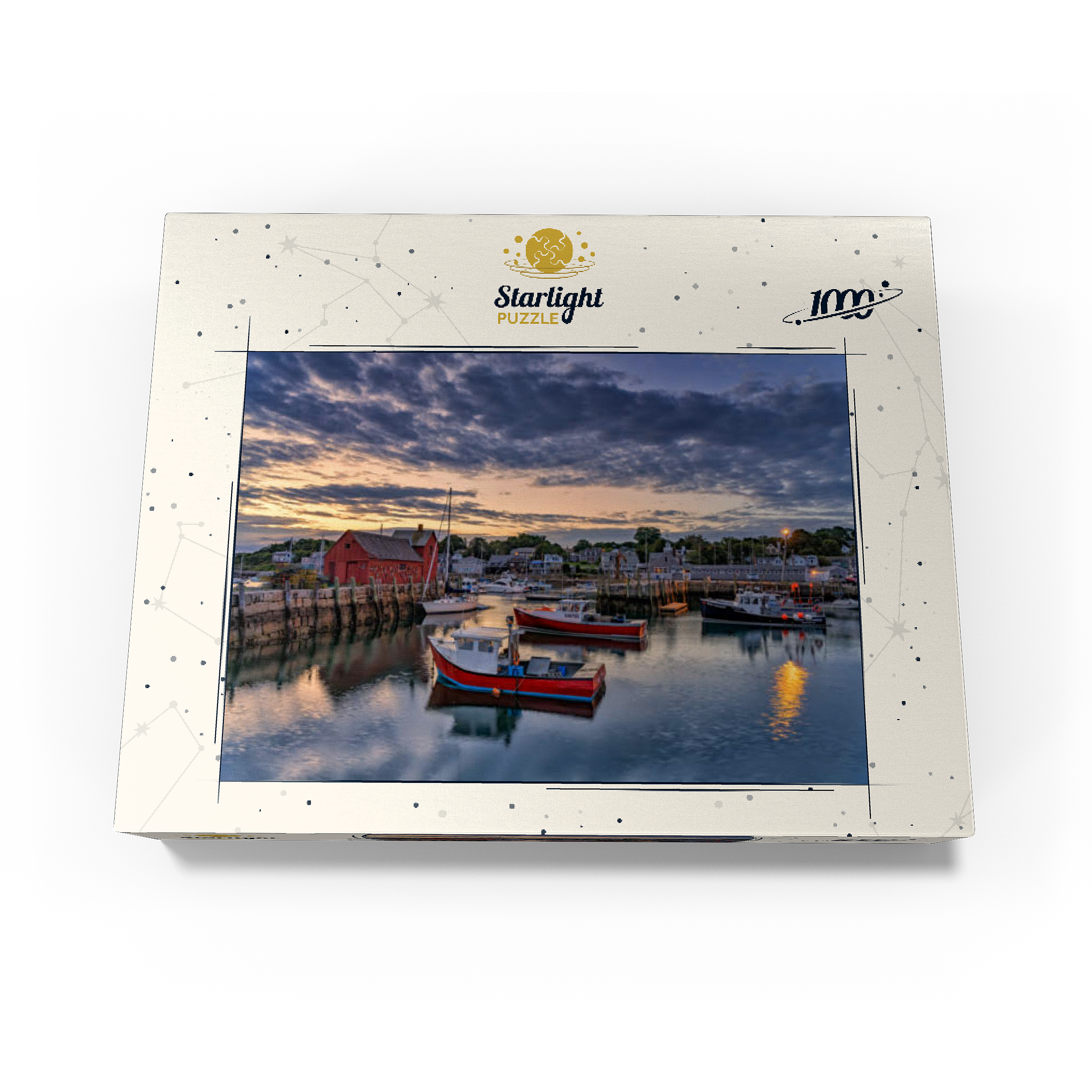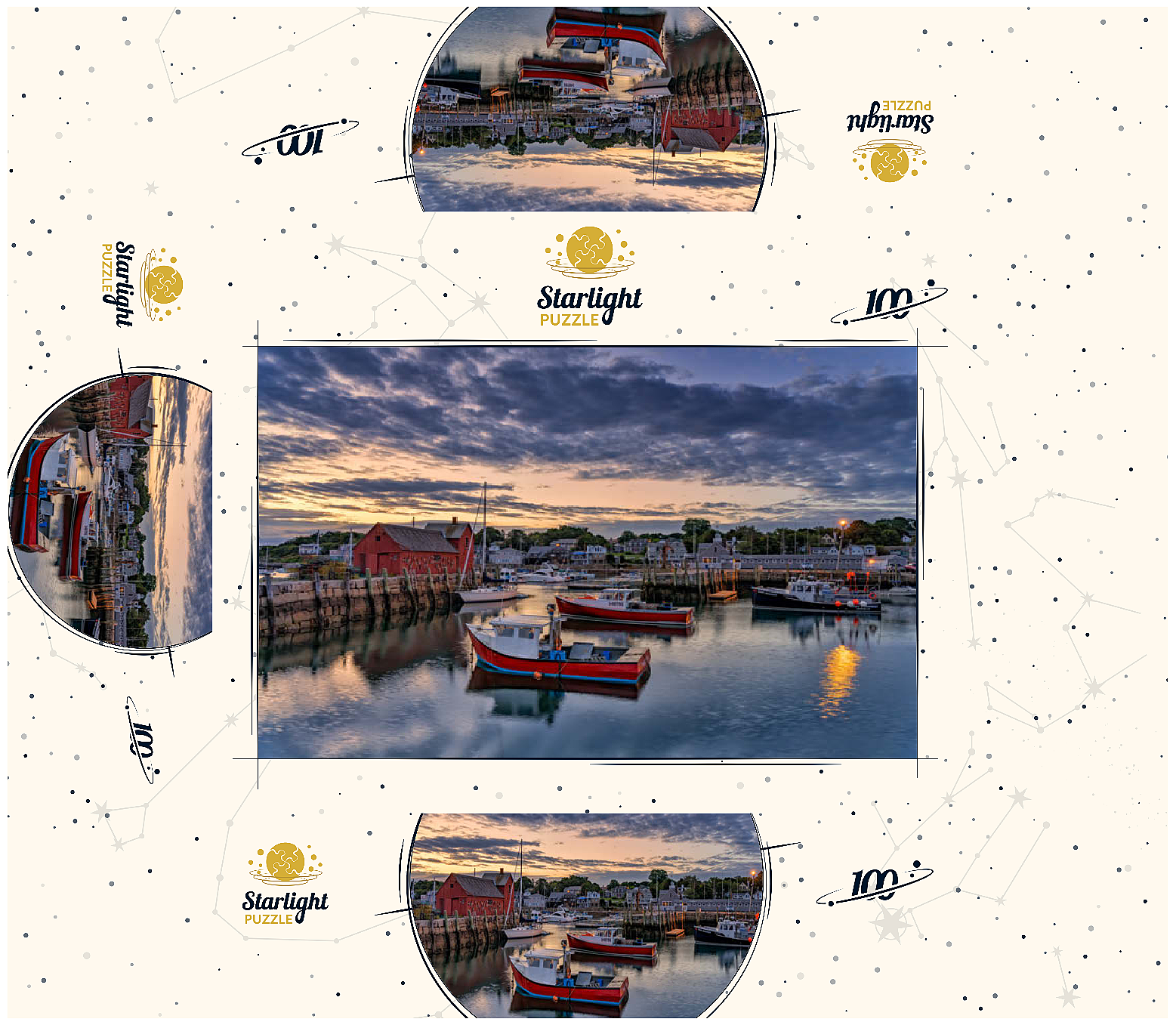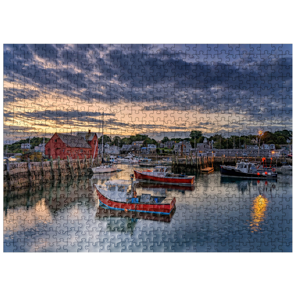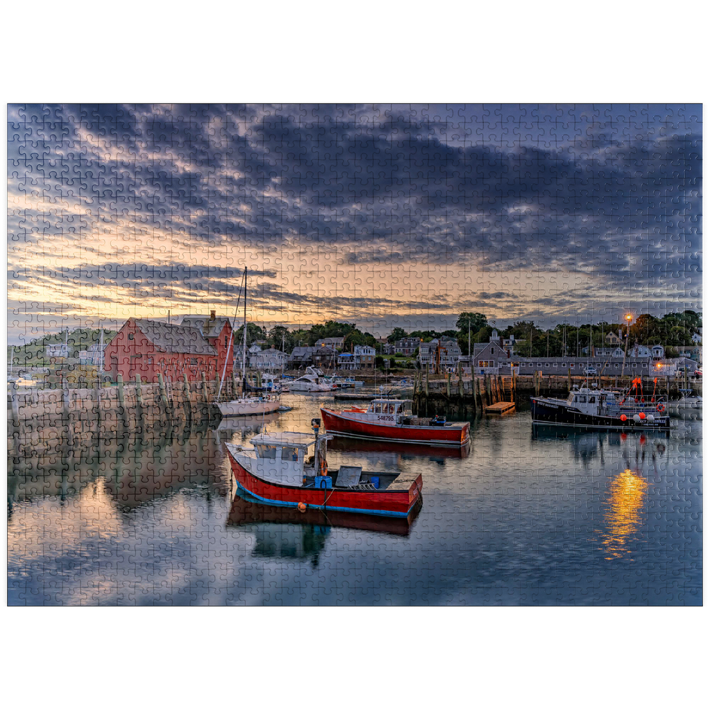 This serene image captures the charm of Rockport Harbor at sunset. The iconic red Motif No. 1 fishing shack stands proudly against a backdrop of calm waters and pastel skies. Fishing boats gently float in the harbor, their reflections mirrored on the still surface. Quaint coastal homes and historic buildings line the harbor, completing this picturesque New England seaside scene. The tranquil atmosphere and soft lighting create a perfect moment of coastal beauty.