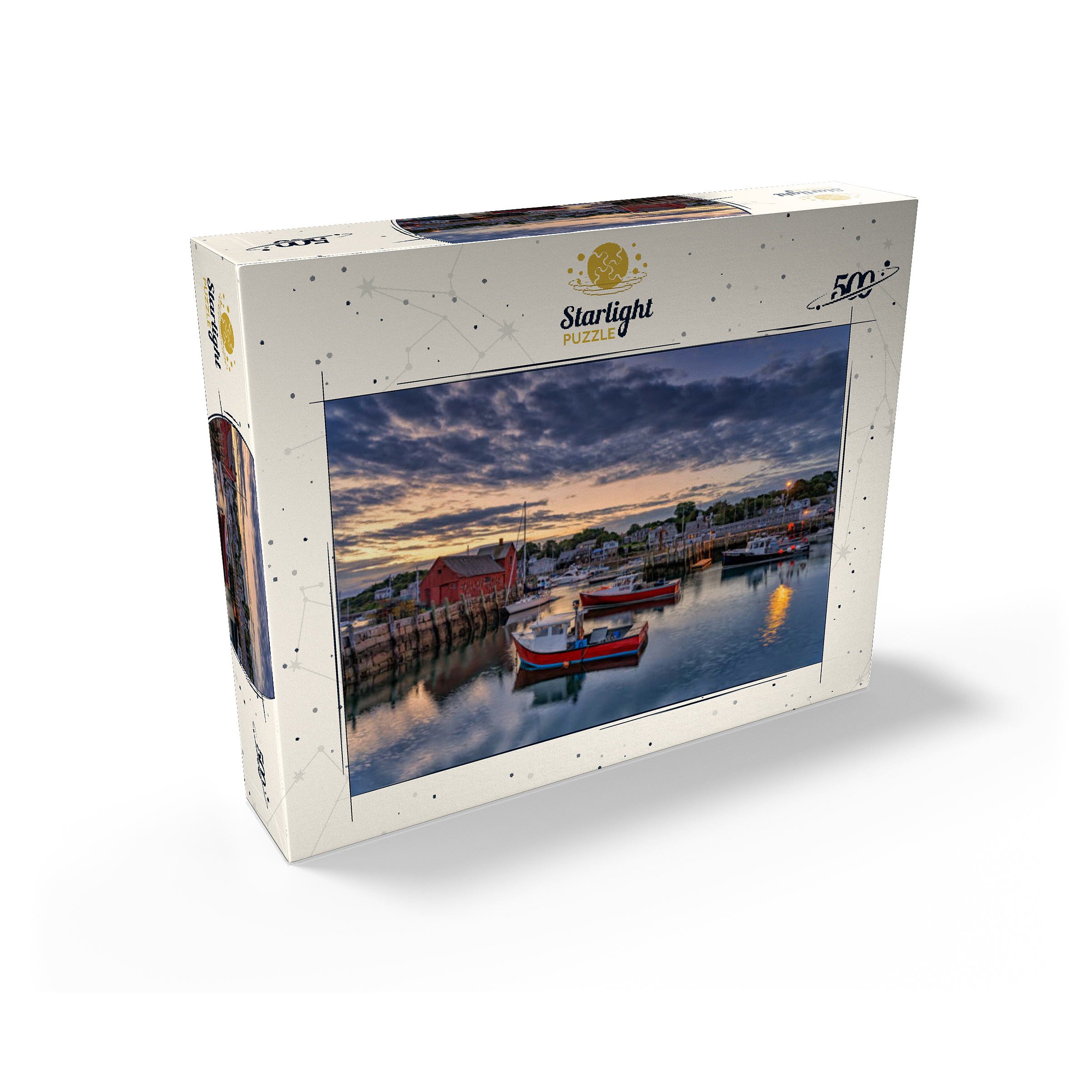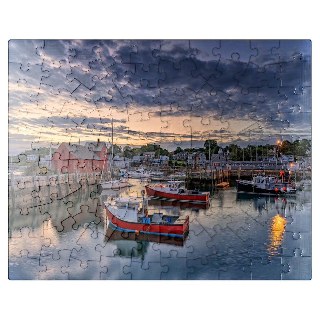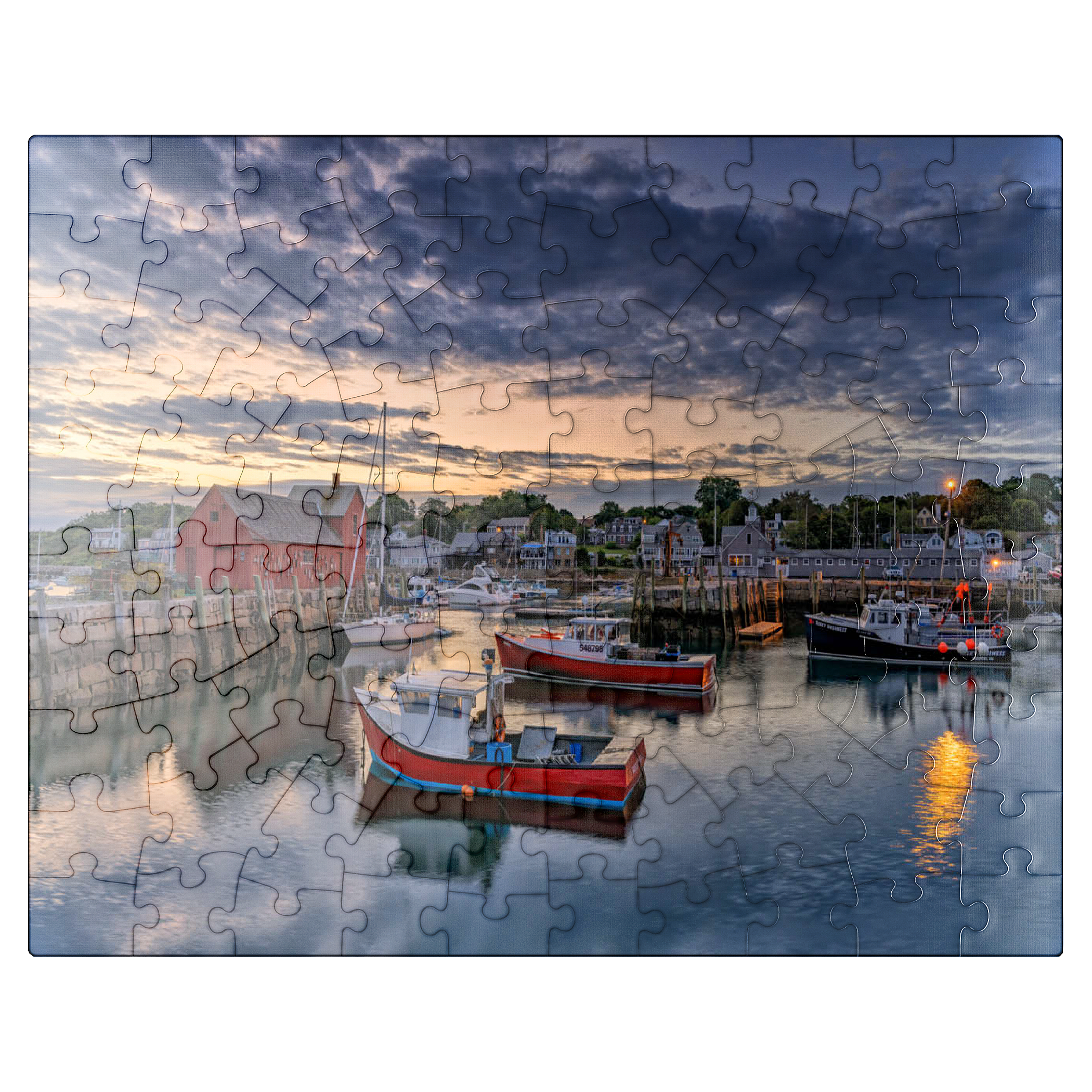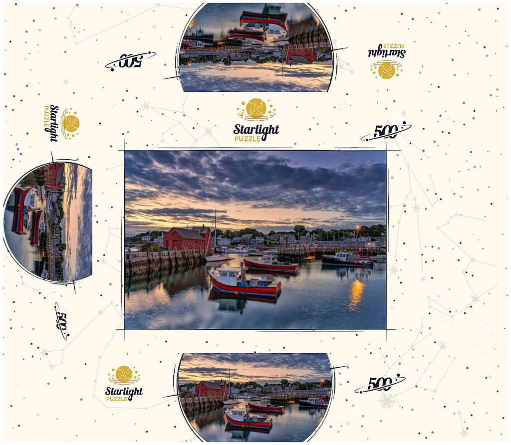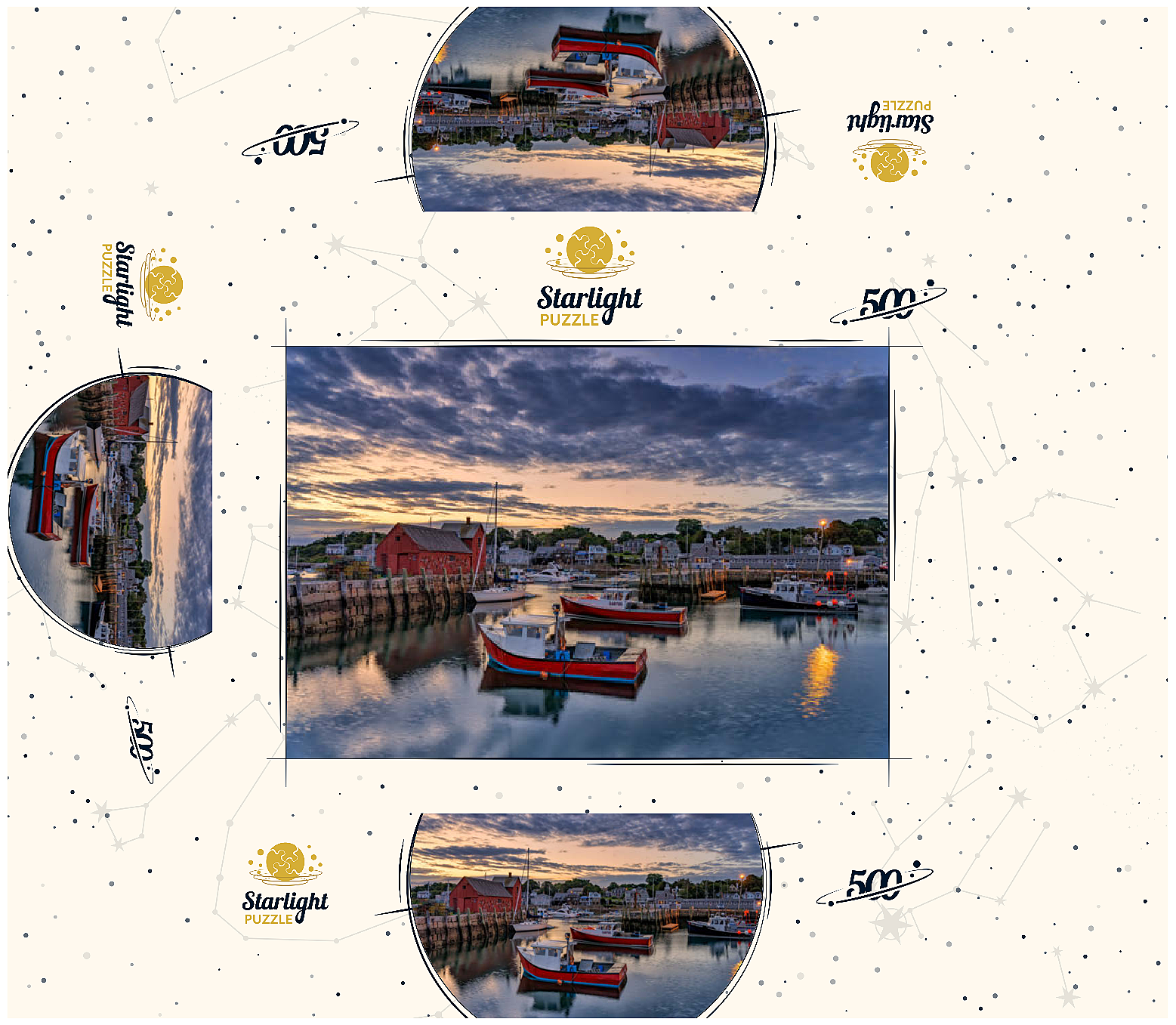 This serene image captures the charm of Rockport Harbor at sunset. The iconic red Motif No. 1 fishing shack stands proudly against a backdrop of calm waters and pastel skies. Fishing boats gently float in the harbor, their reflections mirrored on the still surface. Quaint coastal homes and historic buildings line the harbor, completing this picturesque New England seaside scene. The tranquil atmosphere and soft lighting create a perfect moment of coastal beauty.
