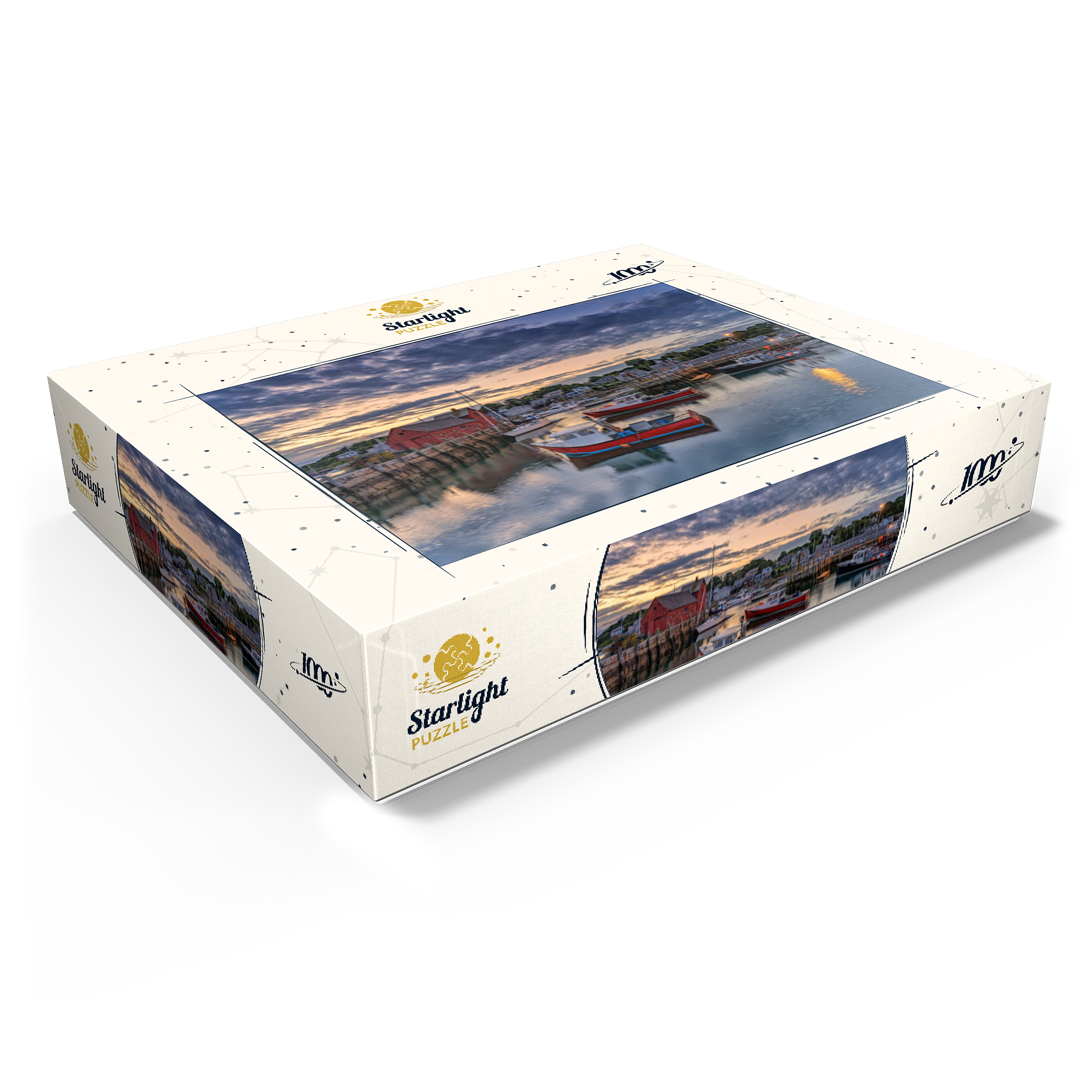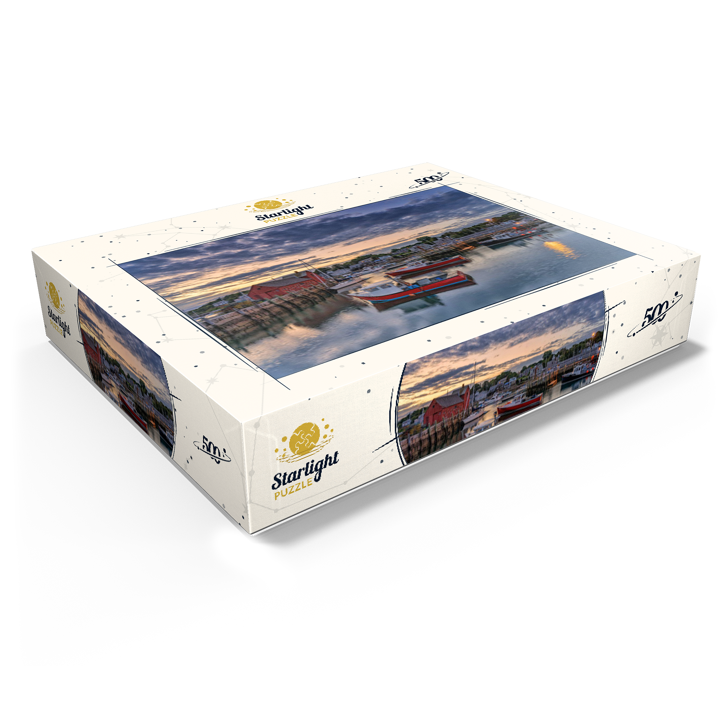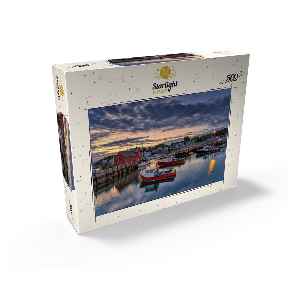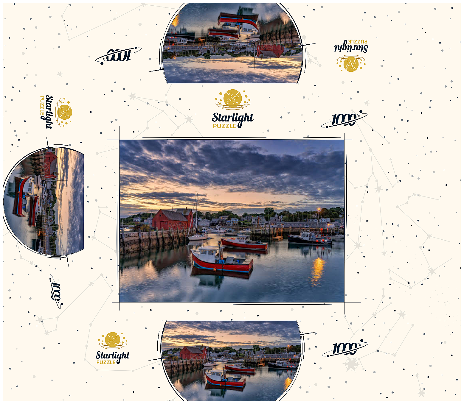 This serene image captures the charm of Rockport Harbor at sunset. The iconic red Motif No. 1 fishing shack stands proudly against a backdrop of calm waters and pastel skies. Fishing boats gently float in the harbor, their reflections mirrored on the still surface. Quaint coastal homes and historic buildings line the harbor, completing this picturesque New England seaside scene. The tranquil atmosphere and soft lighting create a perfect moment of coastal beauty.