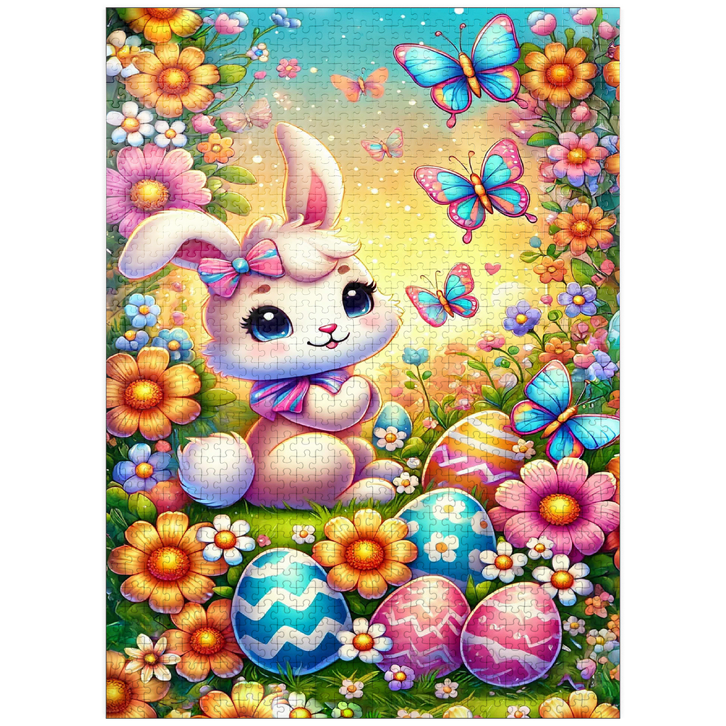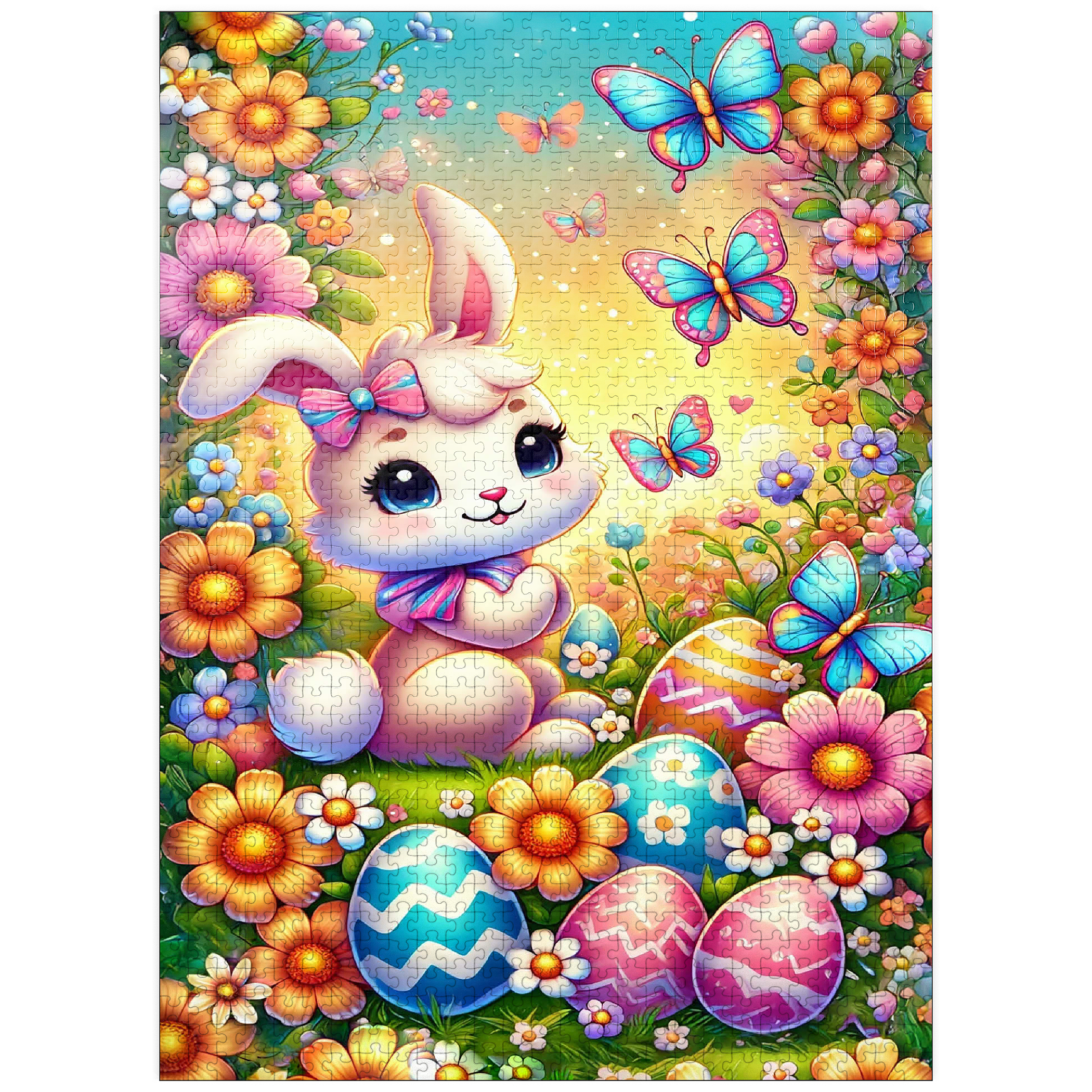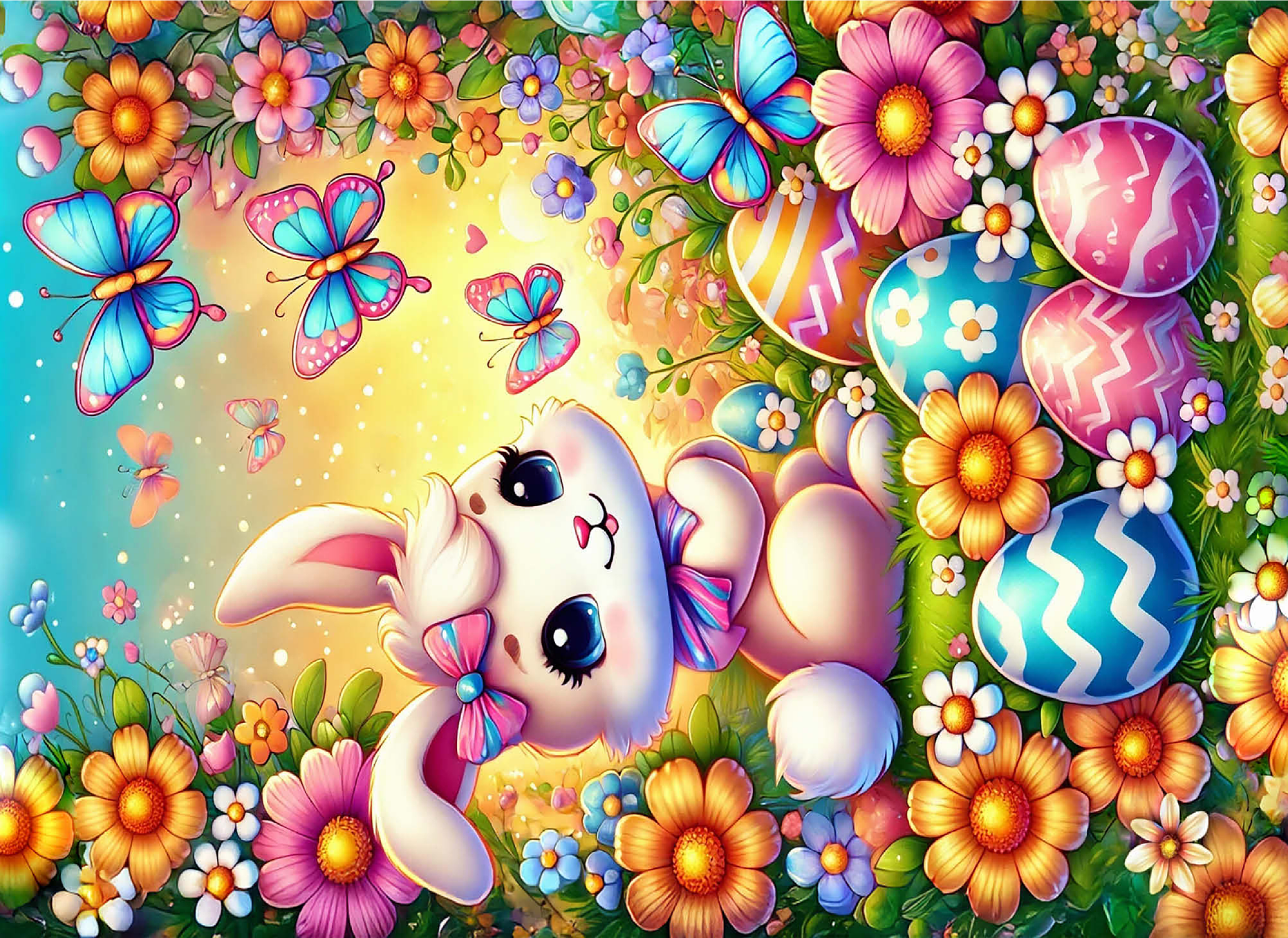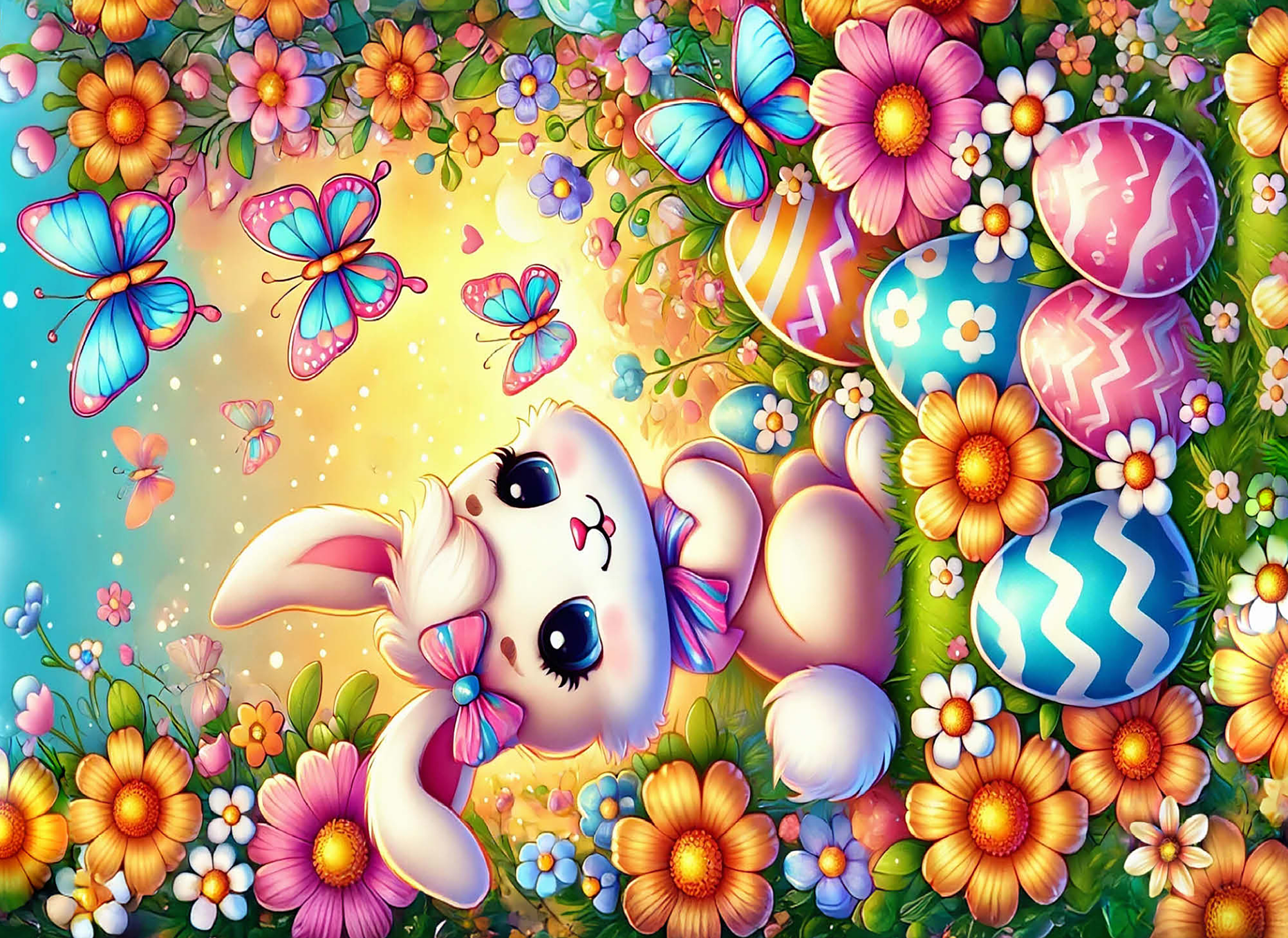 A charming and vibrant scene featuring an adorable bunny with big blue eyes, surrounded by decorated Easter eggs and blooming spring flowers. Brightly colored butterflies flutter through the air, adding a whimsical touch to the joyful setting. The pastel hues and cheerful atmosphere capture the essence of Easter and springtime celebrations, making this a delightful visual for children and festive occasions.