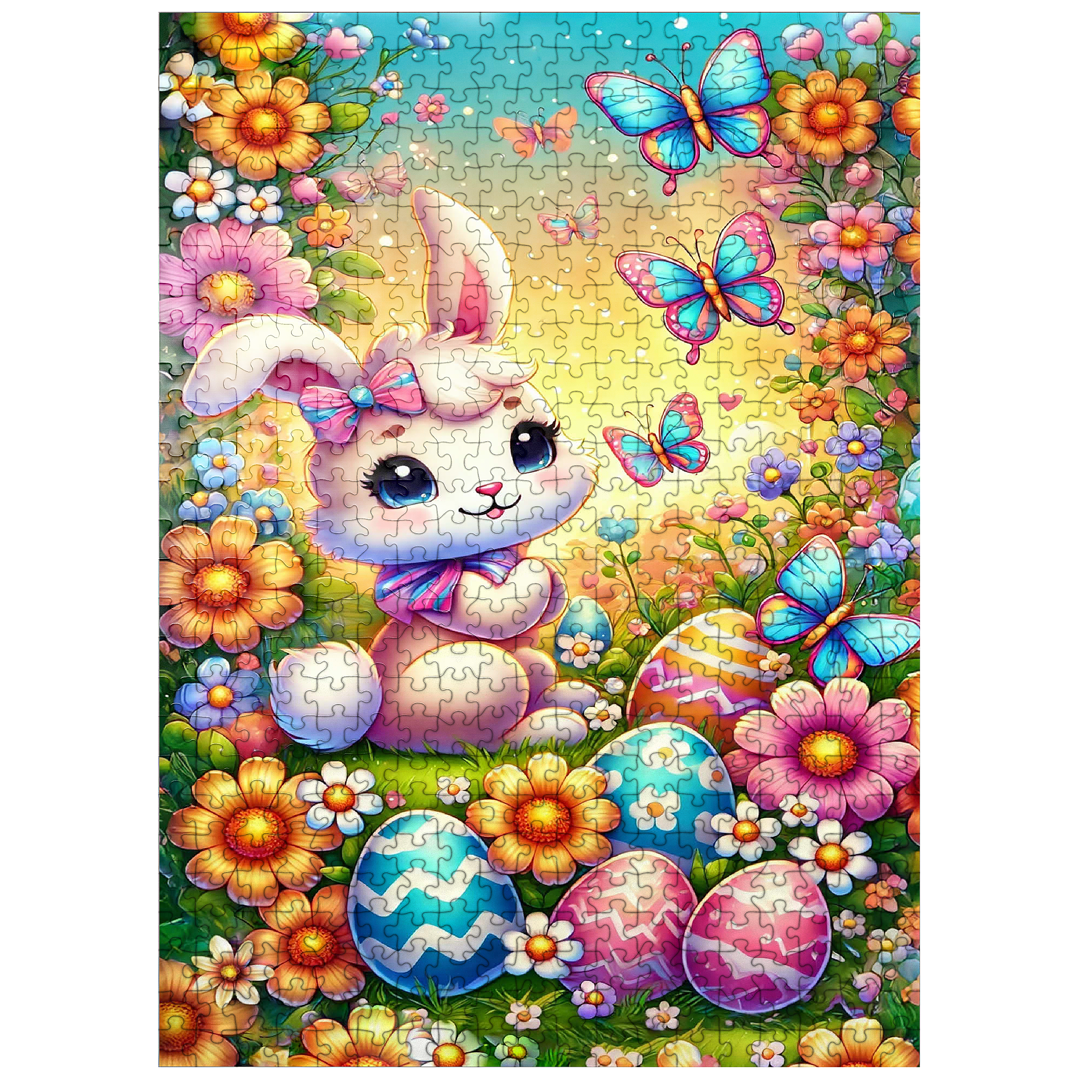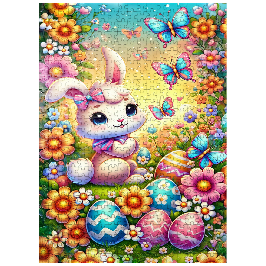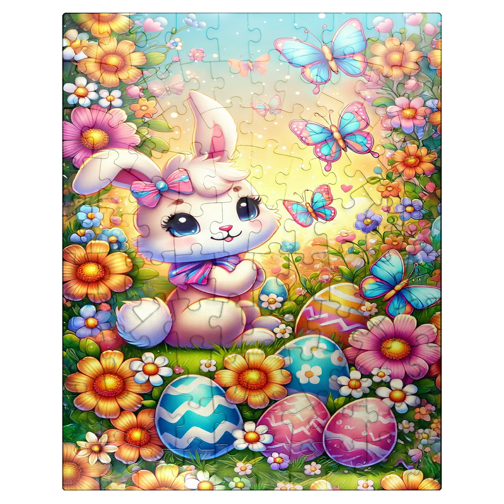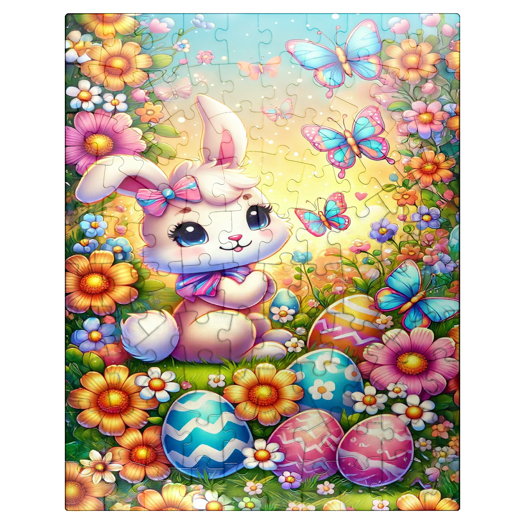A charming and vibrant scene featuring an adorable bunny with big blue eyes, surrounded by decorated Easter eggs and blooming spring flowers. Brightly colored butterflies flutter through the air, adding a whimsical touch to the joyful setting. The pastel hues and cheerful atmosphere capture the essence of Easter and springtime celebrations, making this a delightful visual for children and festive occasions.