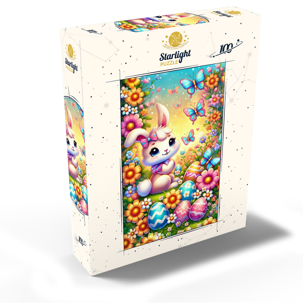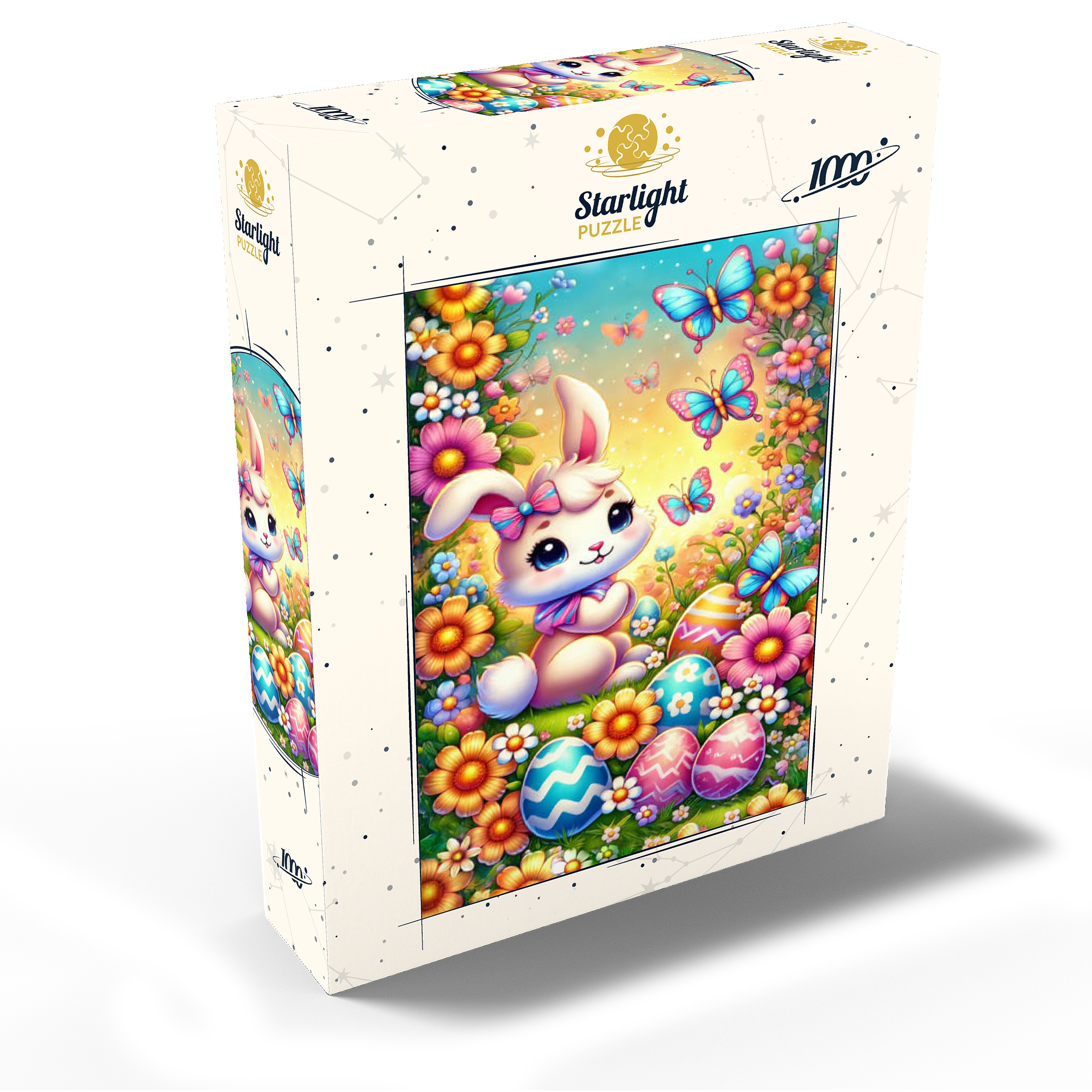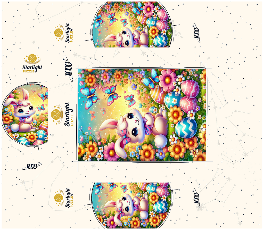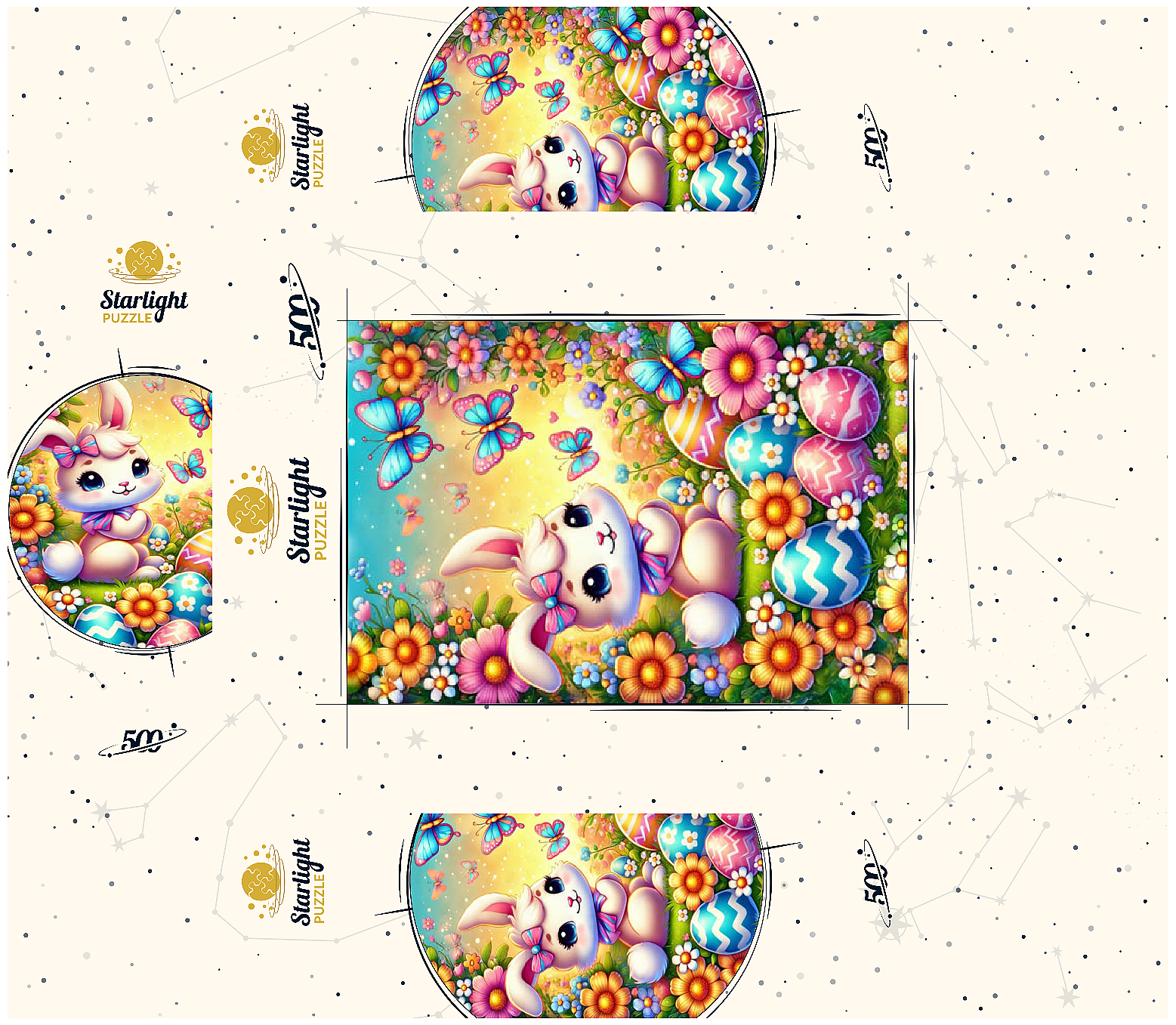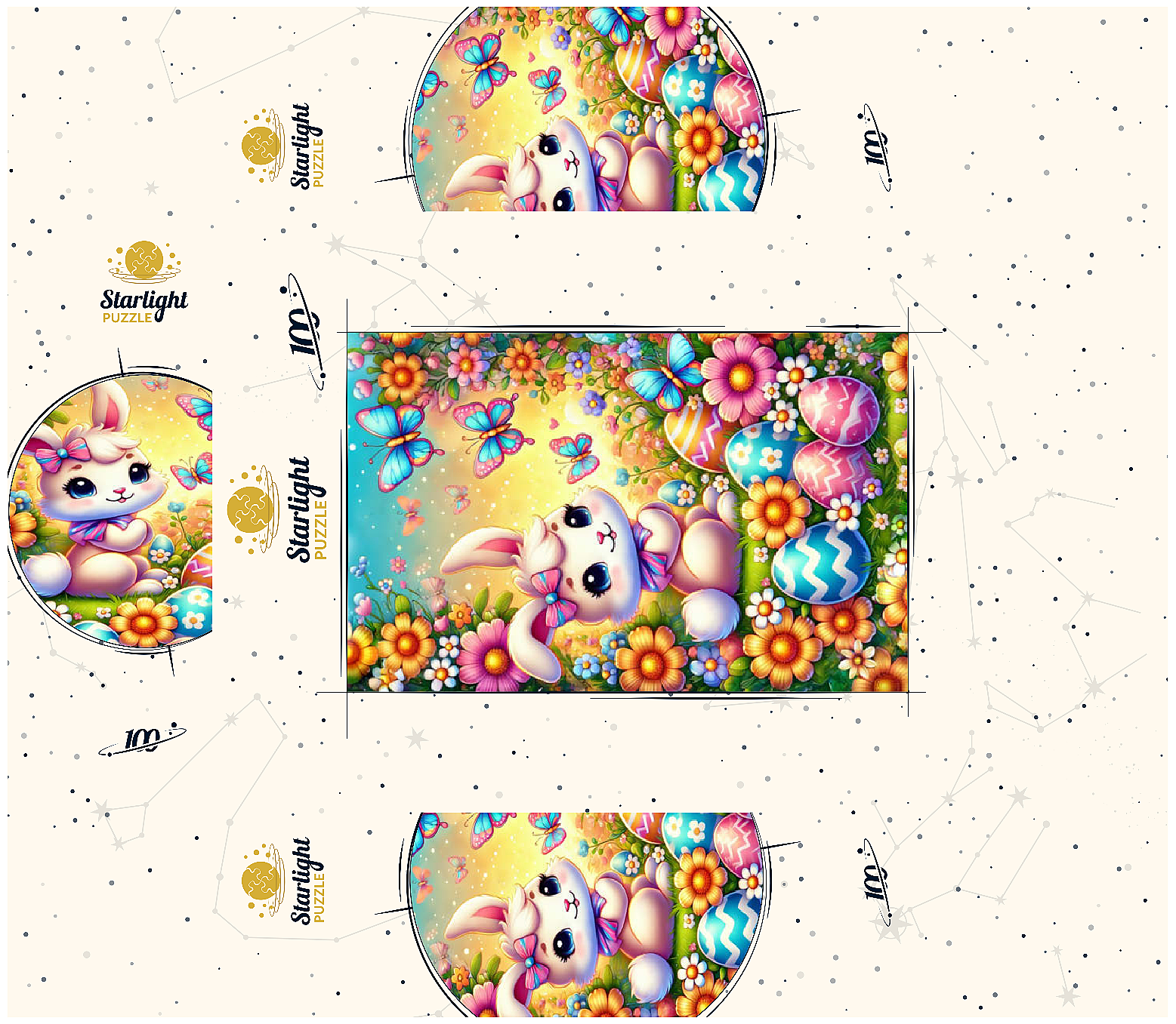 A charming and vibrant scene featuring an adorable bunny with big blue eyes, surrounded by decorated Easter eggs and blooming spring flowers. Brightly colored butterflies flutter through the air, adding a whimsical touch to the joyful setting. The pastel hues and cheerful atmosphere capture the essence of Easter and springtime celebrations, making this a delightful visual for children and festive occasions.