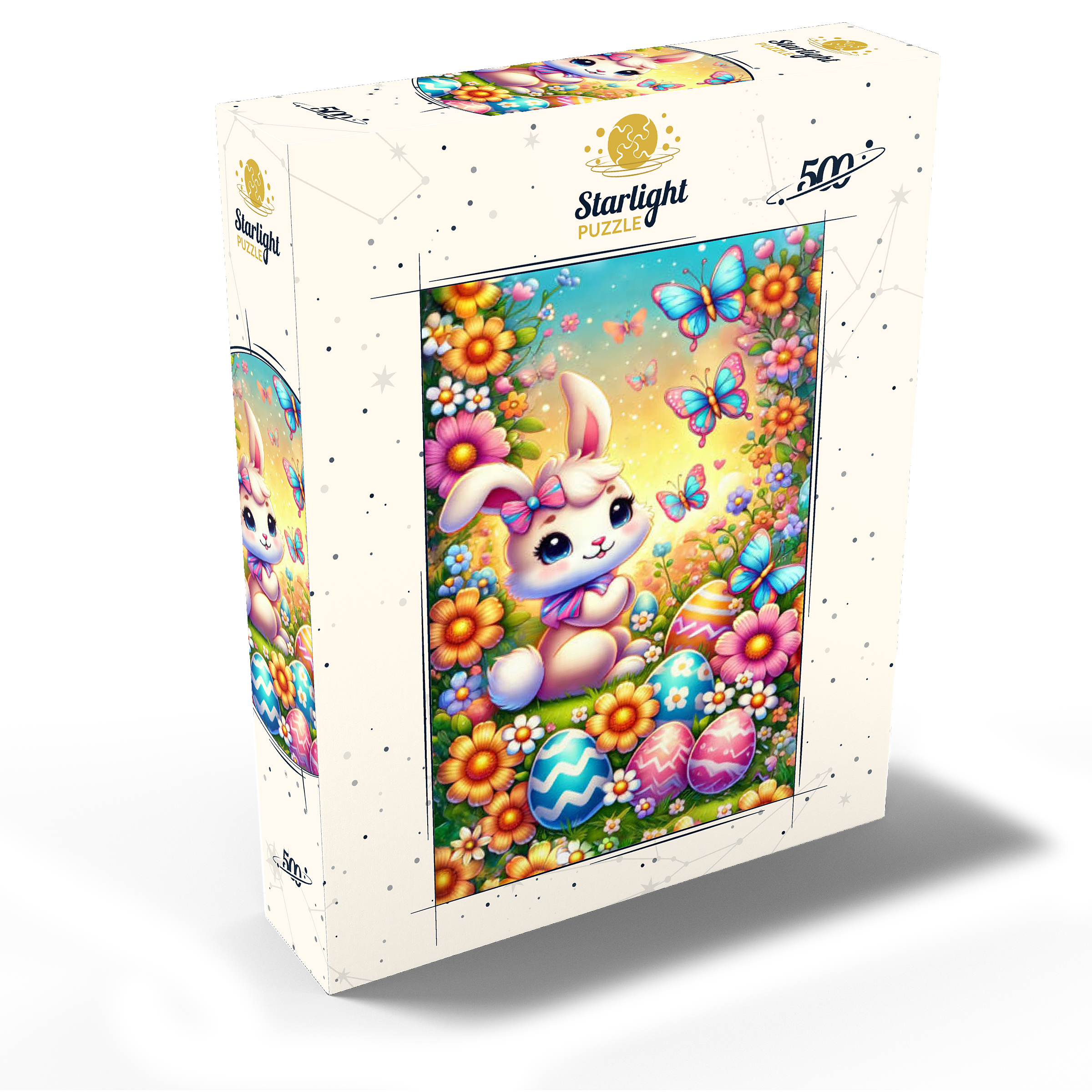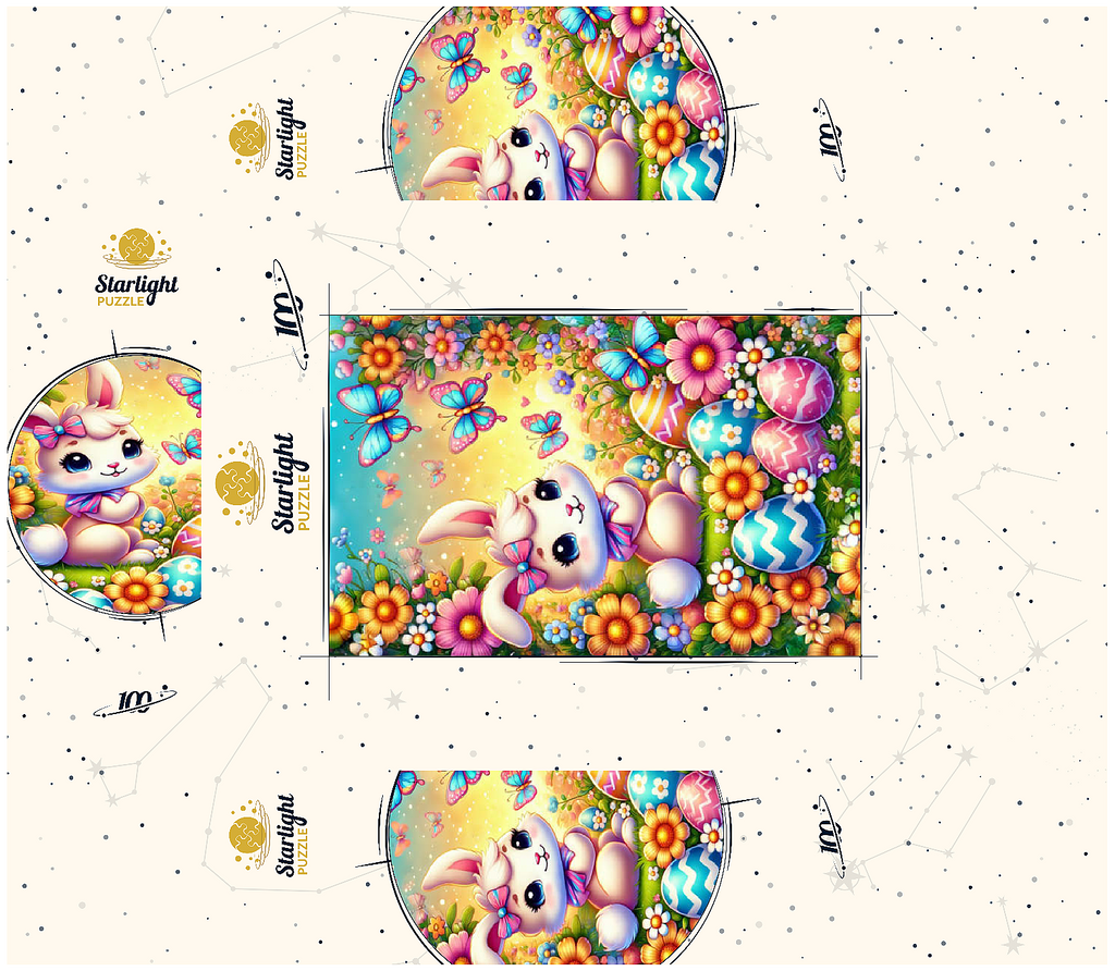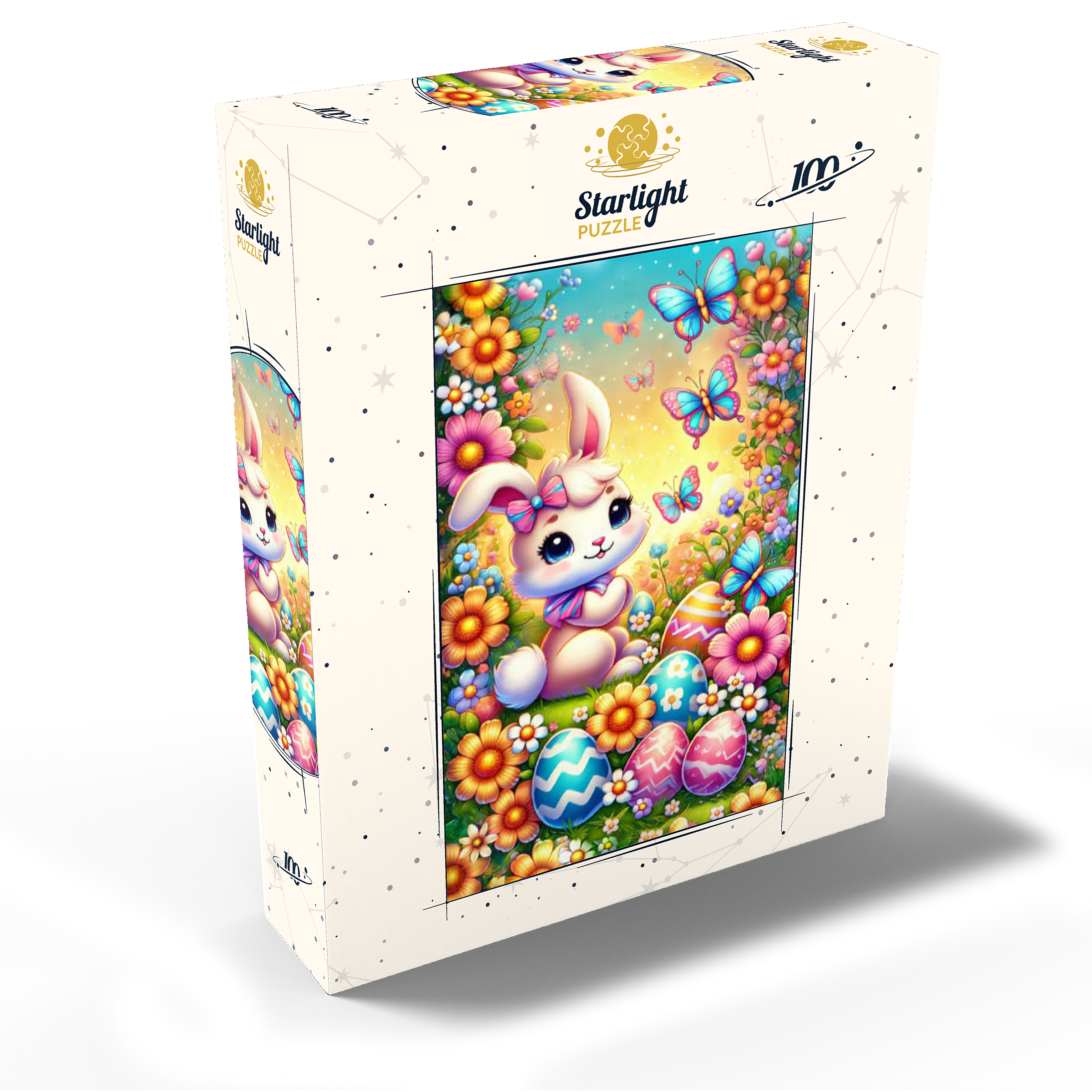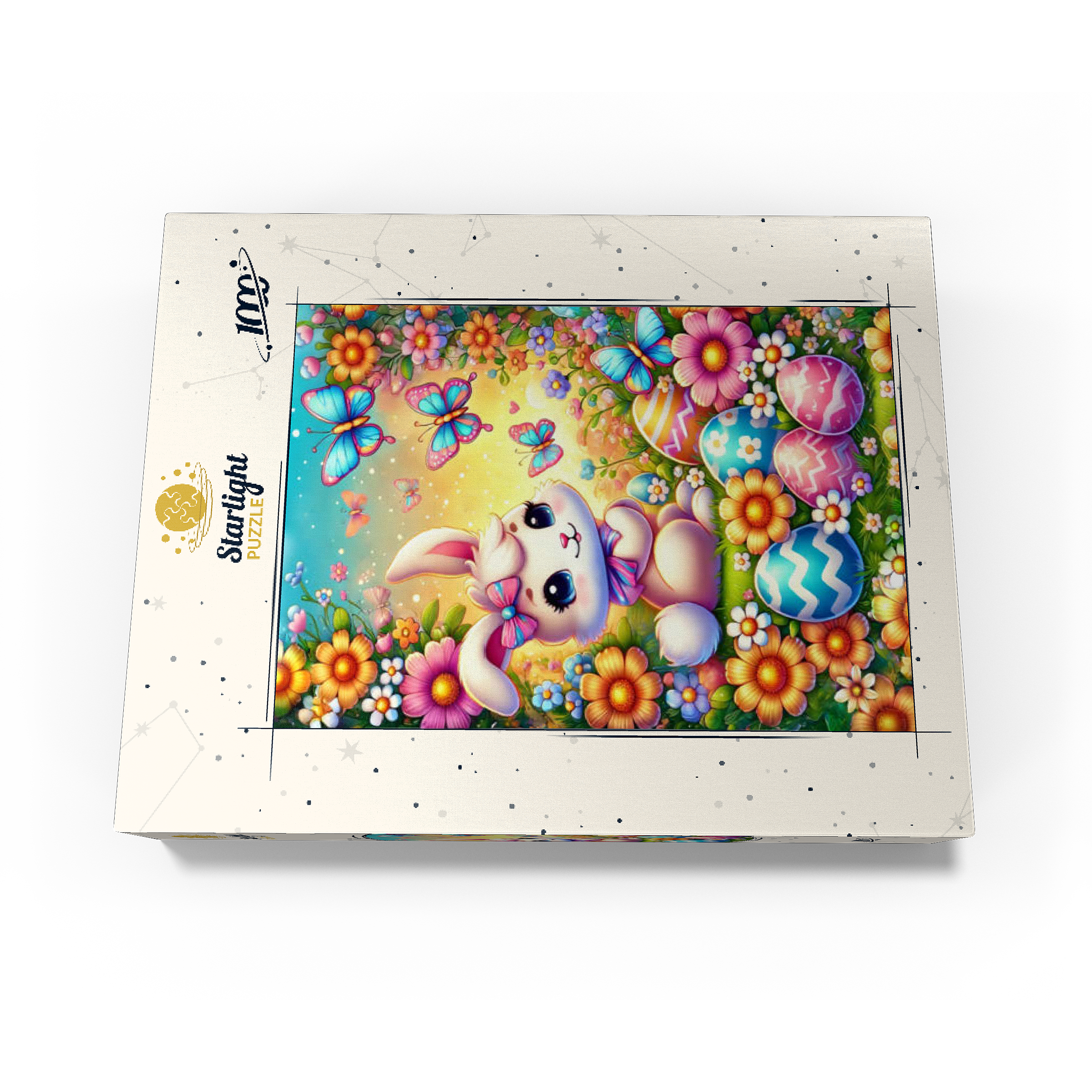 A charming and vibrant scene featuring an adorable bunny with big blue eyes, surrounded by decorated Easter eggs and blooming spring flowers. Brightly colored butterflies flutter through the air, adding a whimsical touch to the joyful setting. The pastel hues and cheerful atmosphere capture the essence of Easter and springtime celebrations, making this a delightful visual for children and festive occasions.