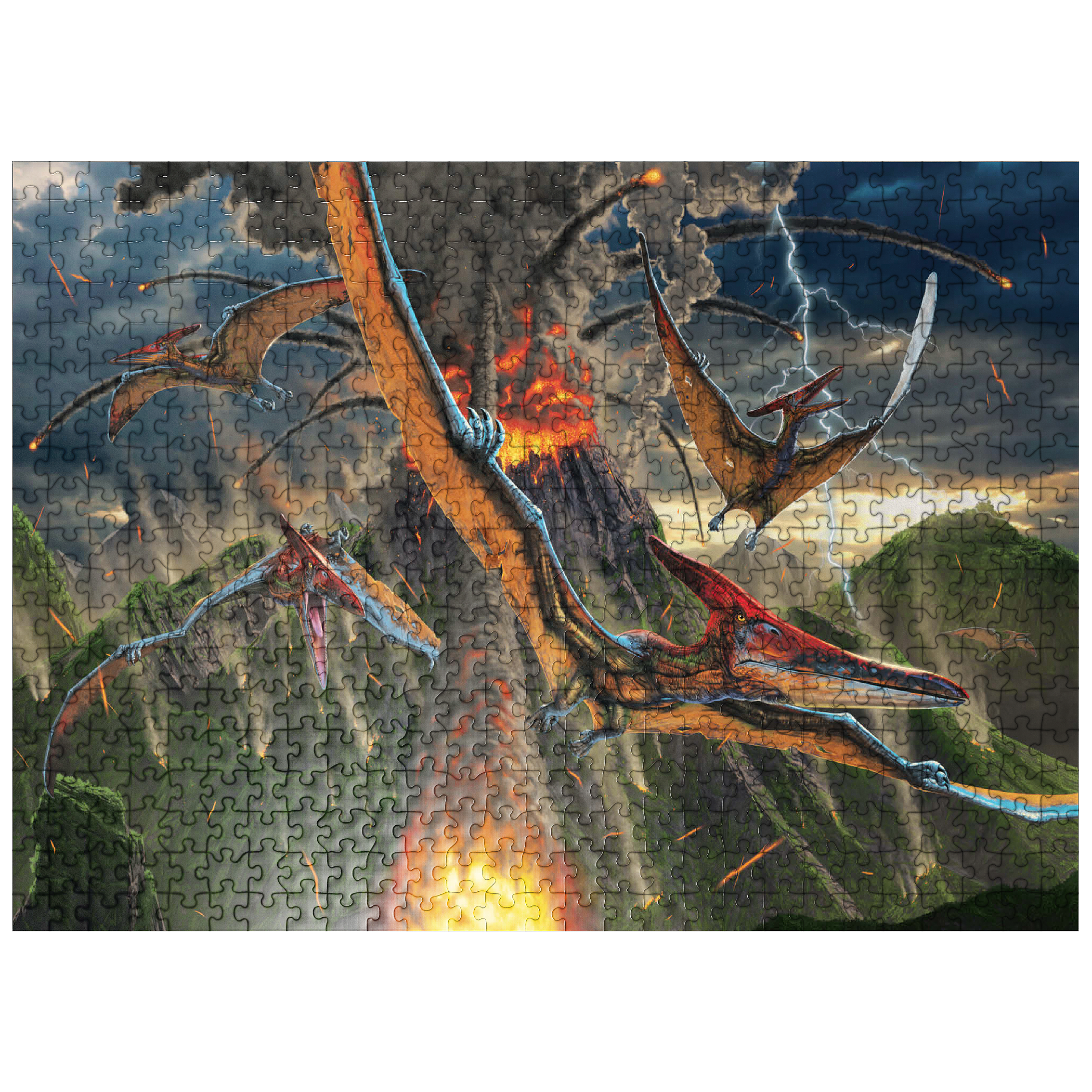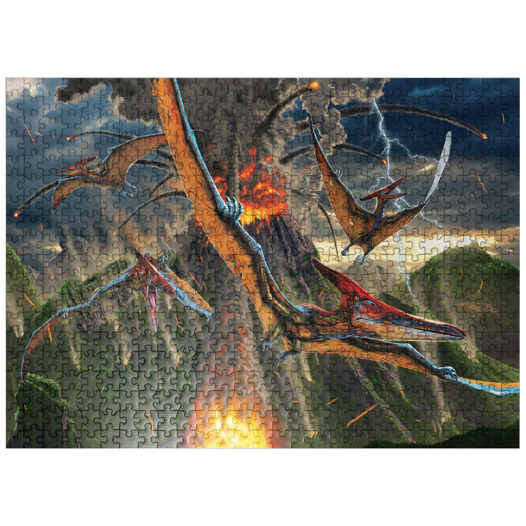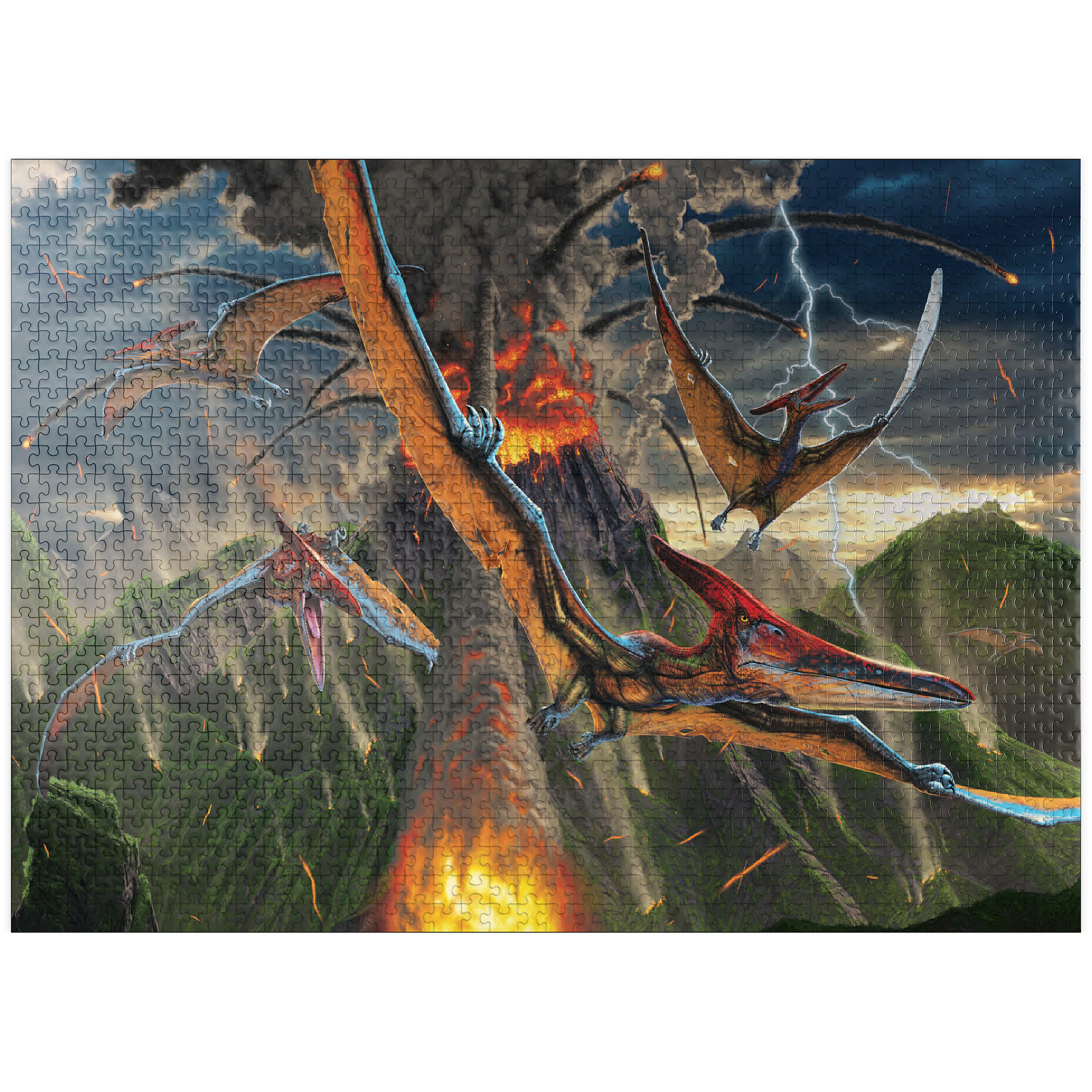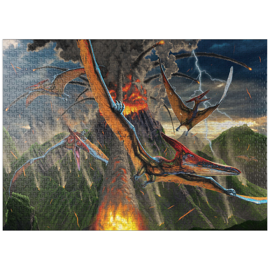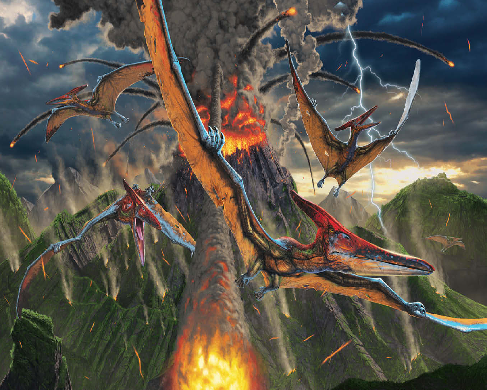 The artwork depicts a dramatic scene of several Pteranodon flying amidst a volcanic eruption. A large, active volcano spews lava and ash into the stormy sky, while fiery projectiles rain down on a lush, mountainous landscape. The Pteranodons, painted with realistic detail and vibrant colors, appear to be fleeing the catastrophic event. The overall mood is one of chaos and impending doom.