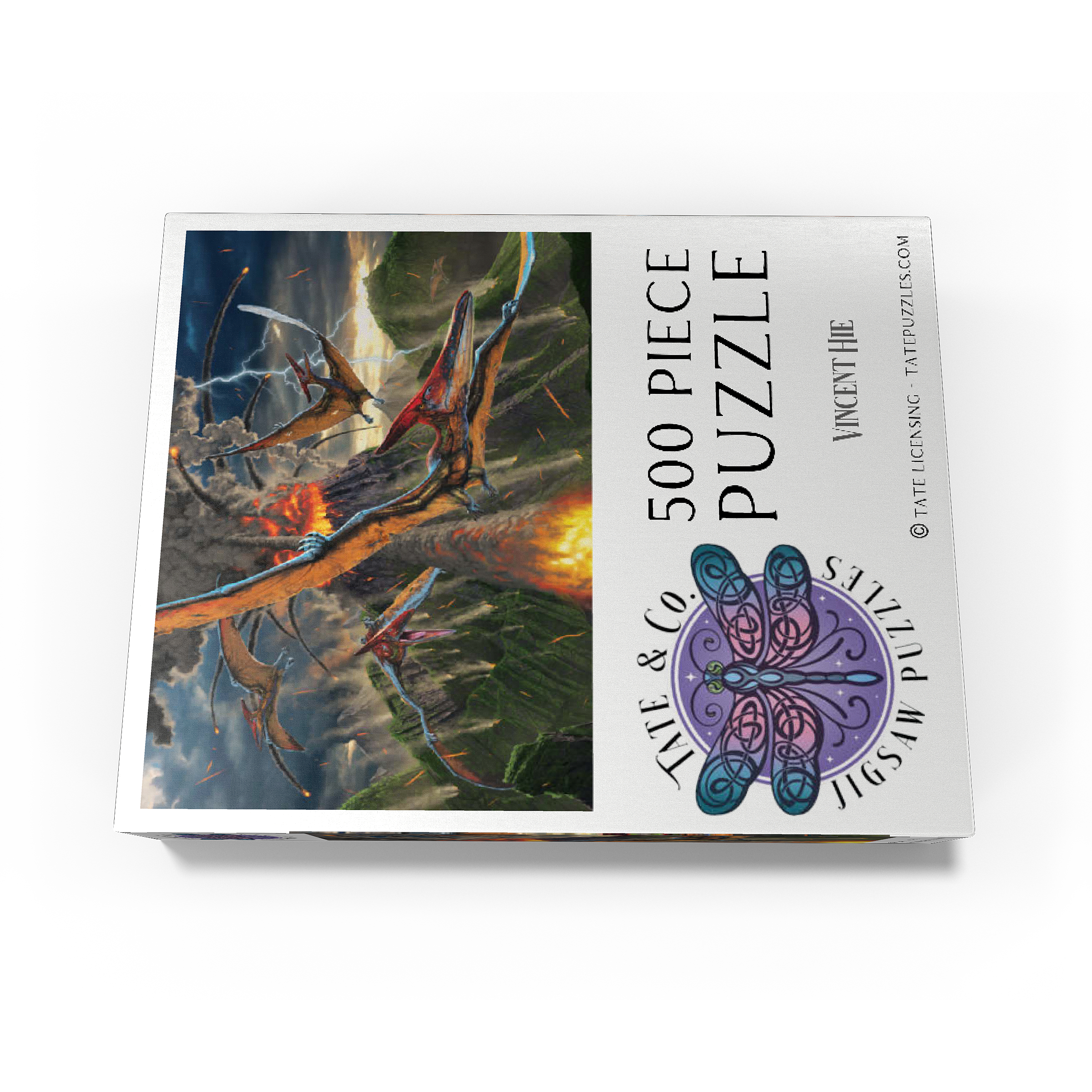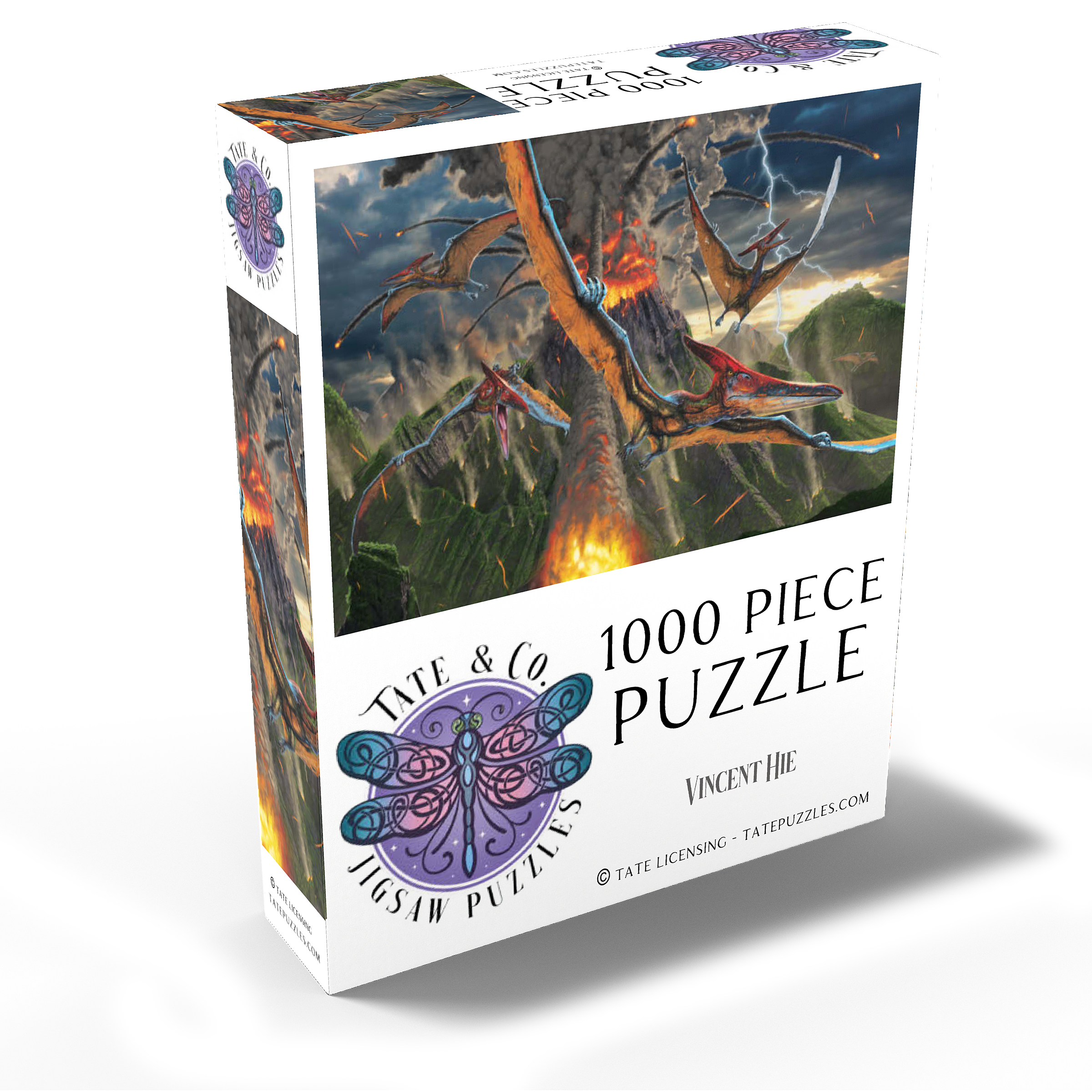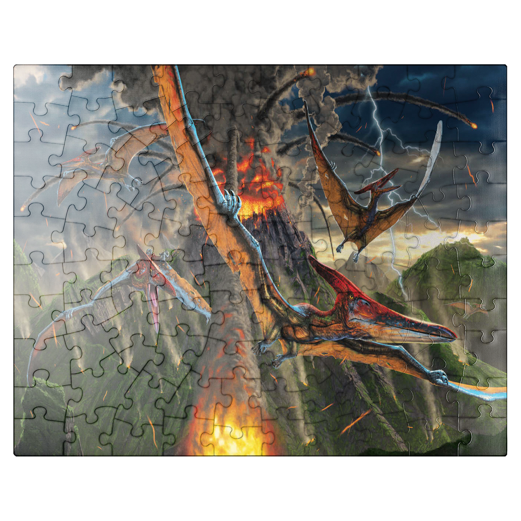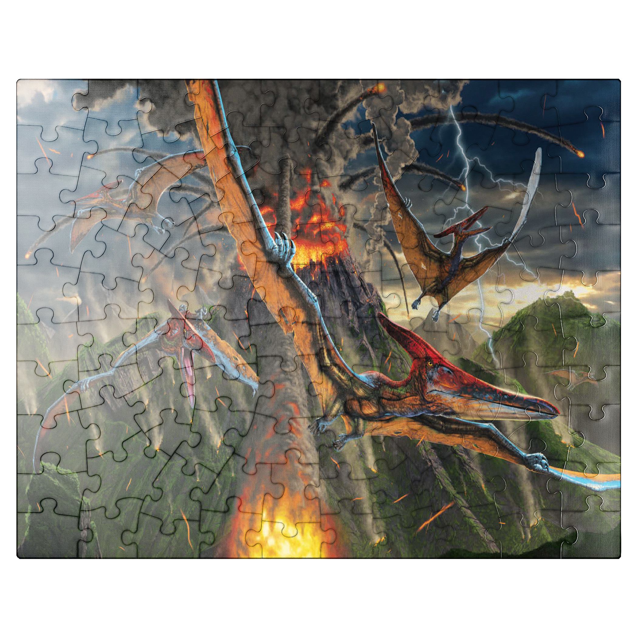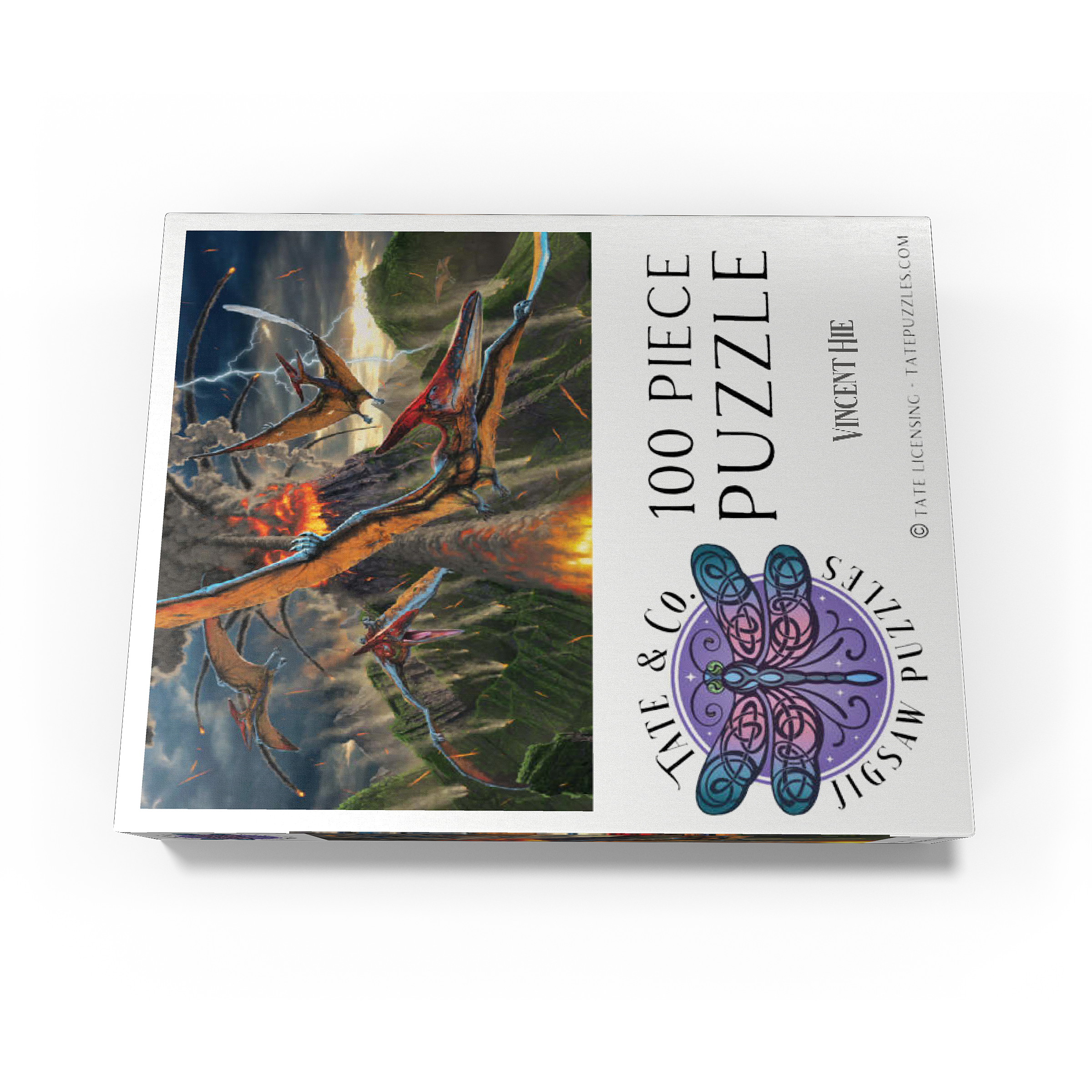 The artwork depicts a dramatic scene of several Pteranodon flying amidst a volcanic eruption. A large, active volcano spews lava and ash into the stormy sky, while fiery projectiles rain down on a lush, mountainous landscape. The Pteranodons, painted with realistic detail and vibrant colors, appear to be fleeing the catastrophic event. The overall mood is one of chaos and impending doom.