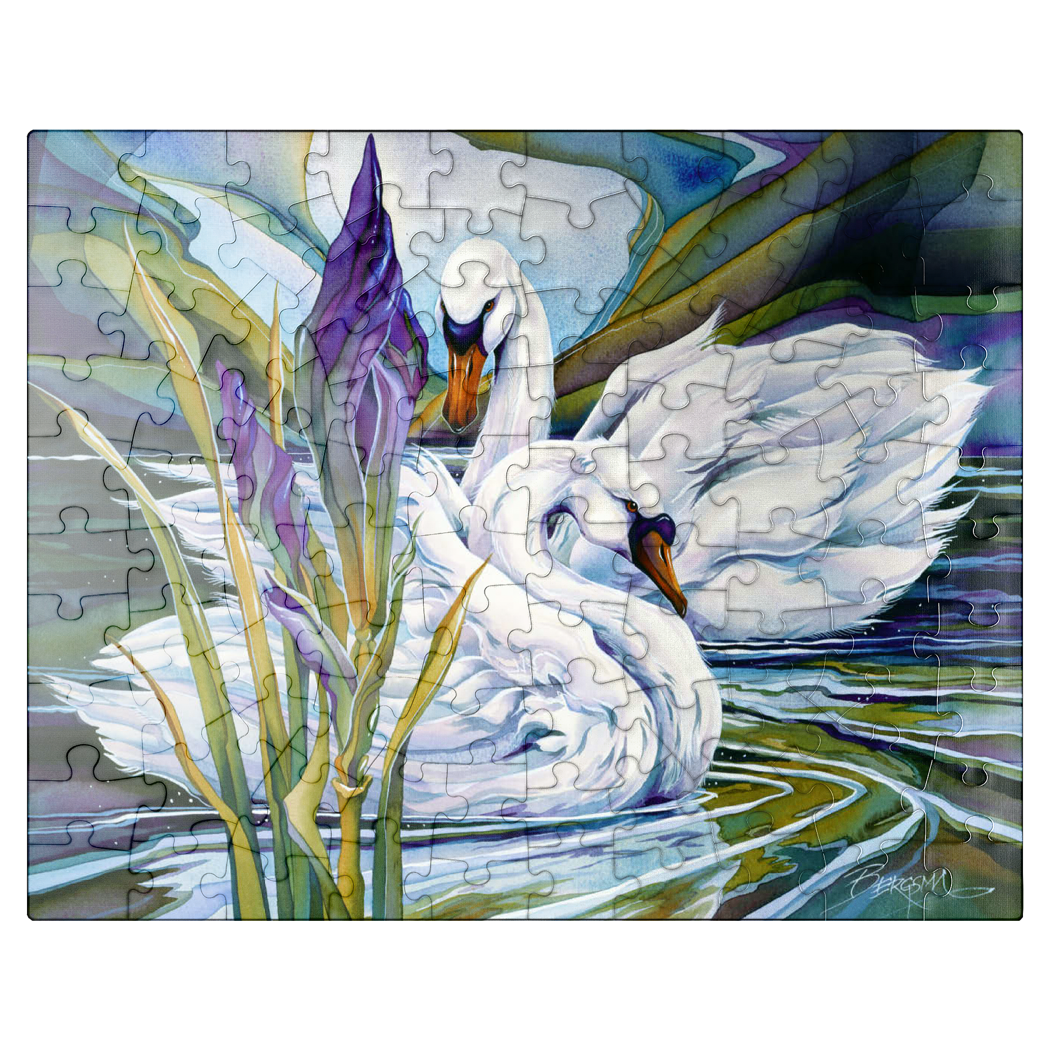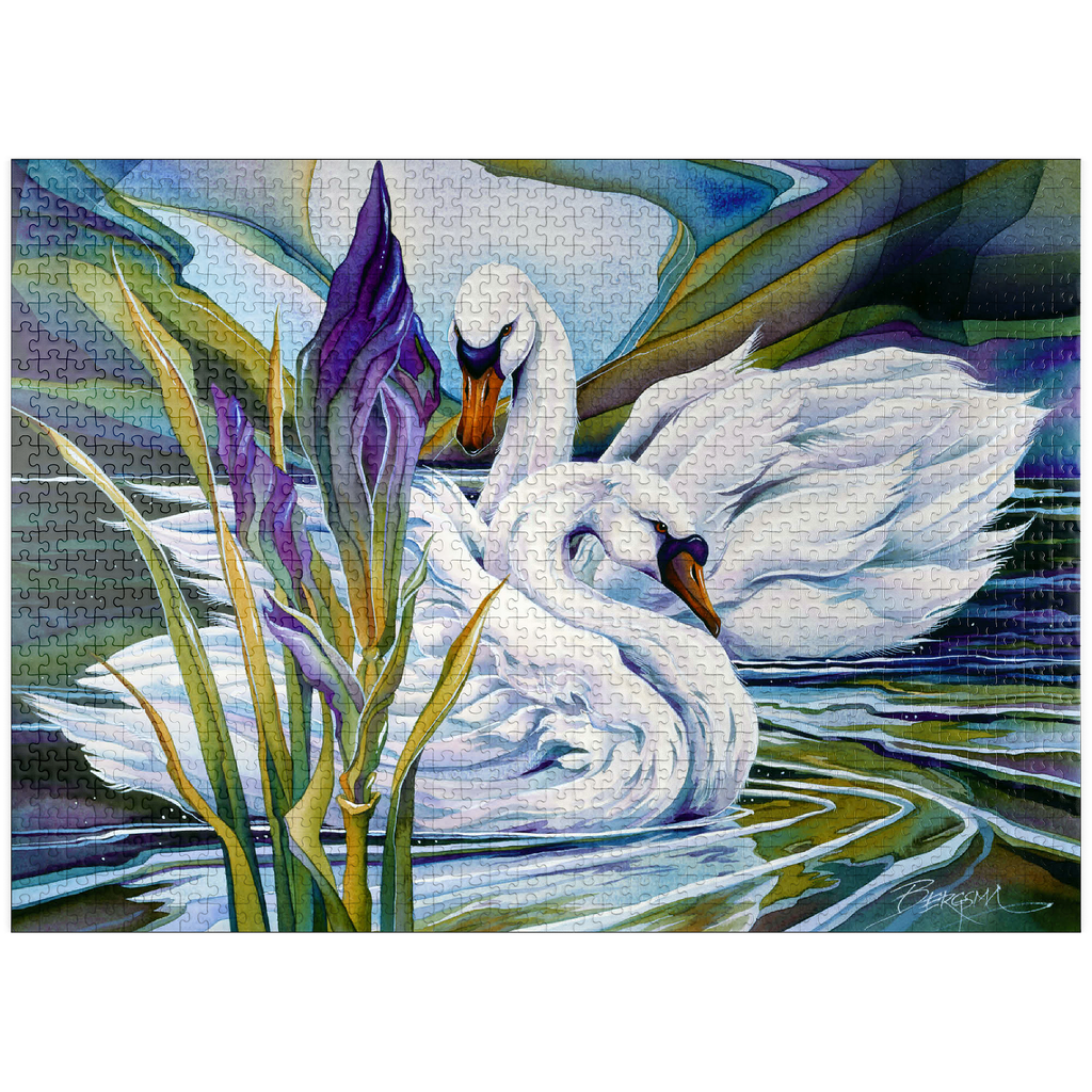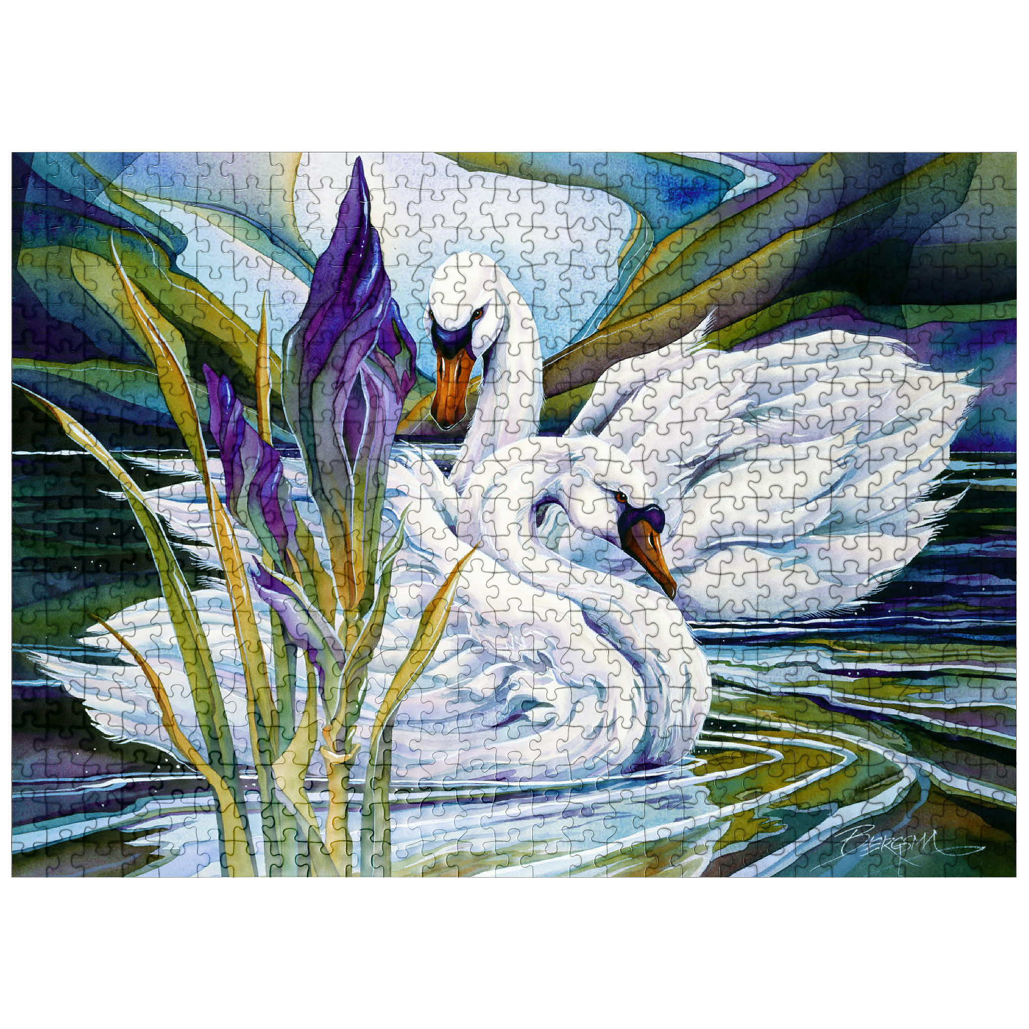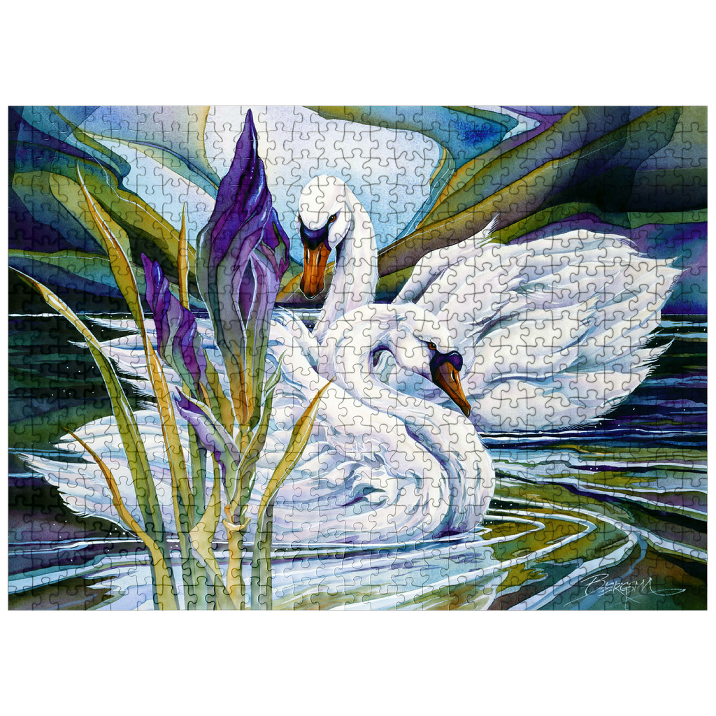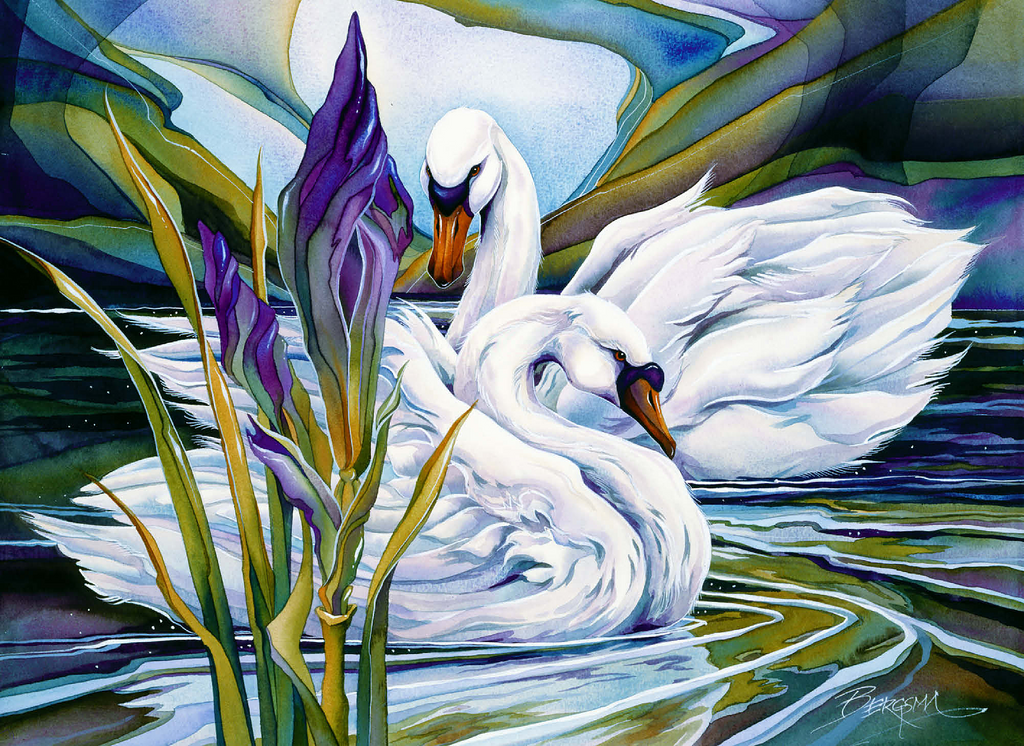 This stunning watercolor artwork captures the grace and beauty of two swans gliding together in a tranquil pond. Their pure white feathers are intricately detailed, contrasting beautifully with the vibrant hues of surrounding reeds and purple irises. The soft ripples in the water reflect shades of green, blue, and violet, creating a dreamlike ambiance. The flowing, abstract background adds a contemporary touch to this serene and elegant depiction of nature's harmony.