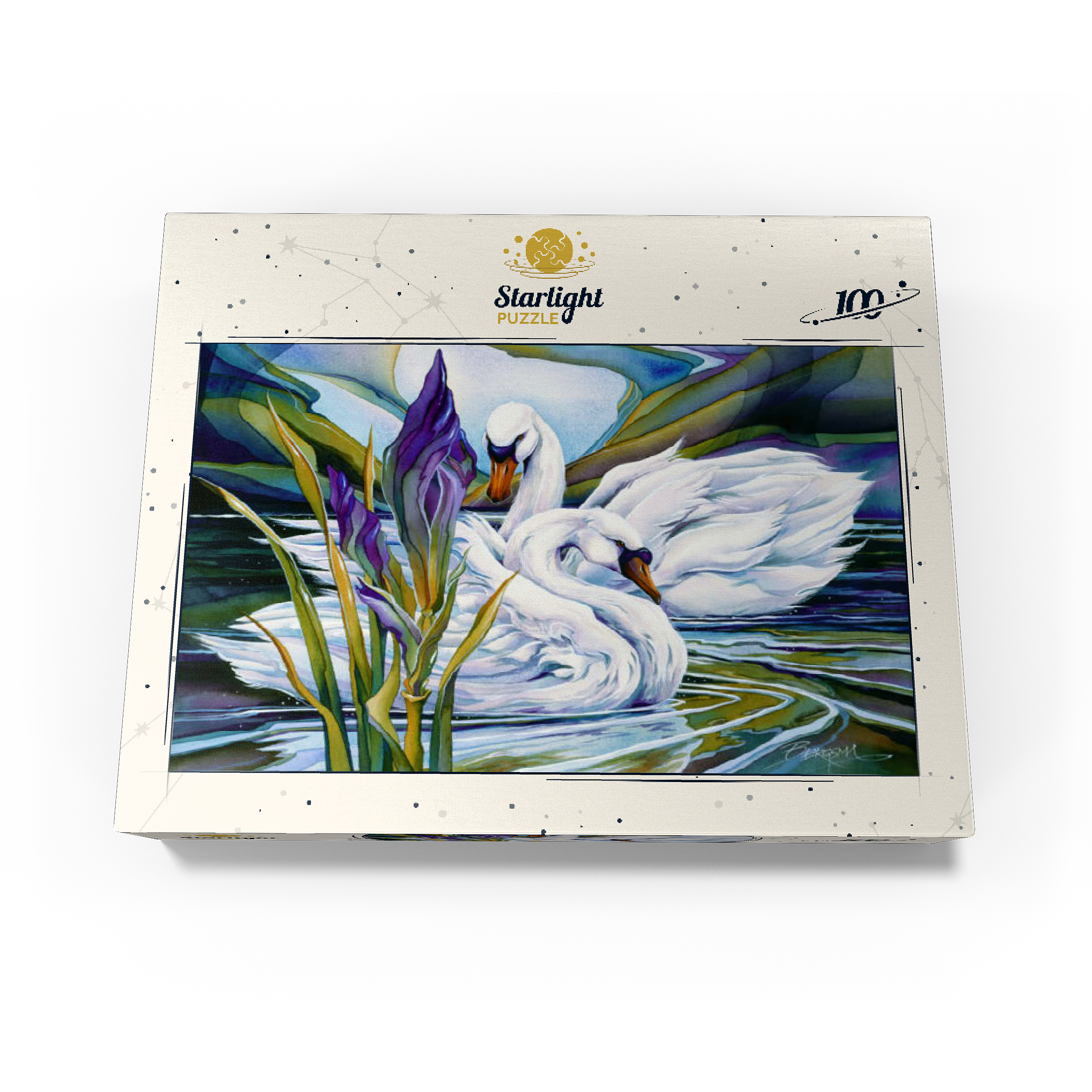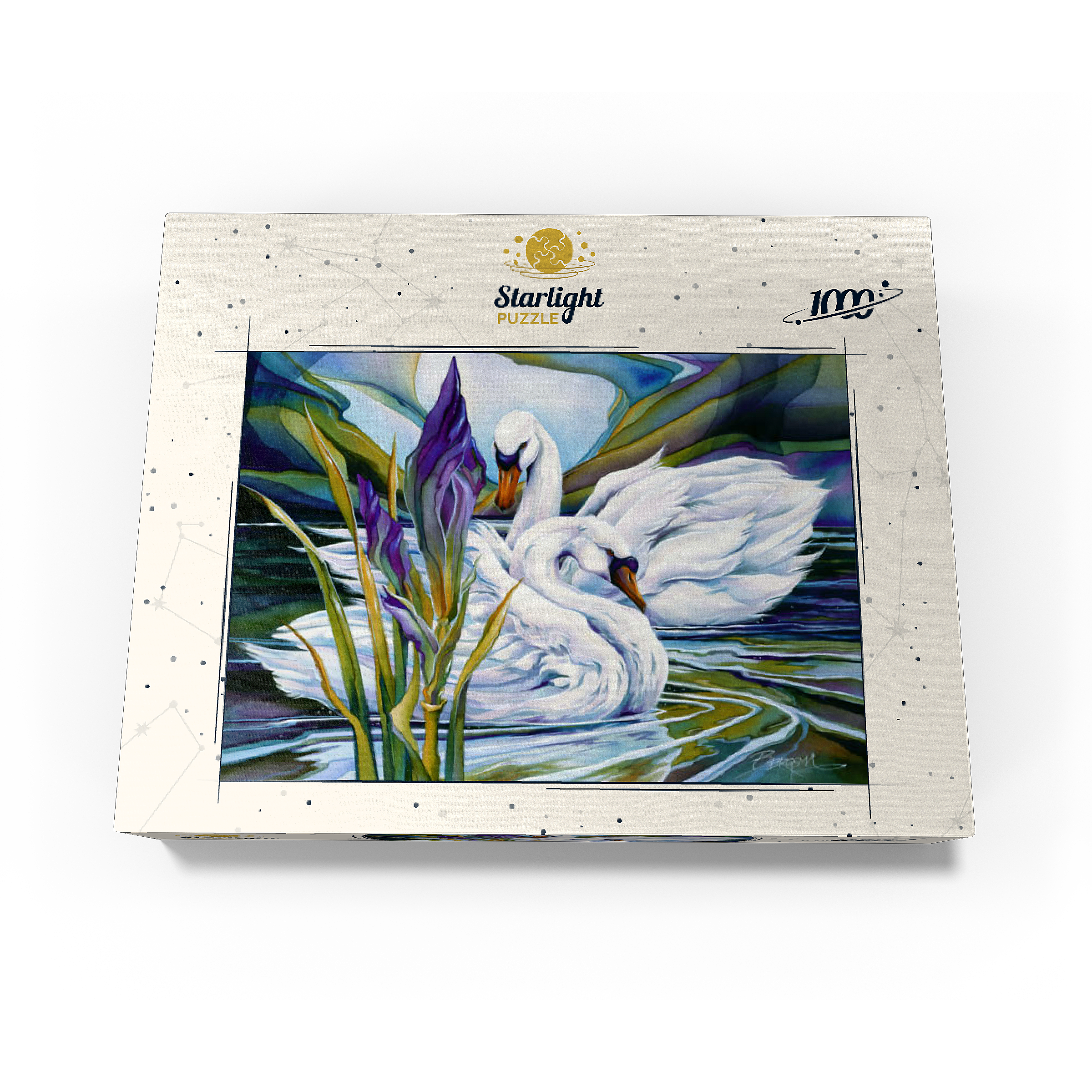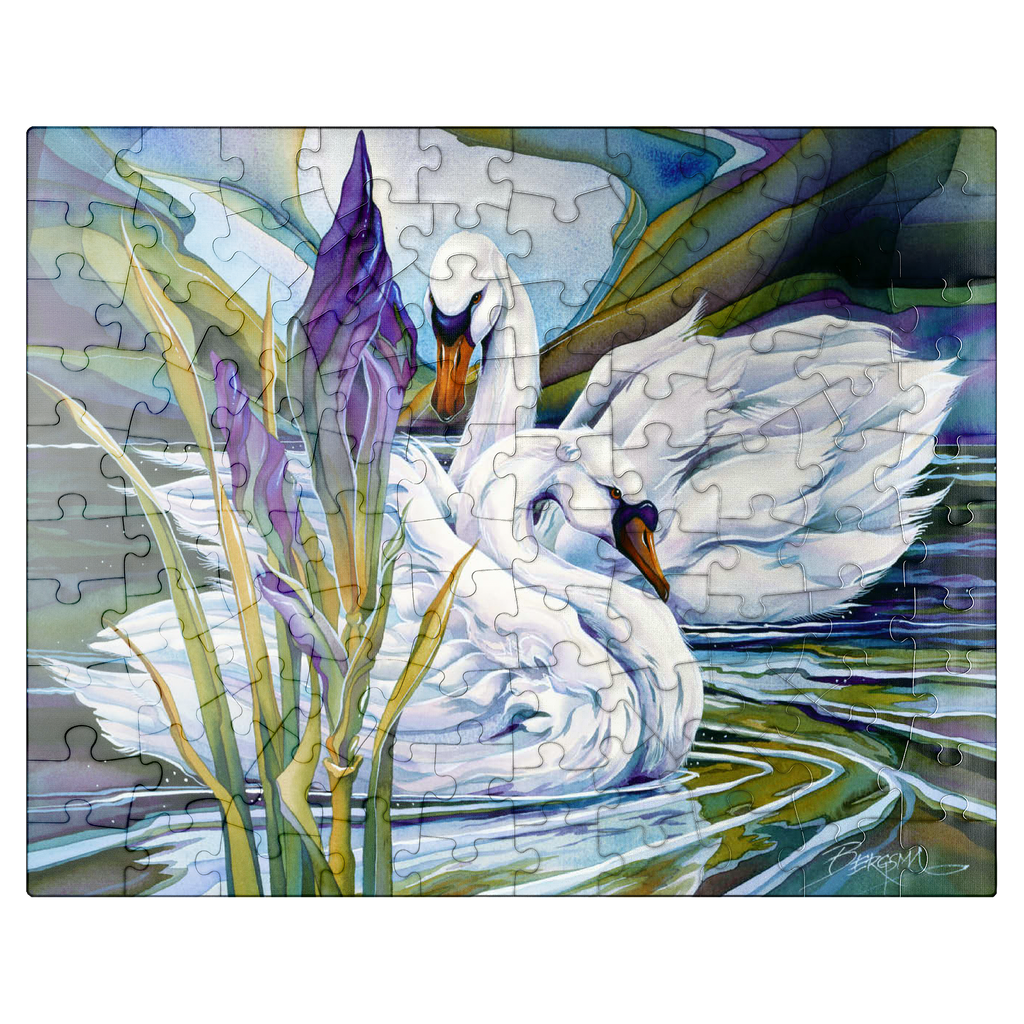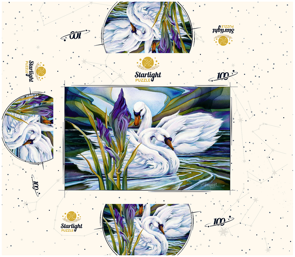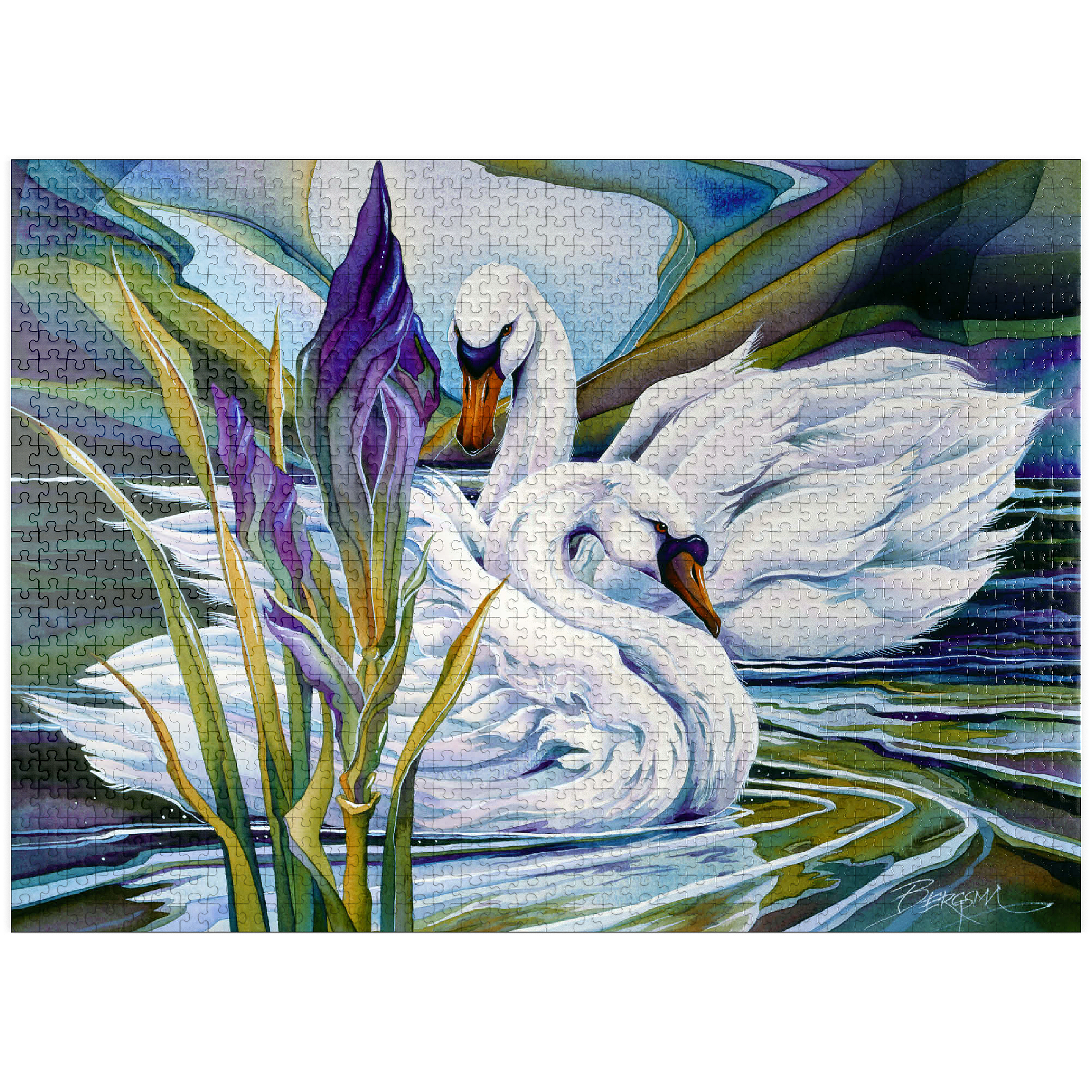 This stunning watercolor artwork captures the grace and beauty of two swans gliding together in a tranquil pond. Their pure white feathers are intricately detailed, contrasting beautifully with the vibrant hues of surrounding reeds and purple irises. The soft ripples in the water reflect shades of green, blue, and violet, creating a dreamlike ambiance. The flowing, abstract background adds a contemporary touch to this serene and elegant depiction of nature's harmony.
