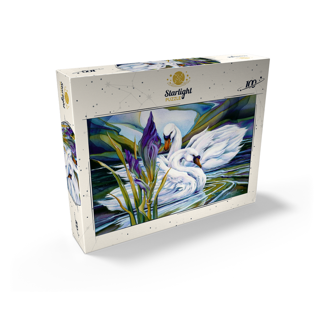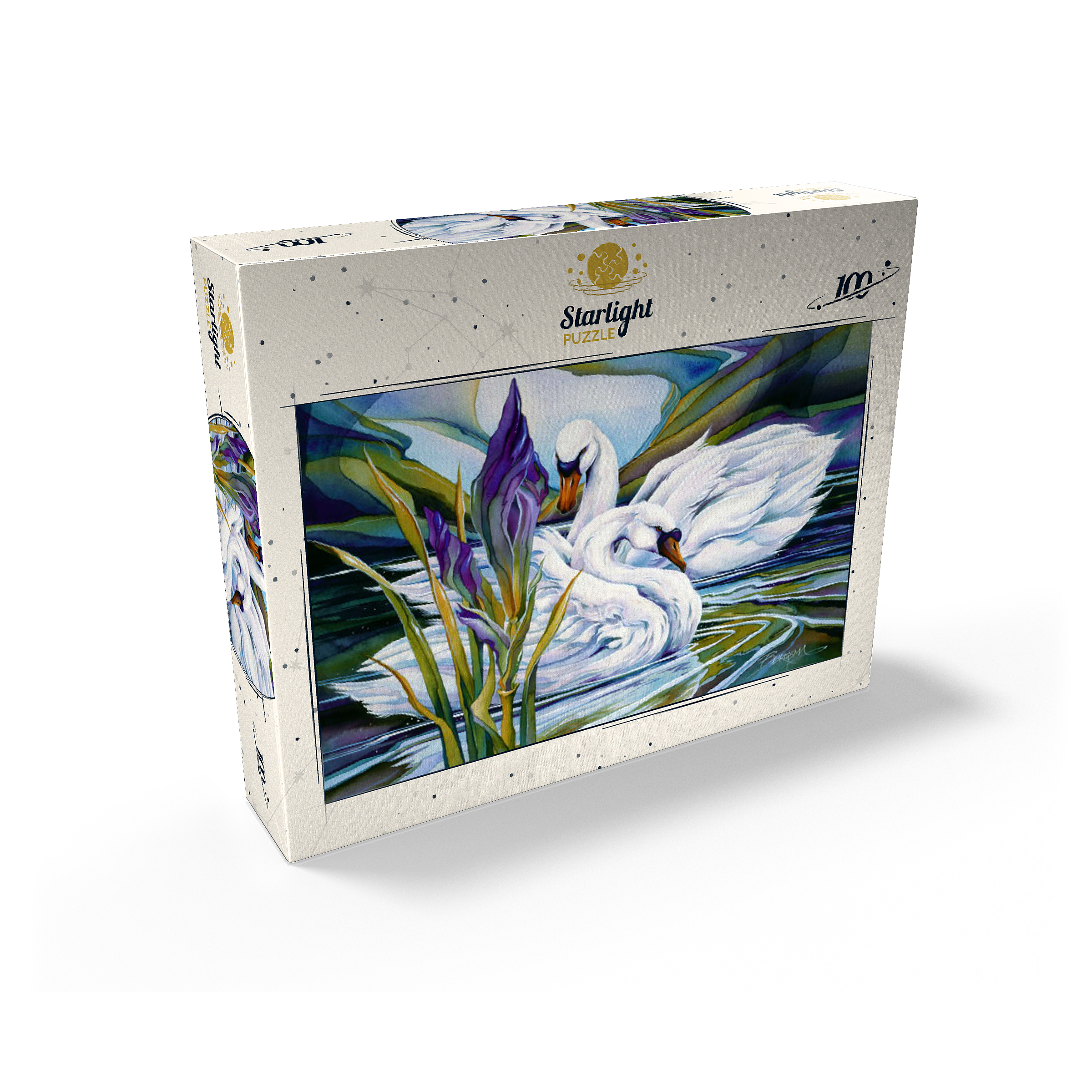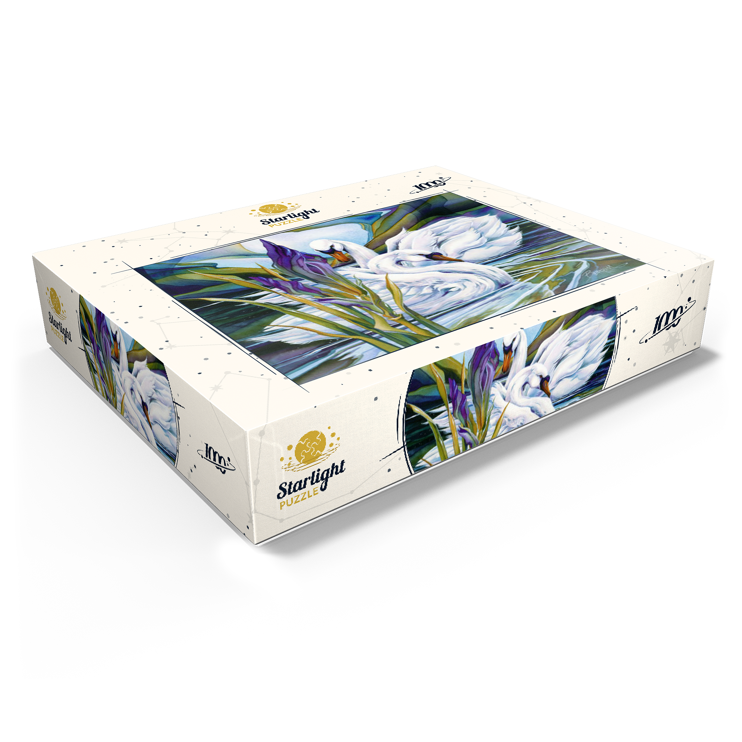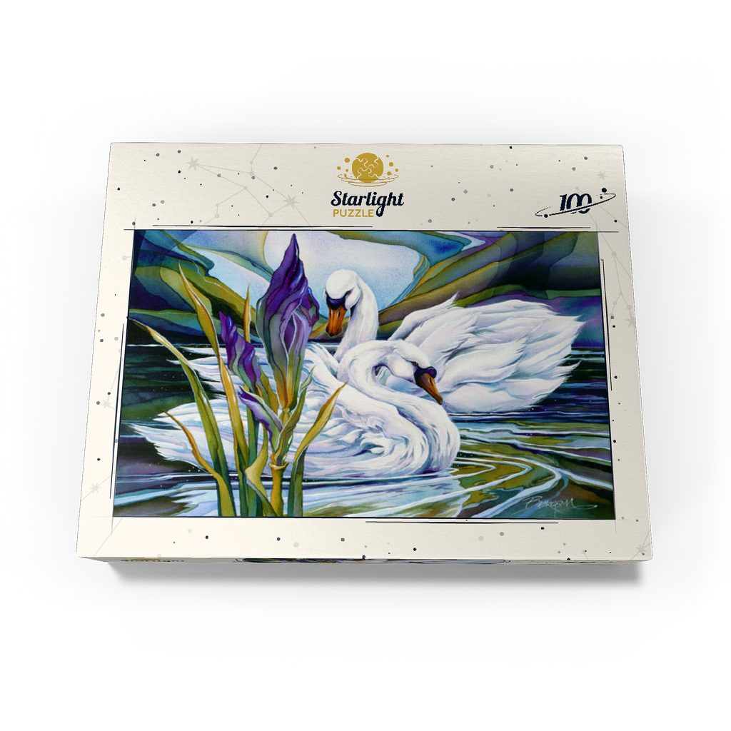 This stunning watercolor artwork captures the grace and beauty of two swans gliding together in a tranquil pond. Their pure white feathers are intricately detailed, contrasting beautifully with the vibrant hues of surrounding reeds and purple irises. The soft ripples in the water reflect shades of green, blue, and violet, creating a dreamlike ambiance. The flowing, abstract background adds a contemporary touch to this serene and elegant depiction of nature's harmony.