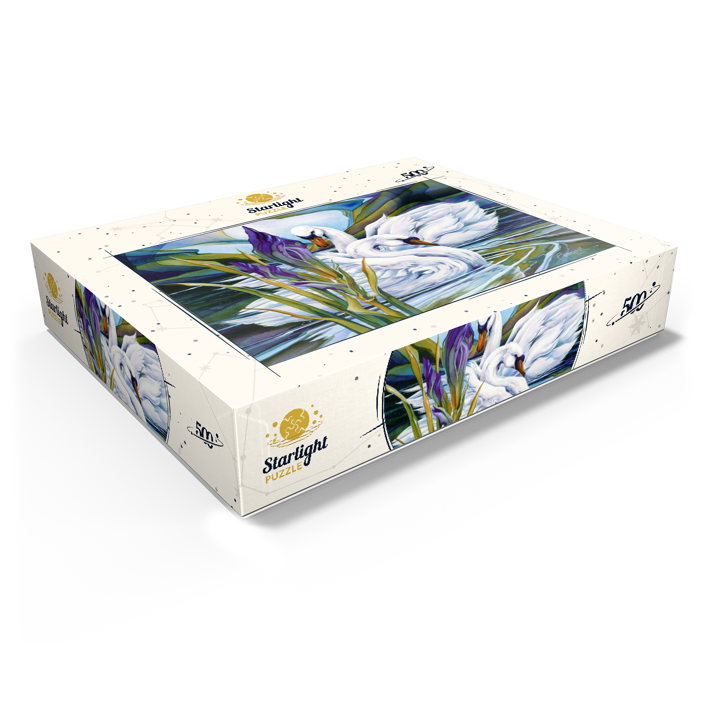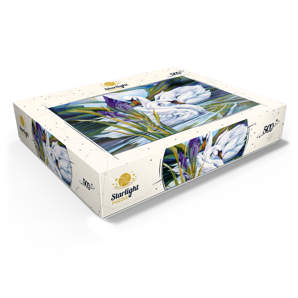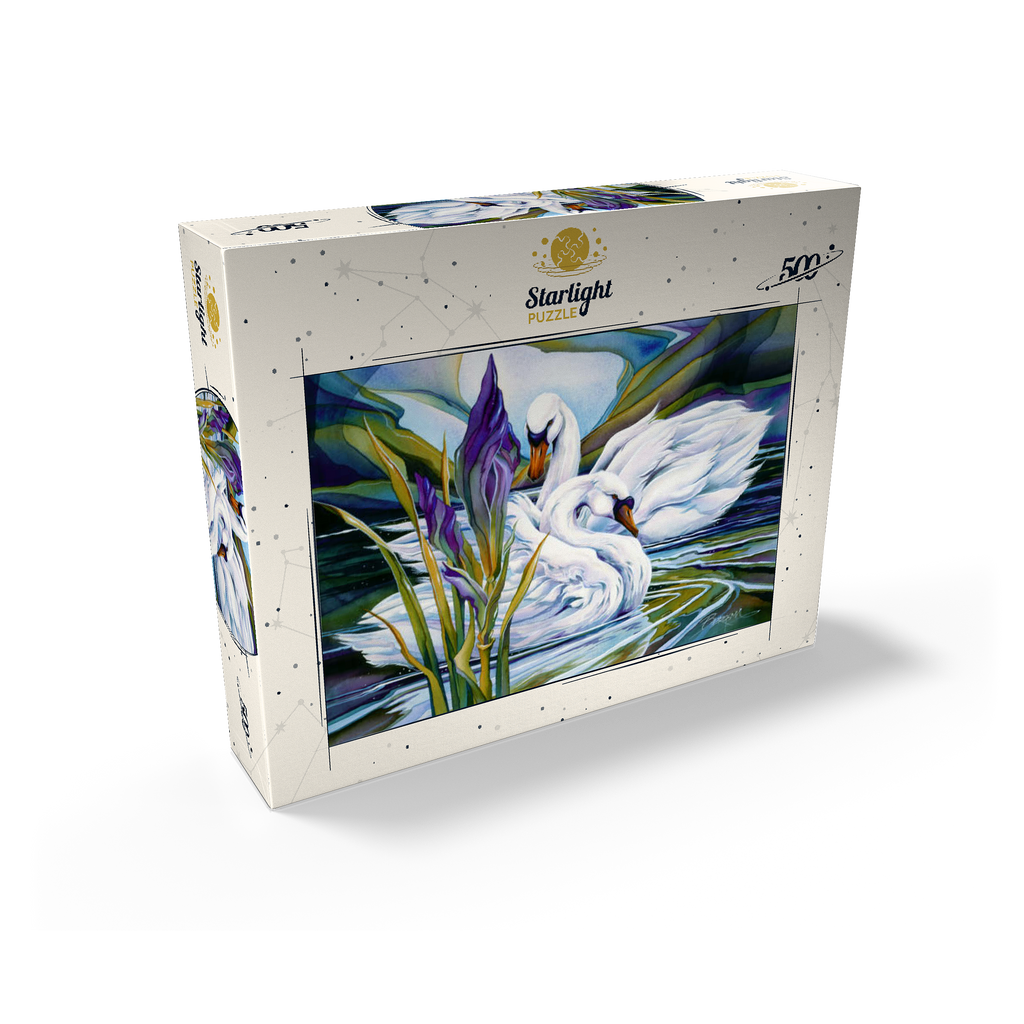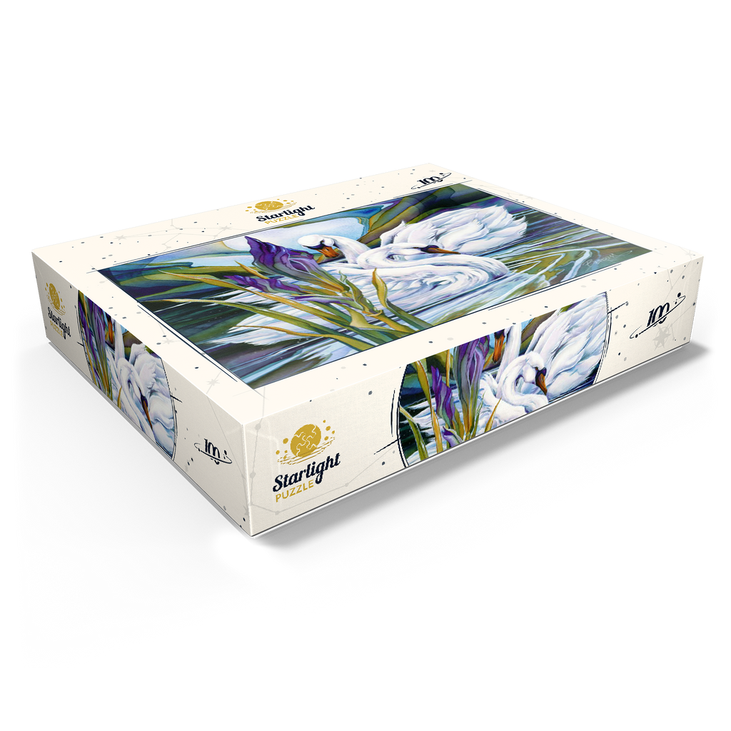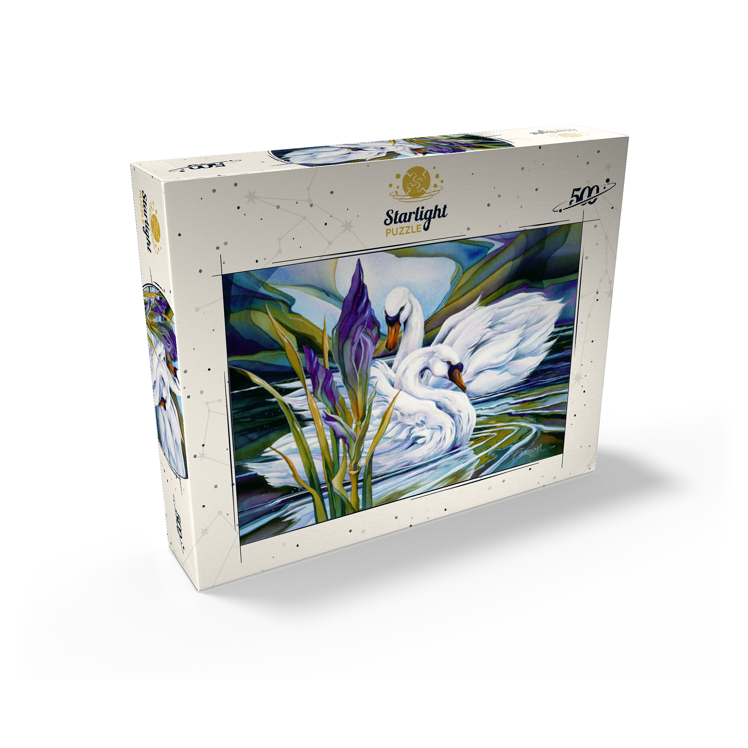 This stunning watercolor artwork captures the grace and beauty of two swans gliding together in a tranquil pond. Their pure white feathers are intricately detailed, contrasting beautifully with the vibrant hues of surrounding reeds and purple irises. The soft ripples in the water reflect shades of green, blue, and violet, creating a dreamlike ambiance. The flowing, abstract background adds a contemporary touch to this serene and elegant depiction of nature's harmony.