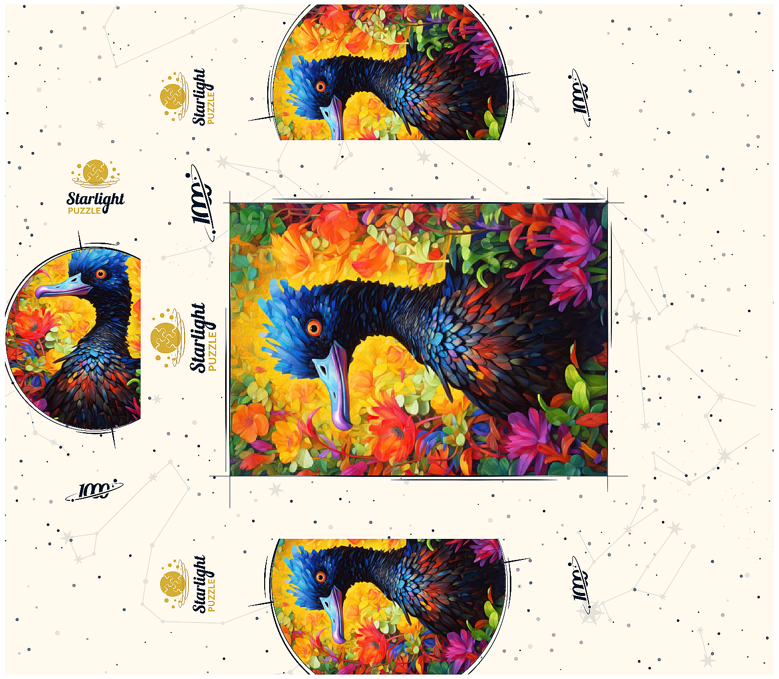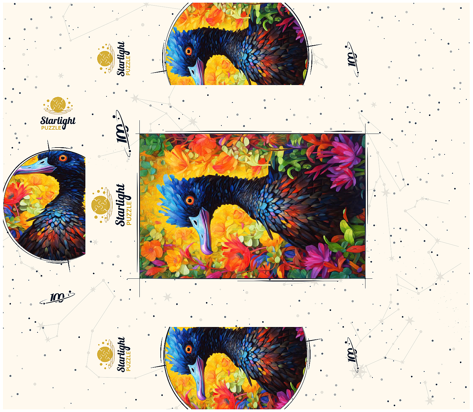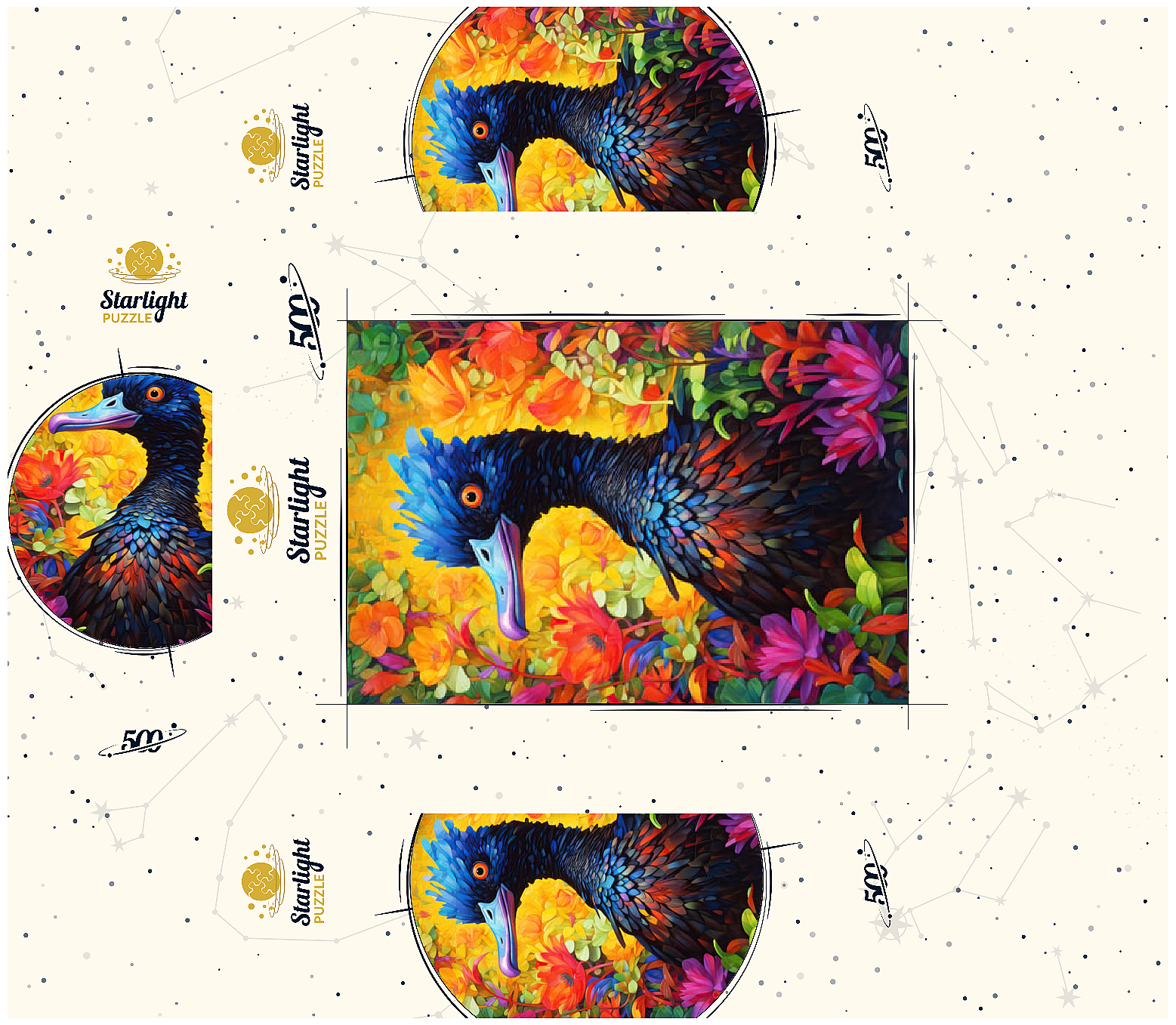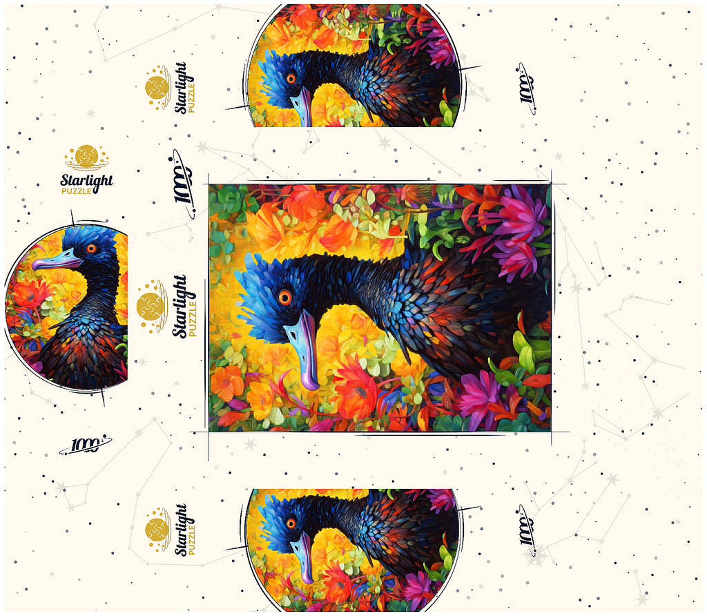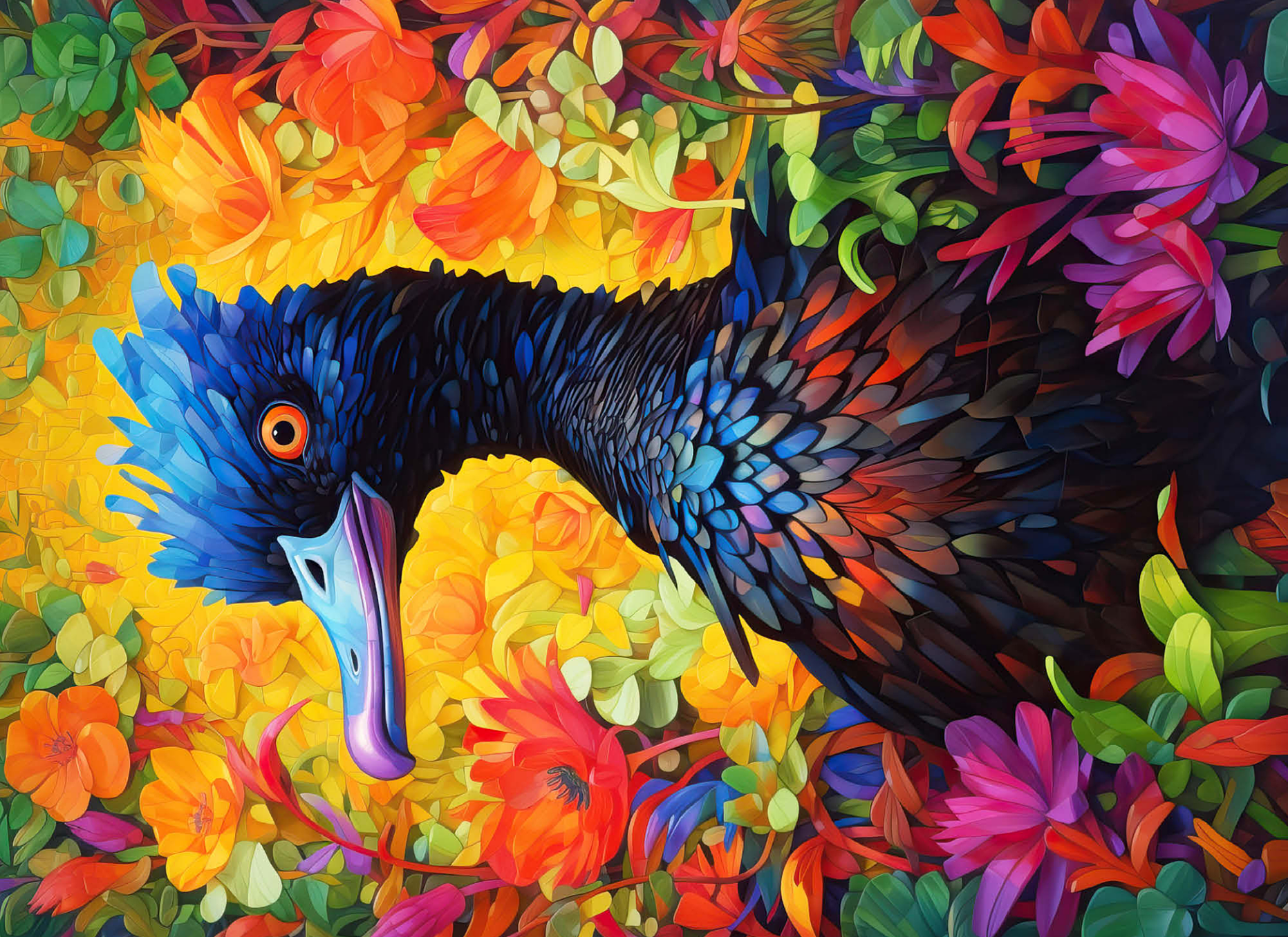A striking digital artwork of a majestic blue bird surrounded by a lush array of colorful flowers in vivid hues of orange, red, and purple. The bird's shimmering feathers display an intricate blend of deep blues and blacks, creating a mesmerizing contrast against the golden floral backdrop. The detailed textures and glowing light effects bring an enchanting, dreamlike quality to this fantasy-inspired composition. Perfect for nature lovers, bird enthusiasts, and collectors of vibrant wildlife art, this piece adds a bold and artistic touch to any space.