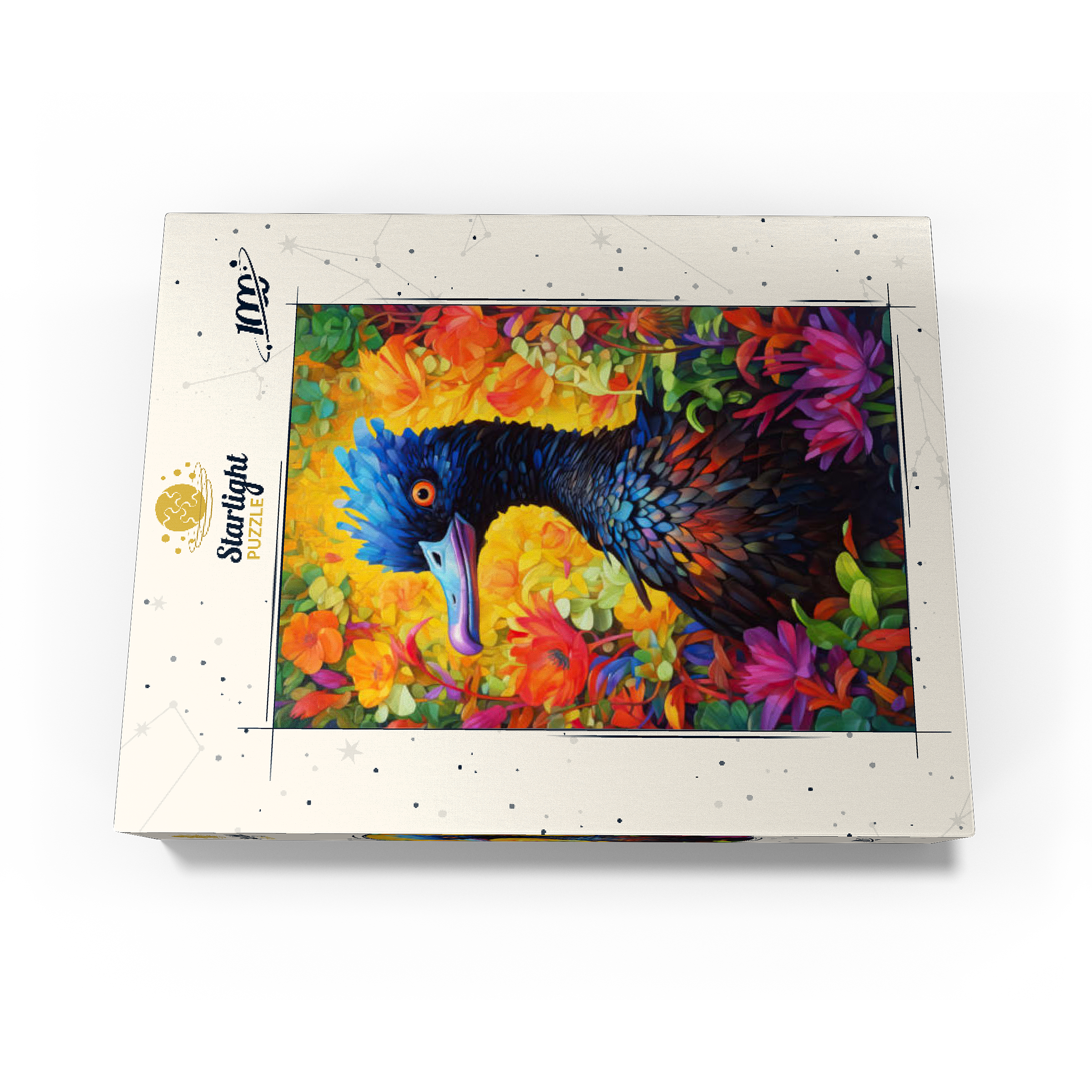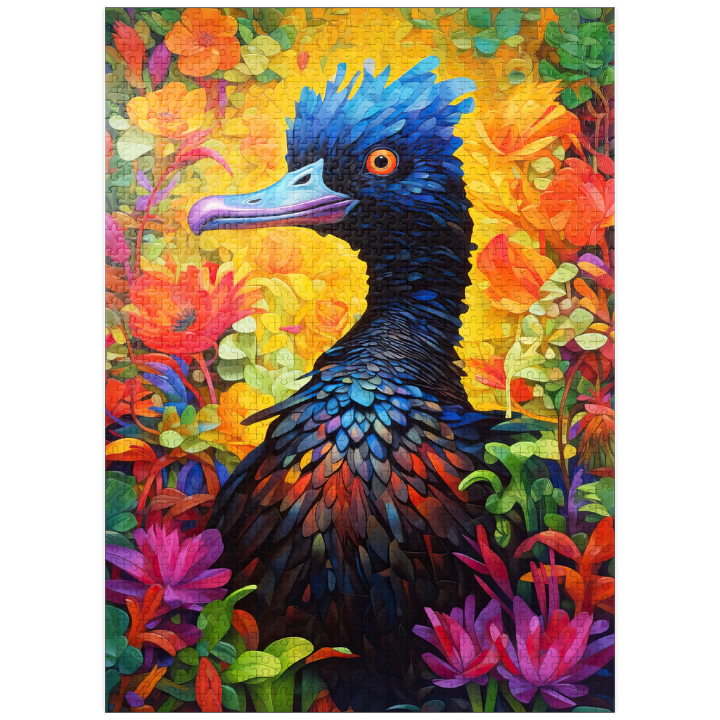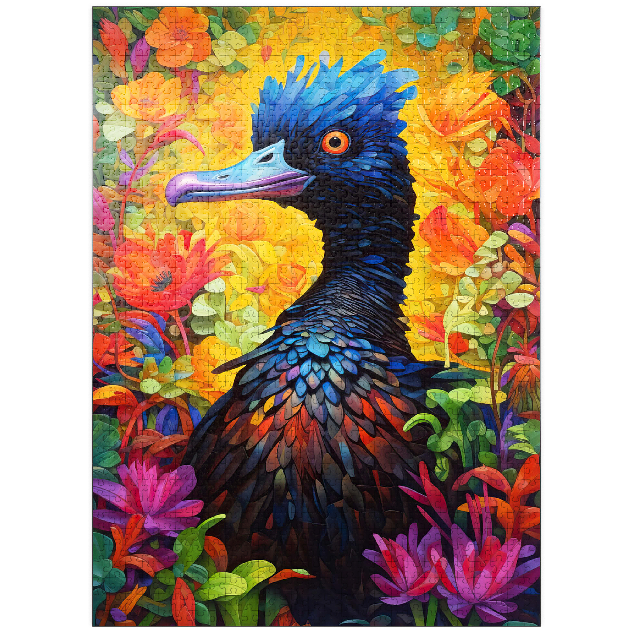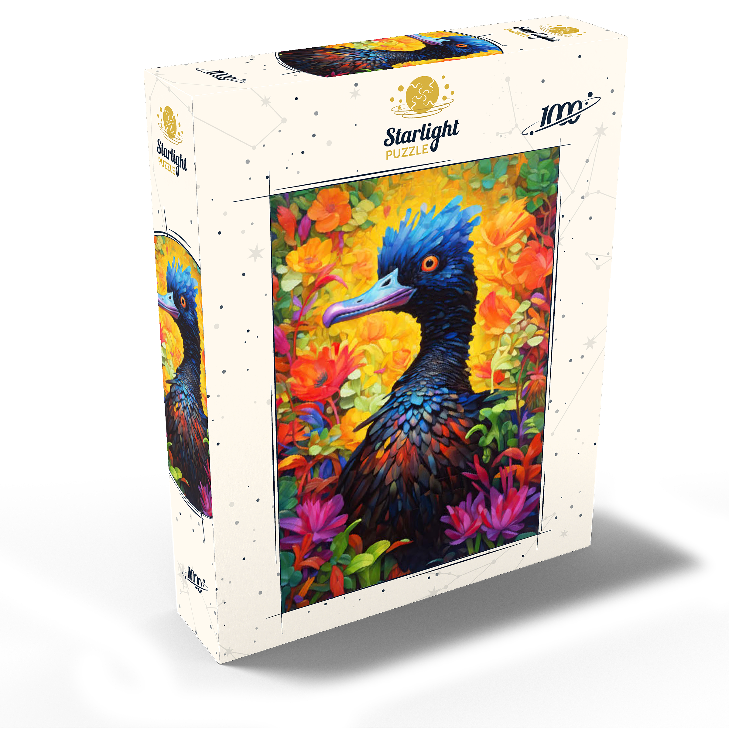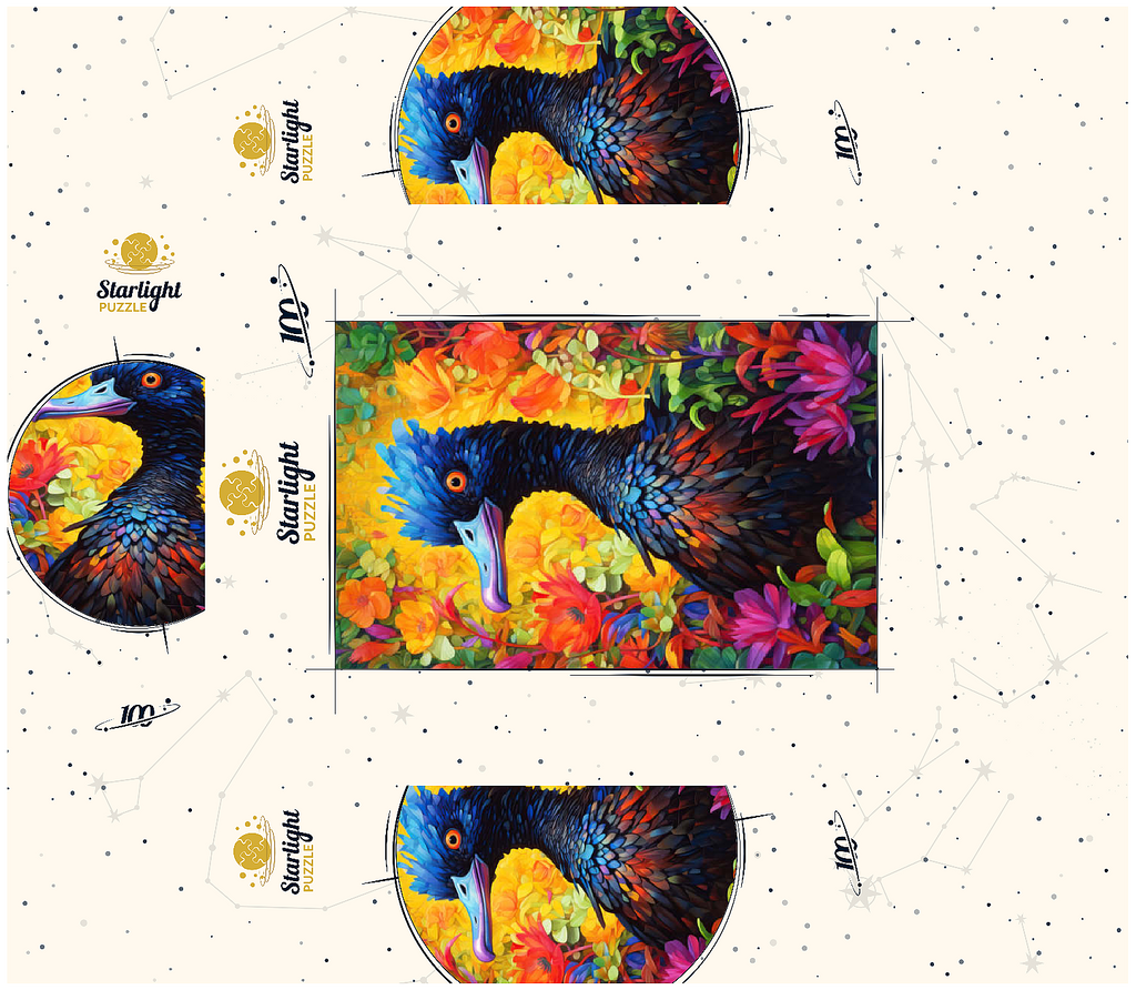 A striking digital artwork of a majestic blue bird surrounded by a lush array of colorful flowers in vivid hues of orange, red, and purple. The bird's shimmering feathers display an intricate blend of deep blues and blacks, creating a mesmerizing contrast against the golden floral backdrop. The detailed textures and glowing light effects bring an enchanting, dreamlike quality to this fantasy-inspired composition. Perfect for nature lovers, bird enthusiasts, and collectors of vibrant wildlife art, this piece adds a bold and artistic touch to any space.