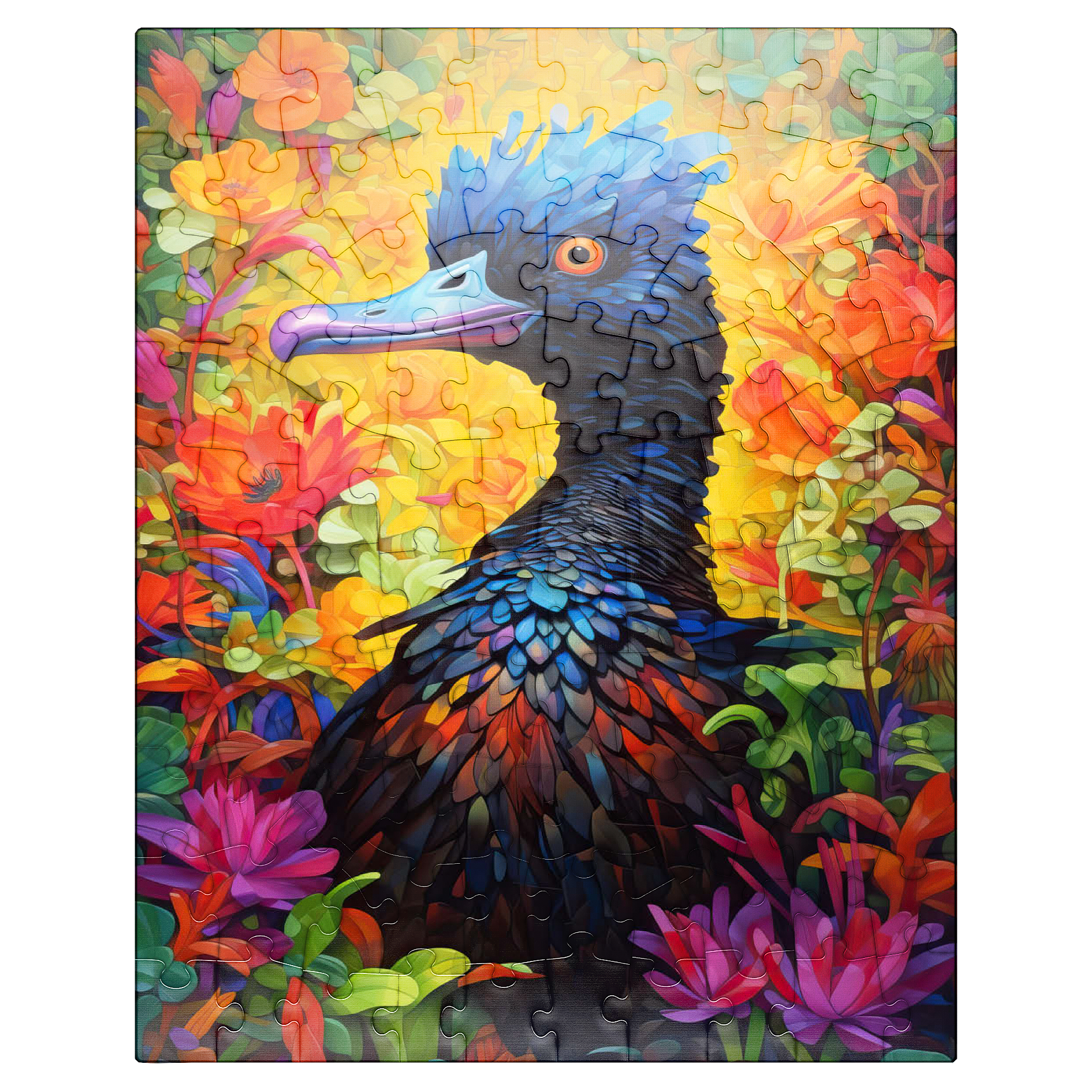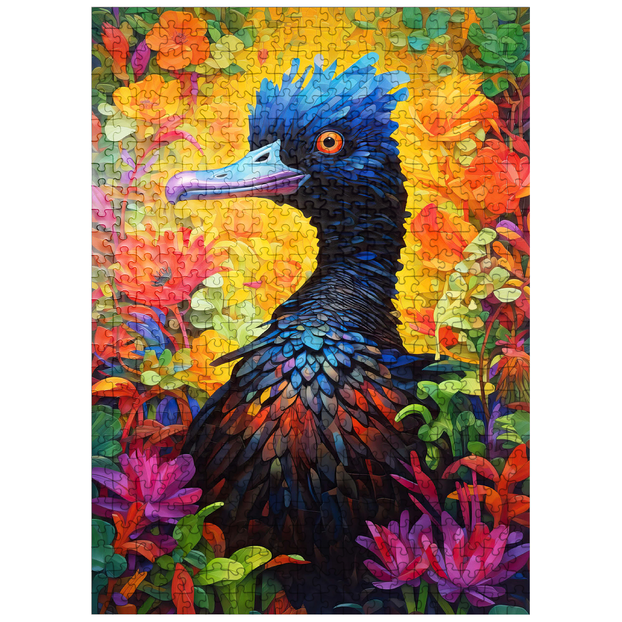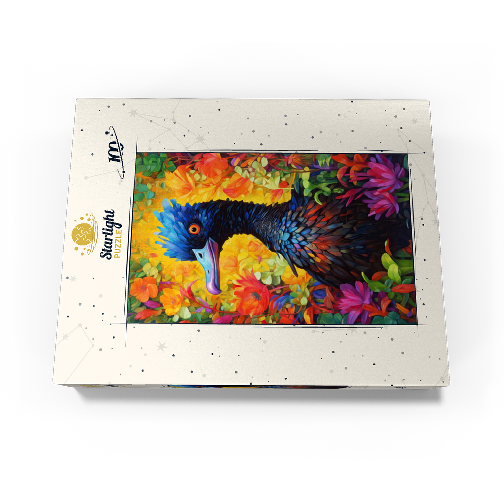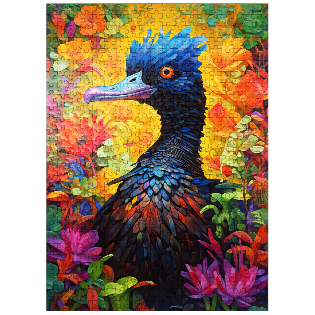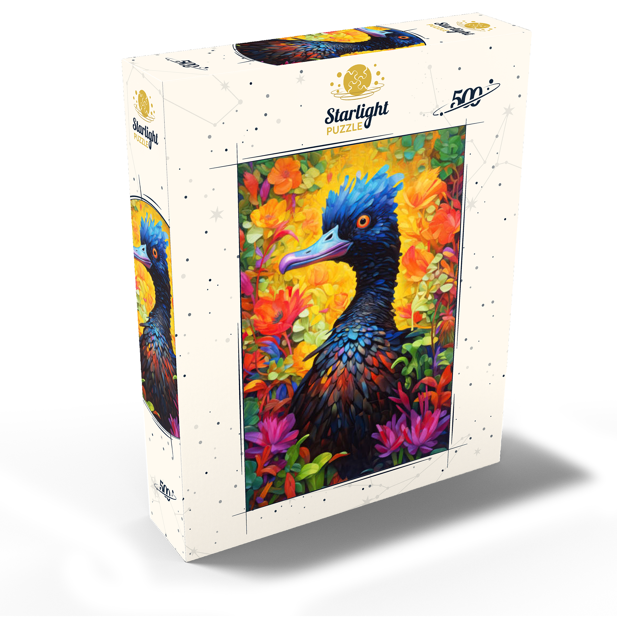 A striking digital artwork of a majestic blue bird surrounded by a lush array of colorful flowers in vivid hues of orange, red, and purple. The bird's shimmering feathers display an intricate blend of deep blues and blacks, creating a mesmerizing contrast against the golden floral backdrop. The detailed textures and glowing light effects bring an enchanting, dreamlike quality to this fantasy-inspired composition. Perfect for nature lovers, bird enthusiasts, and collectors of vibrant wildlife art, this piece adds a bold and artistic touch to any space.