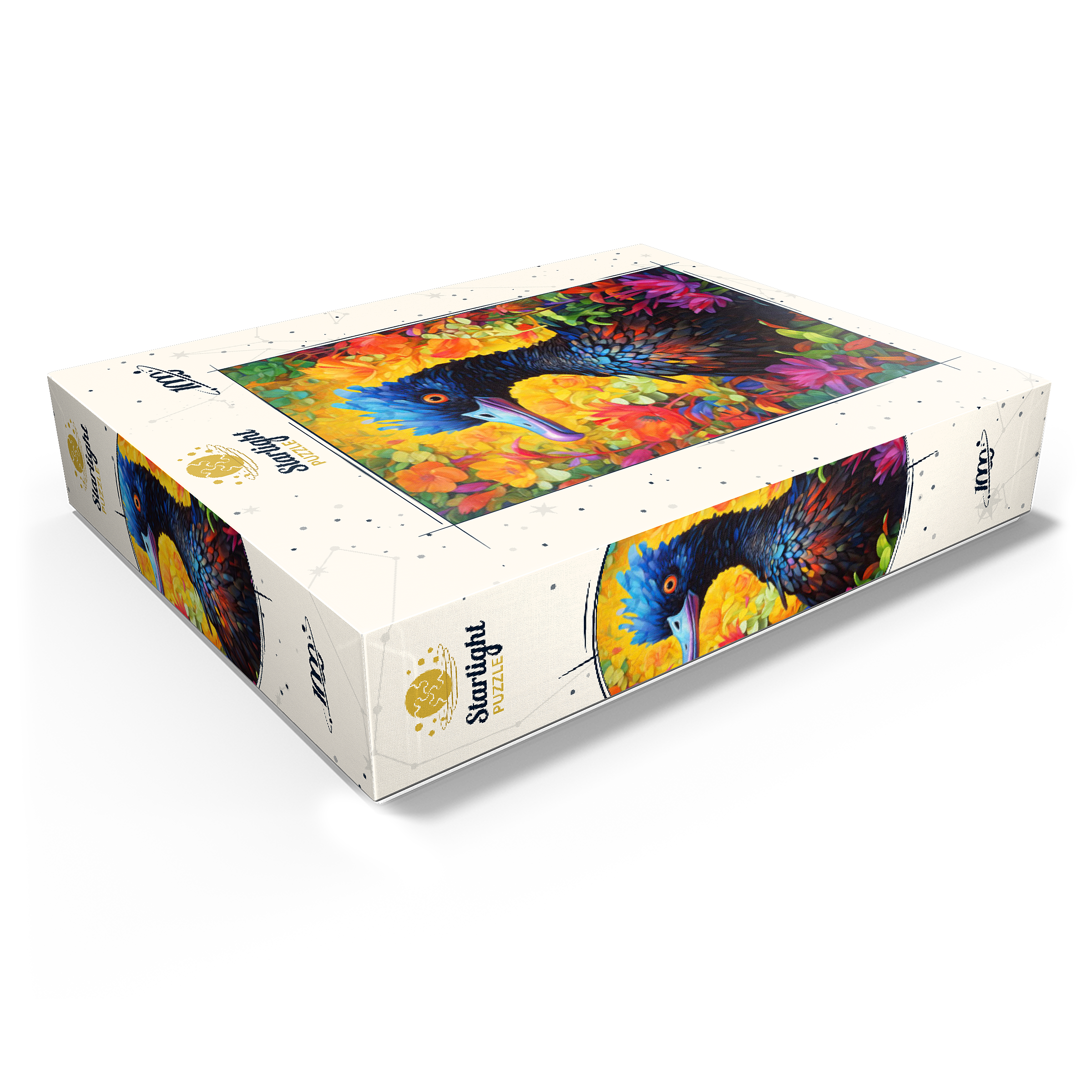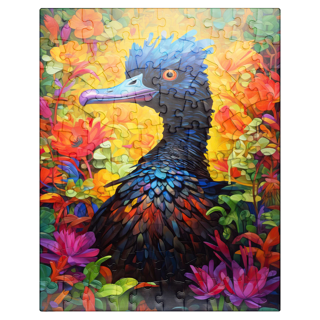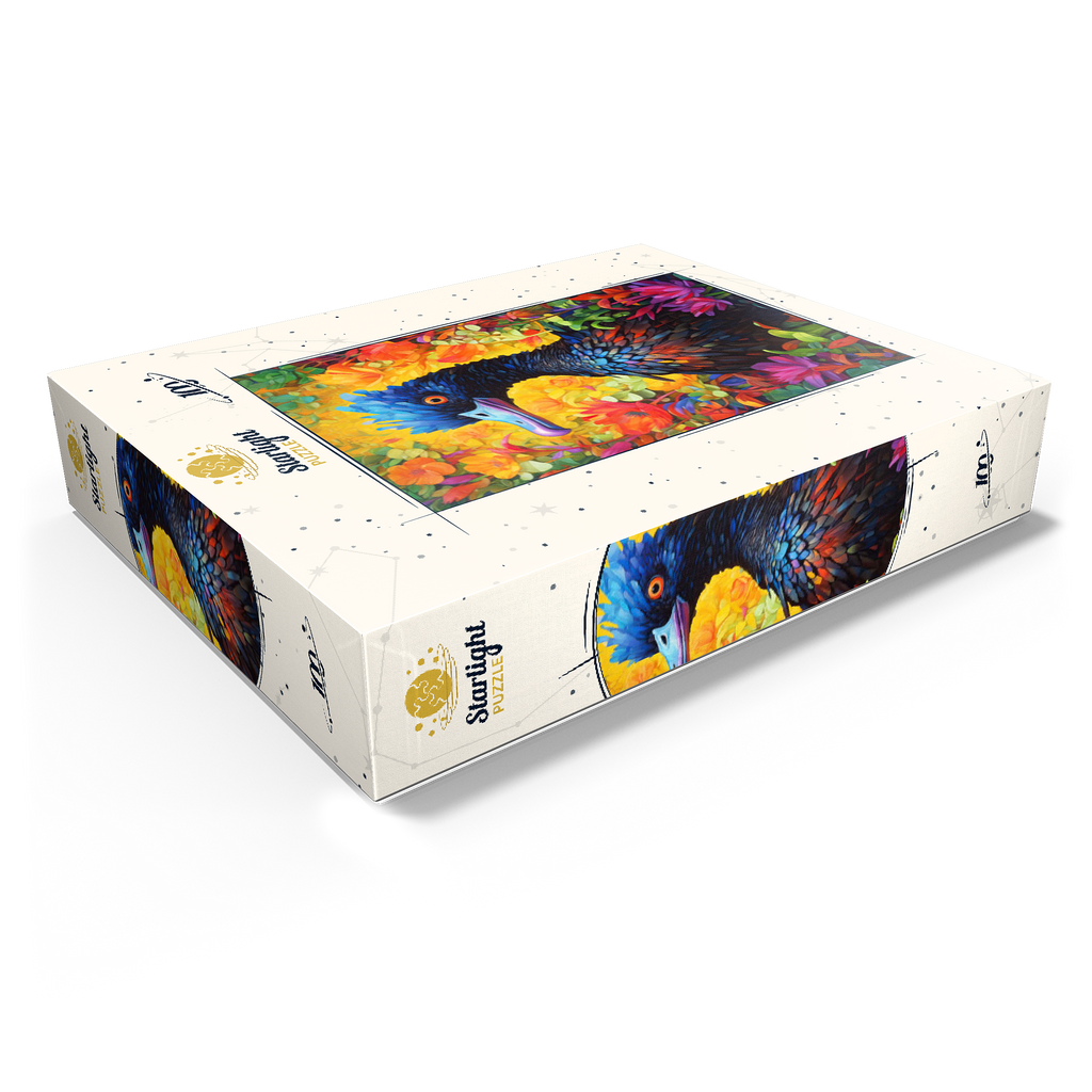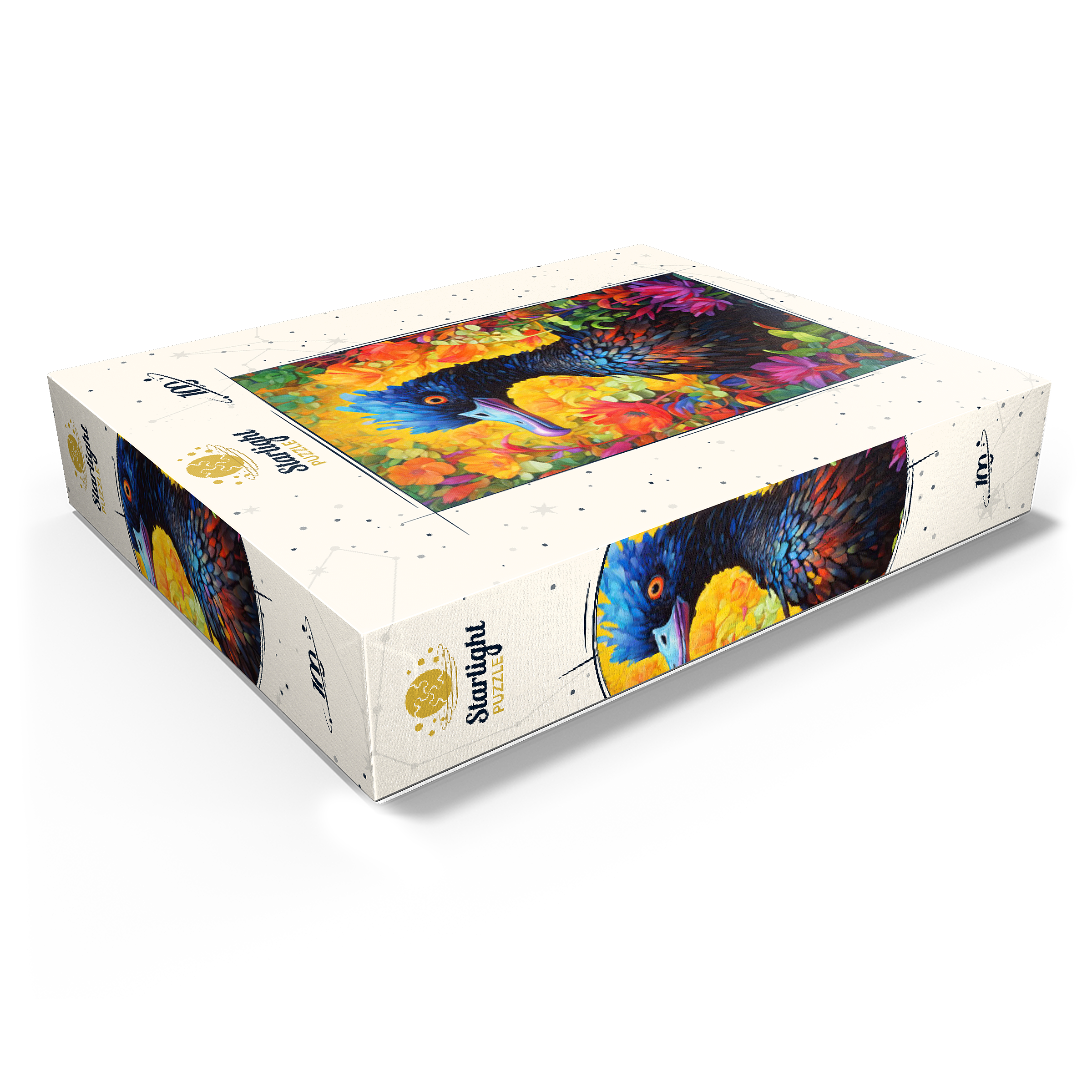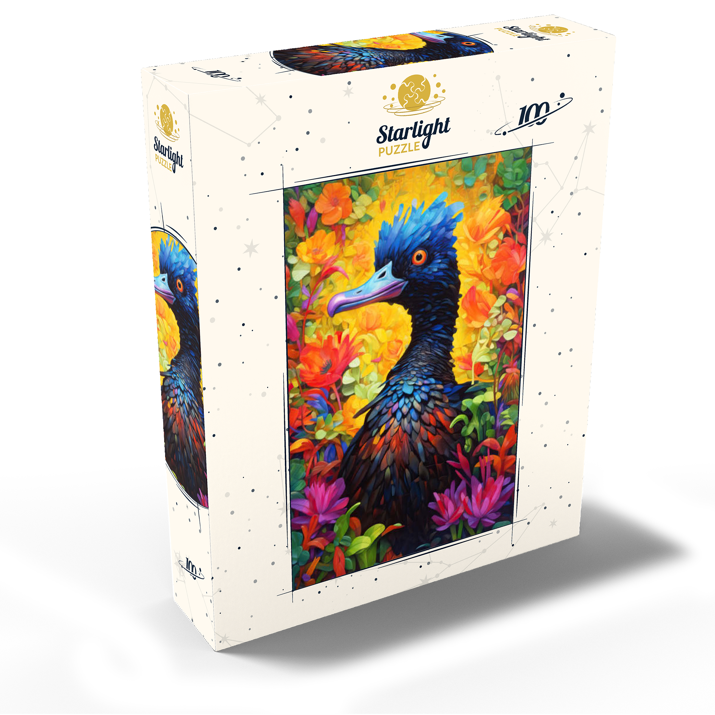 A striking digital artwork of a majestic blue bird surrounded by a lush array of colorful flowers in vivid hues of orange, red, and purple. The bird's shimmering feathers display an intricate blend of deep blues and blacks, creating a mesmerizing contrast against the golden floral backdrop. The detailed textures and glowing light effects bring an enchanting, dreamlike quality to this fantasy-inspired composition. Perfect for nature lovers, bird enthusiasts, and collectors of vibrant wildlife art, this piece adds a bold and artistic touch to any space.